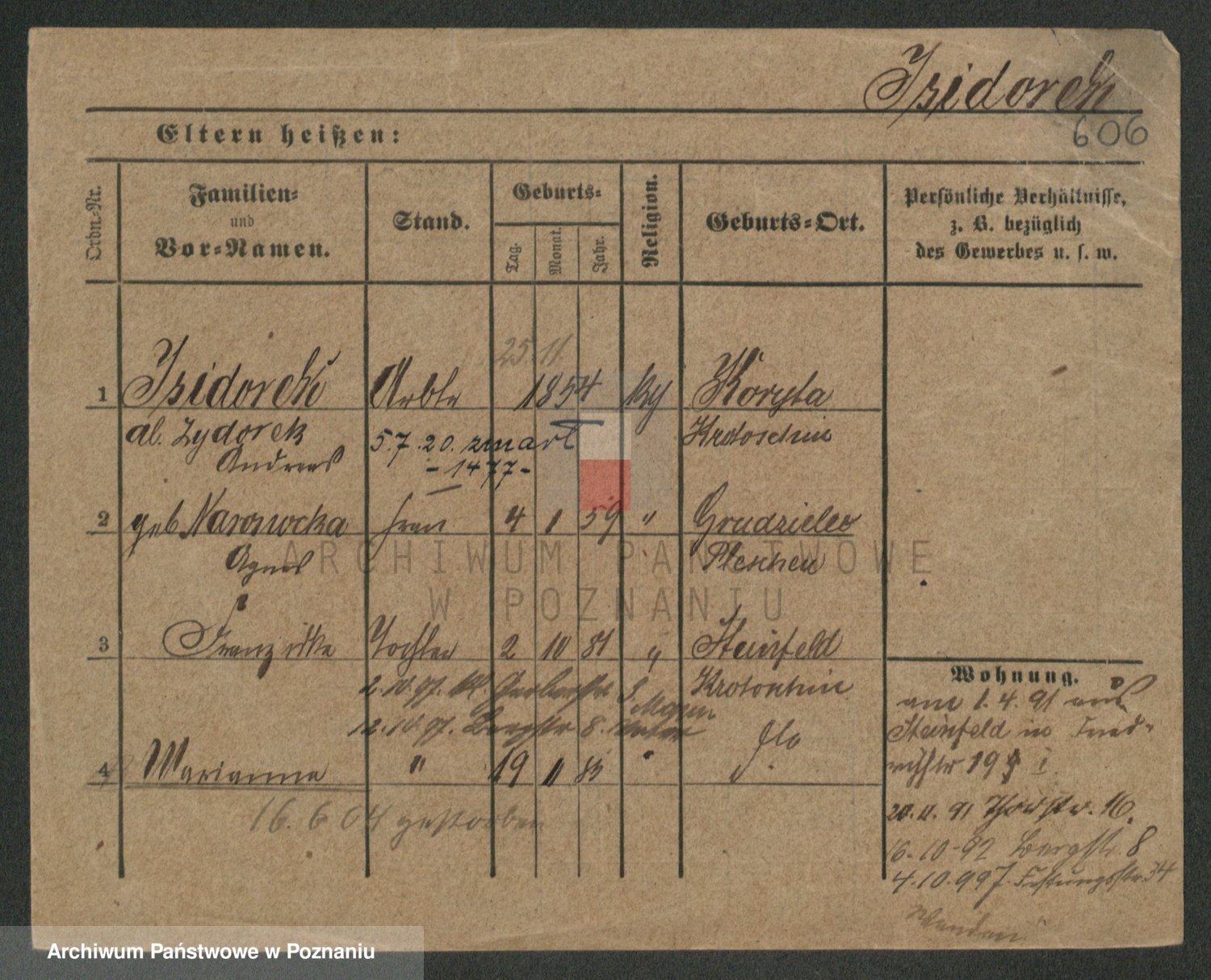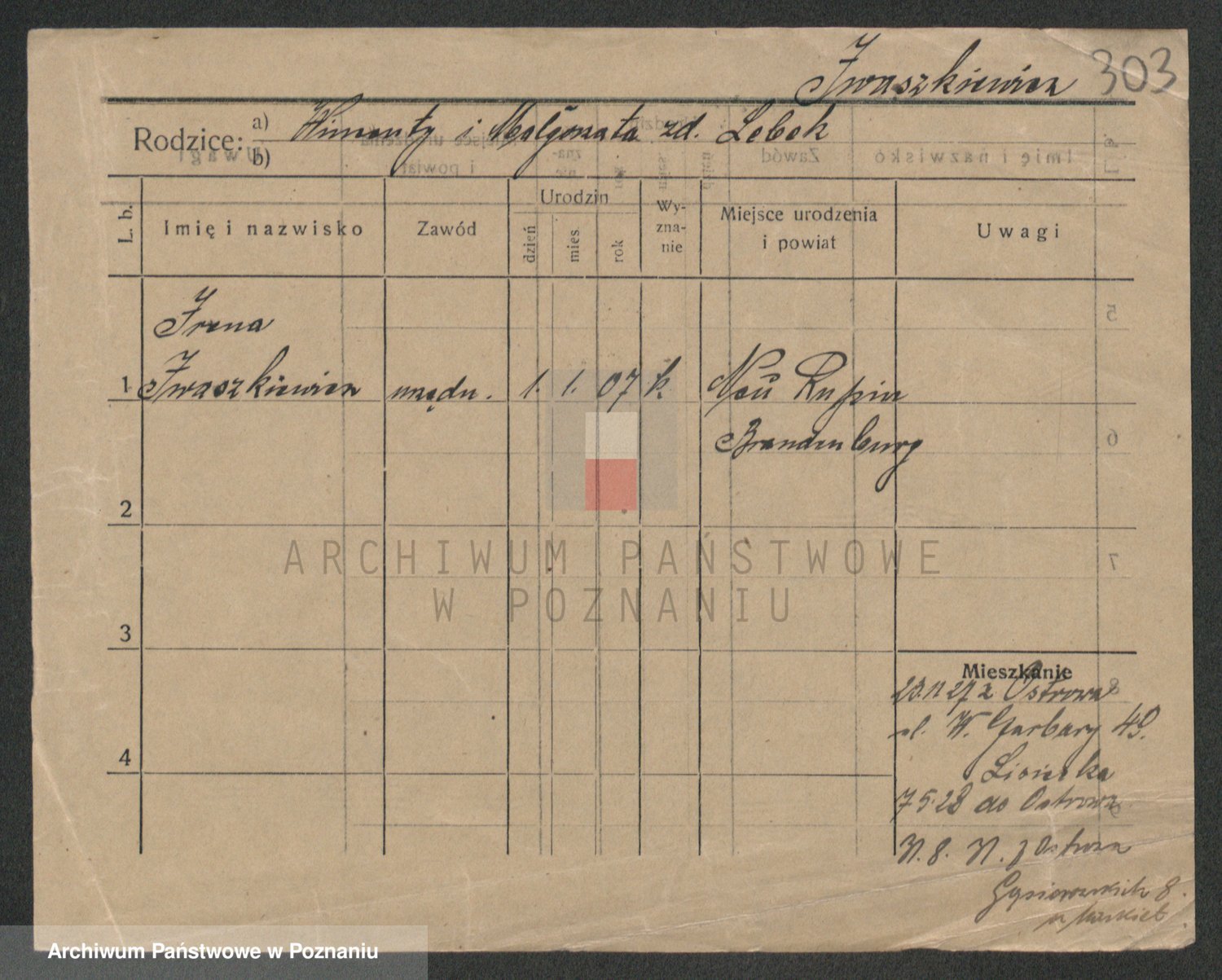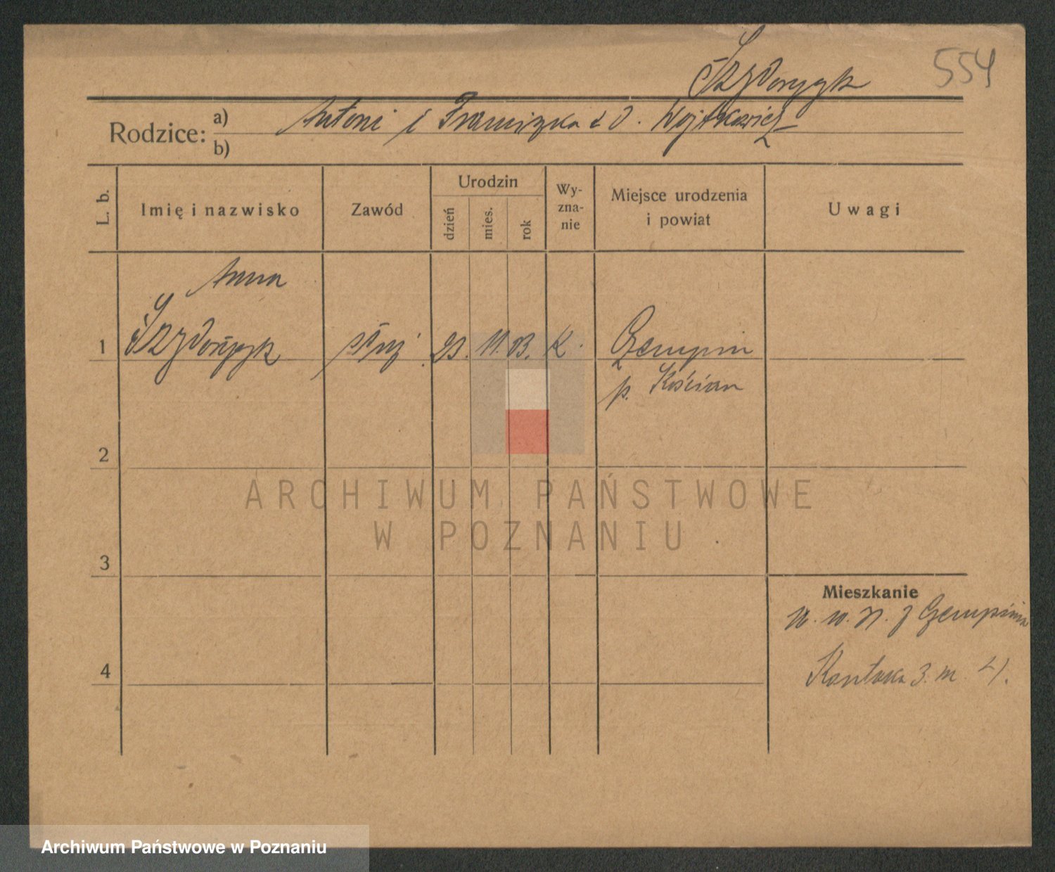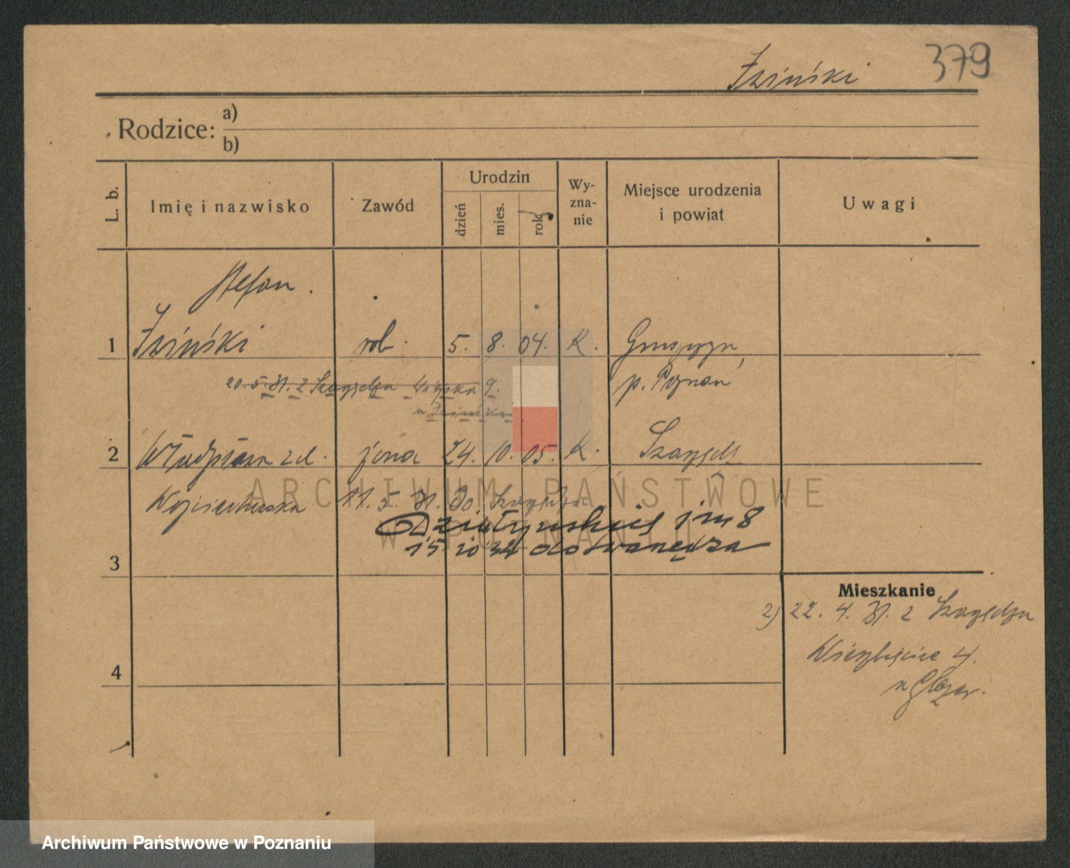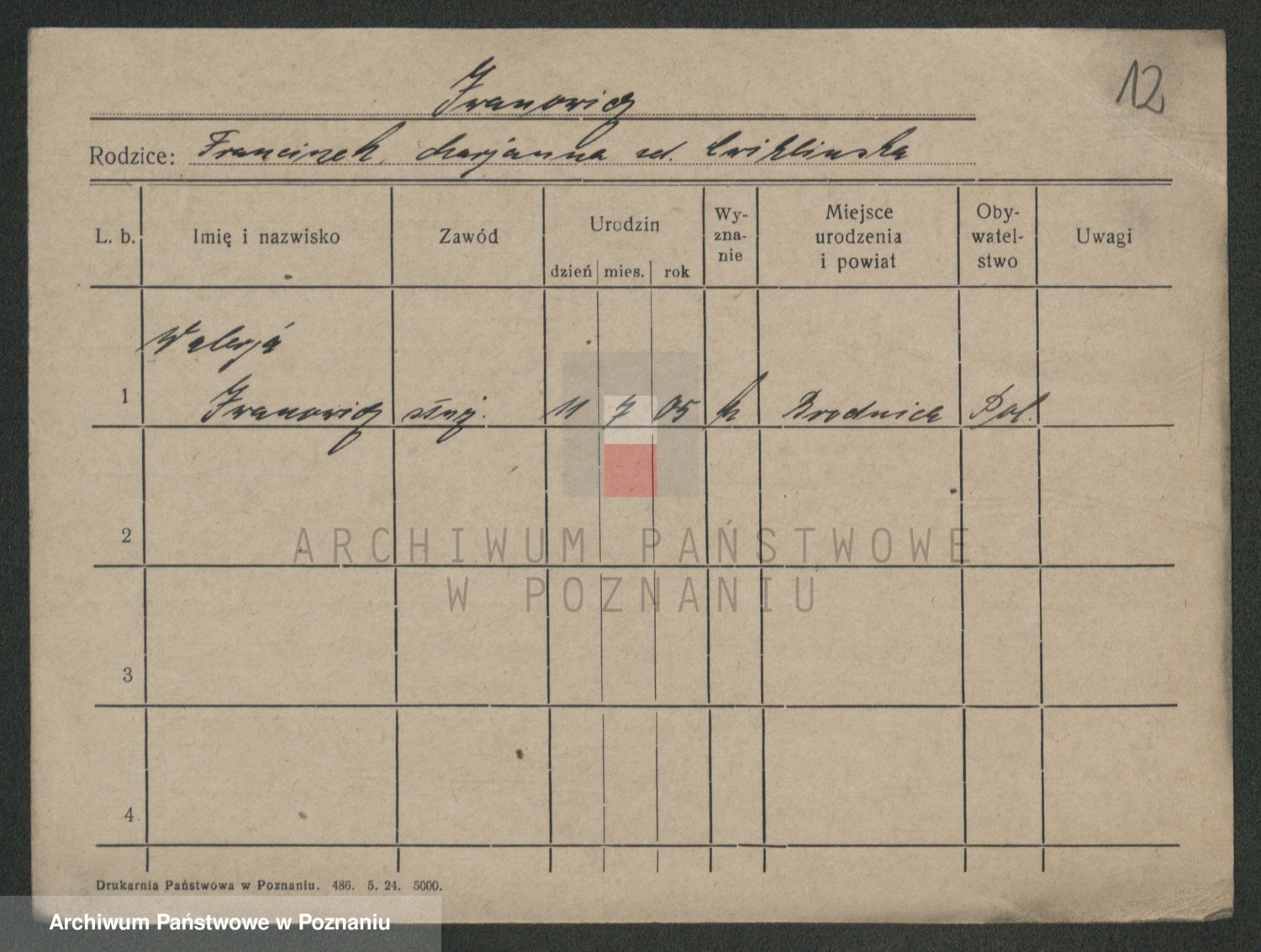 Podgląd karty osobowej dostępny jest po kliknięciu na nazwisko lub ikonkę karty. Można dokonywać powiększenia (ikony na górze) lub przechodzić między kolejnymi skanami (strzałki po bokach).