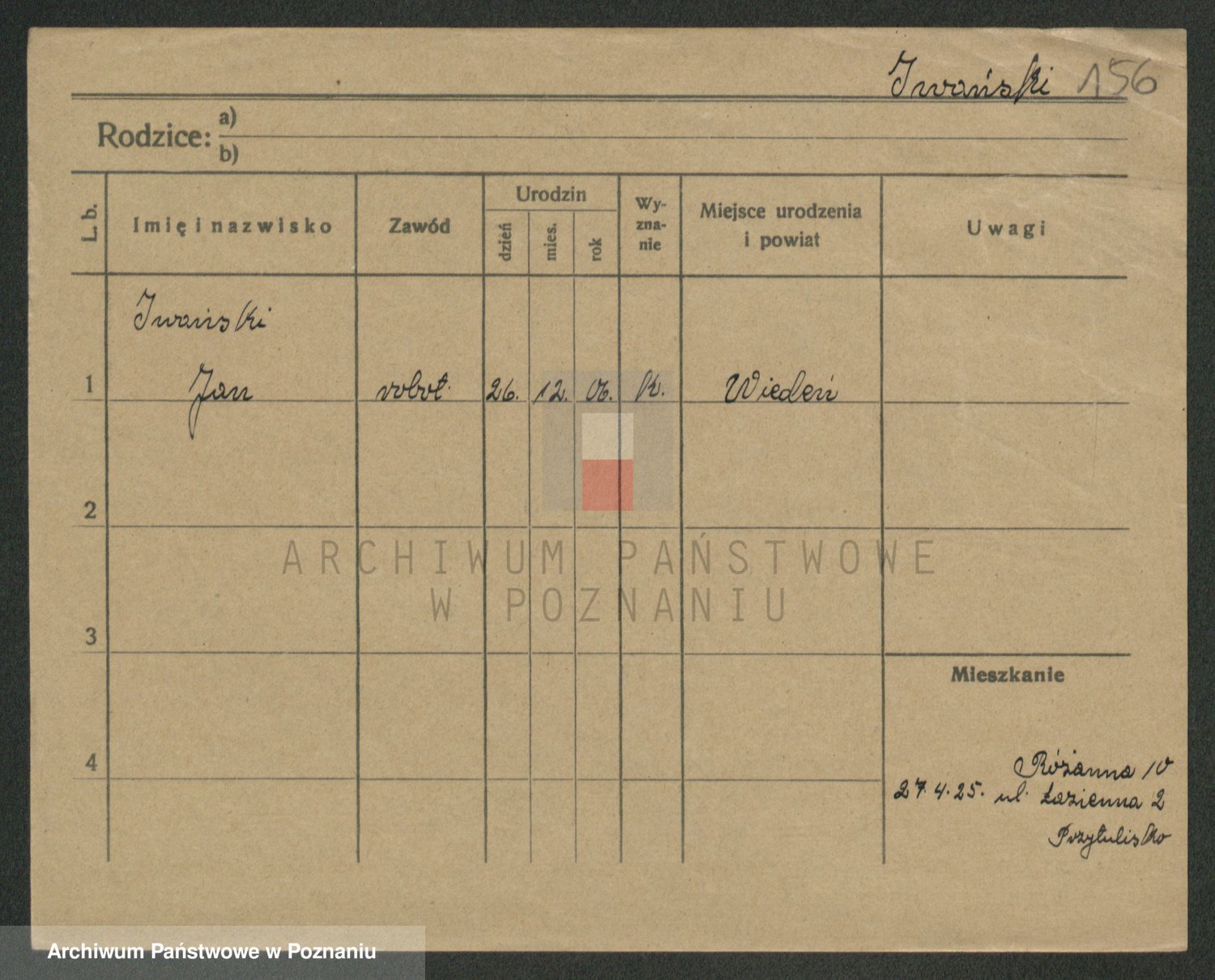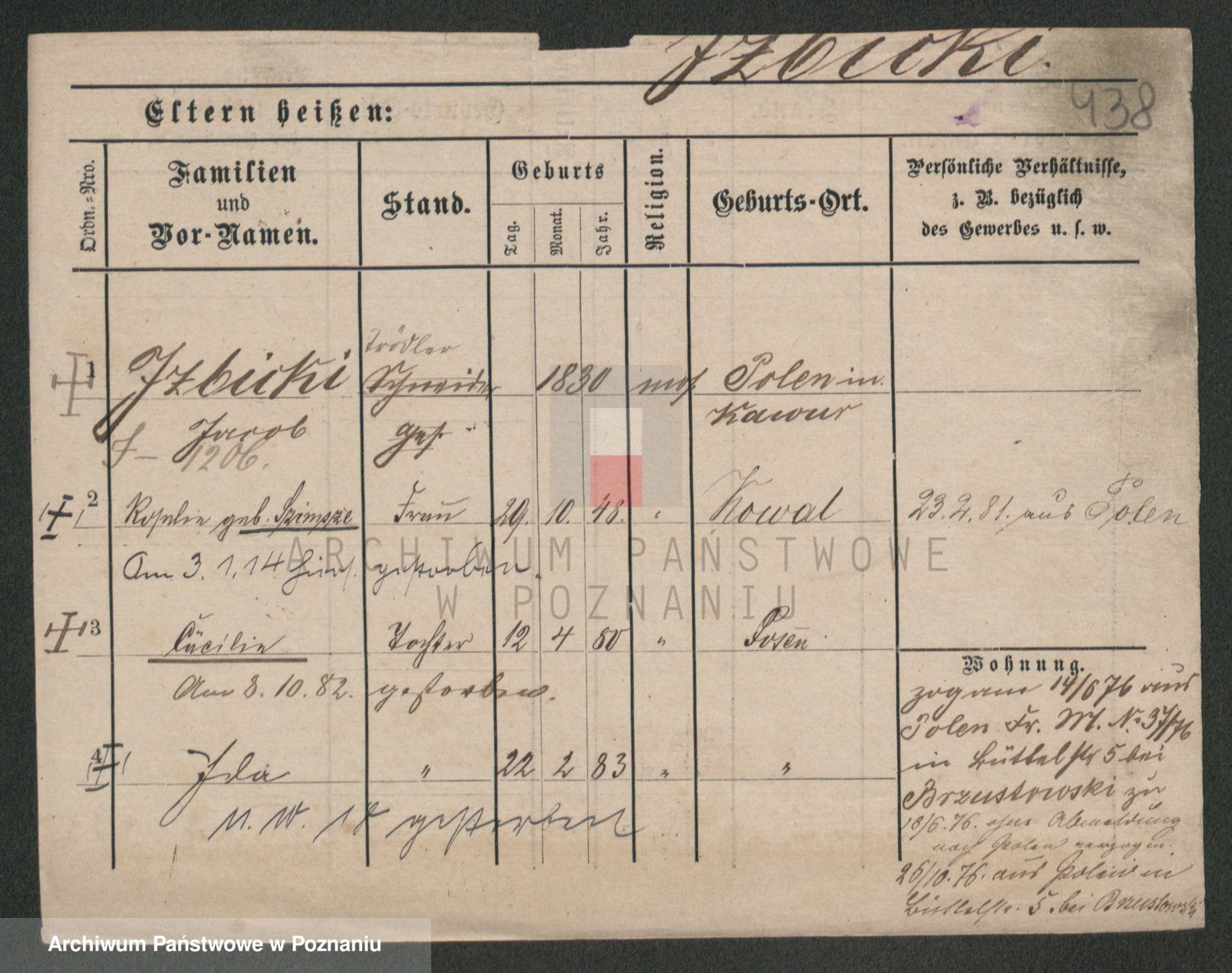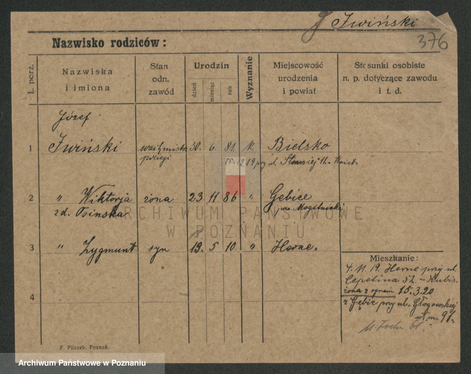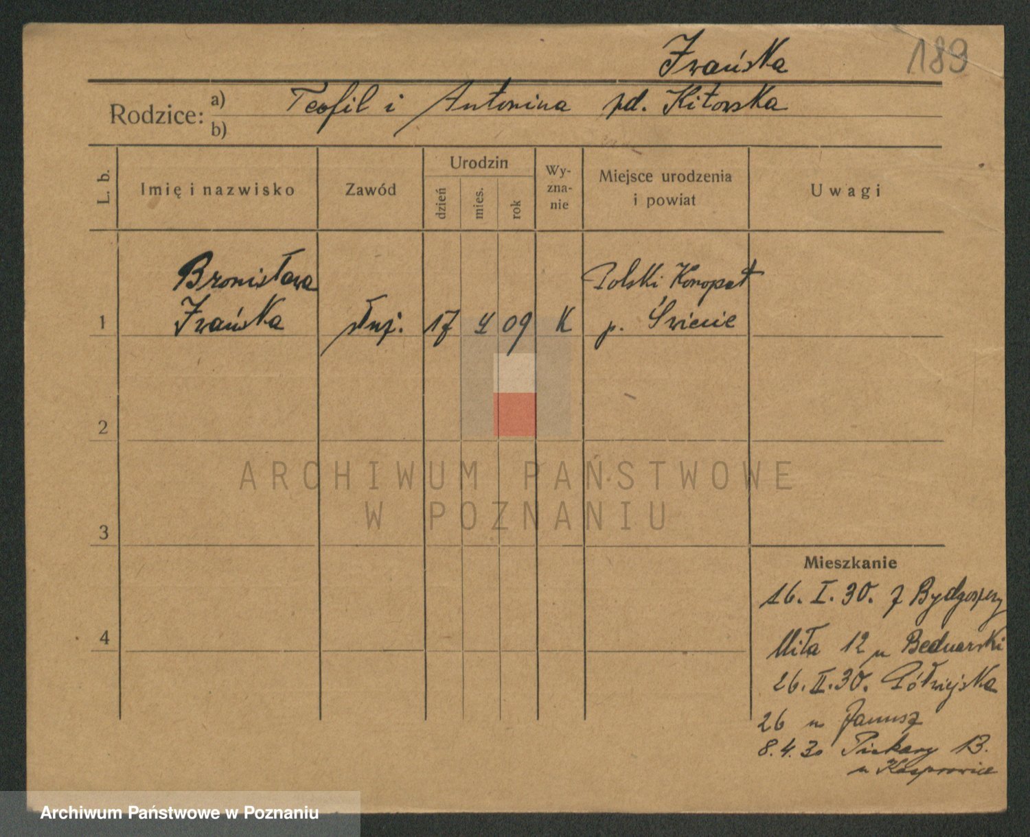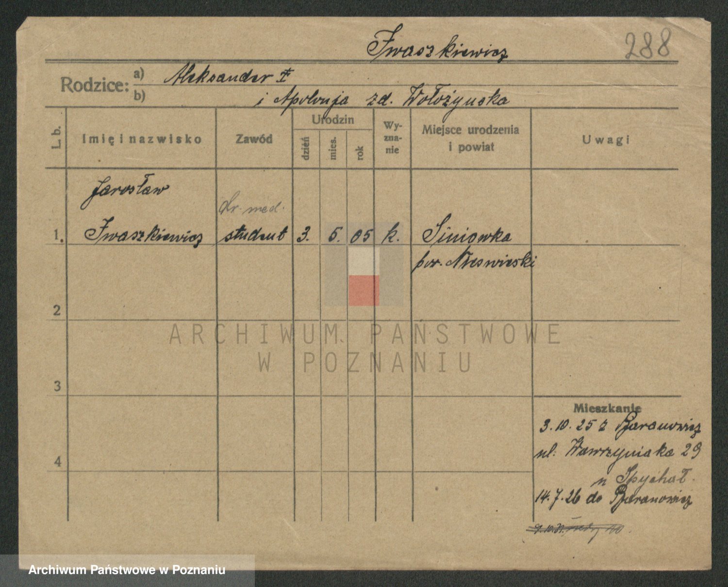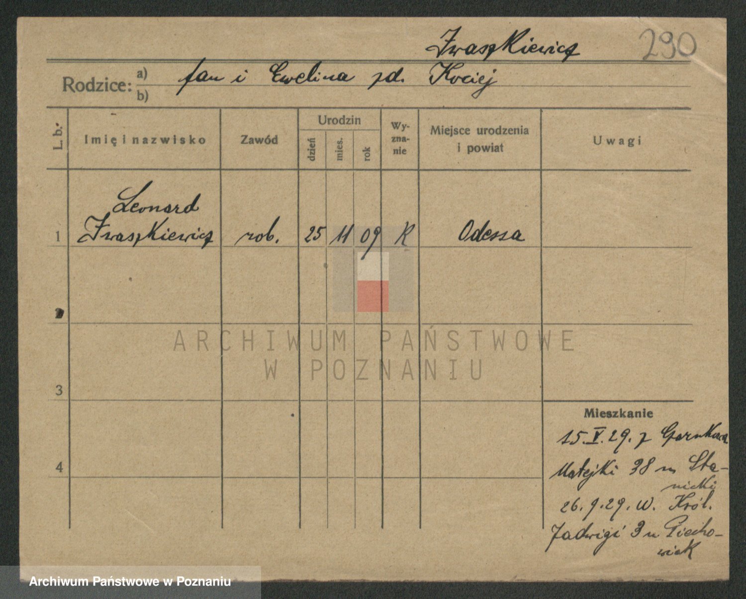 Podgląd karty osobowej dostępny jest po kliknięciu na nazwisko lub ikonkę karty. Można dokonywać powiększenia (ikony na górze) lub przechodzić między kolejnymi skanami (strzałki po bokach).