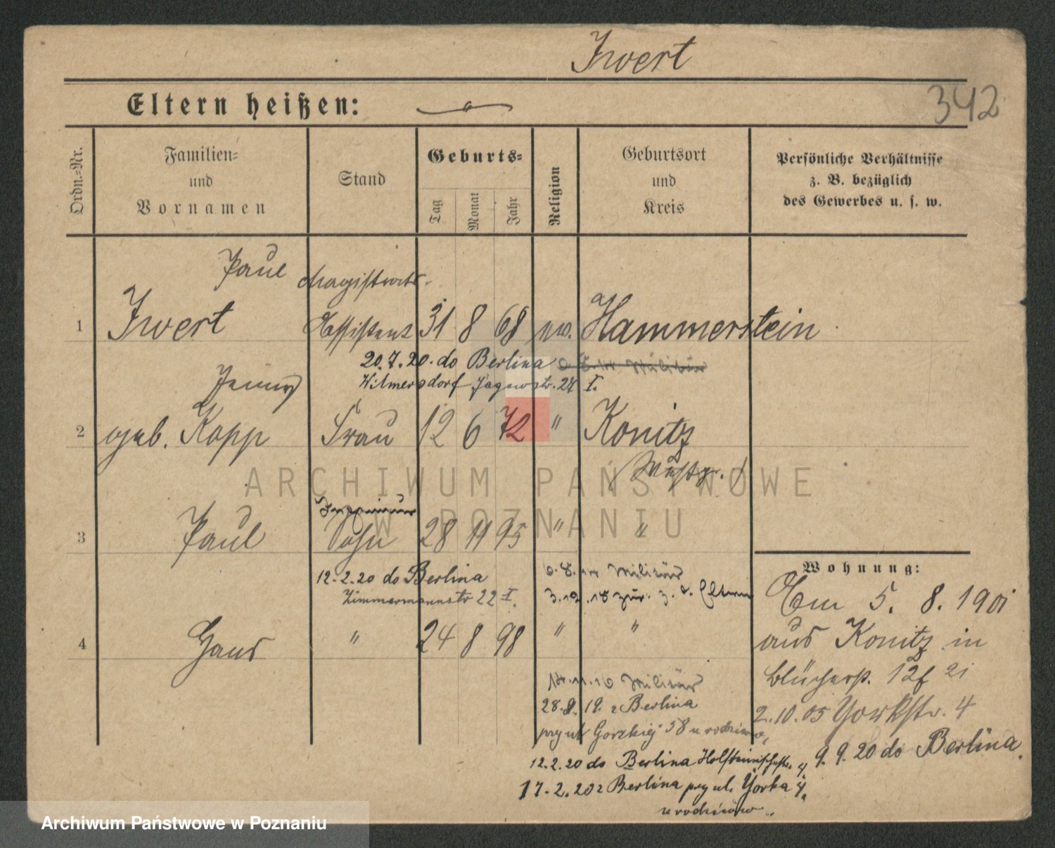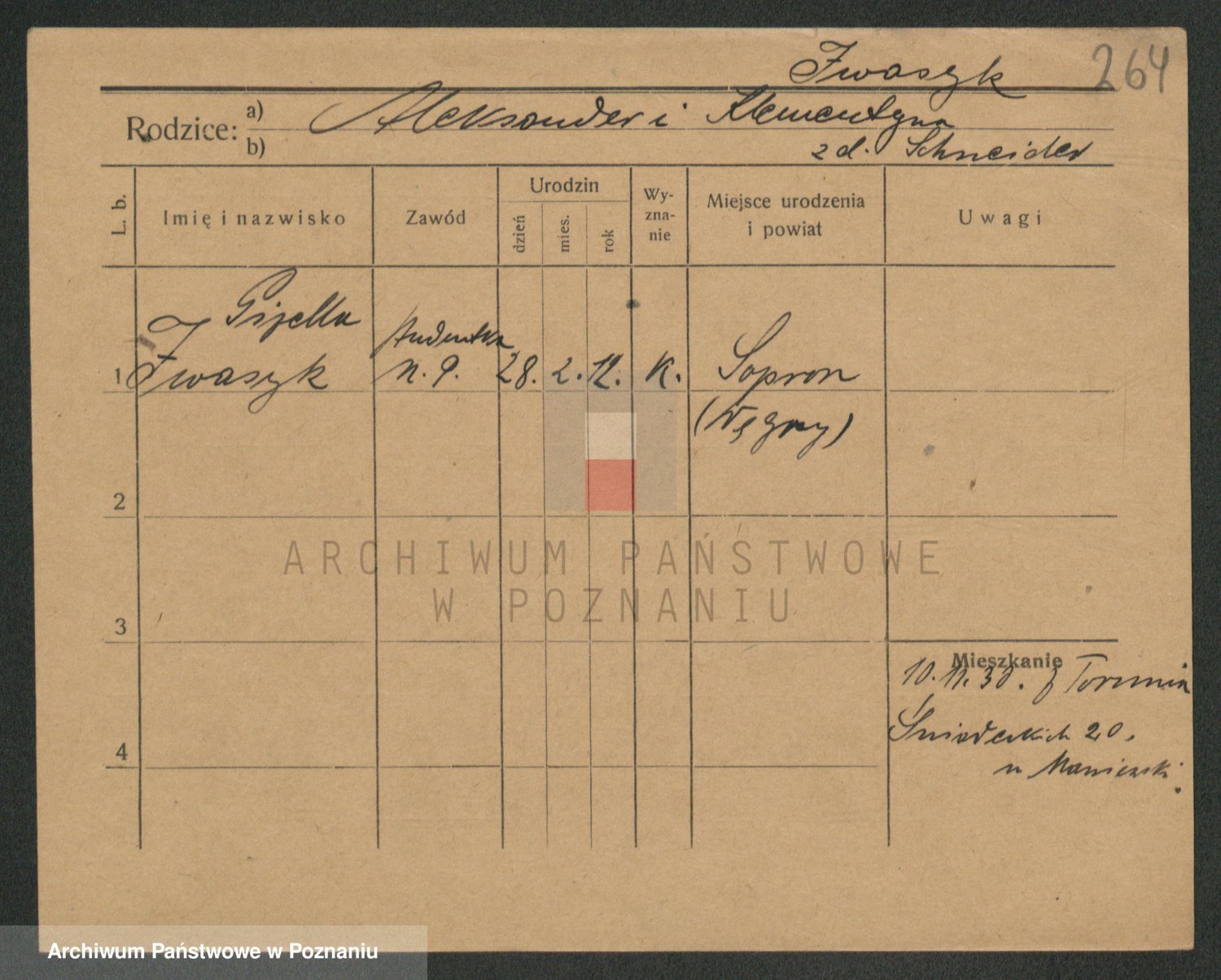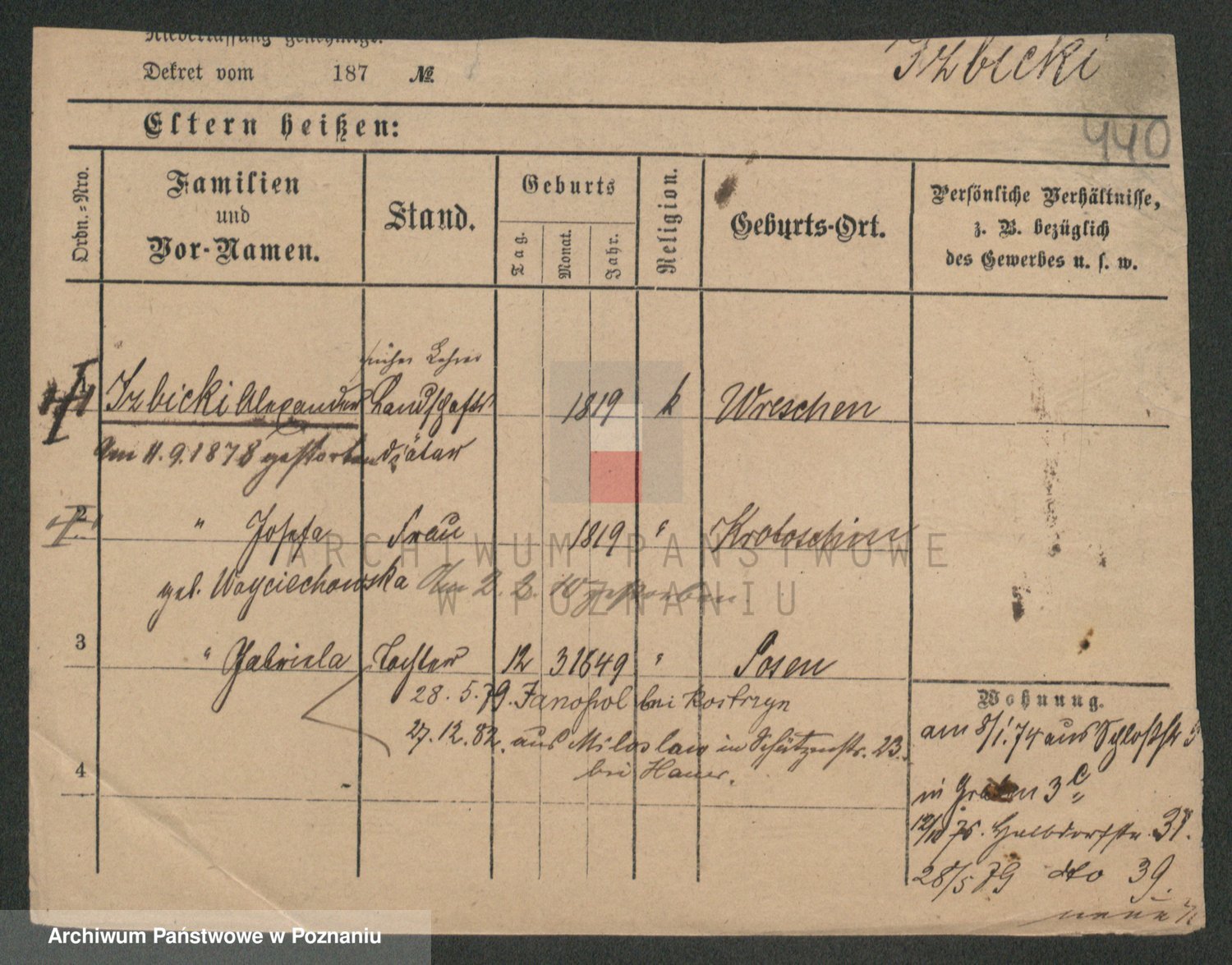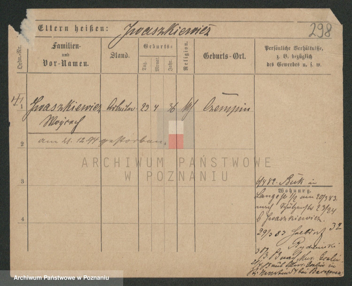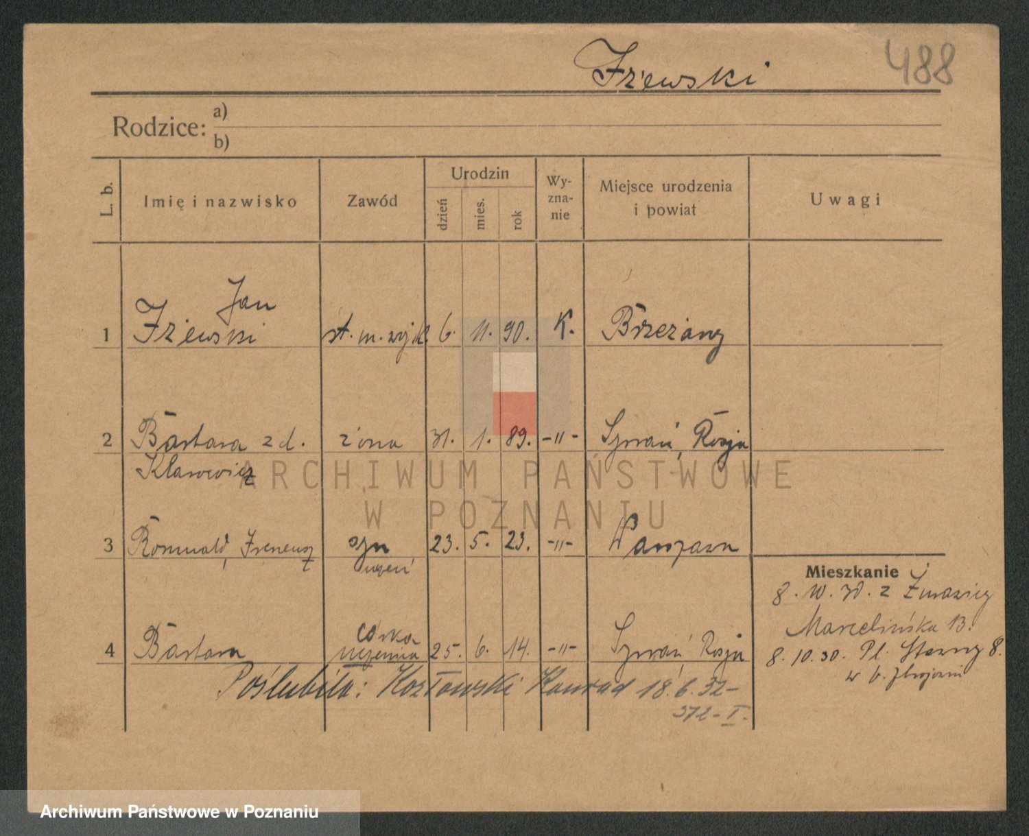 Podgląd karty osobowej dostępny jest po kliknięciu na nazwisko lub ikonkę karty. Można dokonywać powiększenia (ikony na górze) lub przechodzić między kolejnymi skanami (strzałki po bokach).