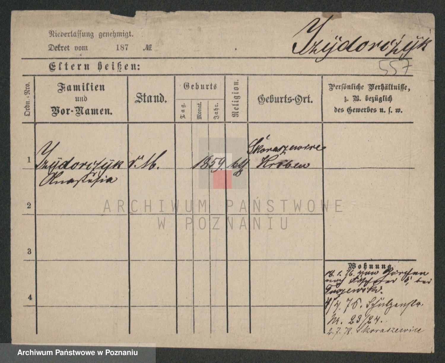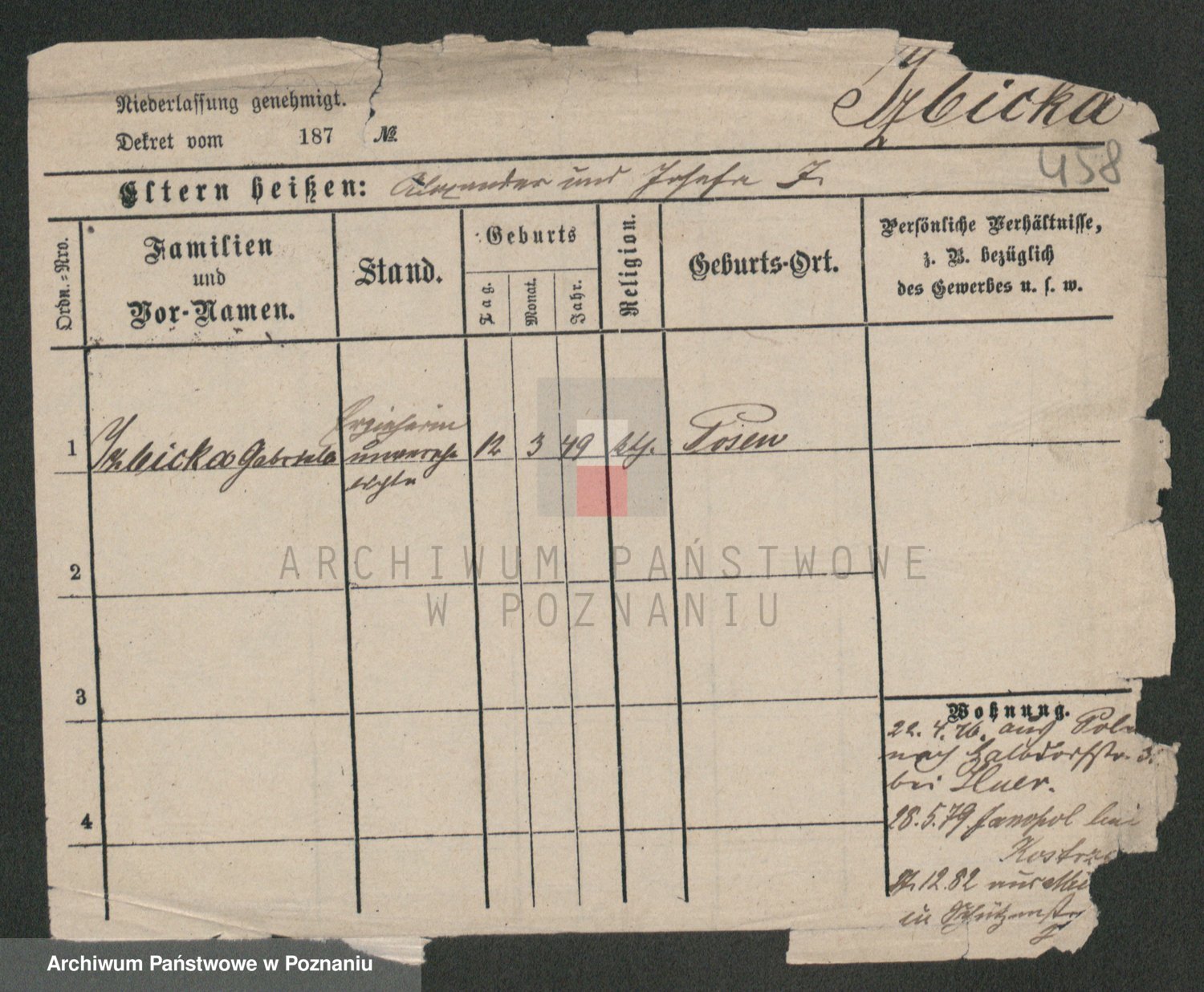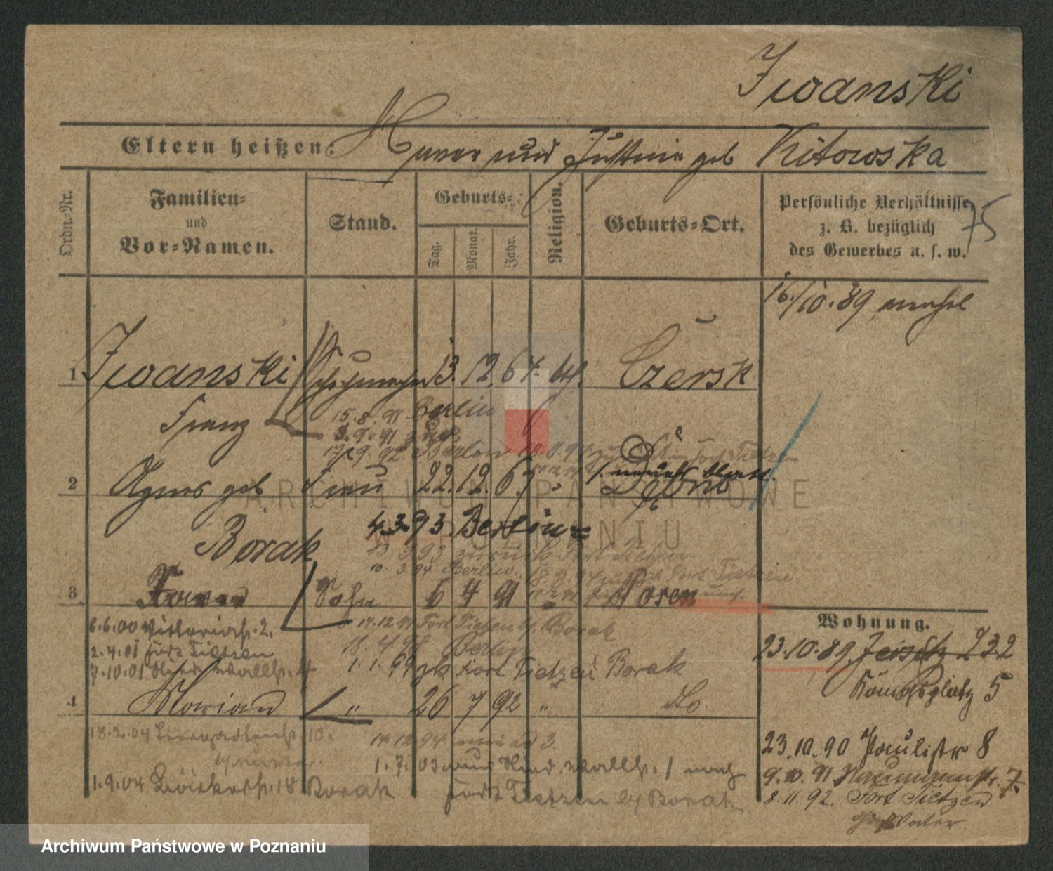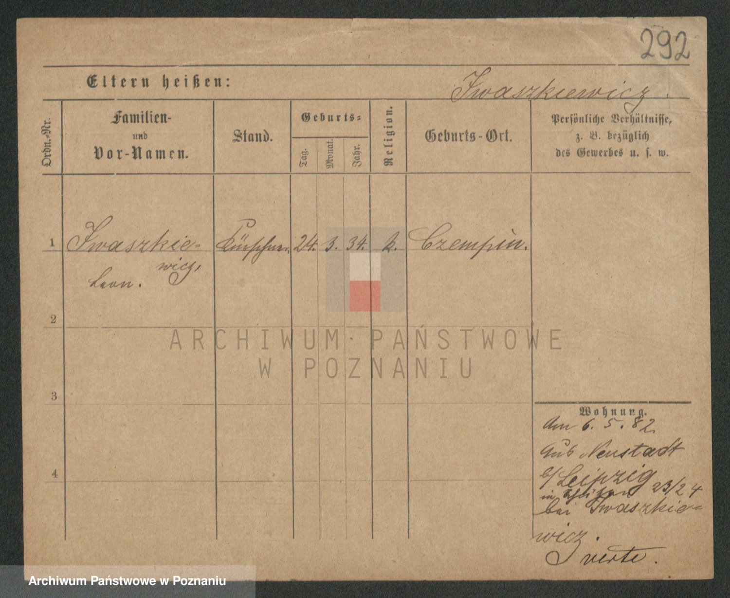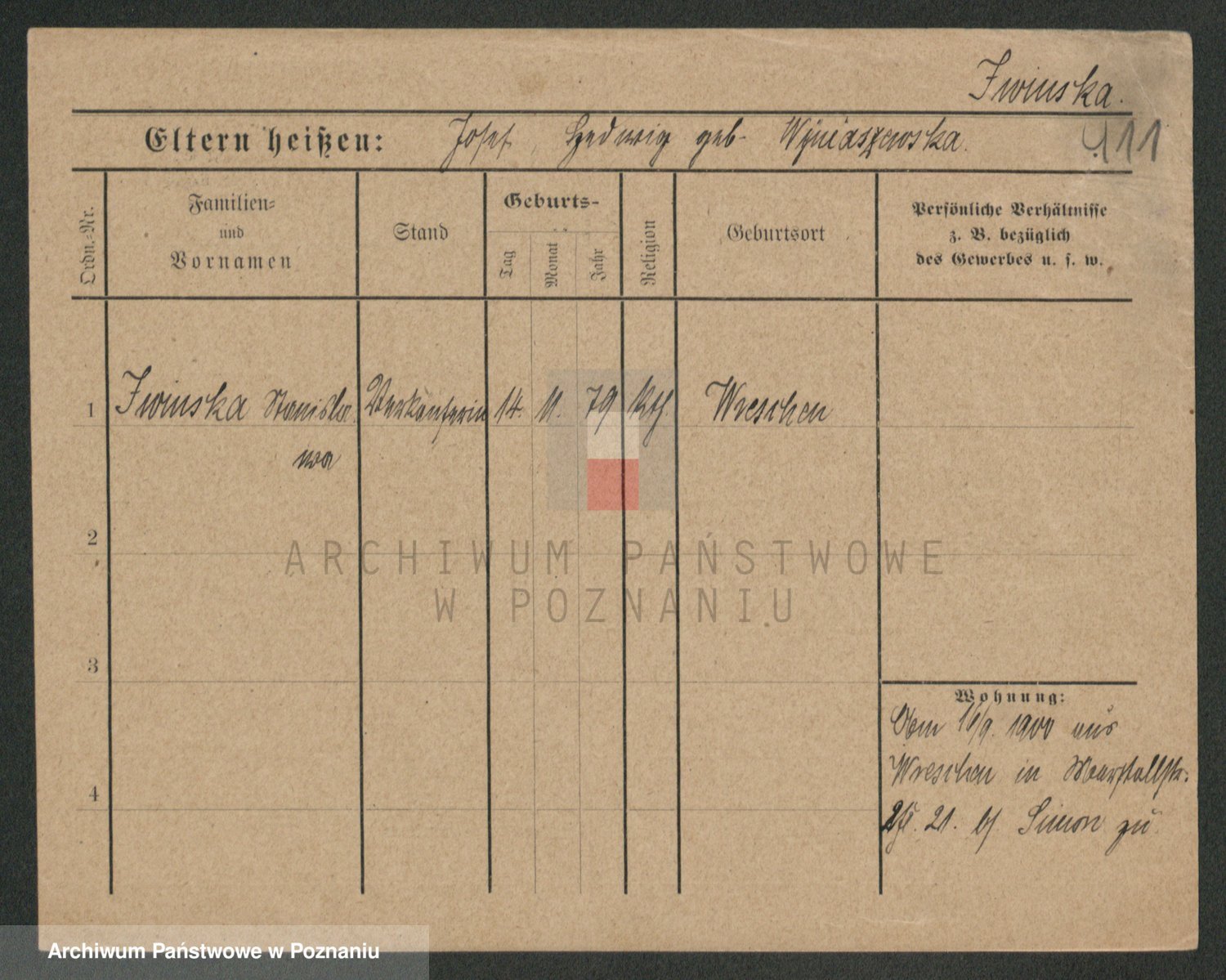 Podgląd karty osobowej dostępny jest po kliknięciu na nazwisko lub ikonkę karty. Można dokonywać powiększenia (ikony na górze) lub przechodzić między kolejnymi skanami (strzałki po bokach).