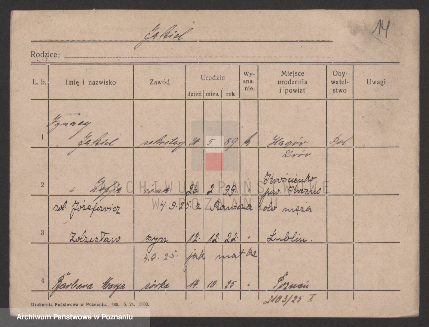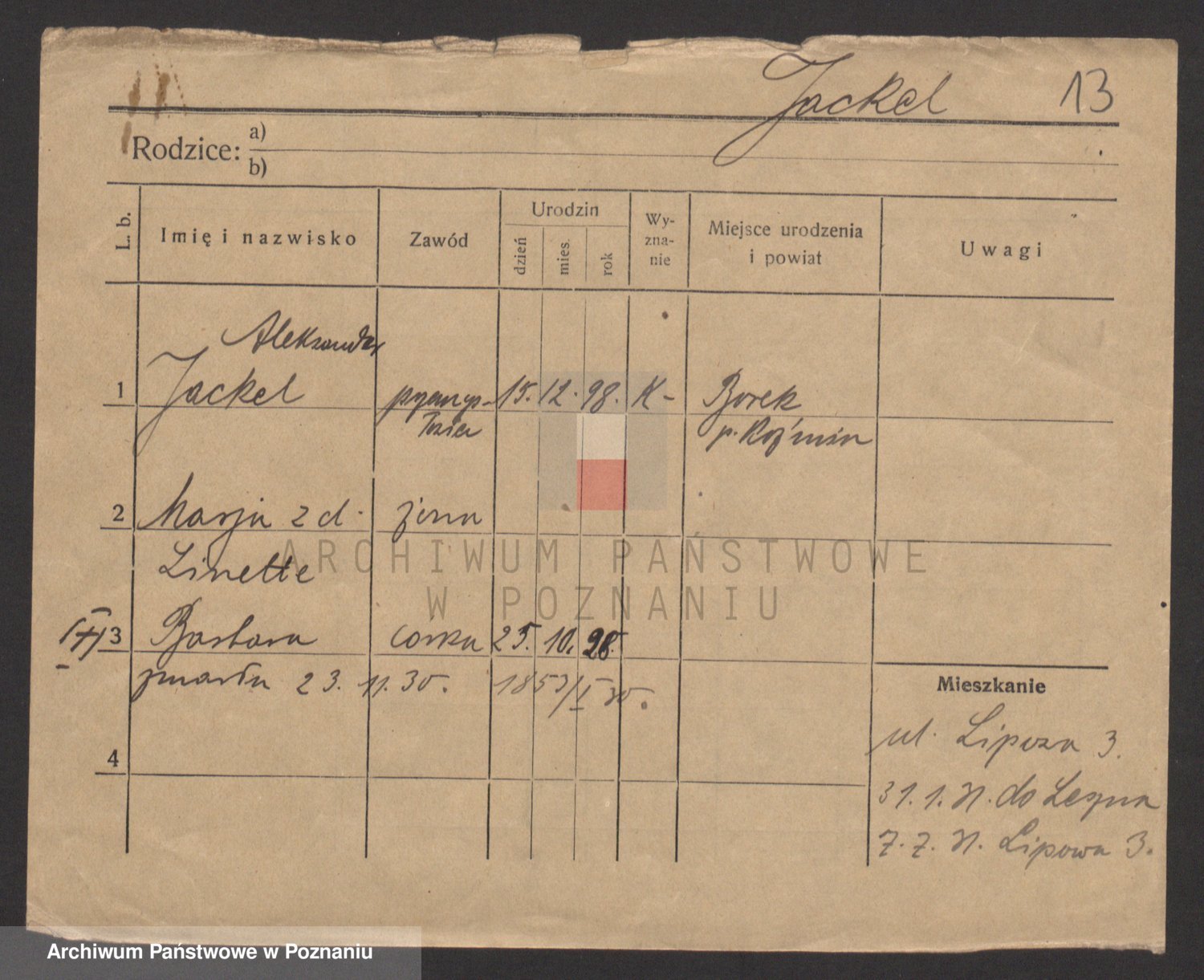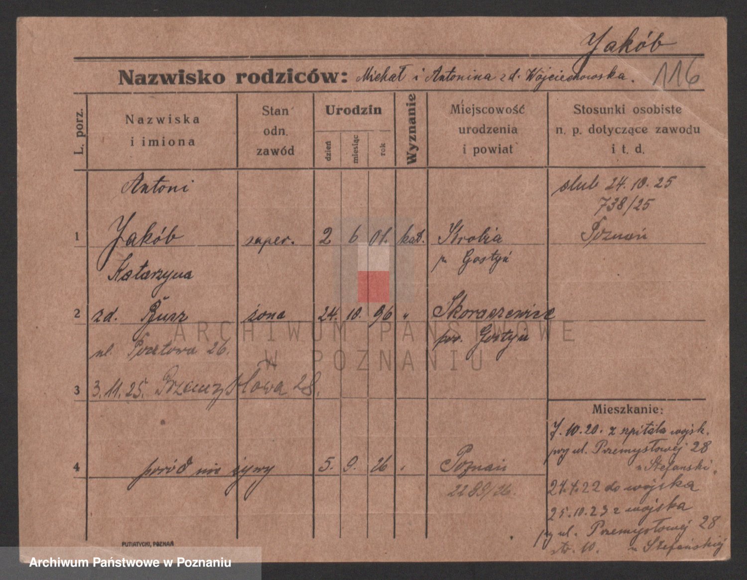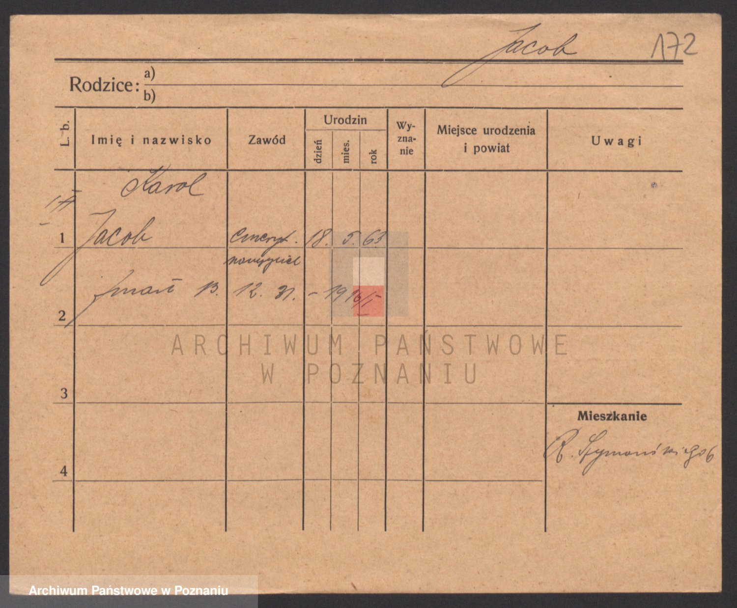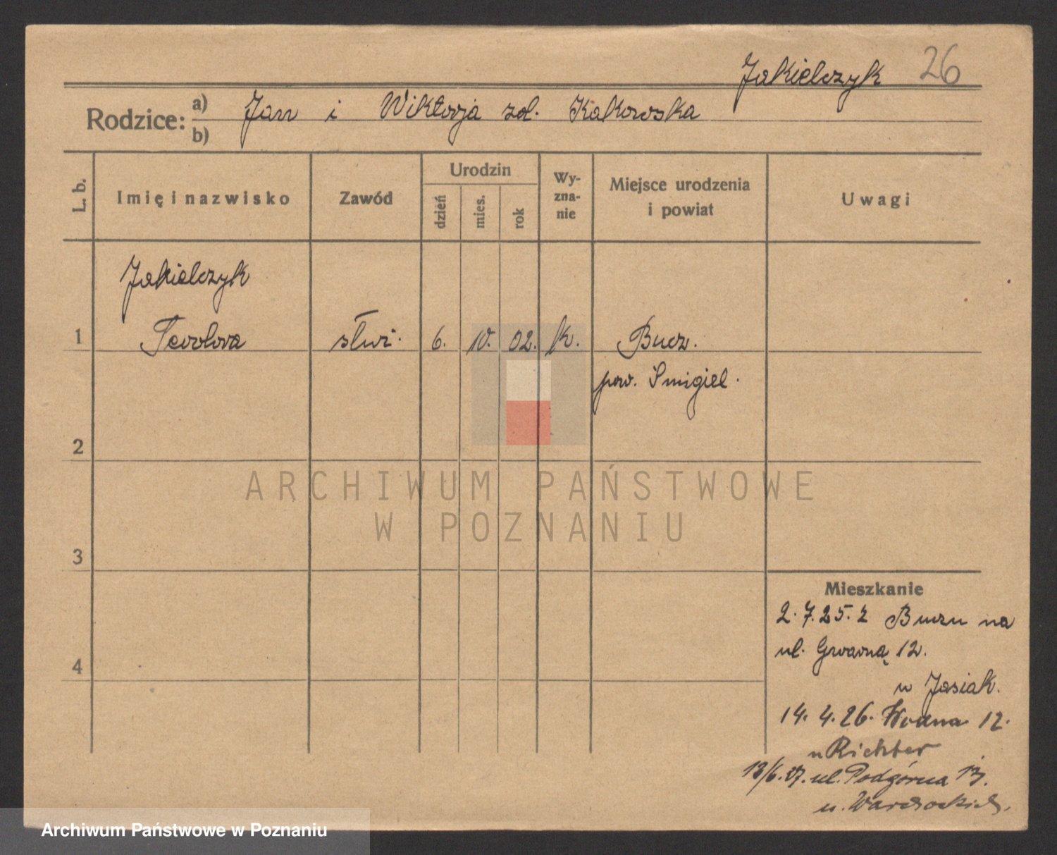 Podgląd karty osobowej dostępny jest po kliknięciu na nazwisko lub ikonkę karty. Można dokonywać powiększenia (ikony na górze) lub przechodzić między kolejnymi skanami (strzałki po bokach).