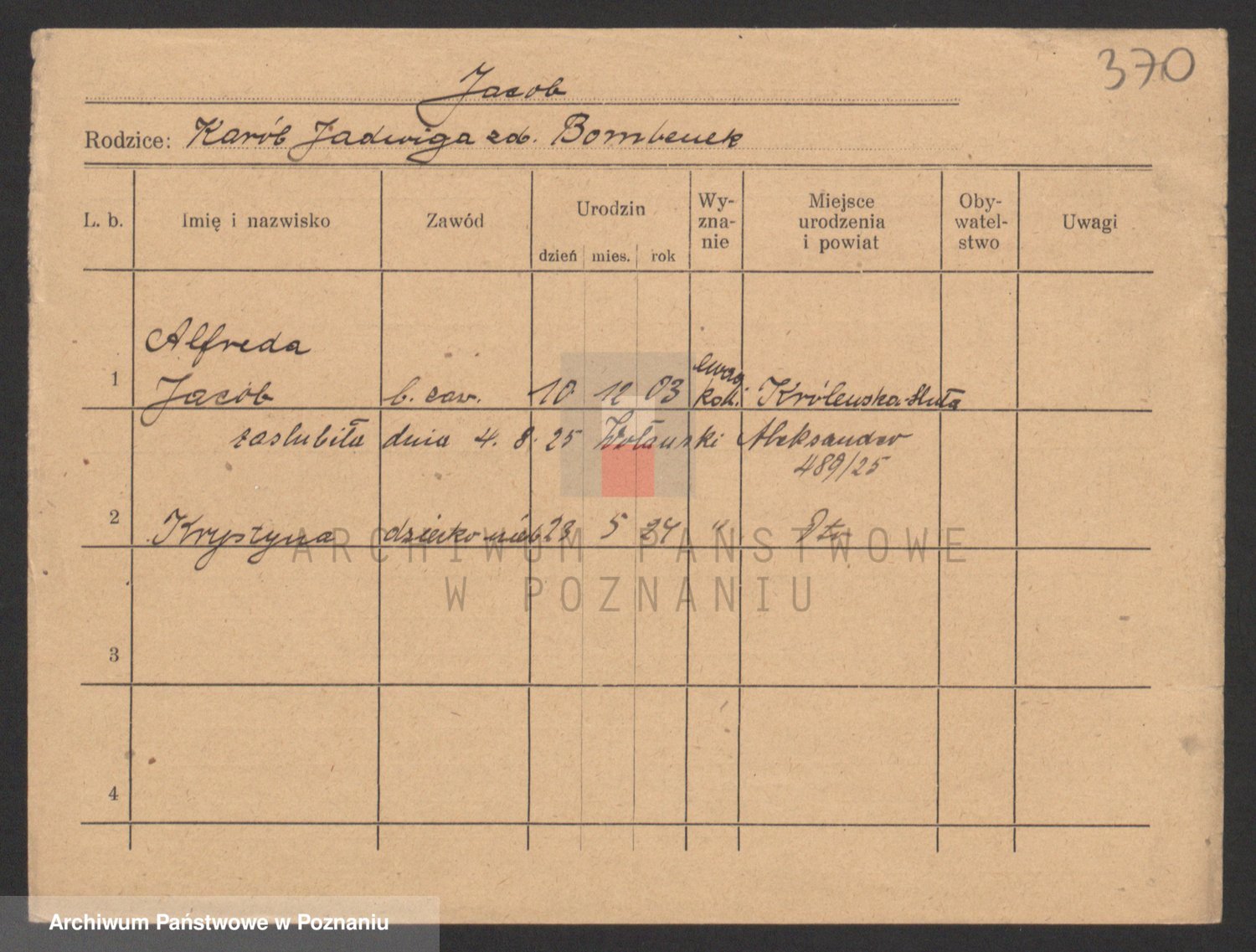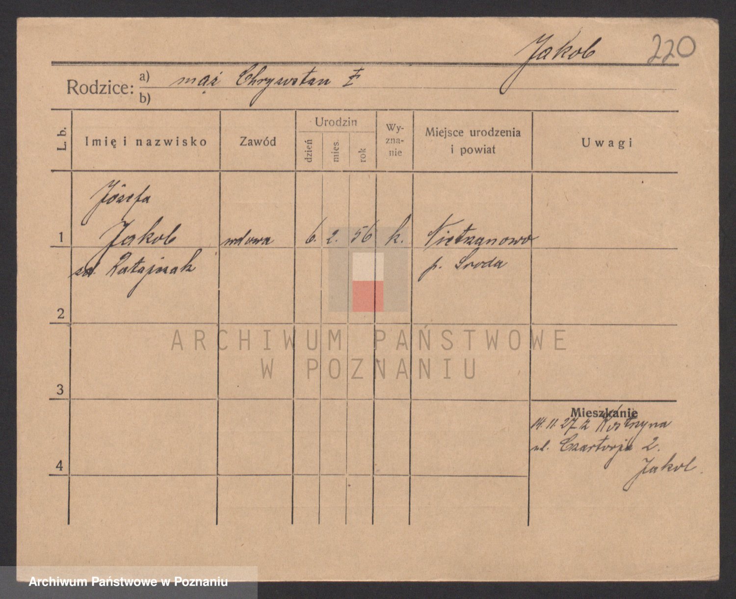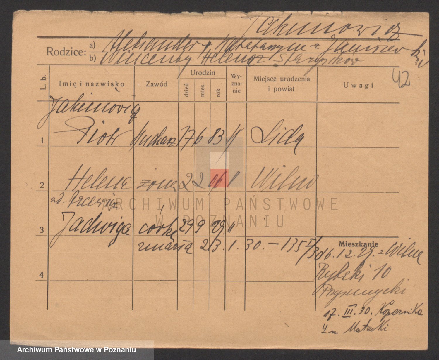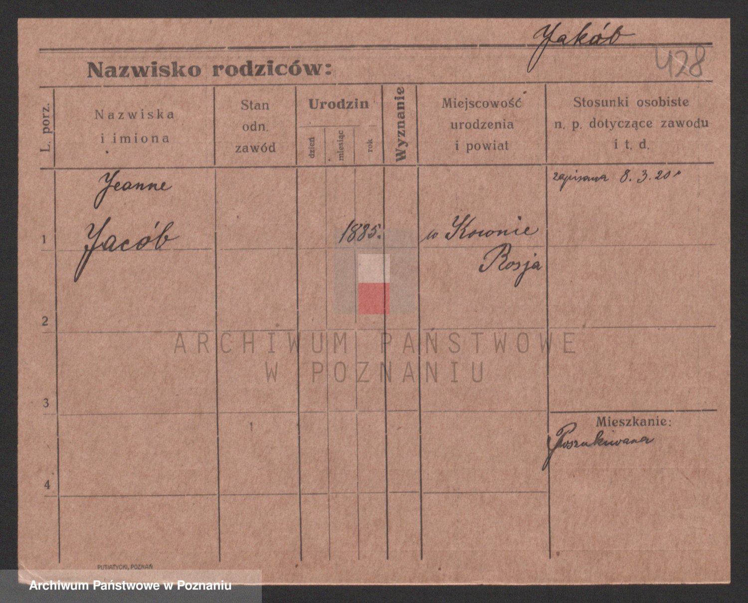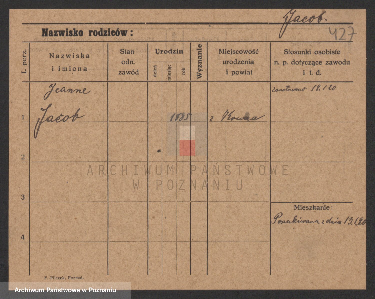 Podgląd karty osobowej dostępny jest po kliknięciu na nazwisko lub ikonkę karty. Można dokonywać powiększenia (ikony na górze) lub przechodzić między kolejnymi skanami (strzałki po bokach).