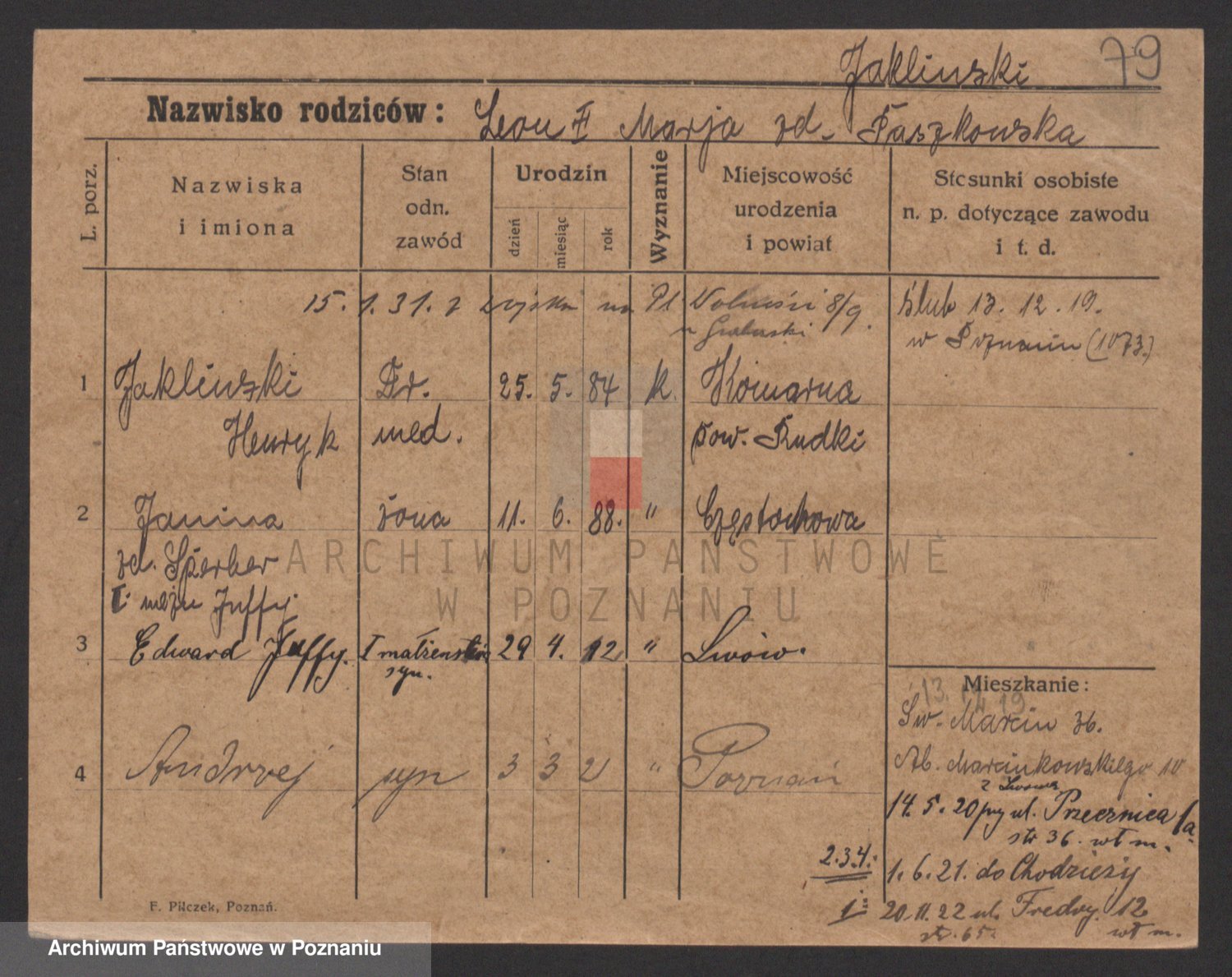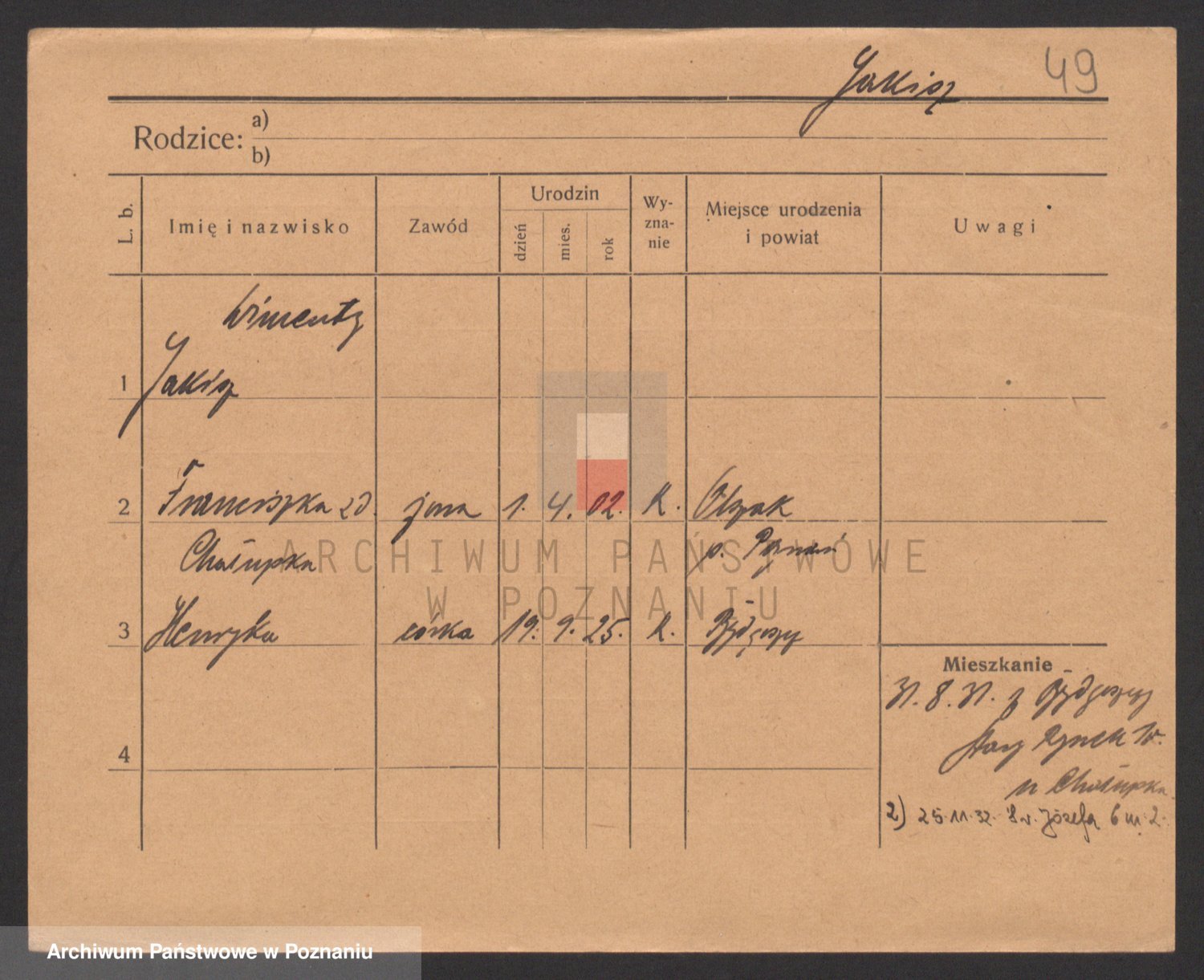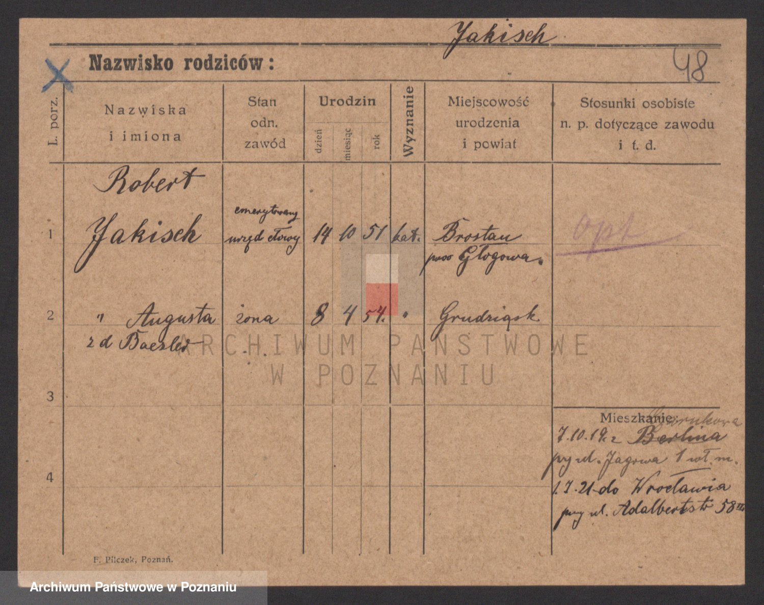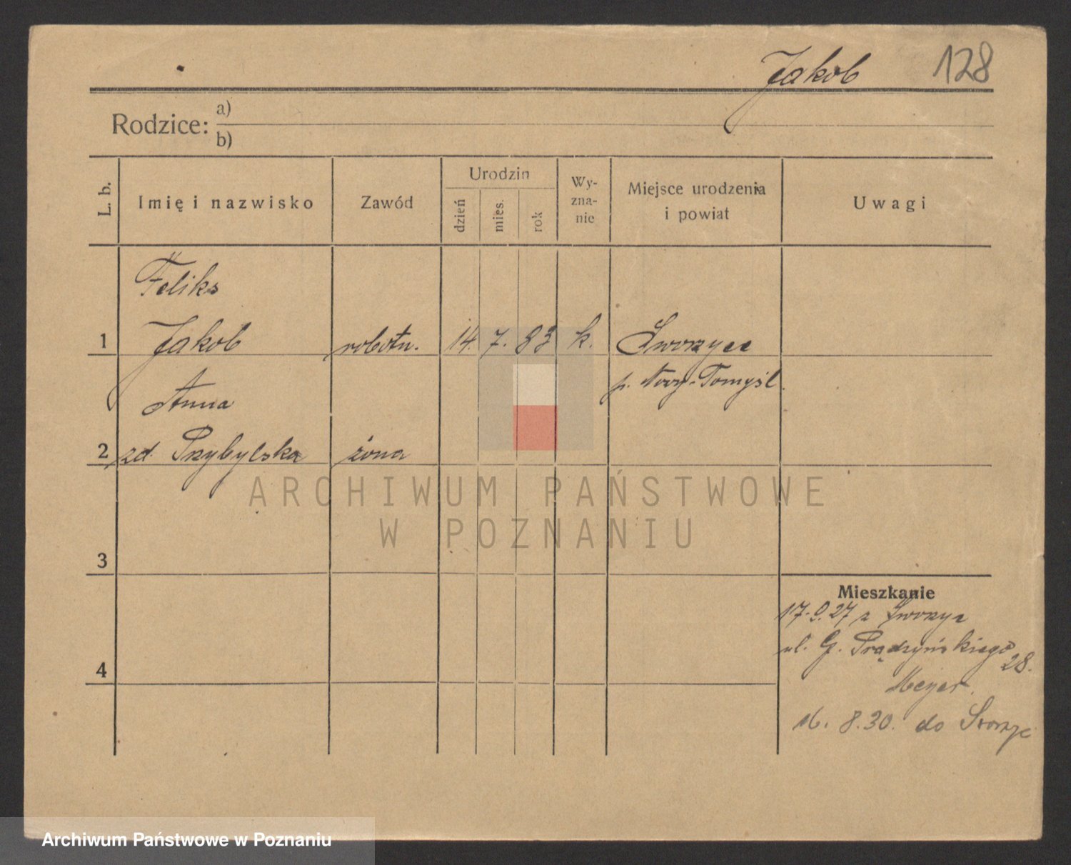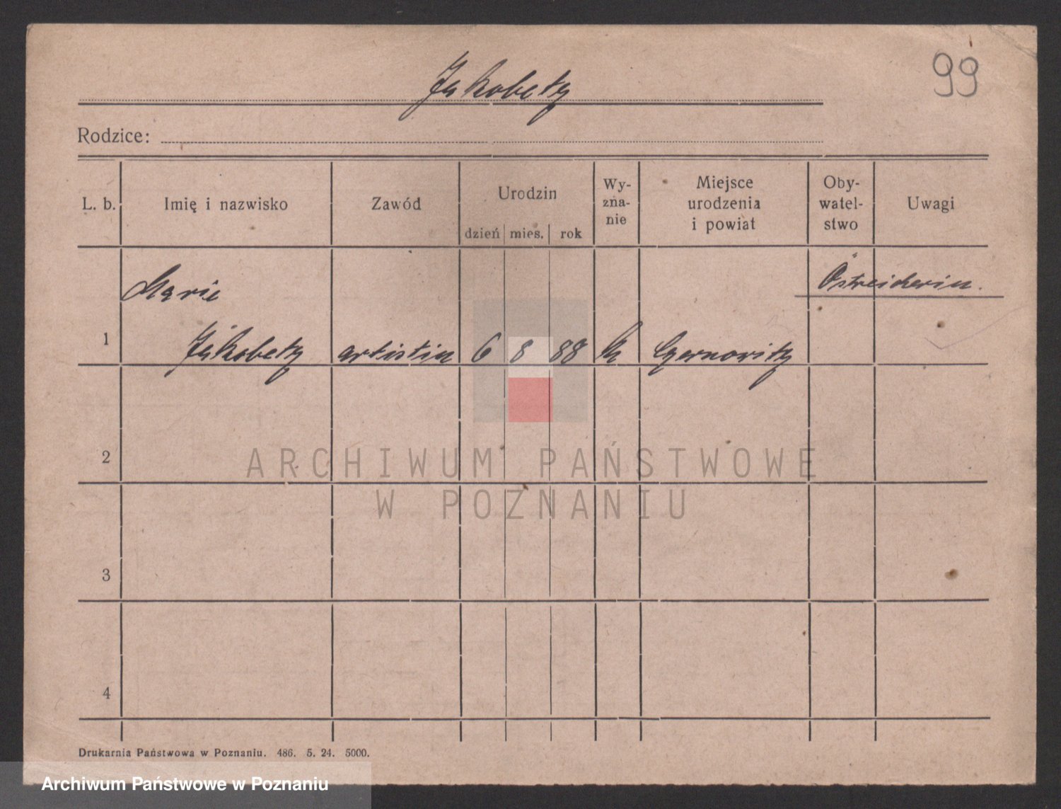 Podgląd karty osobowej dostępny jest po kliknięciu na nazwisko lub ikonkę karty. Można dokonywać powiększenia (ikony na górze) lub przechodzić między kolejnymi skanami (strzałki po bokach).