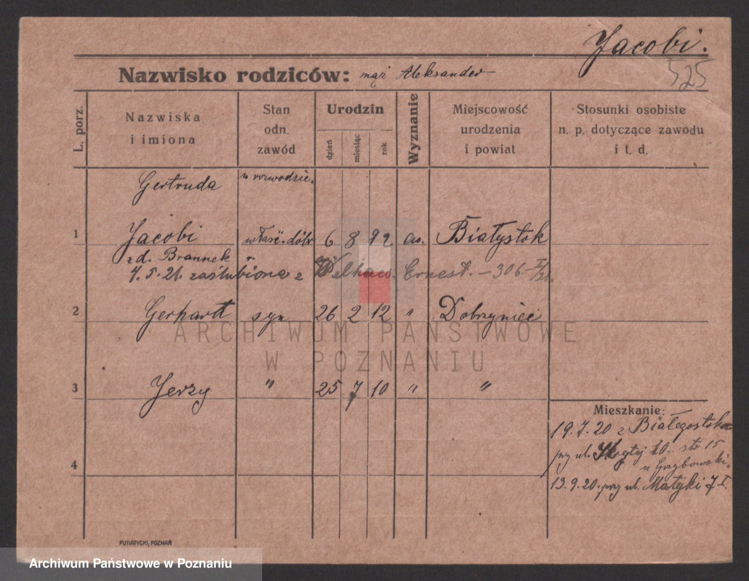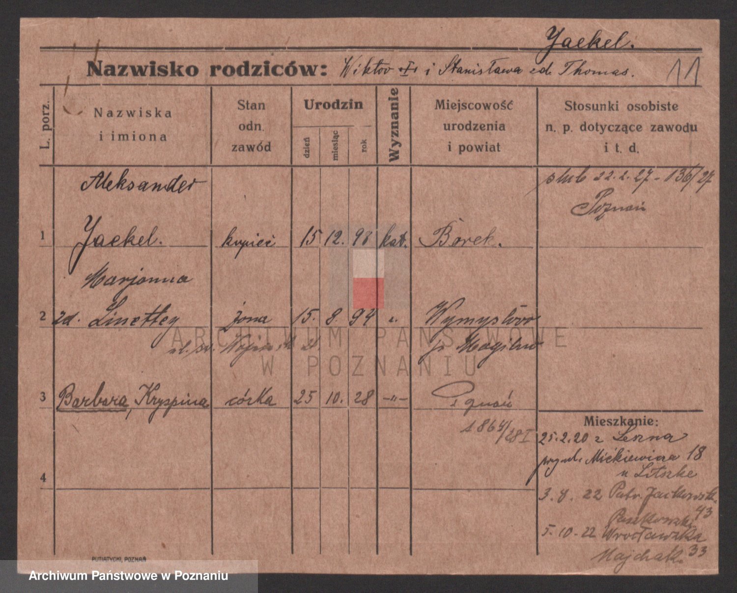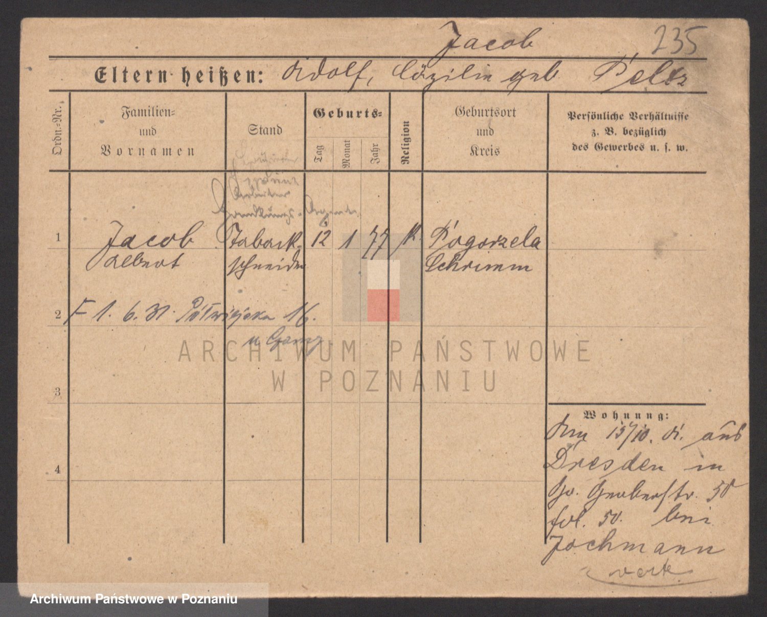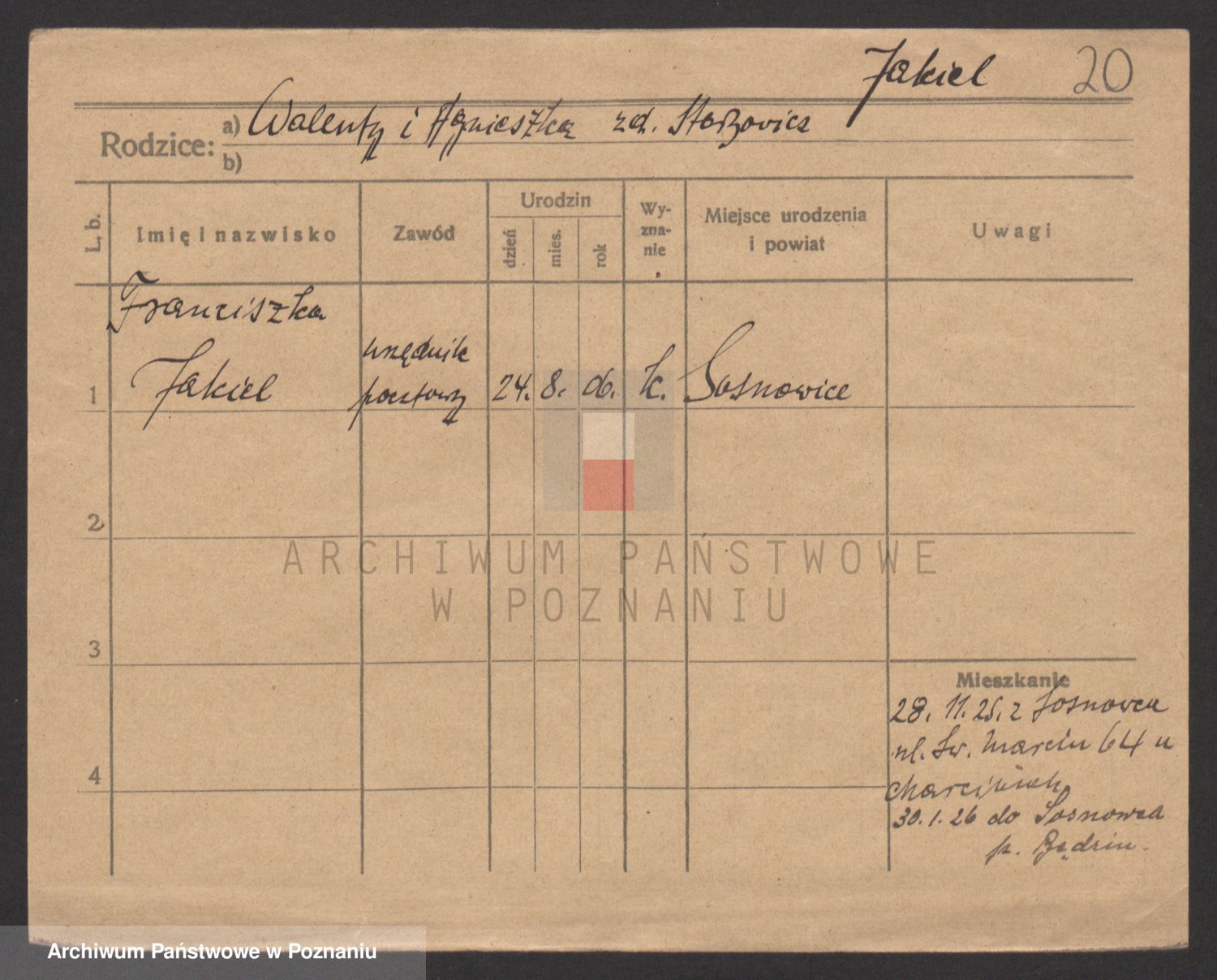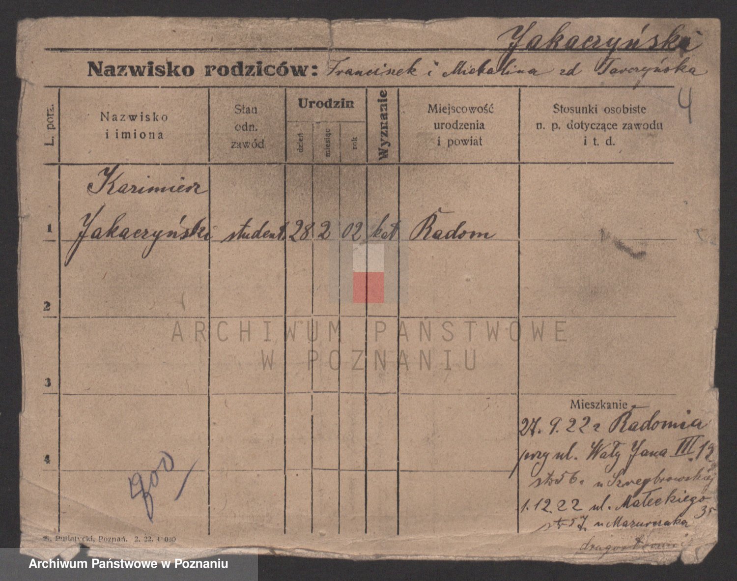 Podgląd karty osobowej dostępny jest po kliknięciu na nazwisko lub ikonkę karty. Można dokonywać powiększenia (ikony na górze) lub przechodzić między kolejnymi skanami (strzałki po bokach).