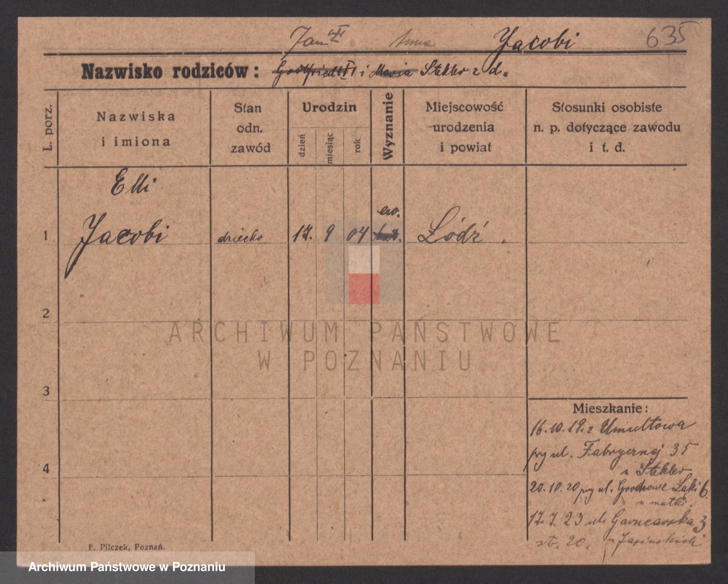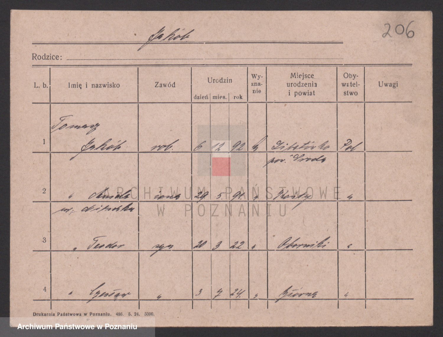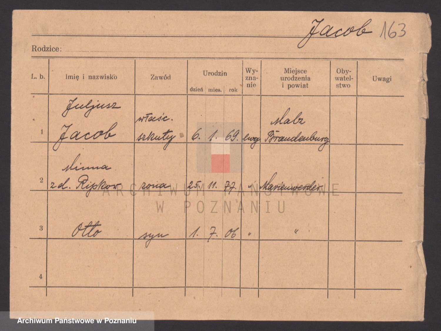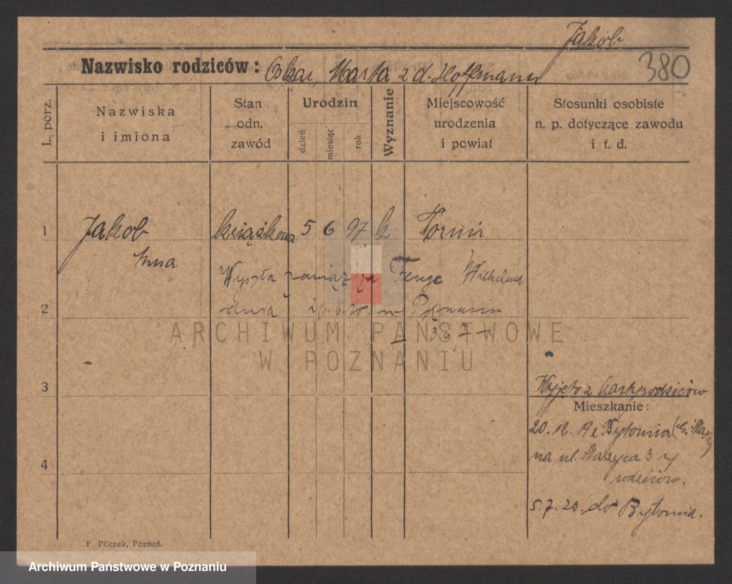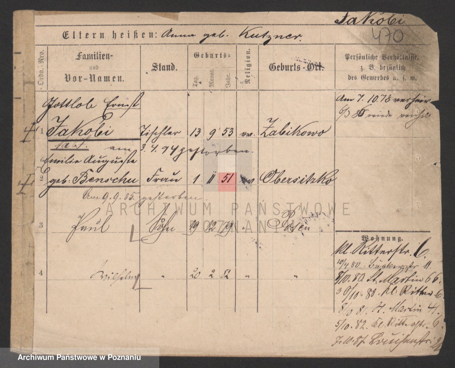 Podgląd karty osobowej dostępny jest po kliknięciu na nazwisko lub ikonkę karty. Można dokonywać powiększenia (ikony na górze) lub przechodzić między kolejnymi skanami (strzałki po bokach).