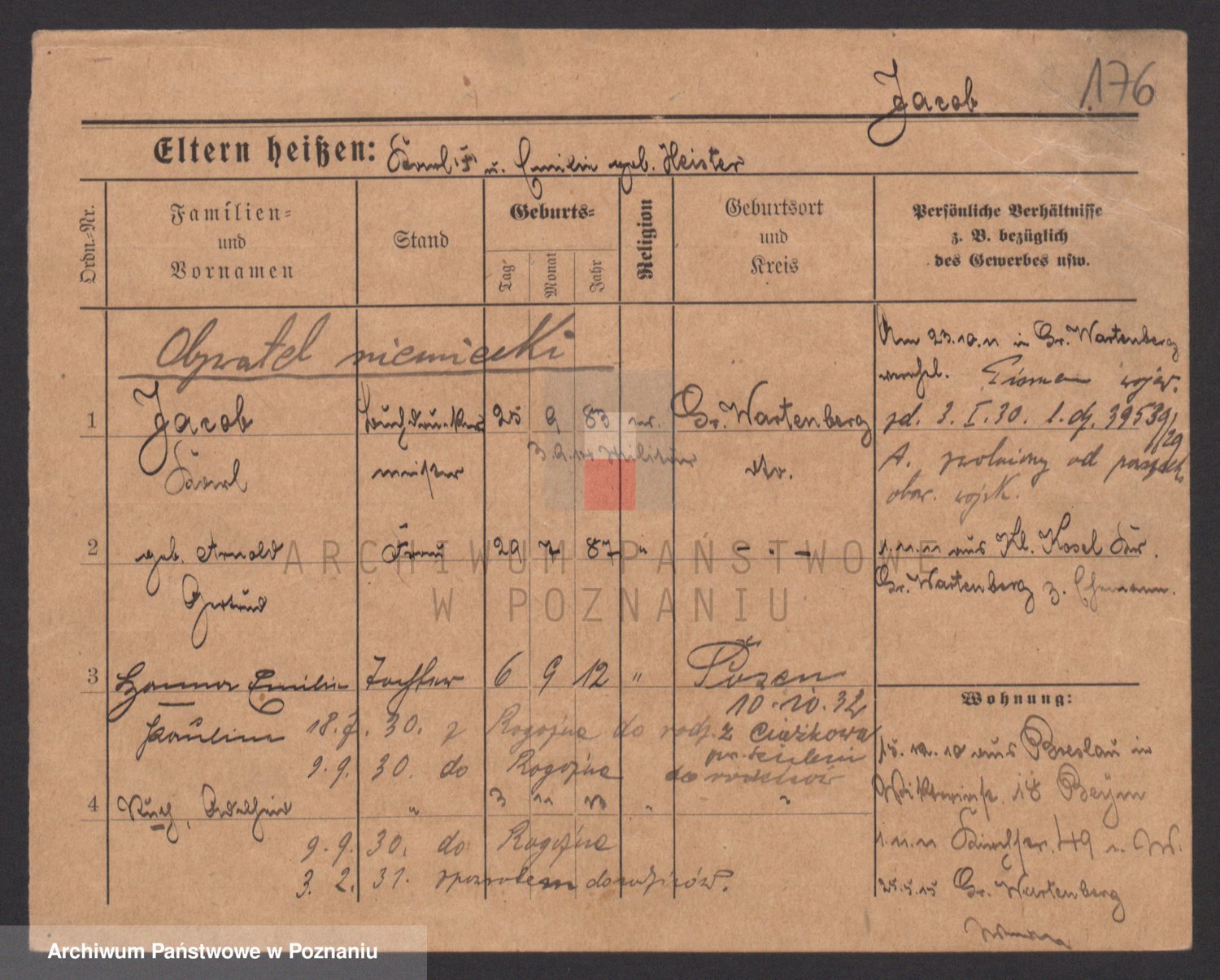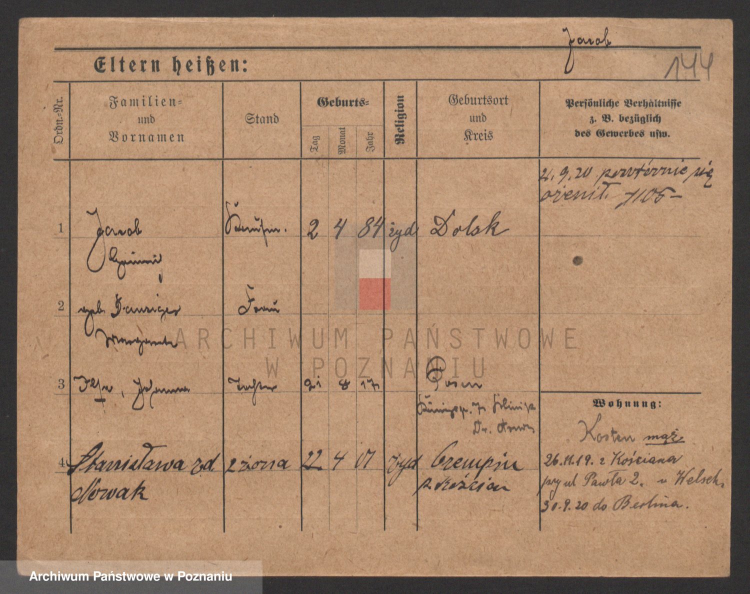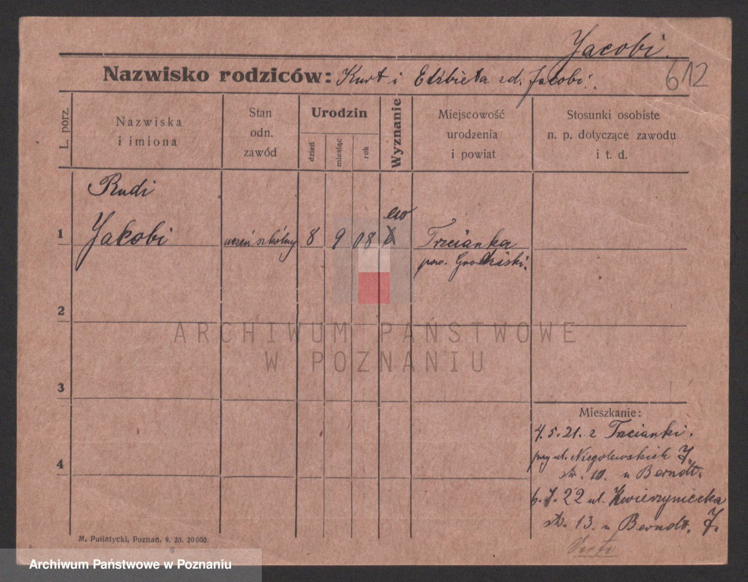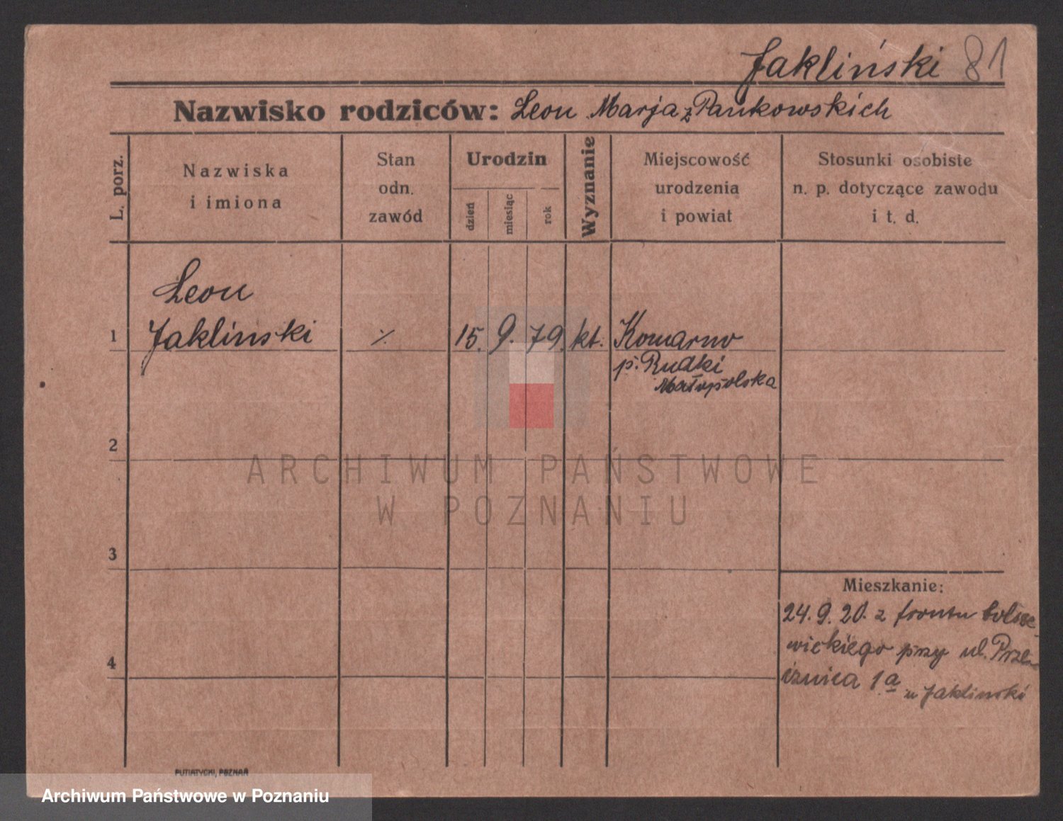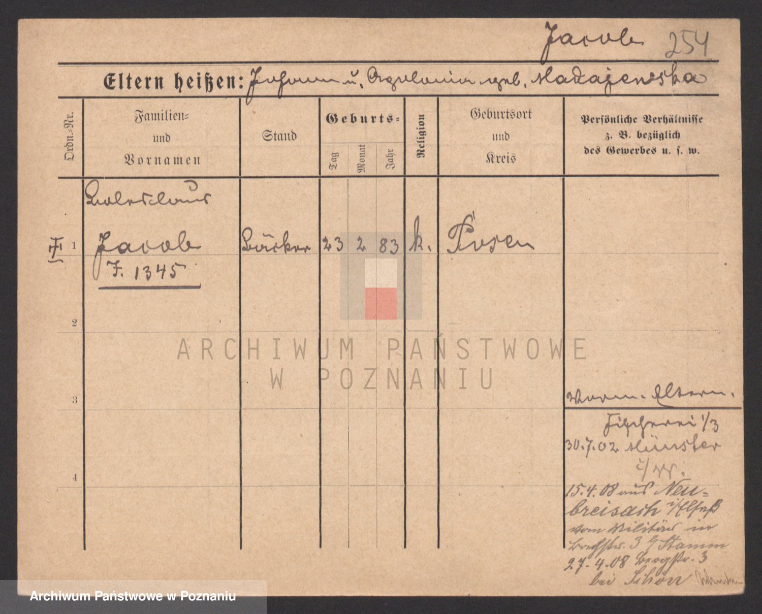 Podgląd karty osobowej dostępny jest po kliknięciu na nazwisko lub ikonkę karty. Można dokonywać powiększenia (ikony na górze) lub przechodzić między kolejnymi skanami (strzałki po bokach).
