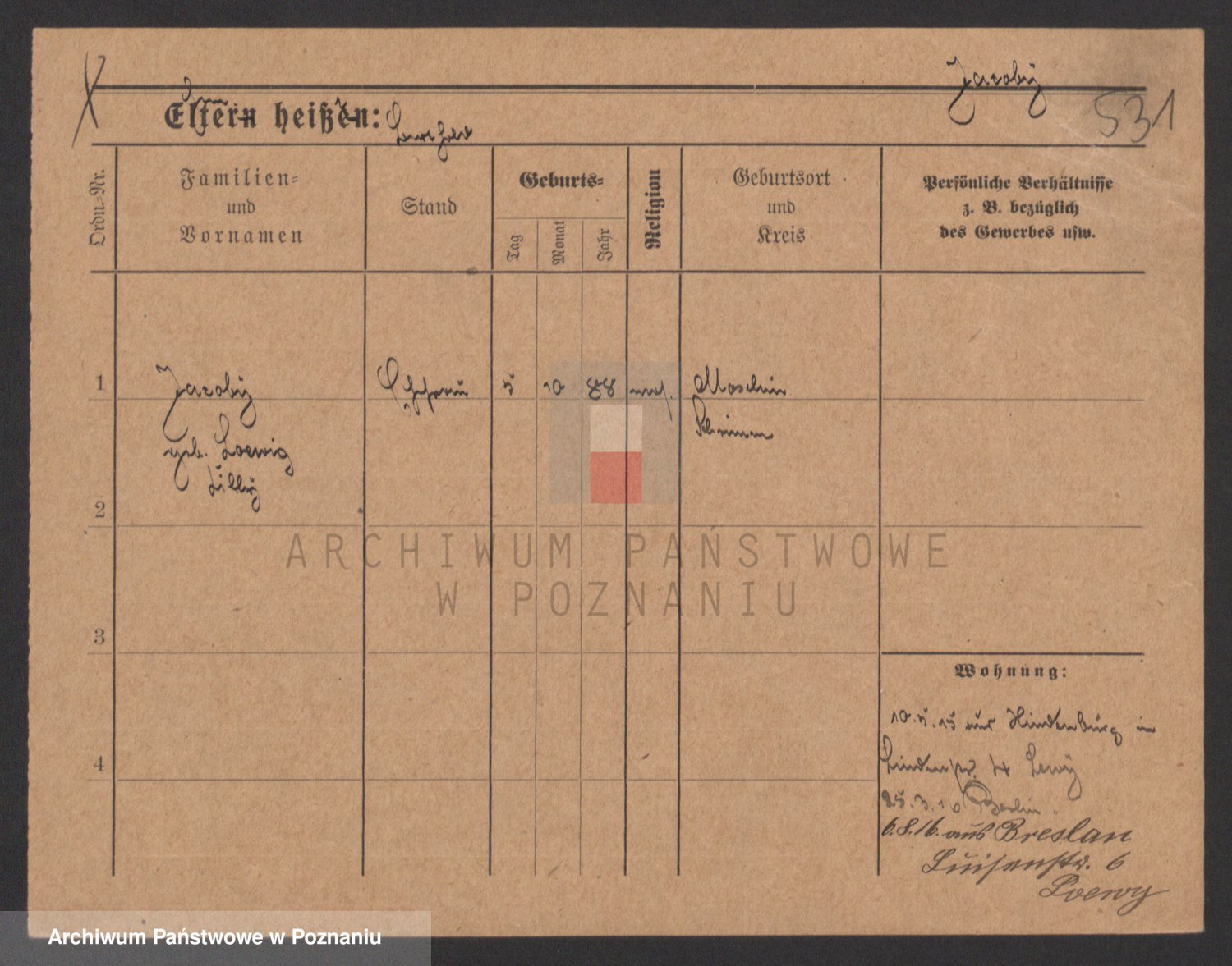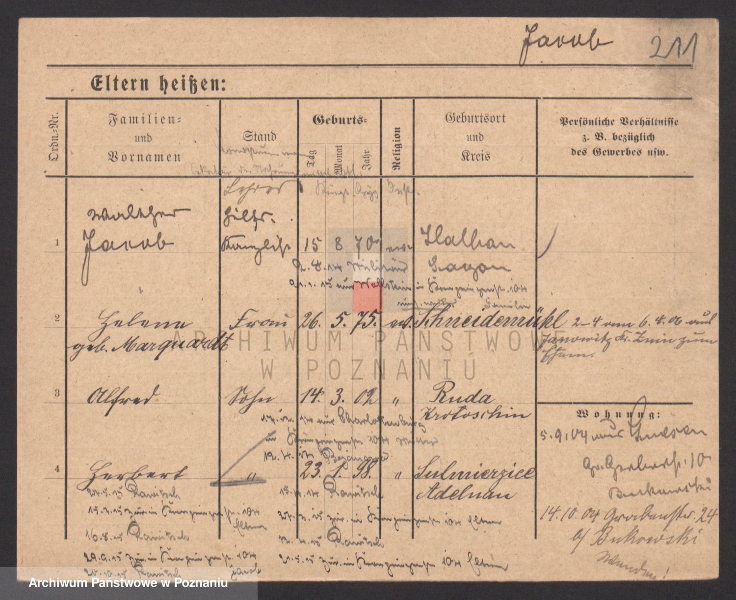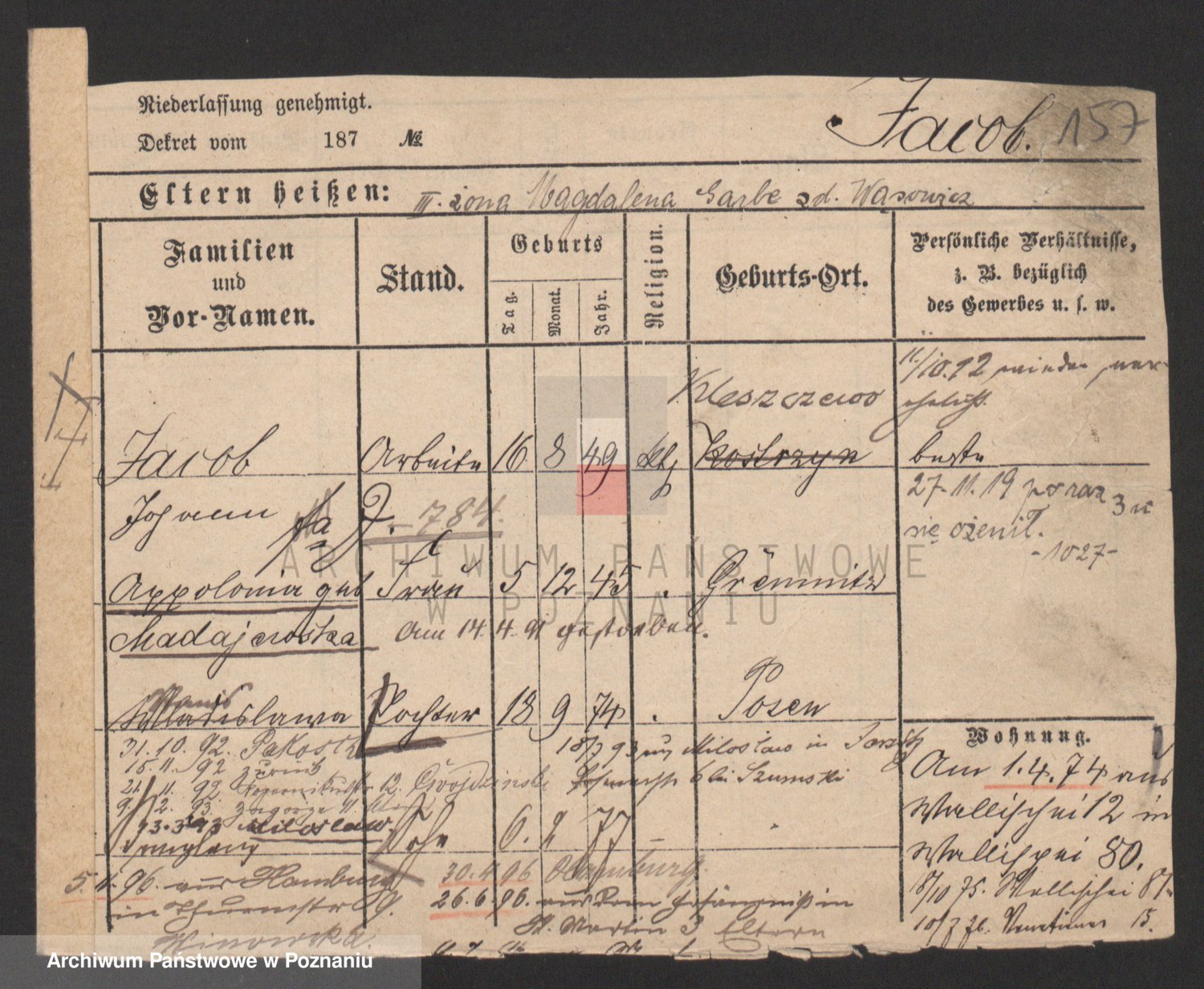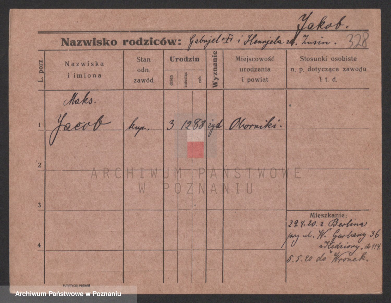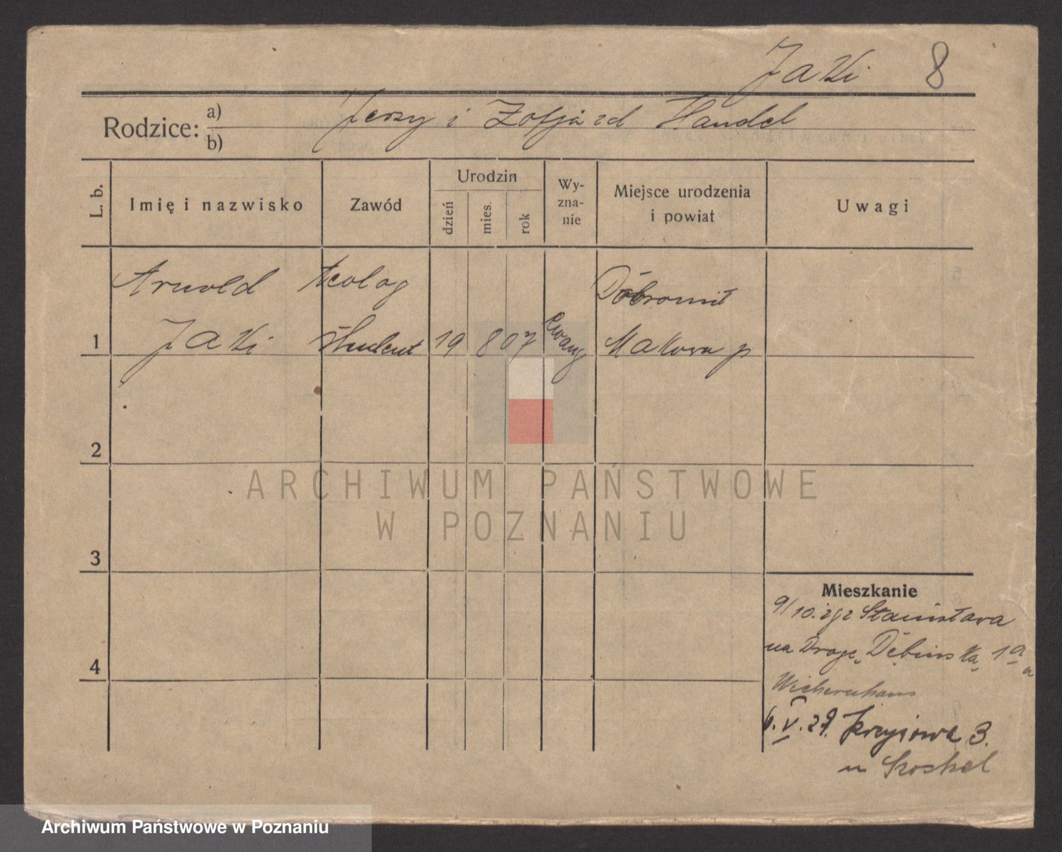 Podgląd karty osobowej dostępny jest po kliknięciu na nazwisko lub ikonkę karty. Można dokonywać powiększenia (ikony na górze) lub przechodzić między kolejnymi skanami (strzałki po bokach).