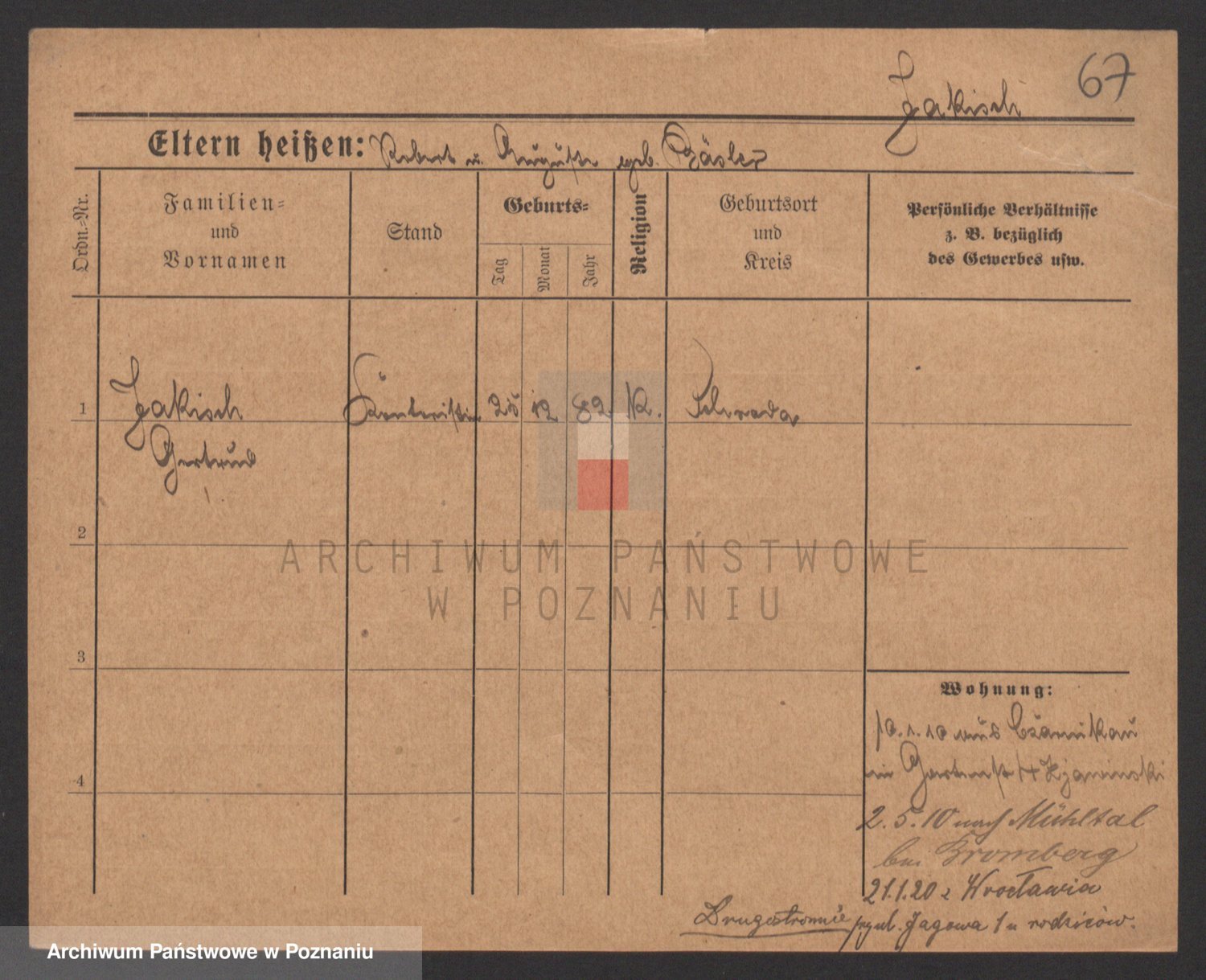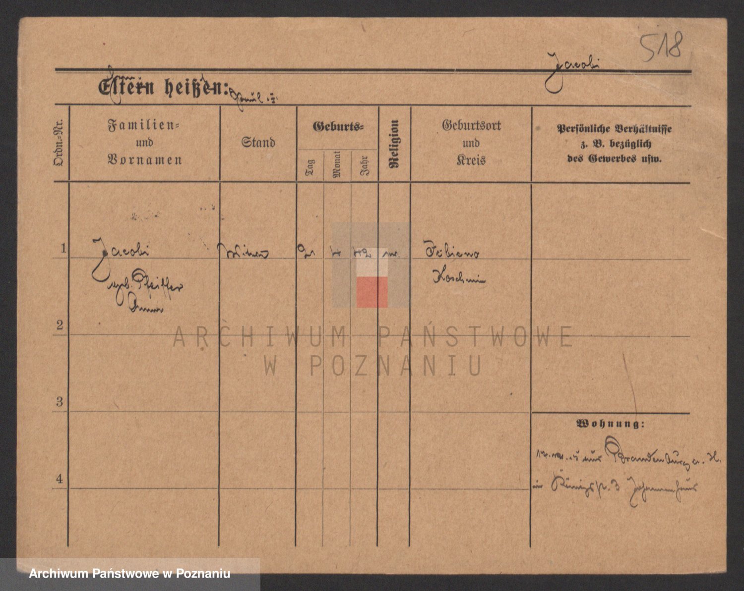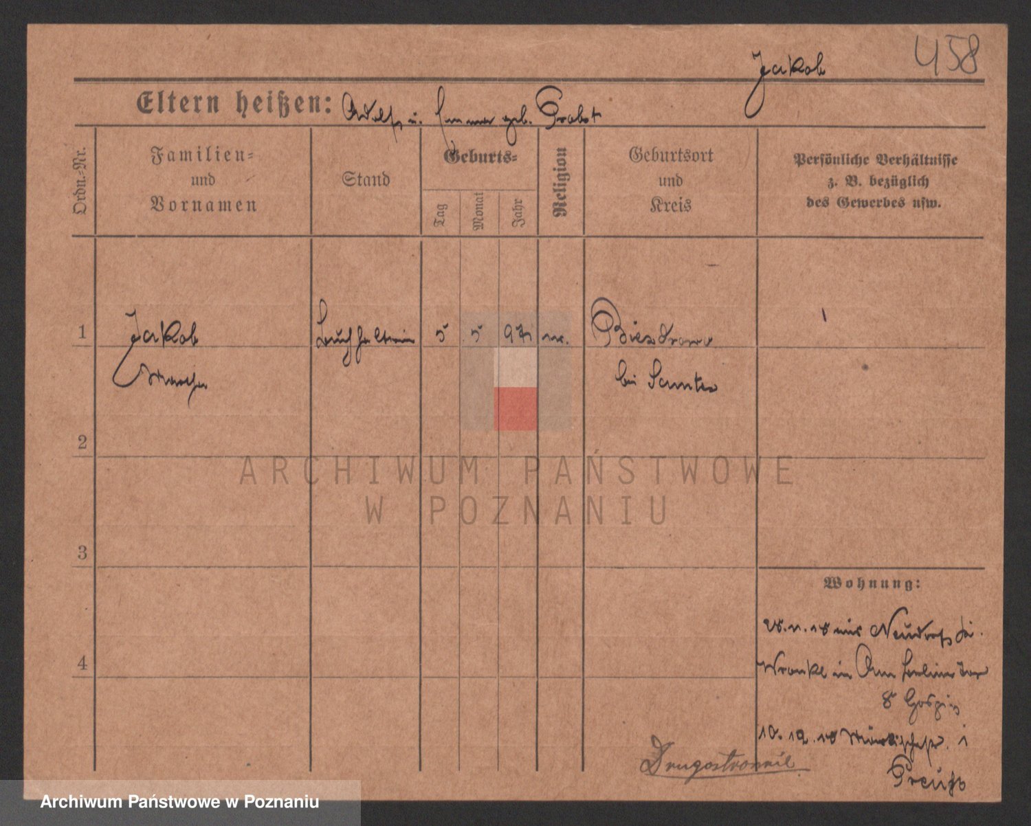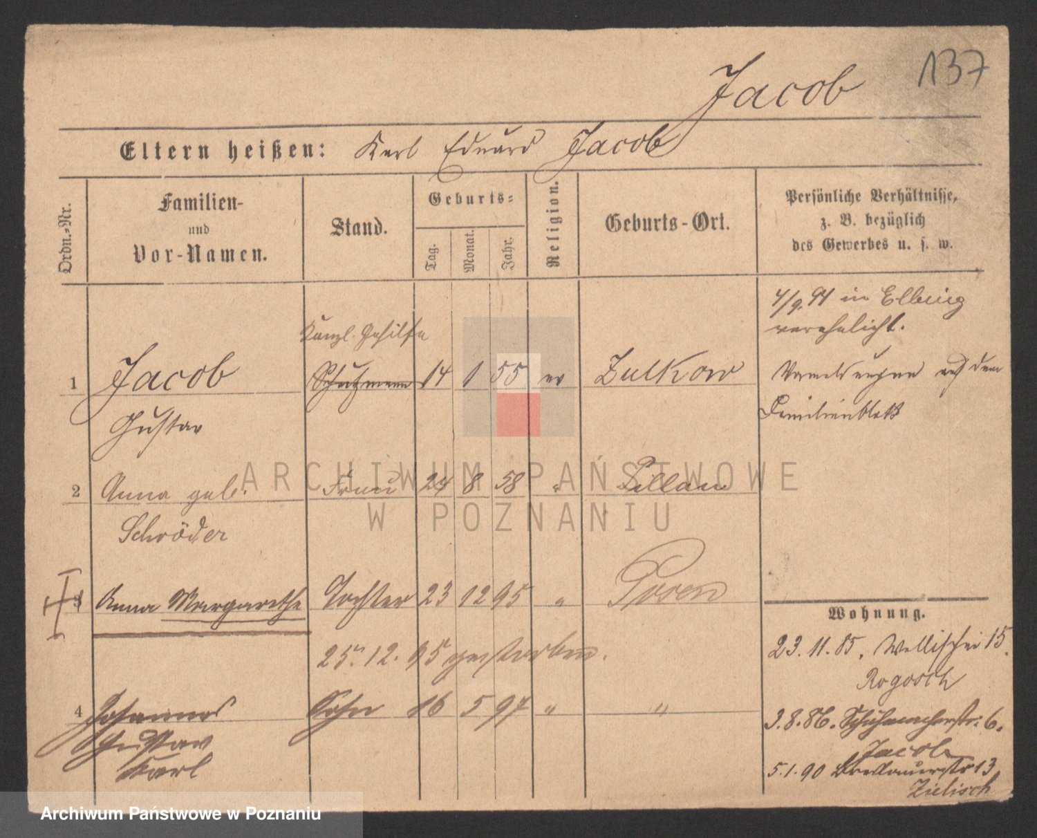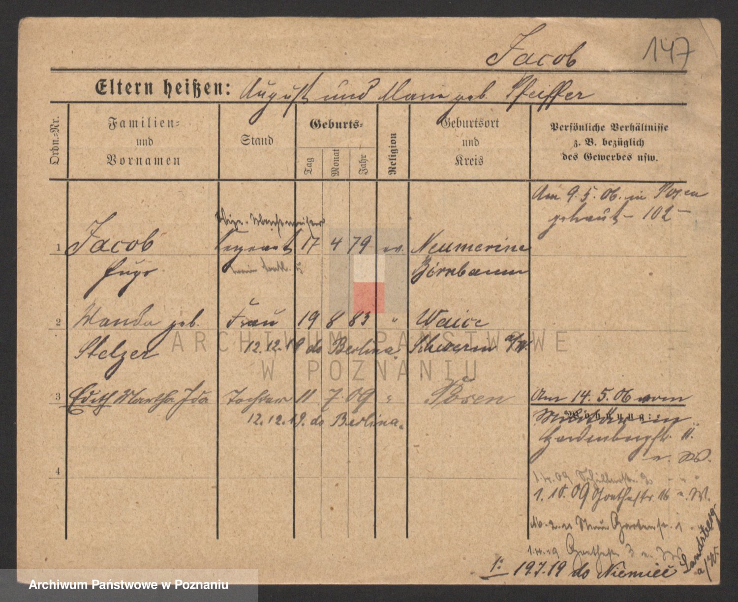 Podgląd karty osobowej dostępny jest po kliknięciu na nazwisko lub ikonkę karty. Można dokonywać powiększenia (ikony na górze) lub przechodzić między kolejnymi skanami (strzałki po bokach).