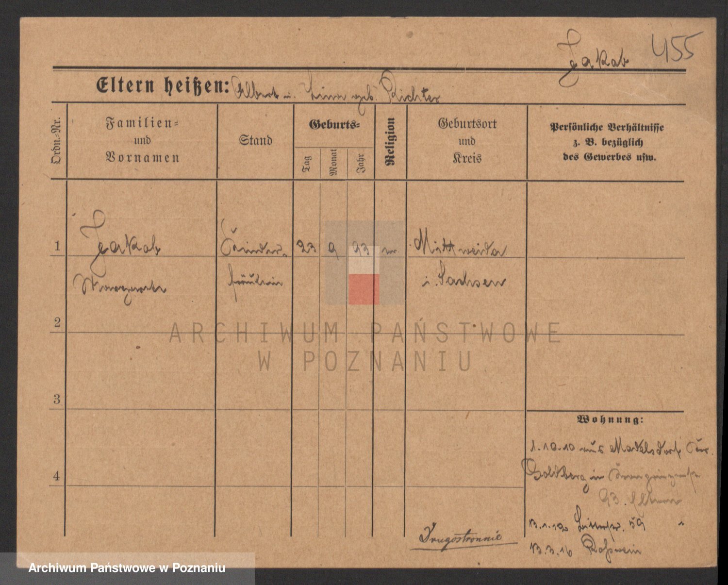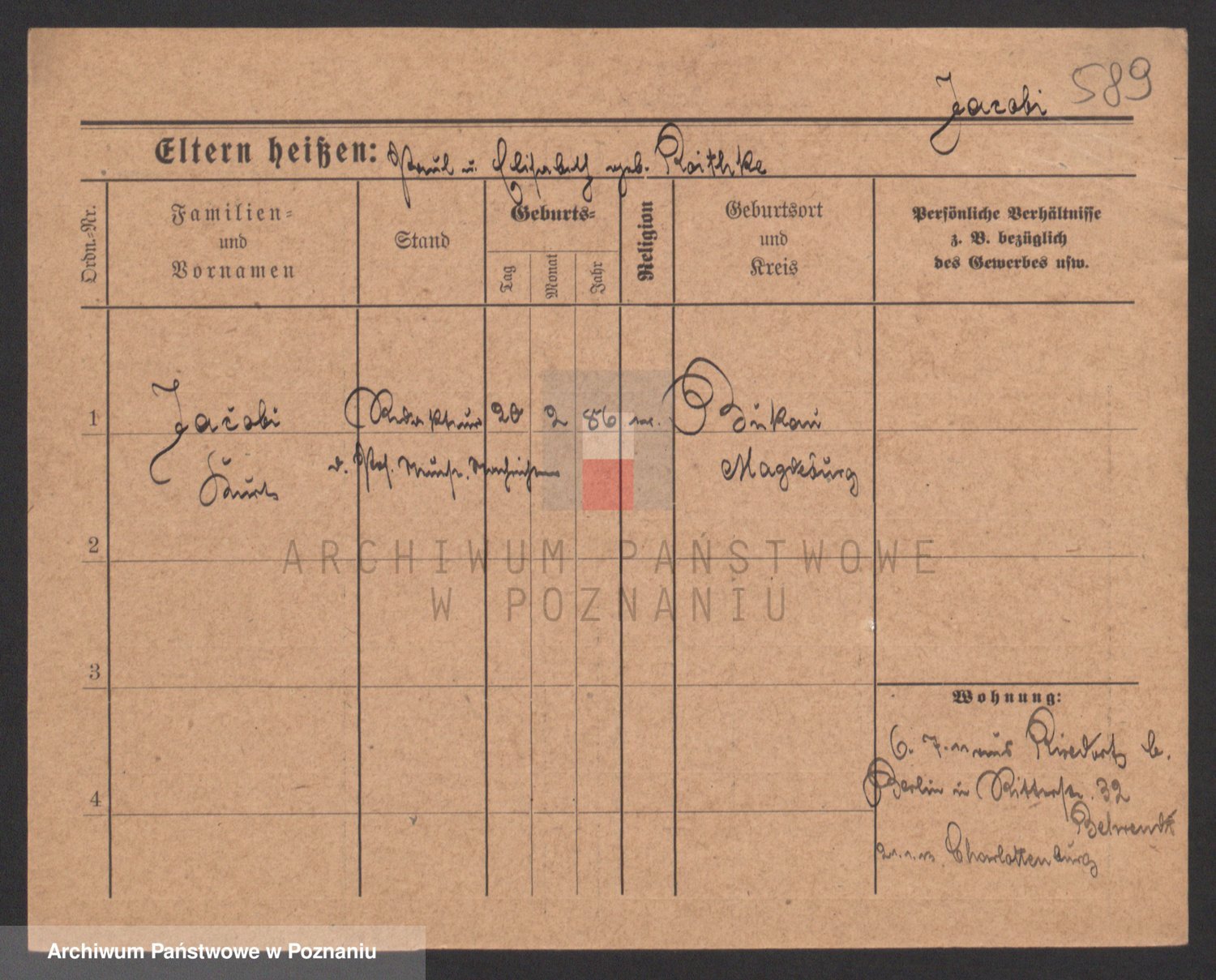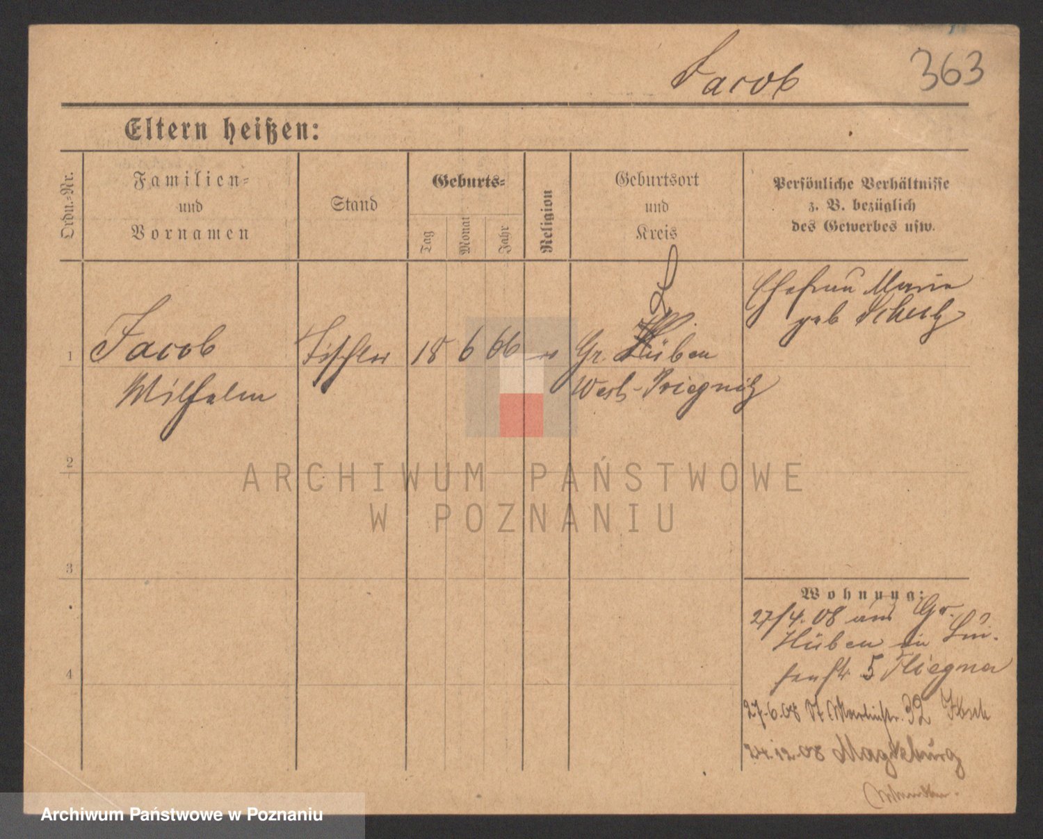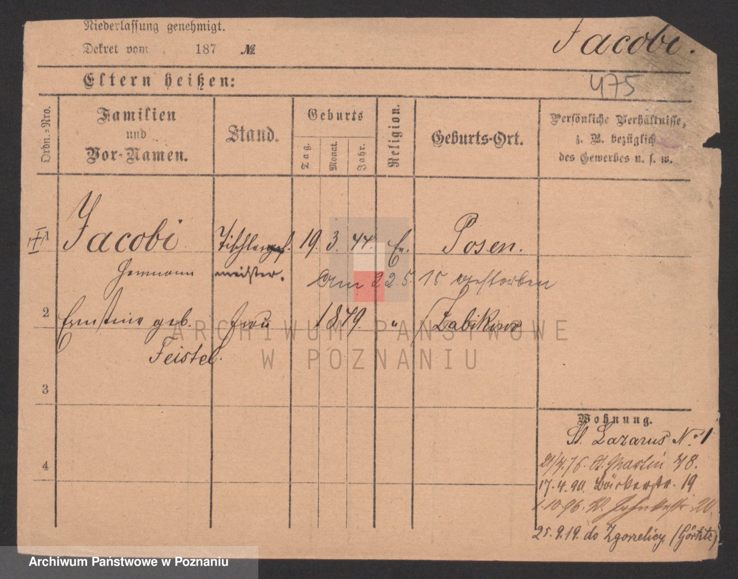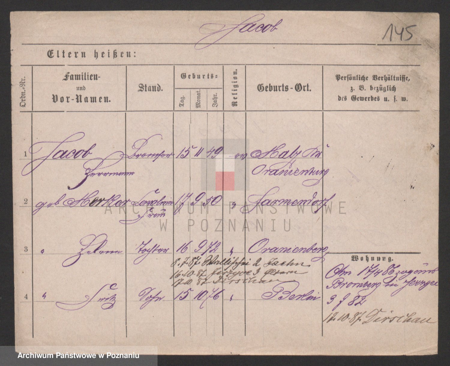 Podgląd karty osobowej dostępny jest po kliknięciu na nazwisko lub ikonkę karty. Można dokonywać powiększenia (ikony na górze) lub przechodzić między kolejnymi skanami (strzałki po bokach).