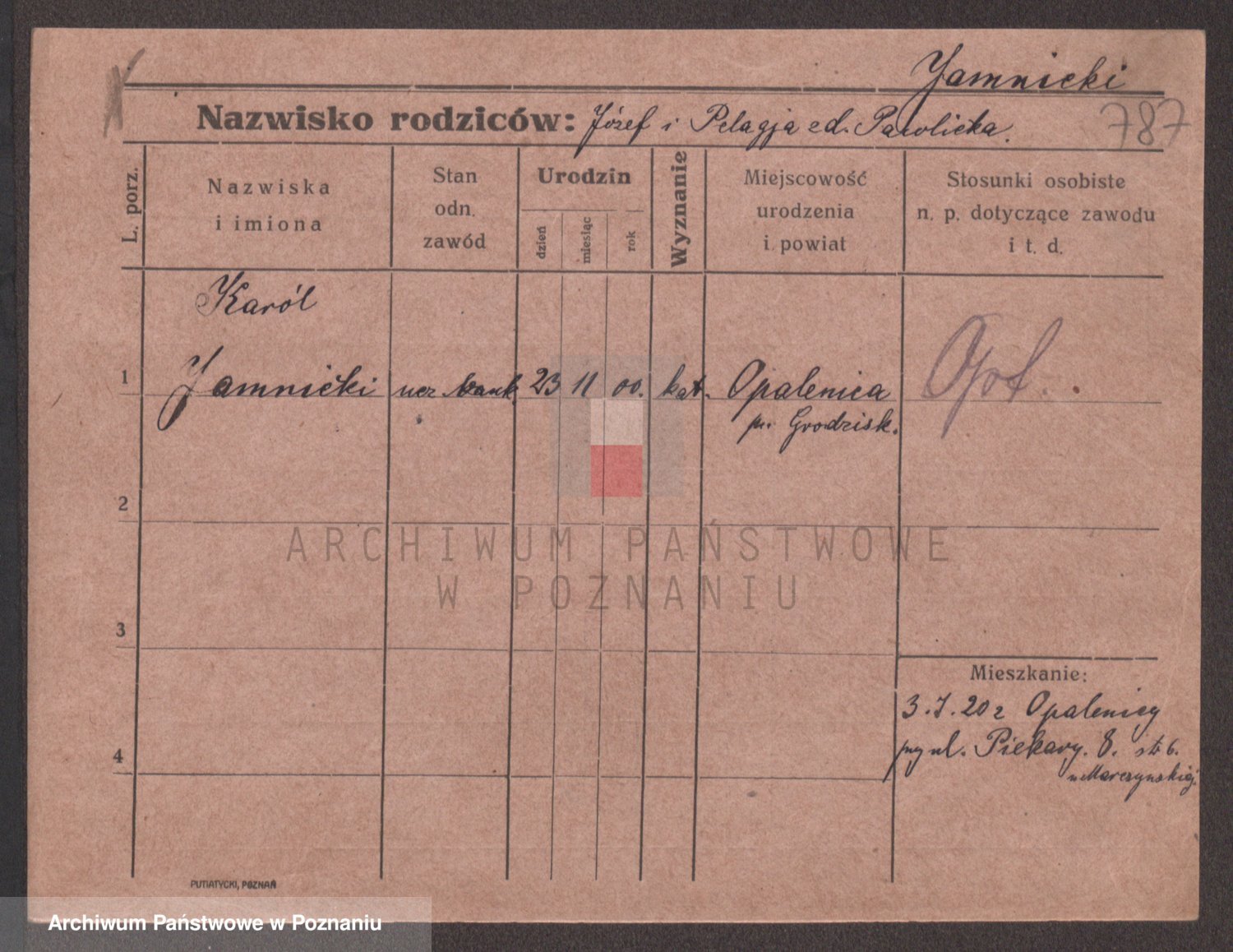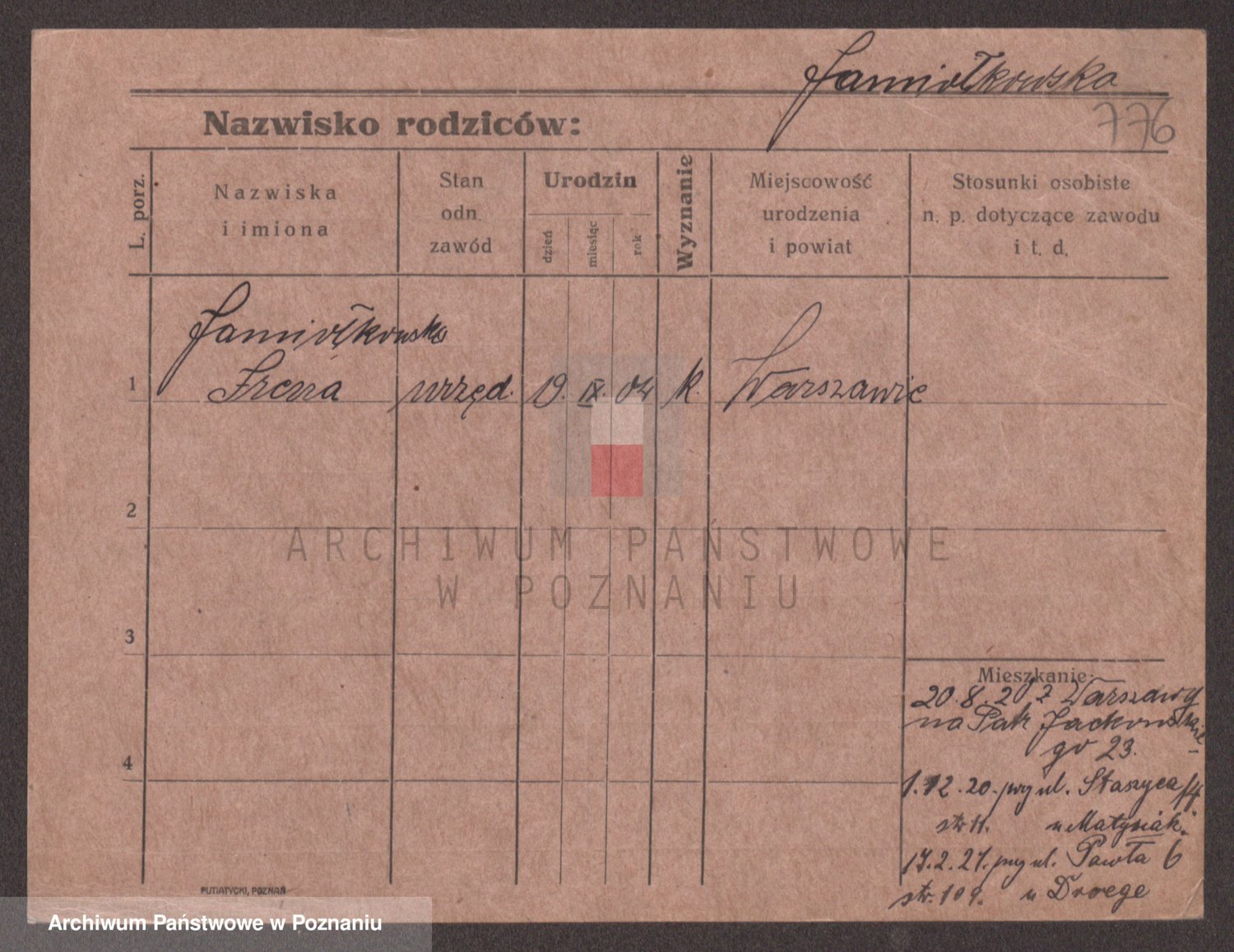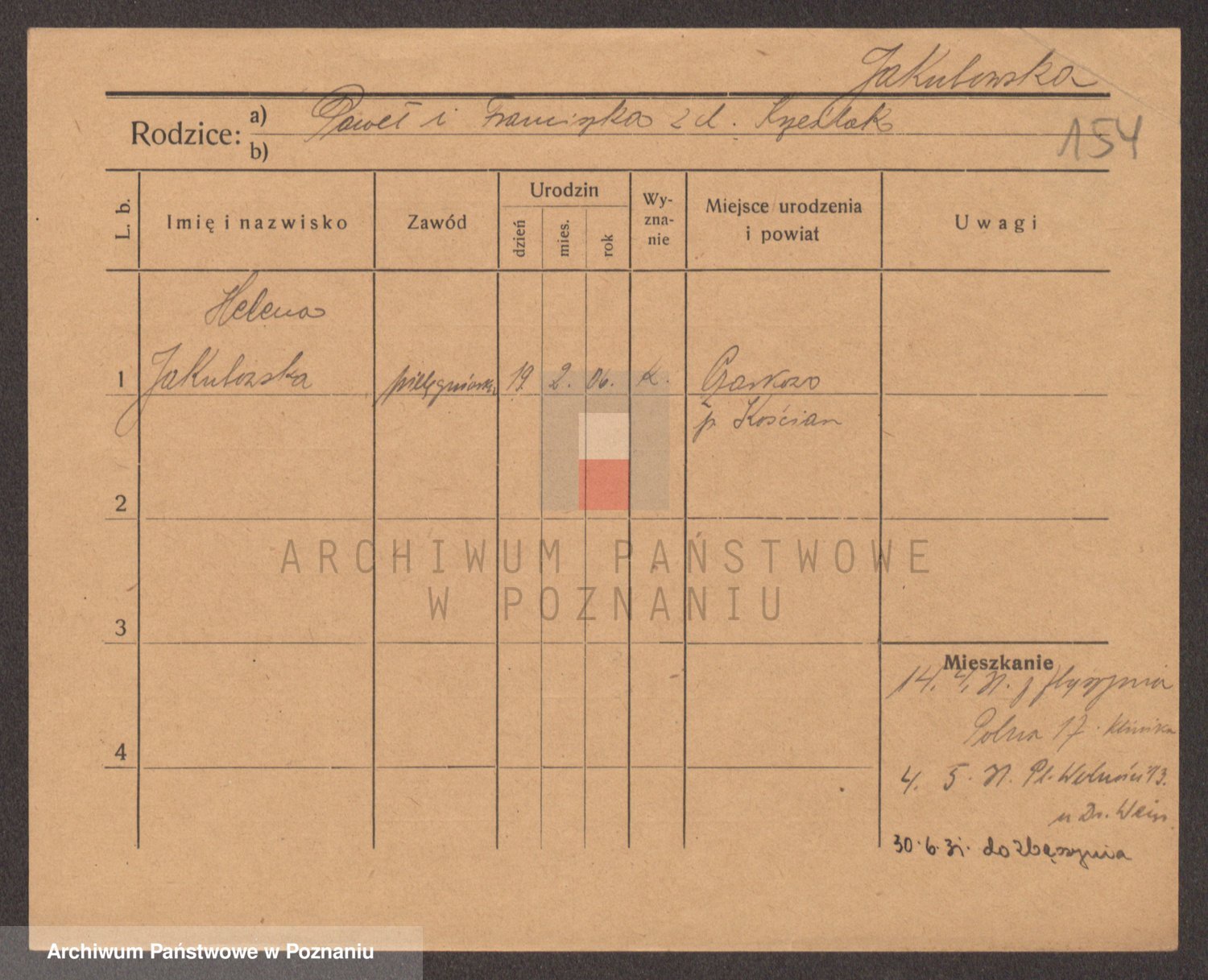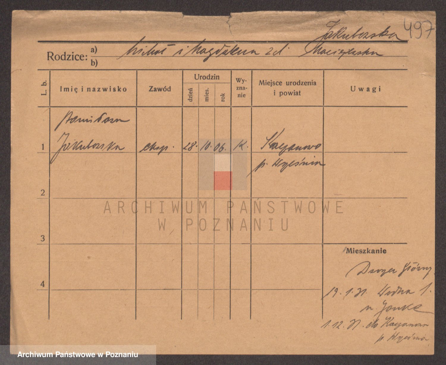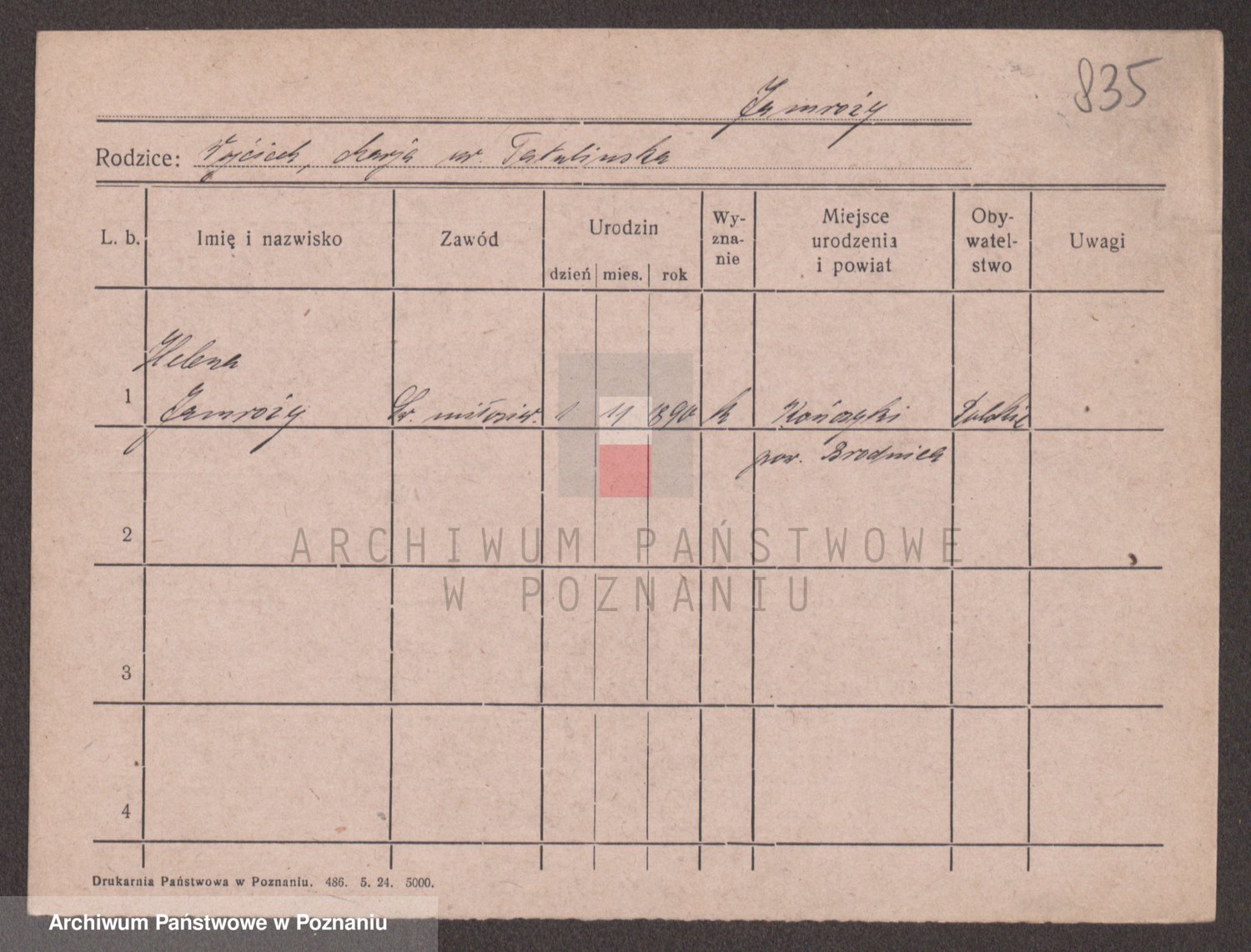 Podgląd karty osobowej dostępny jest po kliknięciu na nazwisko lub ikonkę karty. Można dokonywać powiększenia (ikony na górze) lub przechodzić między kolejnymi skanami (strzałki po bokach).