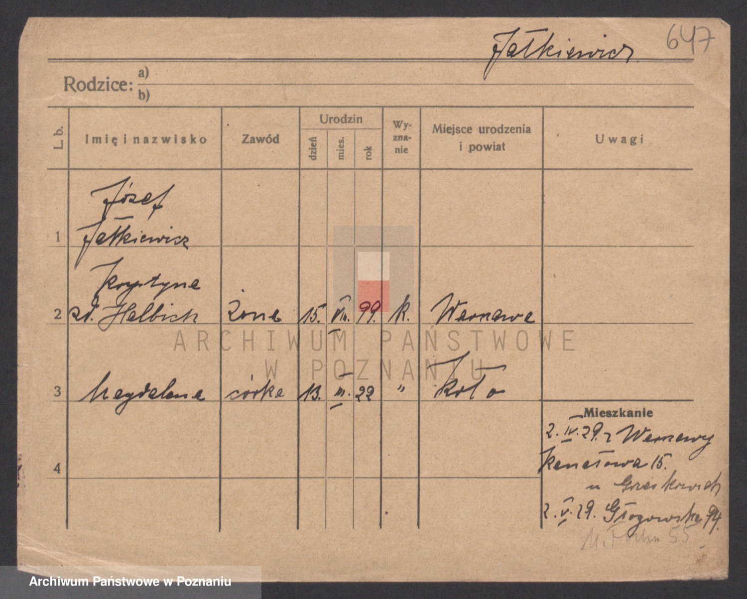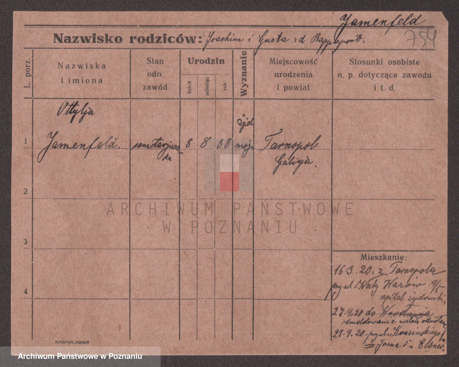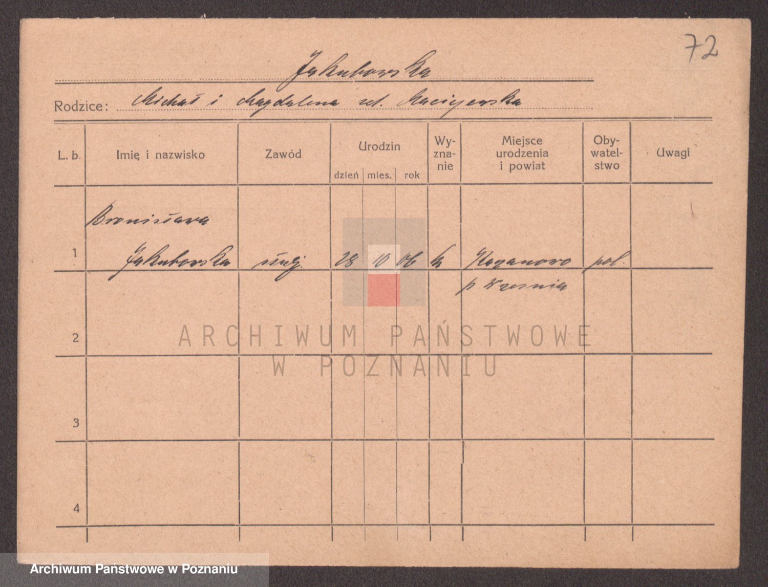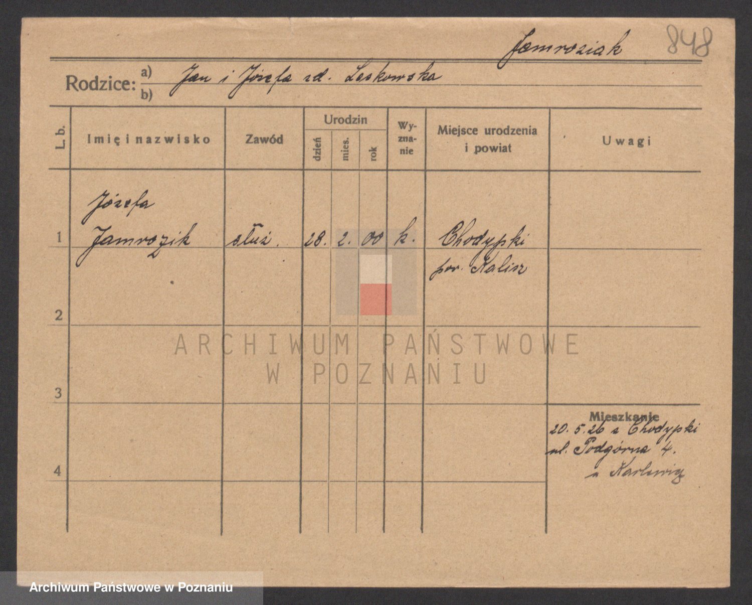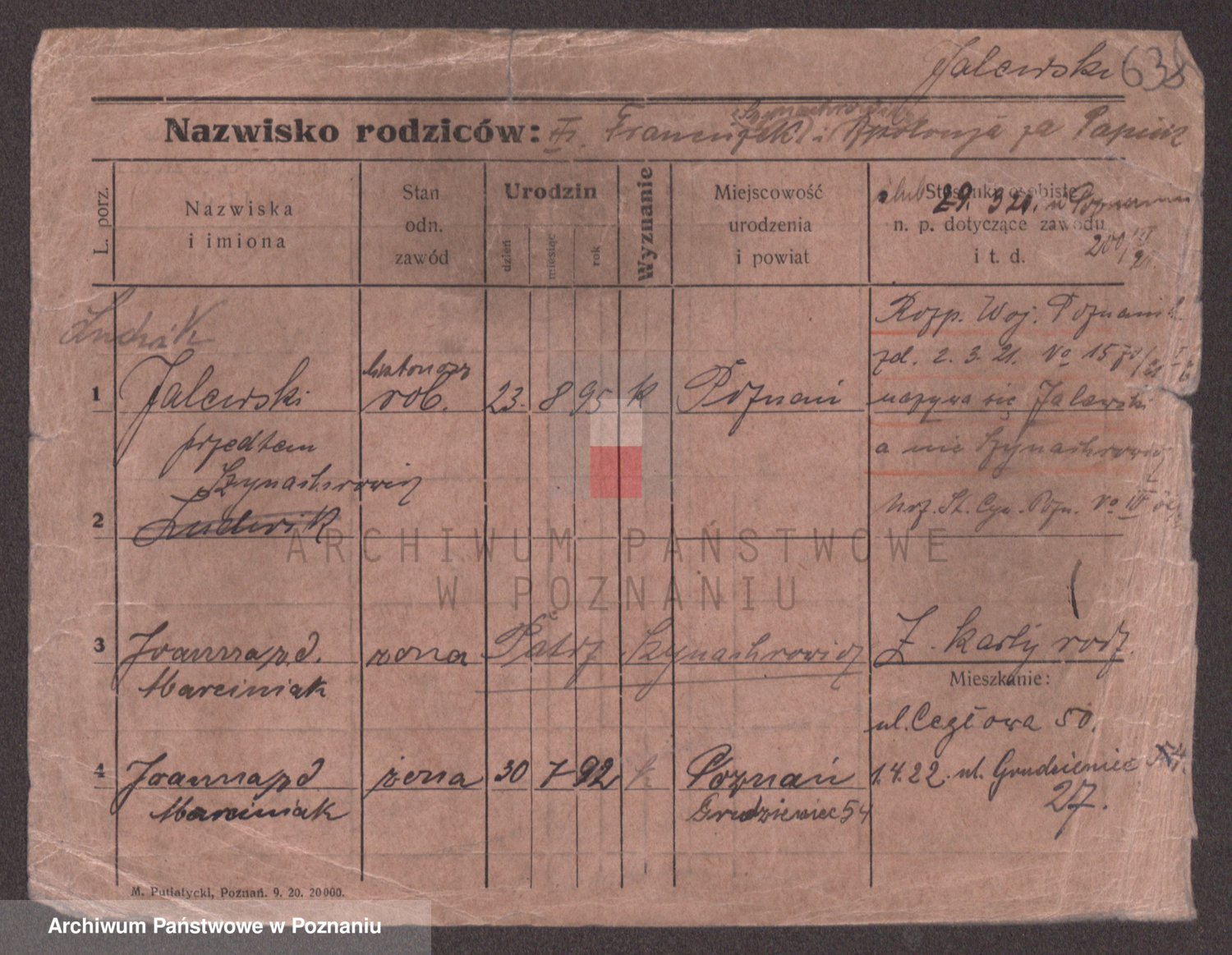 Podgląd karty osobowej dostępny jest po kliknięciu na nazwisko lub ikonkę karty. Można dokonywać powiększenia (ikony na górze) lub przechodzić między kolejnymi skanami (strzałki po bokach).