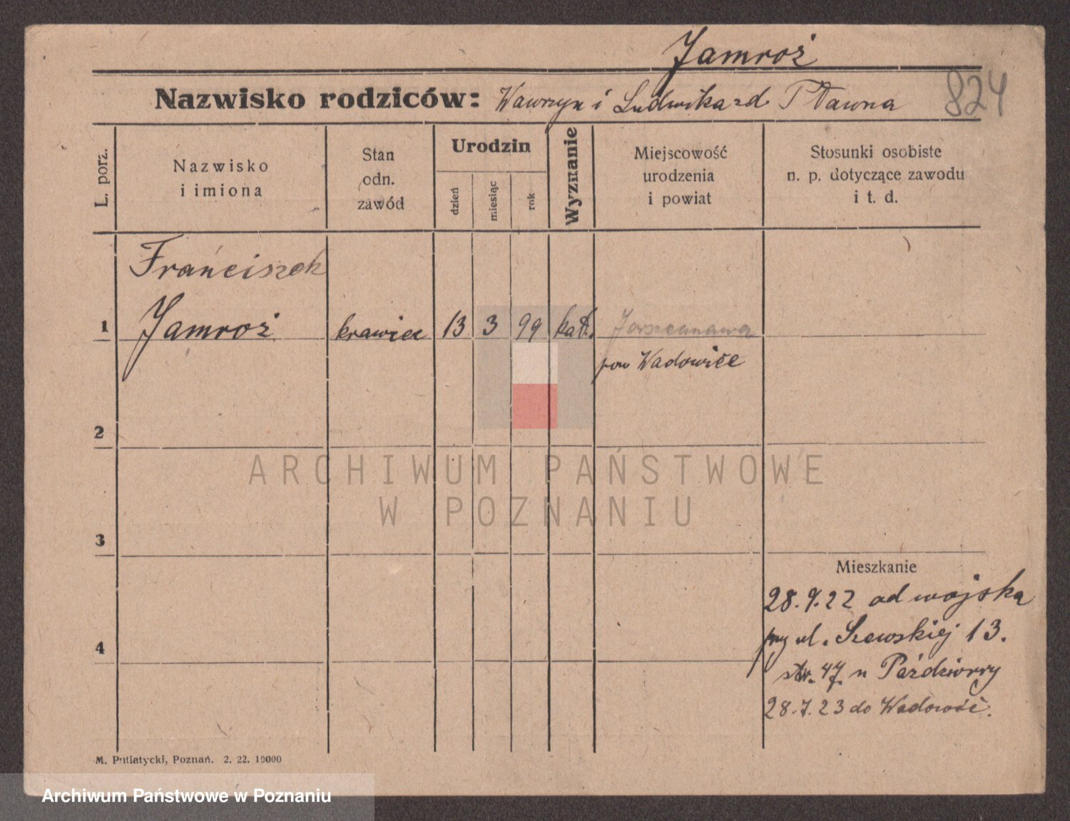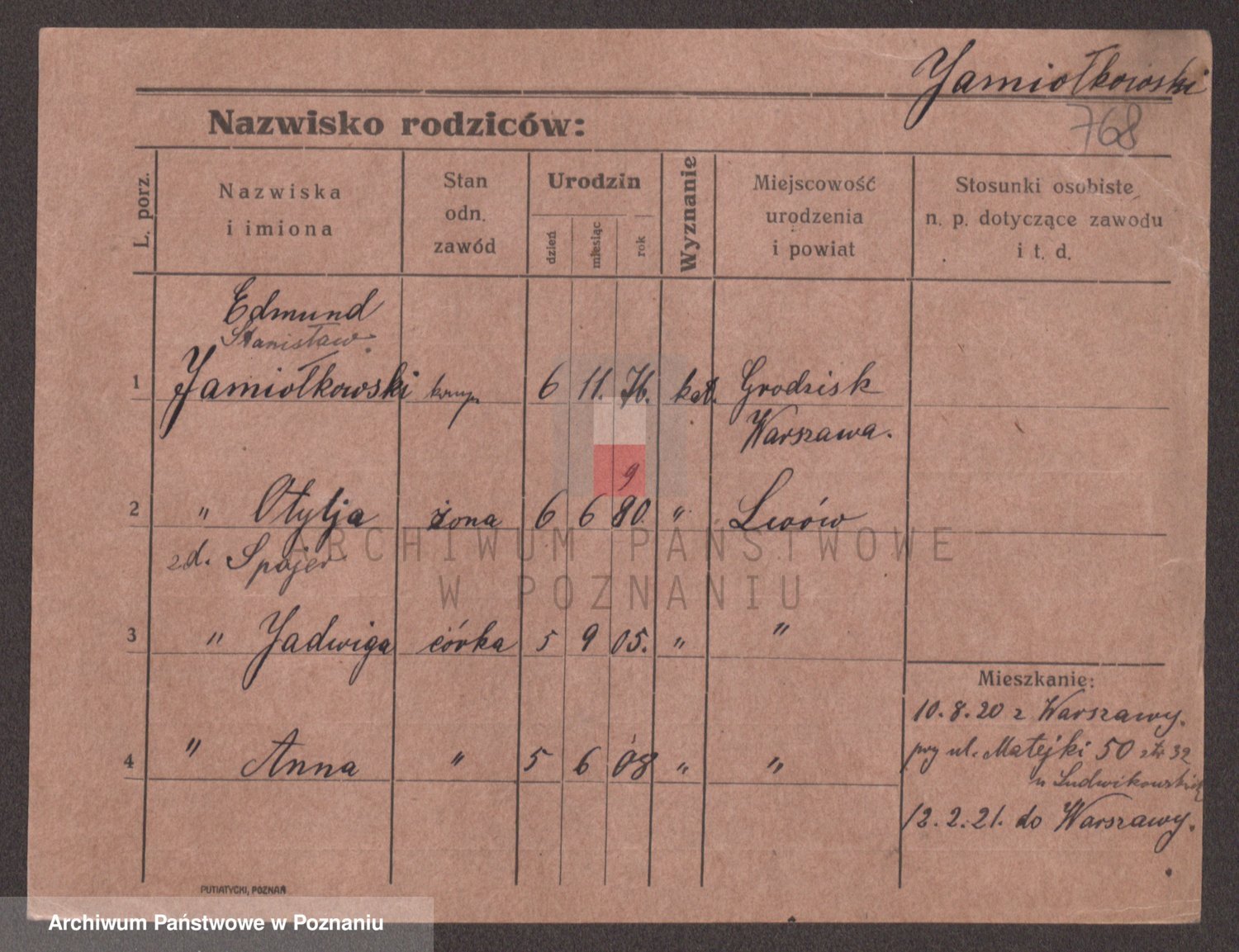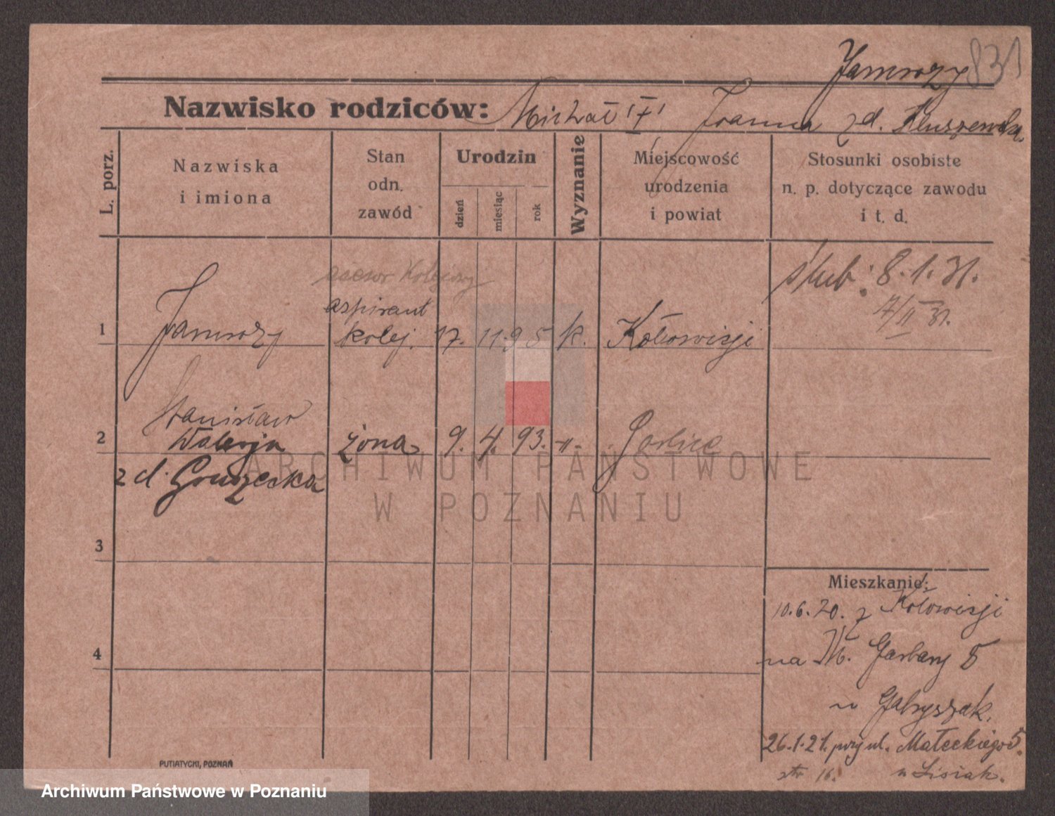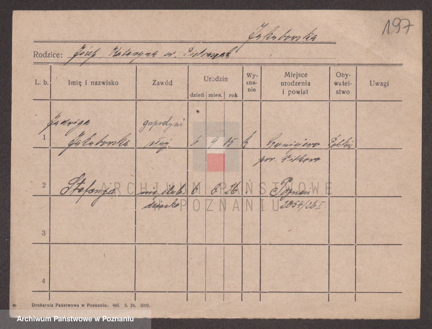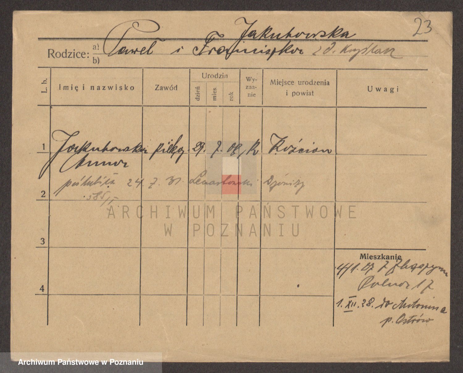 Podgląd karty osobowej dostępny jest po kliknięciu na nazwisko lub ikonkę karty. Można dokonywać powiększenia (ikony na górze) lub przechodzić między kolejnymi skanami (strzałki po bokach).