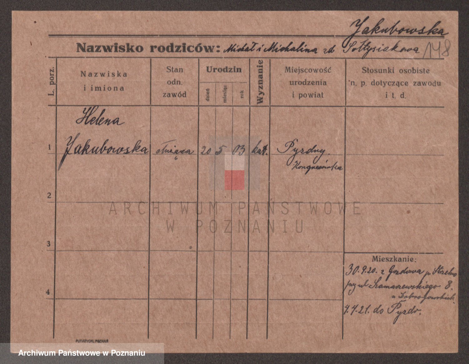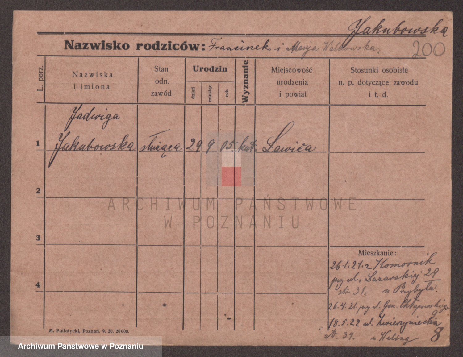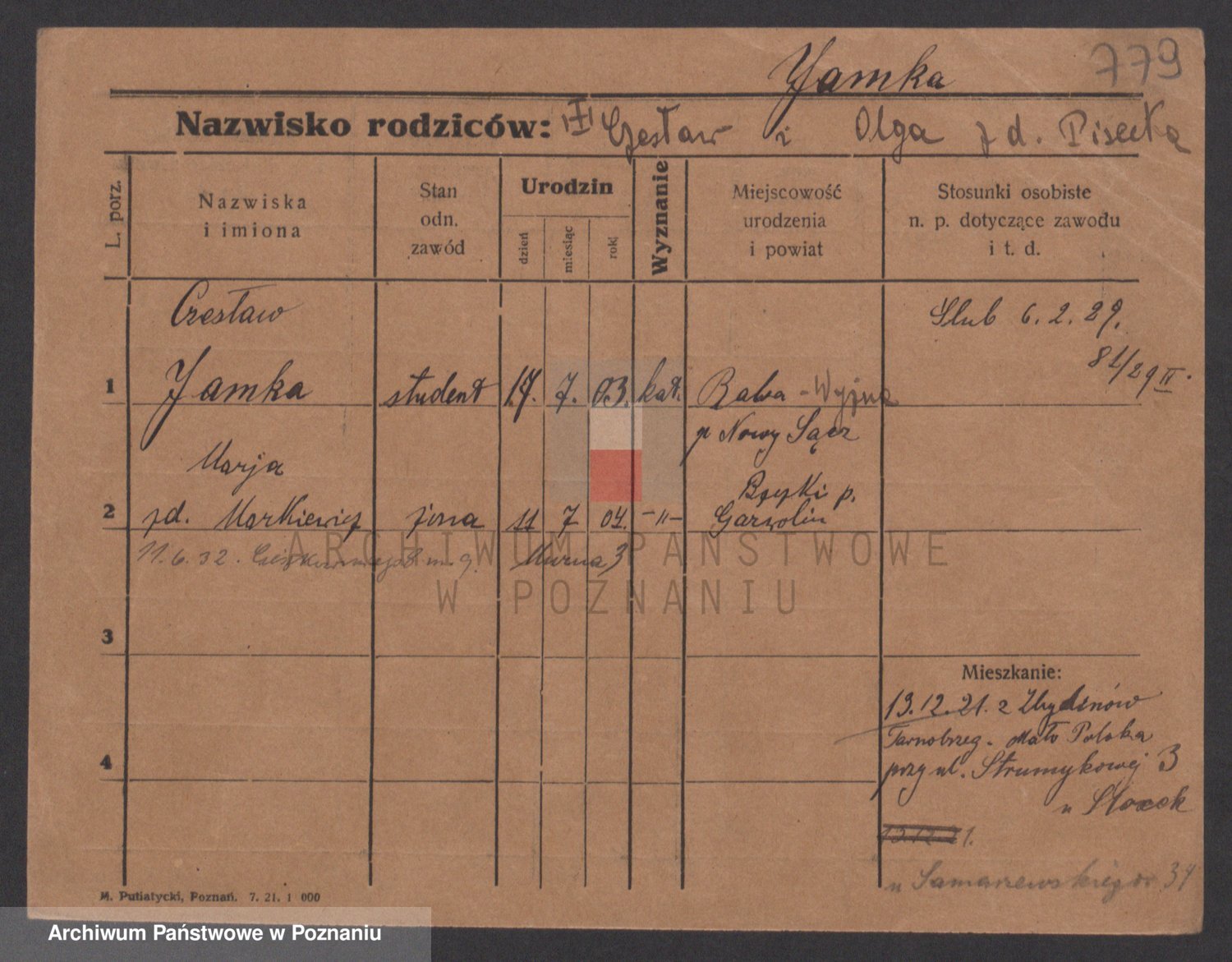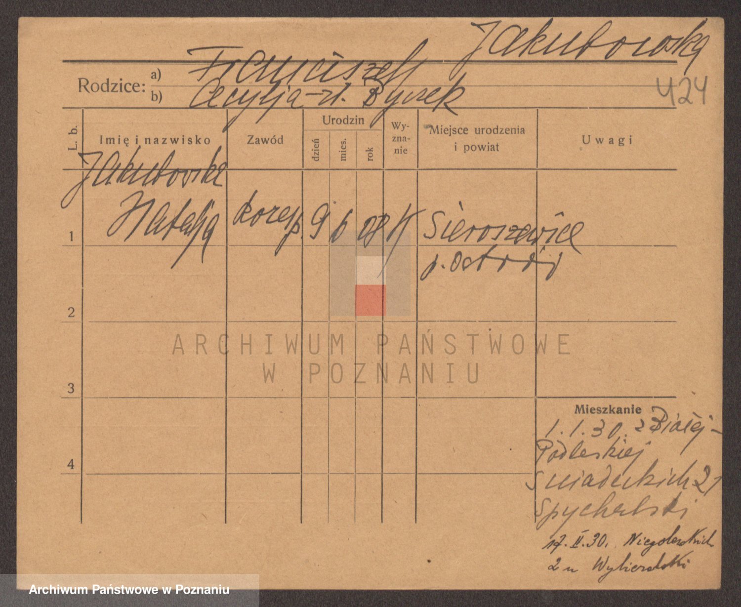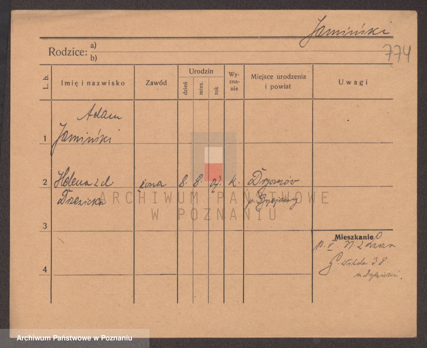 Podgląd karty osobowej dostępny jest po kliknięciu na nazwisko lub ikonkę karty. Można dokonywać powiększenia (ikony na górze) lub przechodzić między kolejnymi skanami (strzałki po bokach).