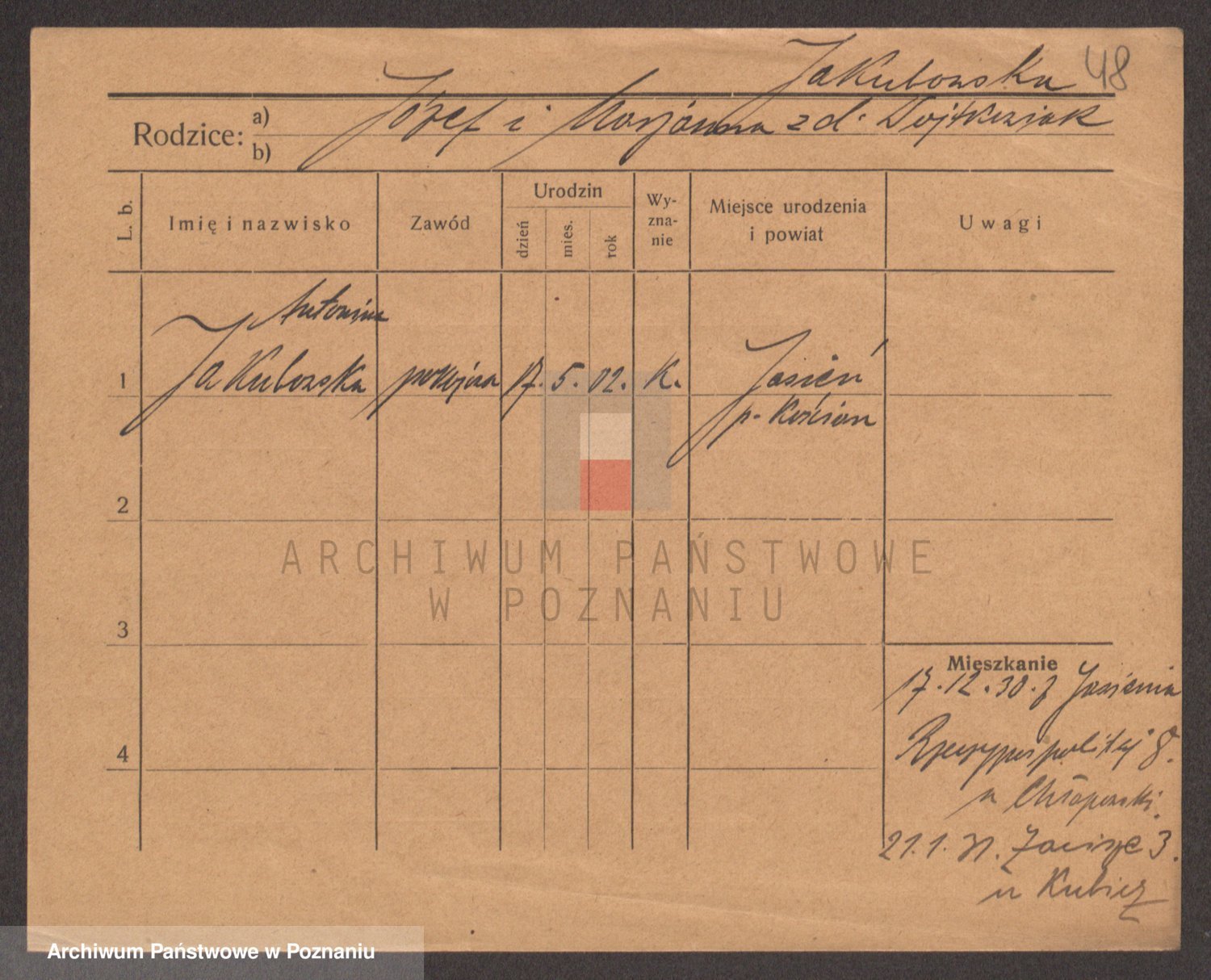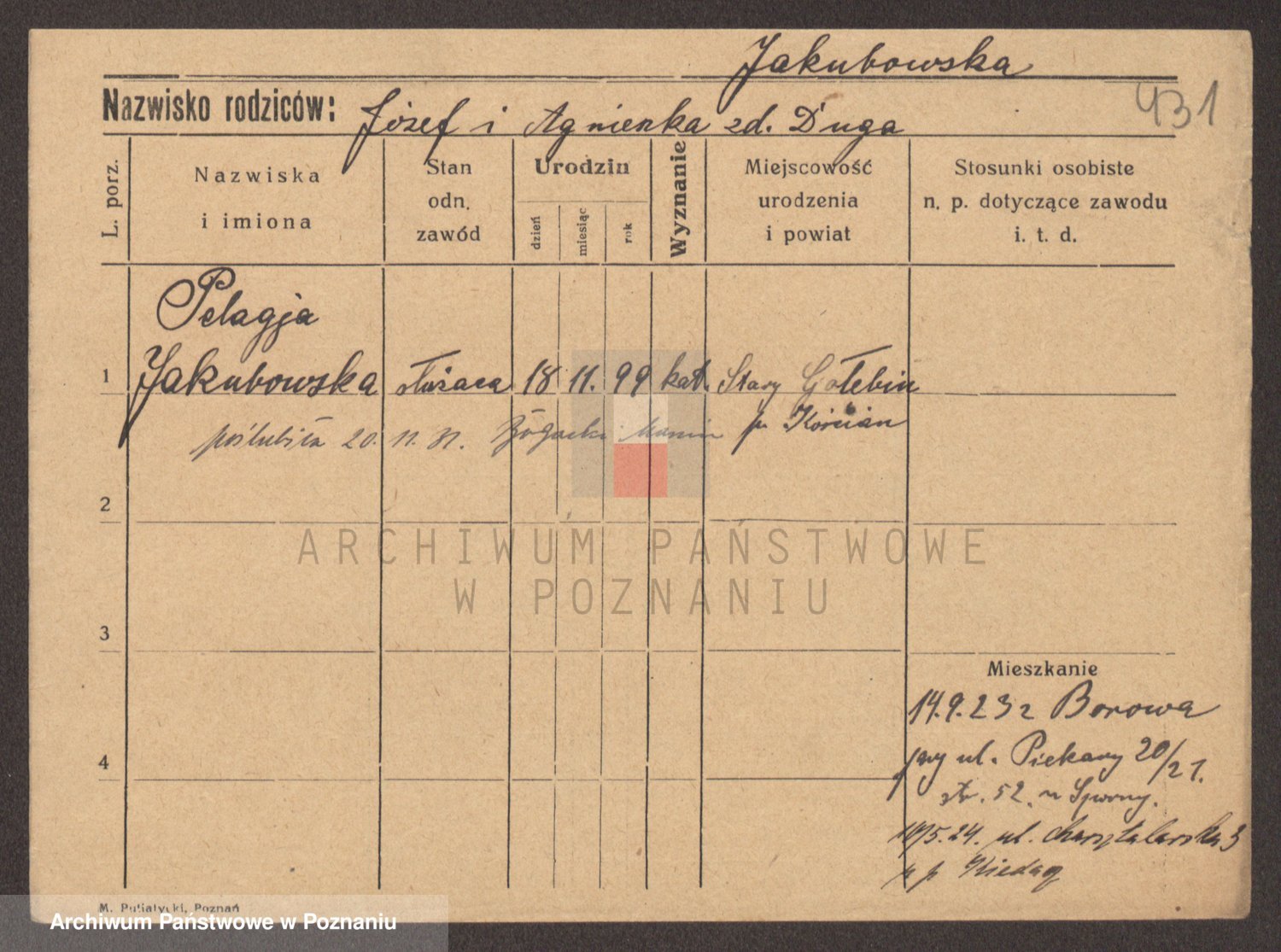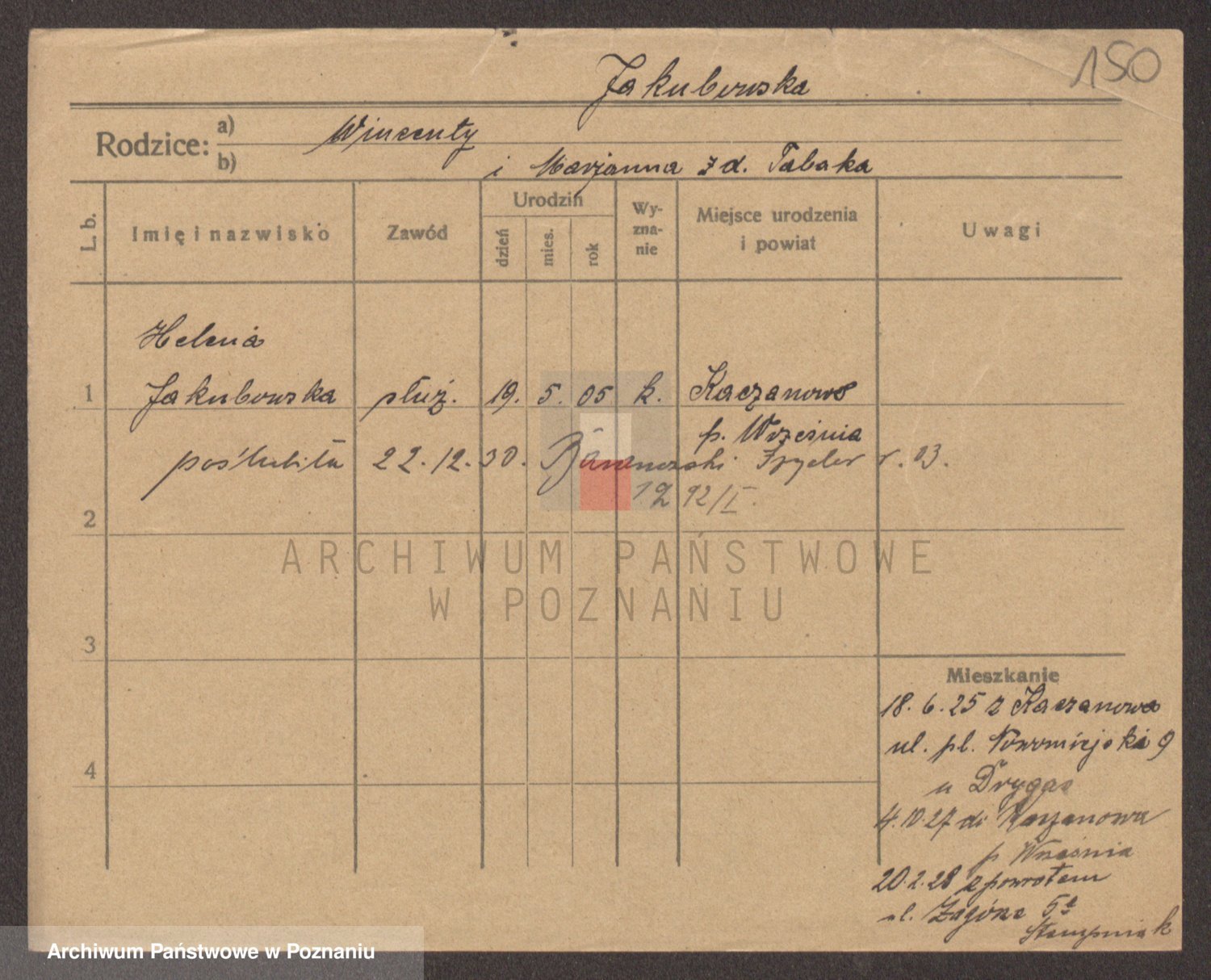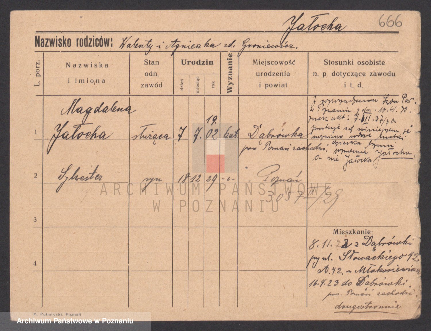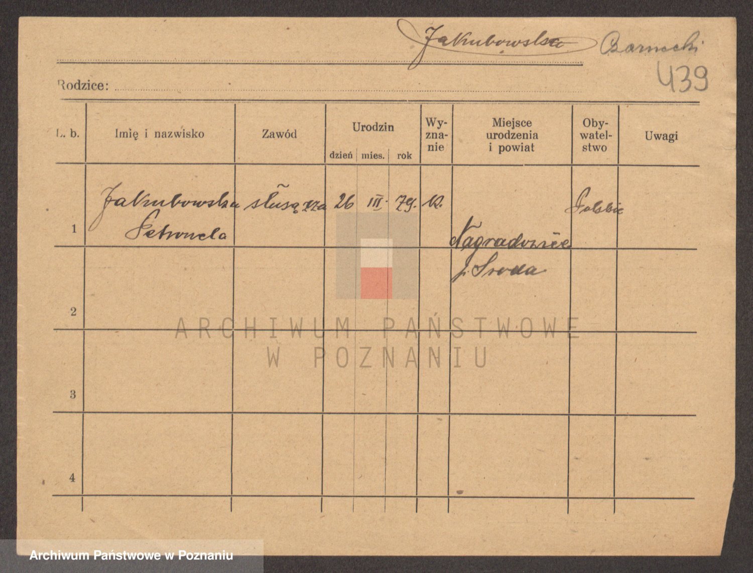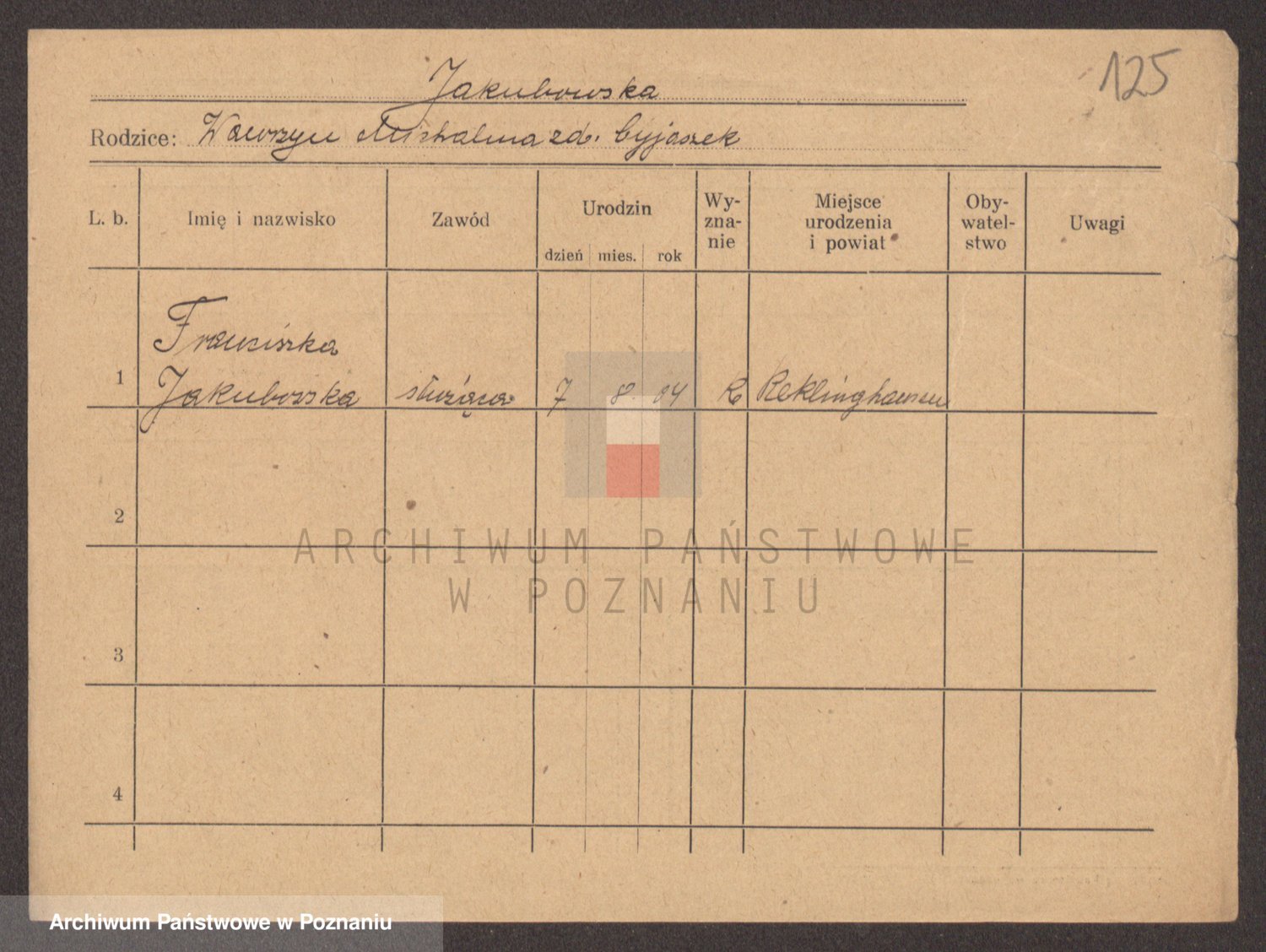 Podgląd karty osobowej dostępny jest po kliknięciu na nazwisko lub ikonkę karty. Można dokonywać powiększenia (ikony na górze) lub przechodzić między kolejnymi skanami (strzałki po bokach).