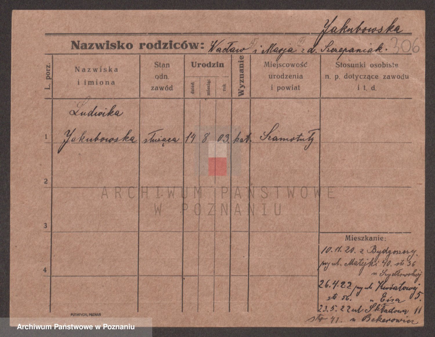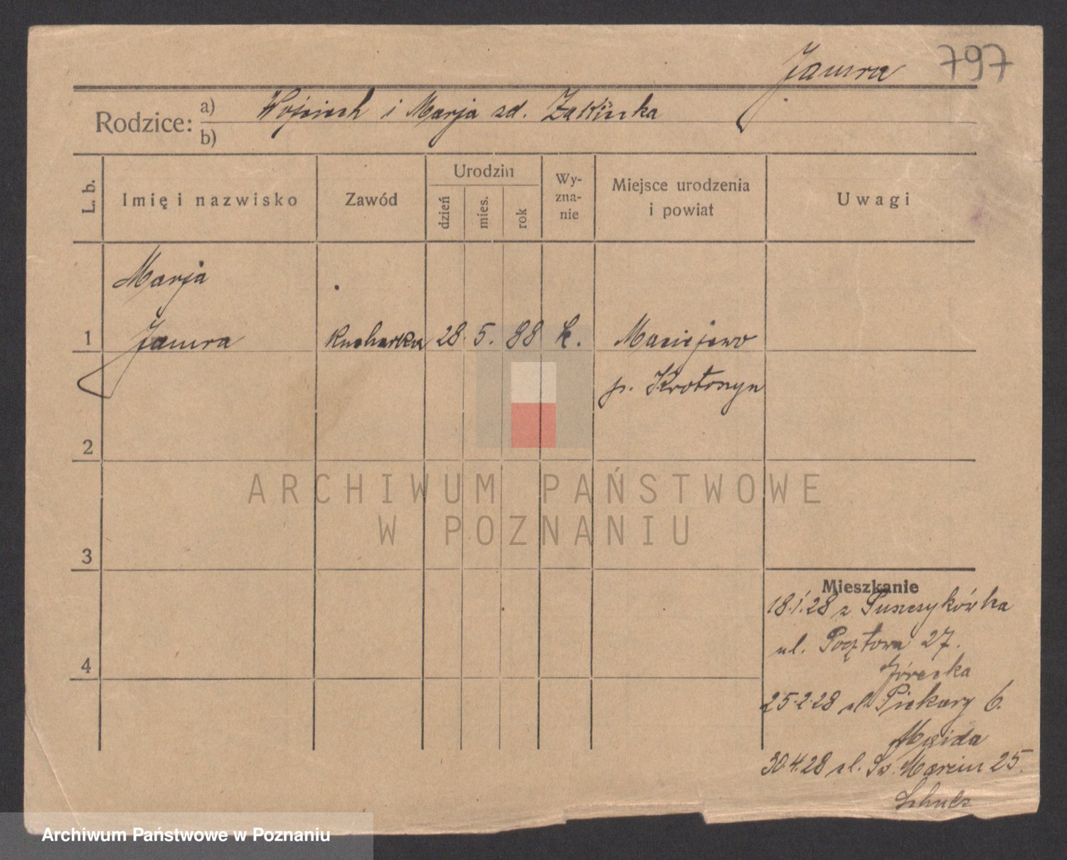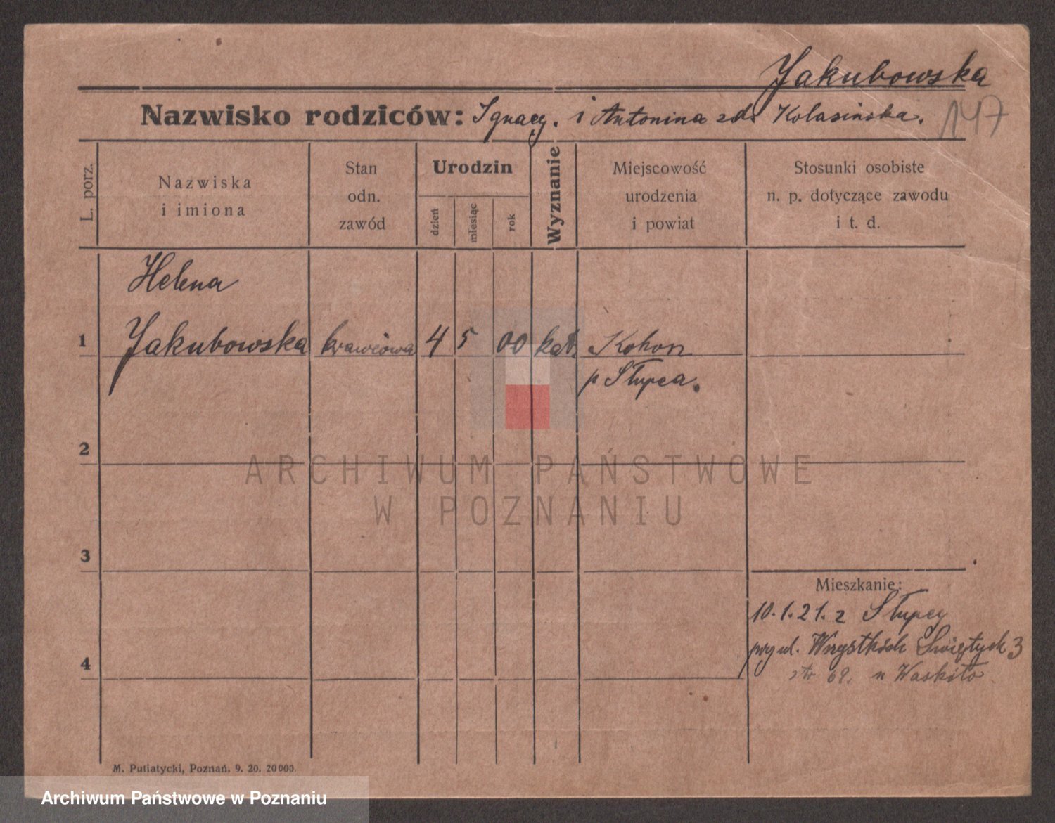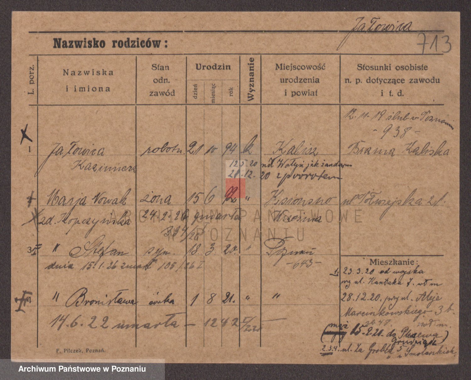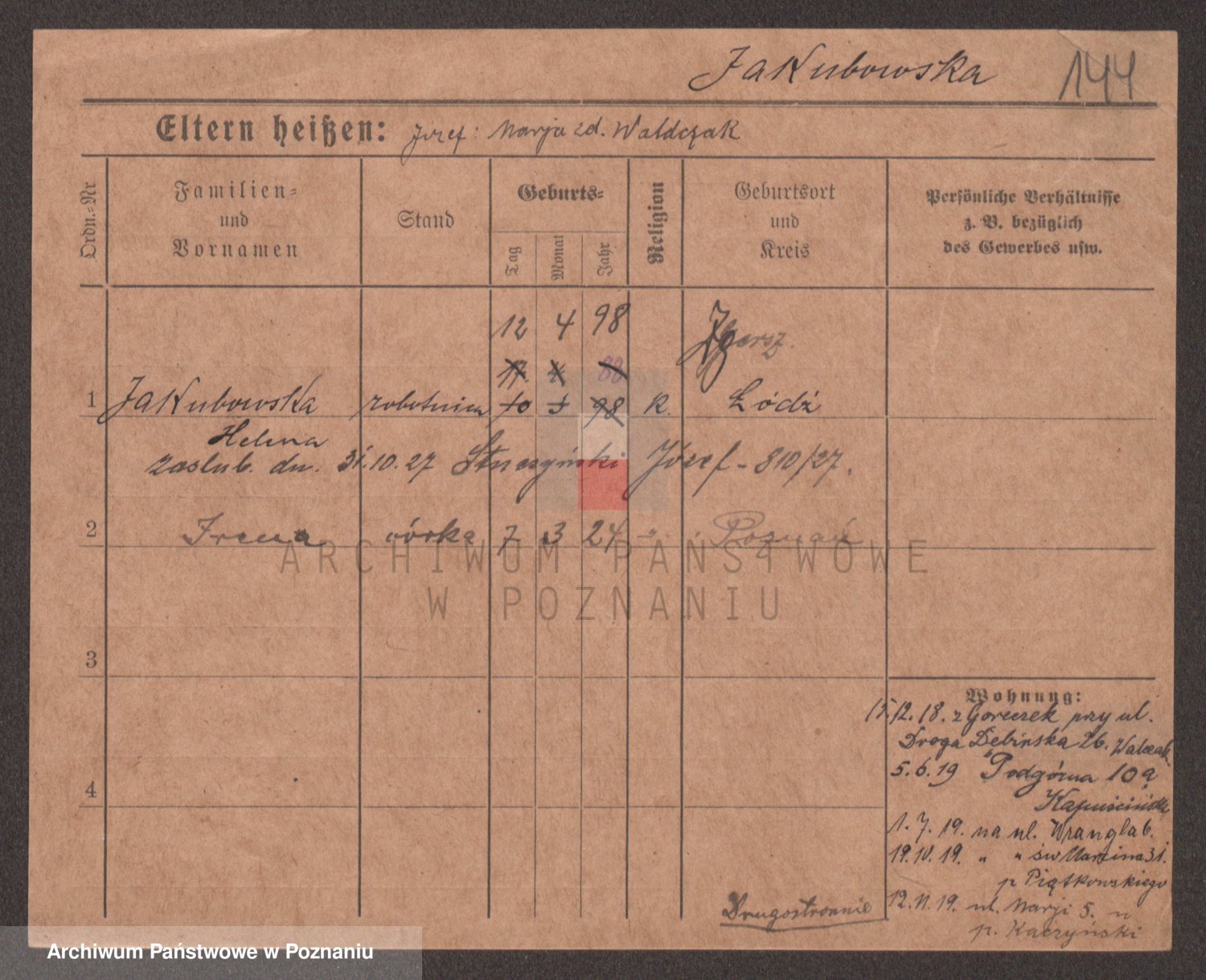 Podgląd karty osobowej dostępny jest po kliknięciu na nazwisko lub ikonkę karty. Można dokonywać powiększenia (ikony na górze) lub przechodzić między kolejnymi skanami (strzałki po bokach).