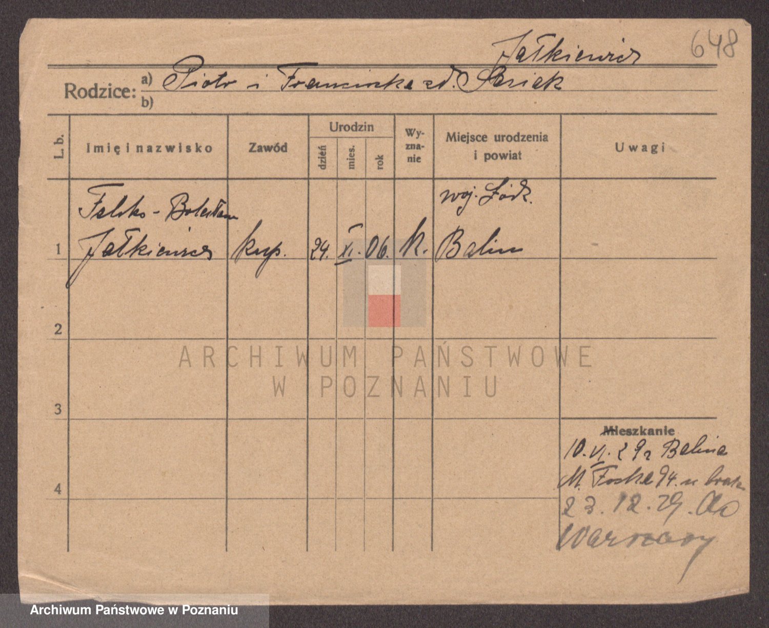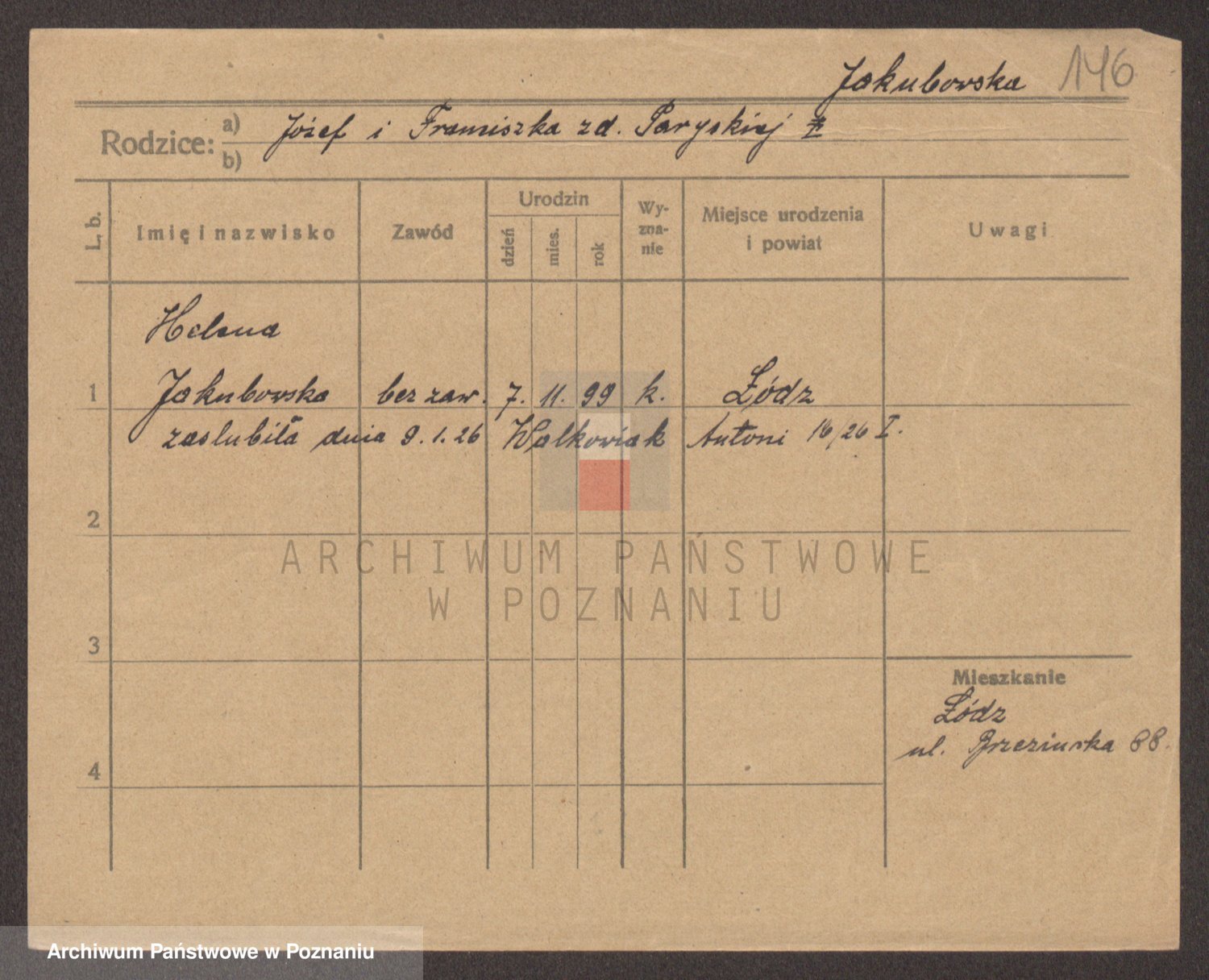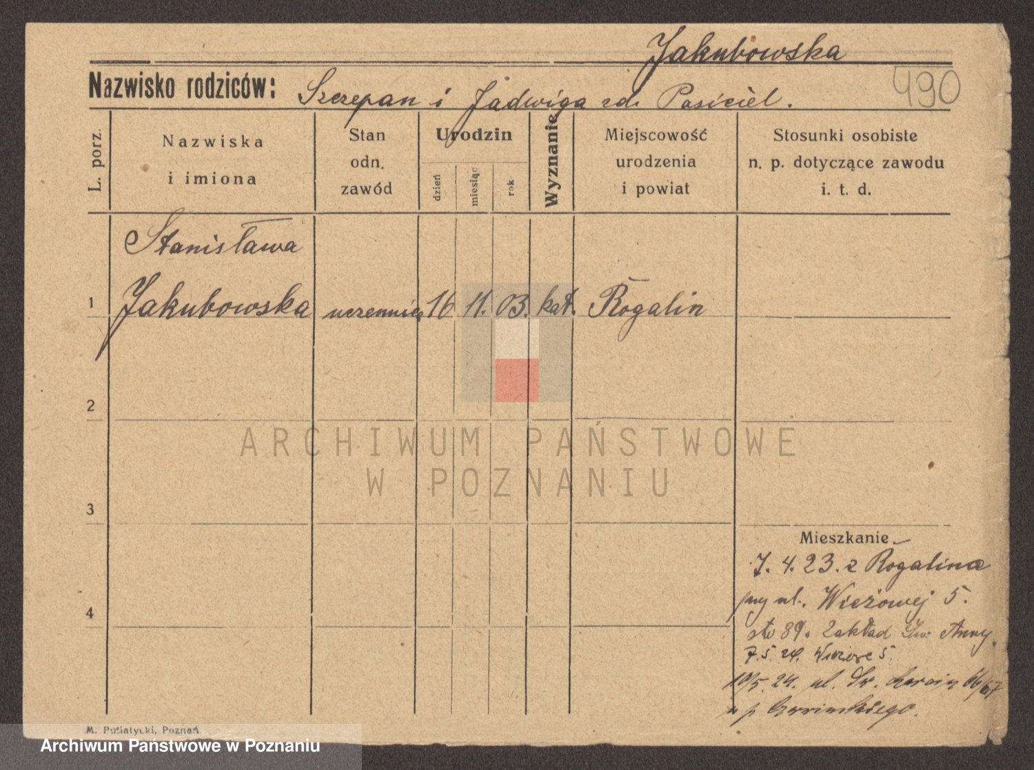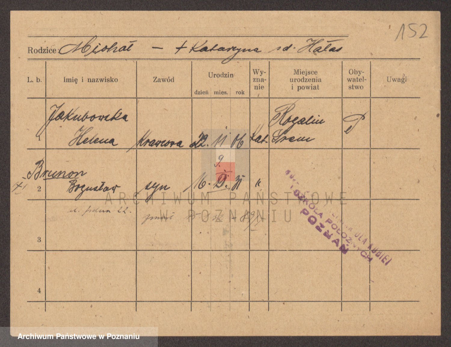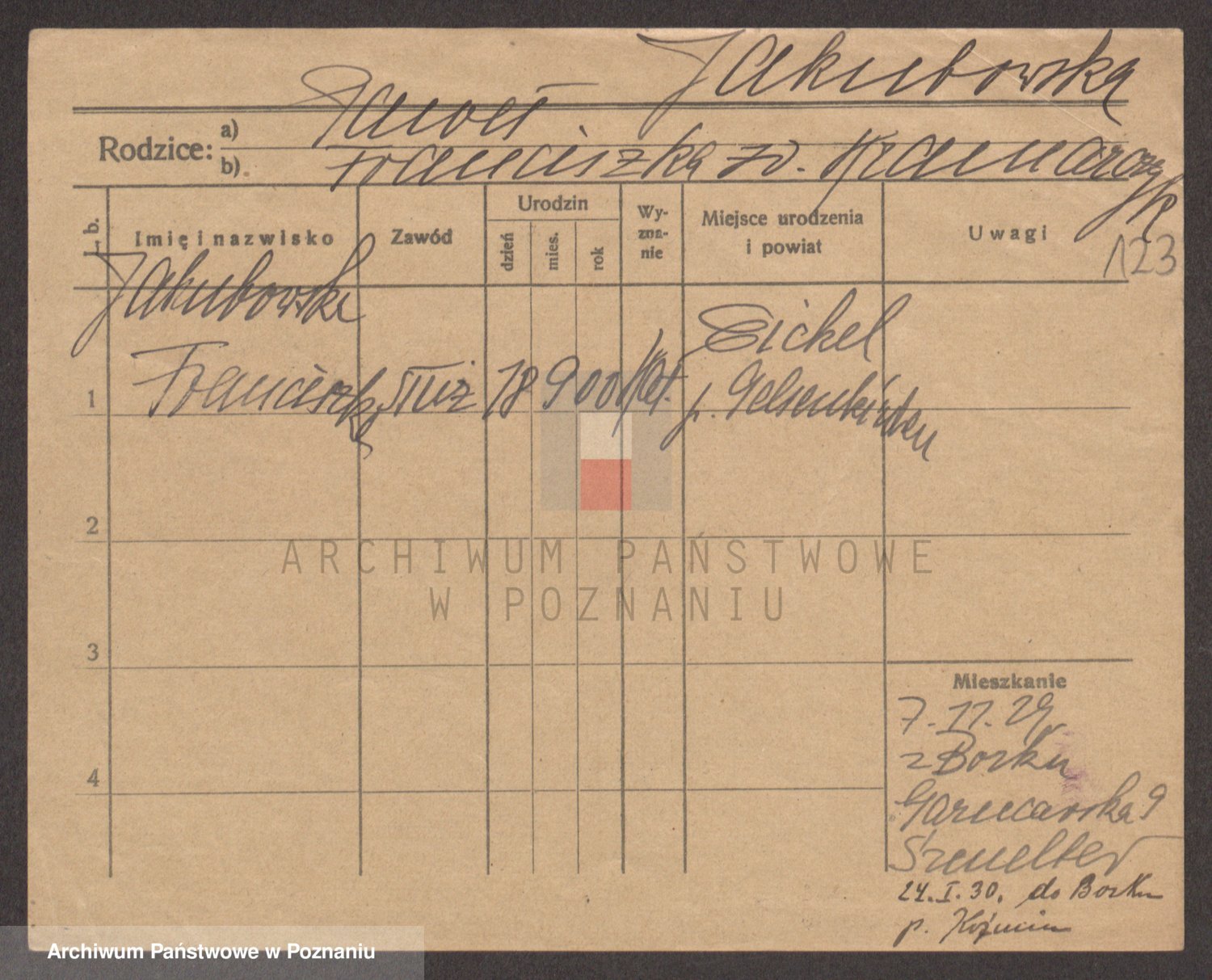 Podgląd karty osobowej dostępny jest po kliknięciu na nazwisko lub ikonkę karty. Można dokonywać powiększenia (ikony na górze) lub przechodzić między kolejnymi skanami (strzałki po bokach).