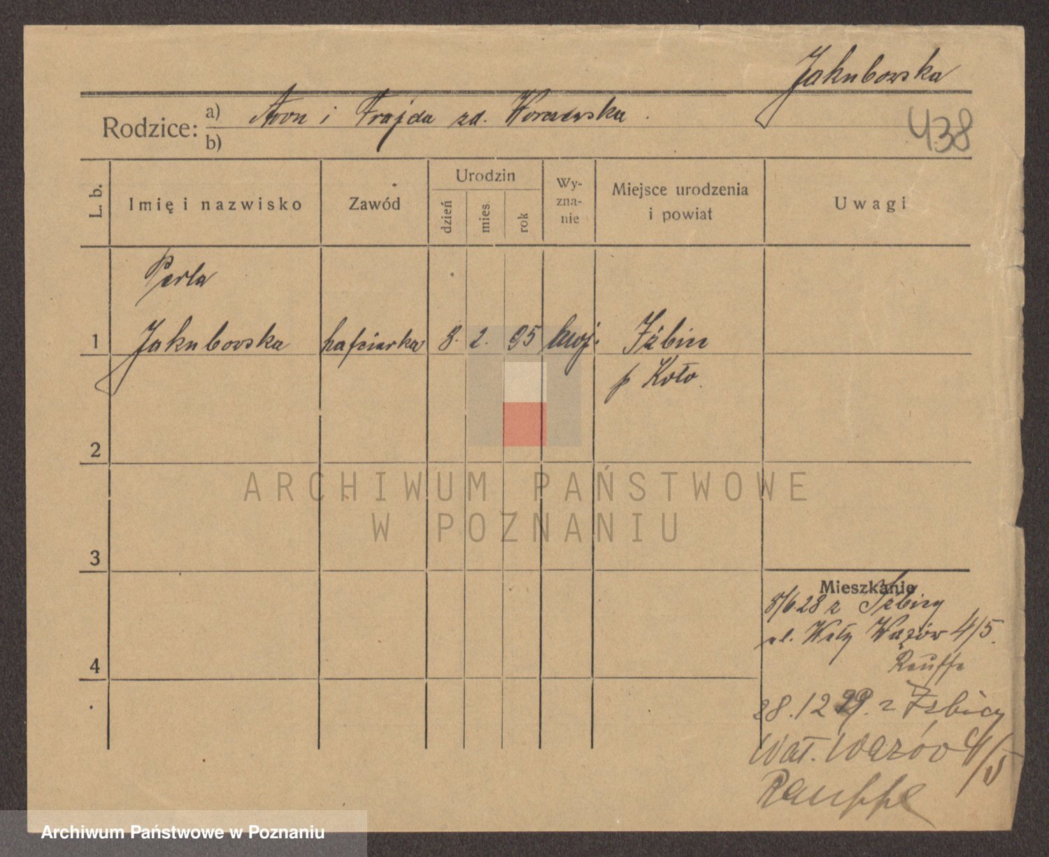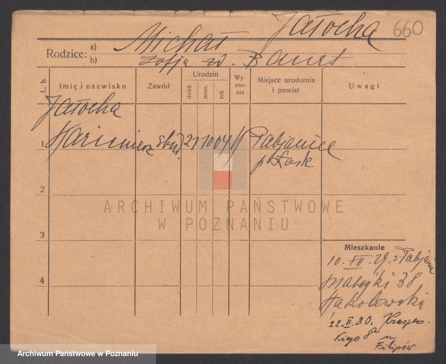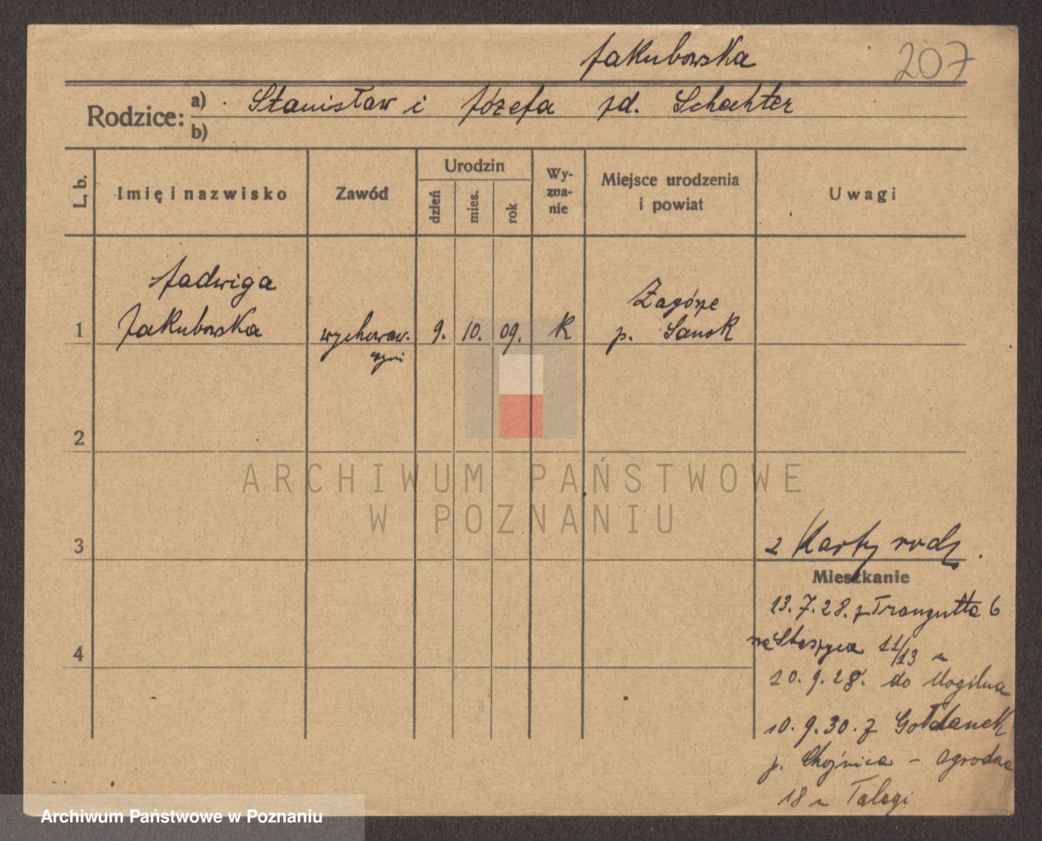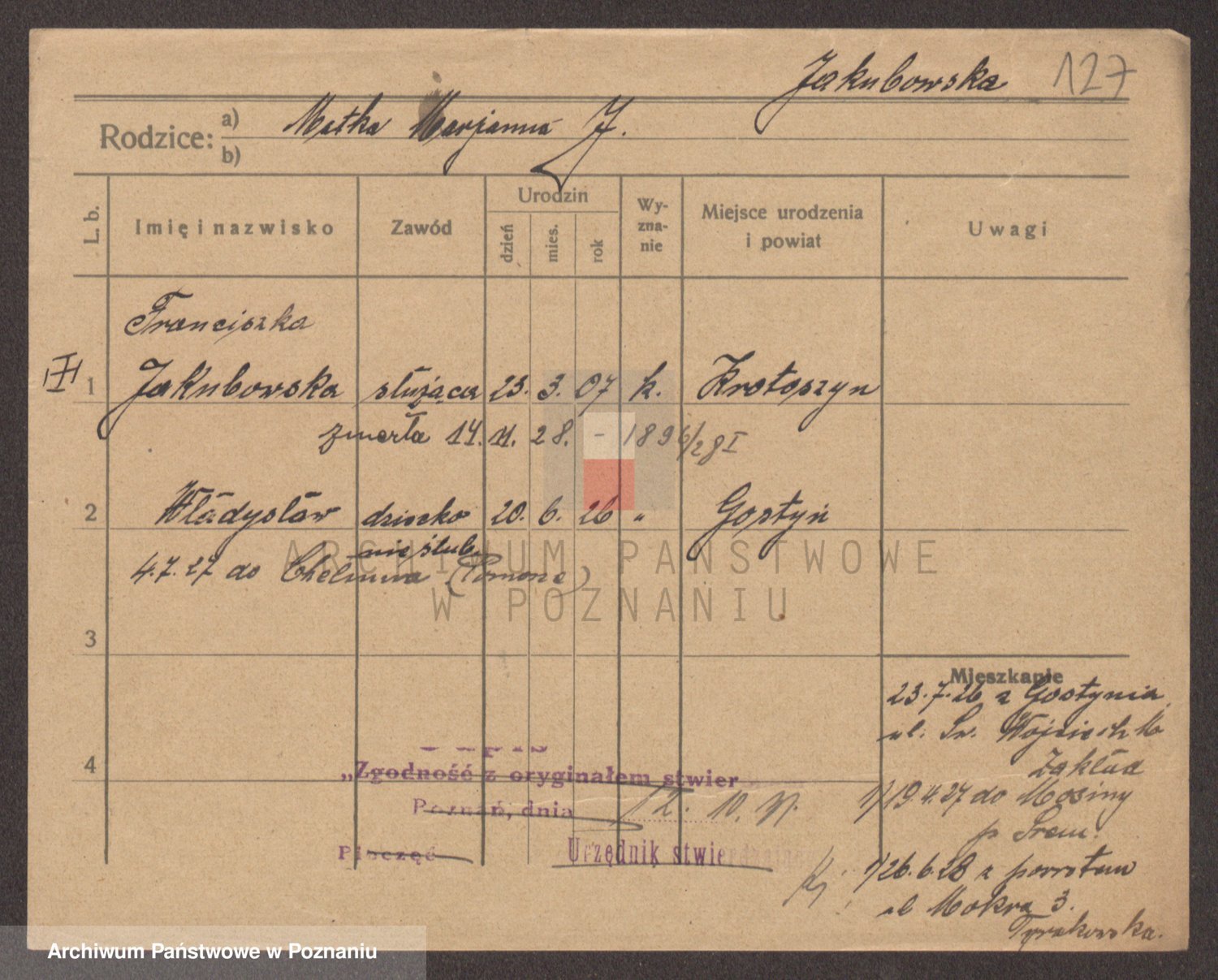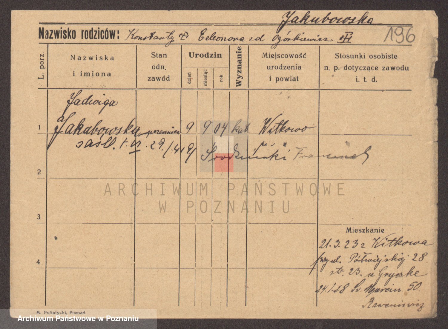 Podgląd karty osobowej dostępny jest po kliknięciu na nazwisko lub ikonkę karty. Można dokonywać powiększenia (ikony na górze) lub przechodzić między kolejnymi skanami (strzałki po bokach).