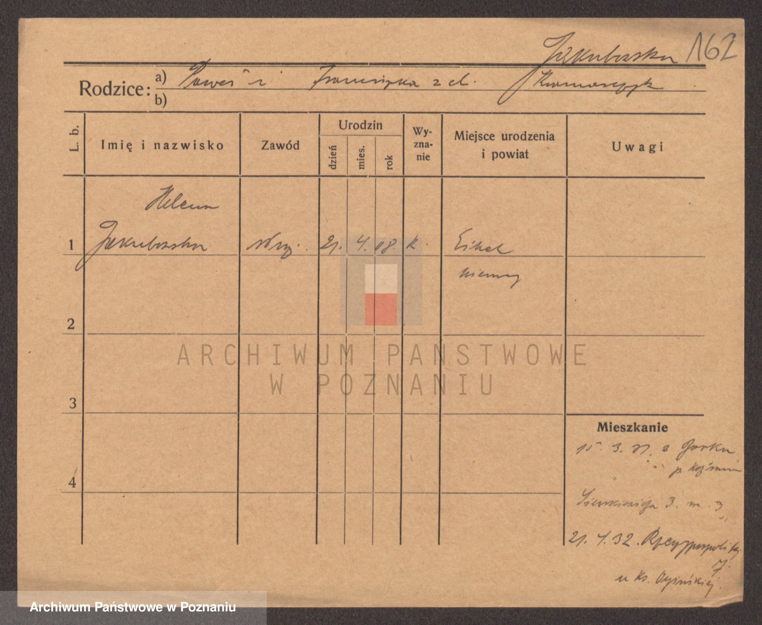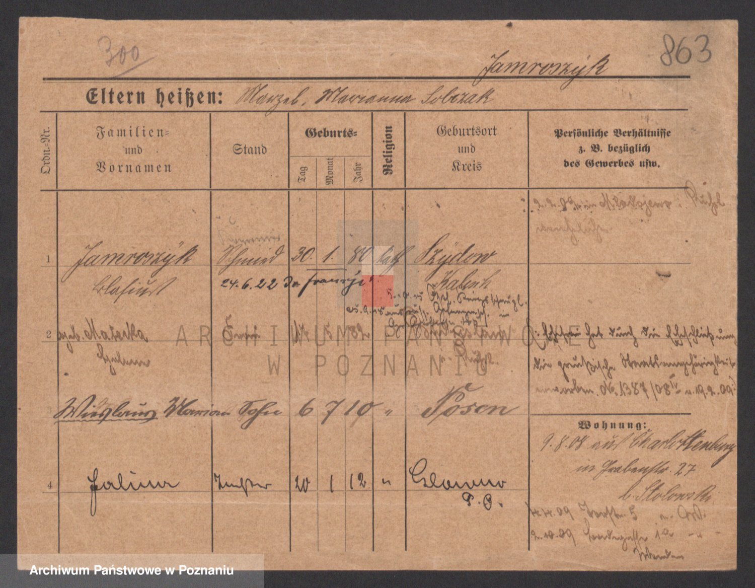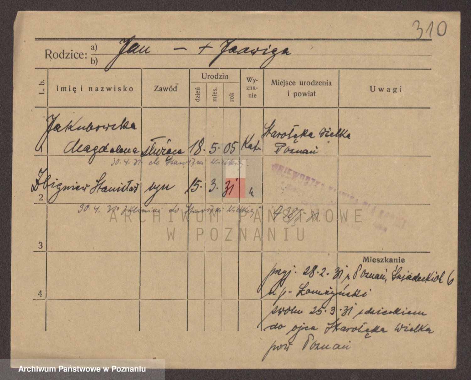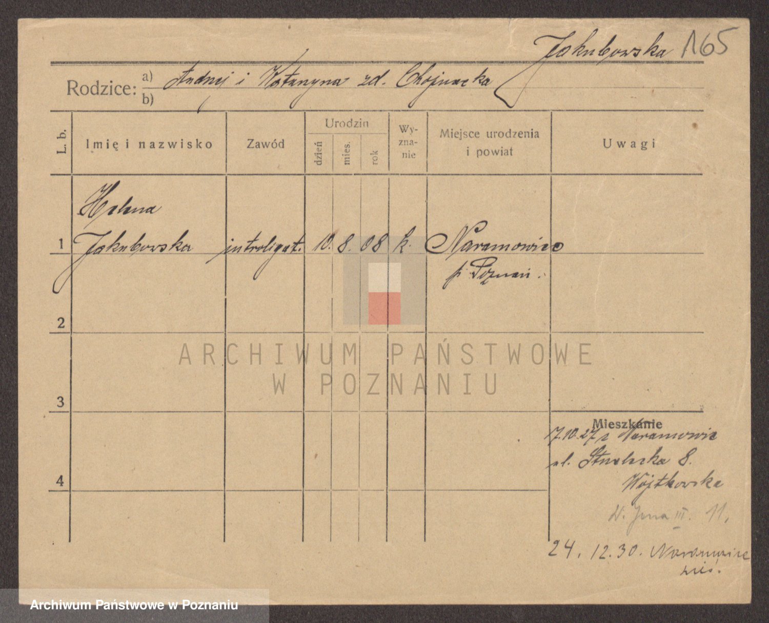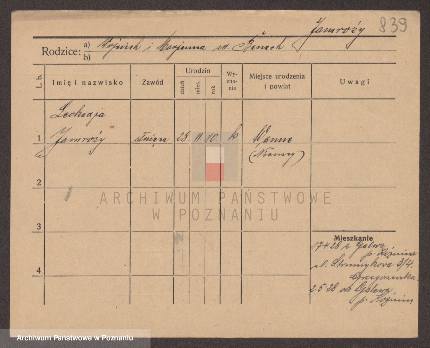 Podgląd karty osobowej dostępny jest po kliknięciu na nazwisko lub ikonkę karty. Można dokonywać powiększenia (ikony na górze) lub przechodzić między kolejnymi skanami (strzałki po bokach).