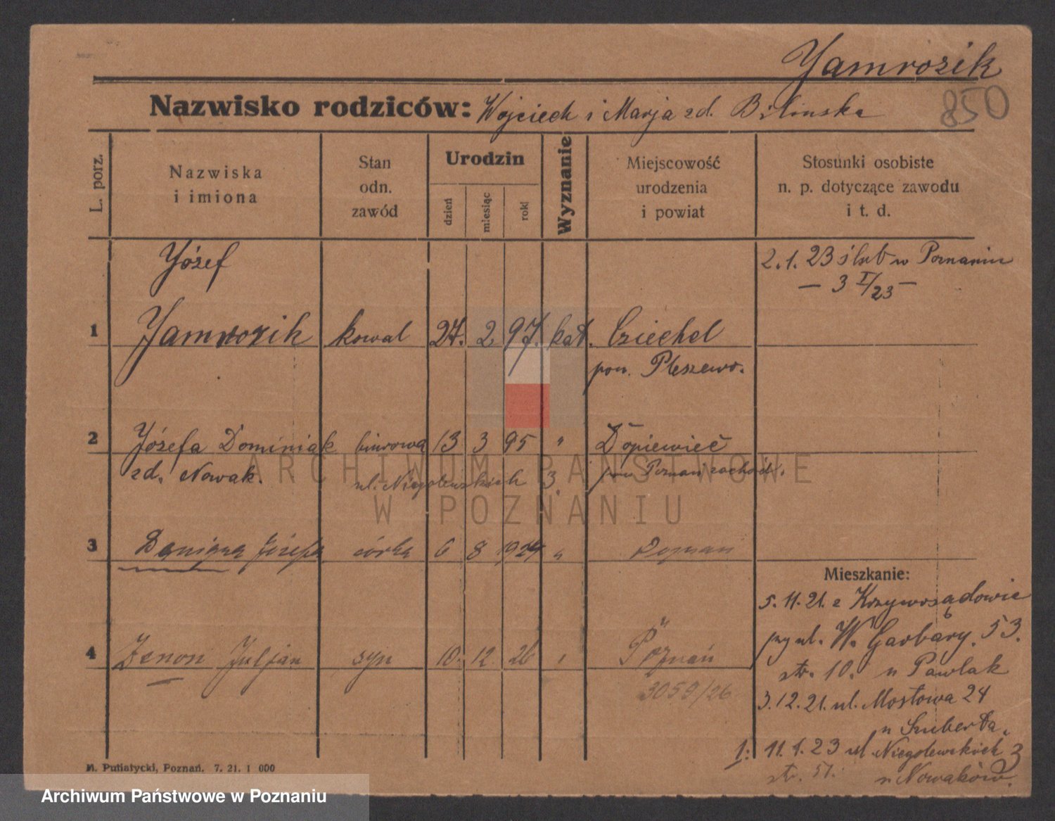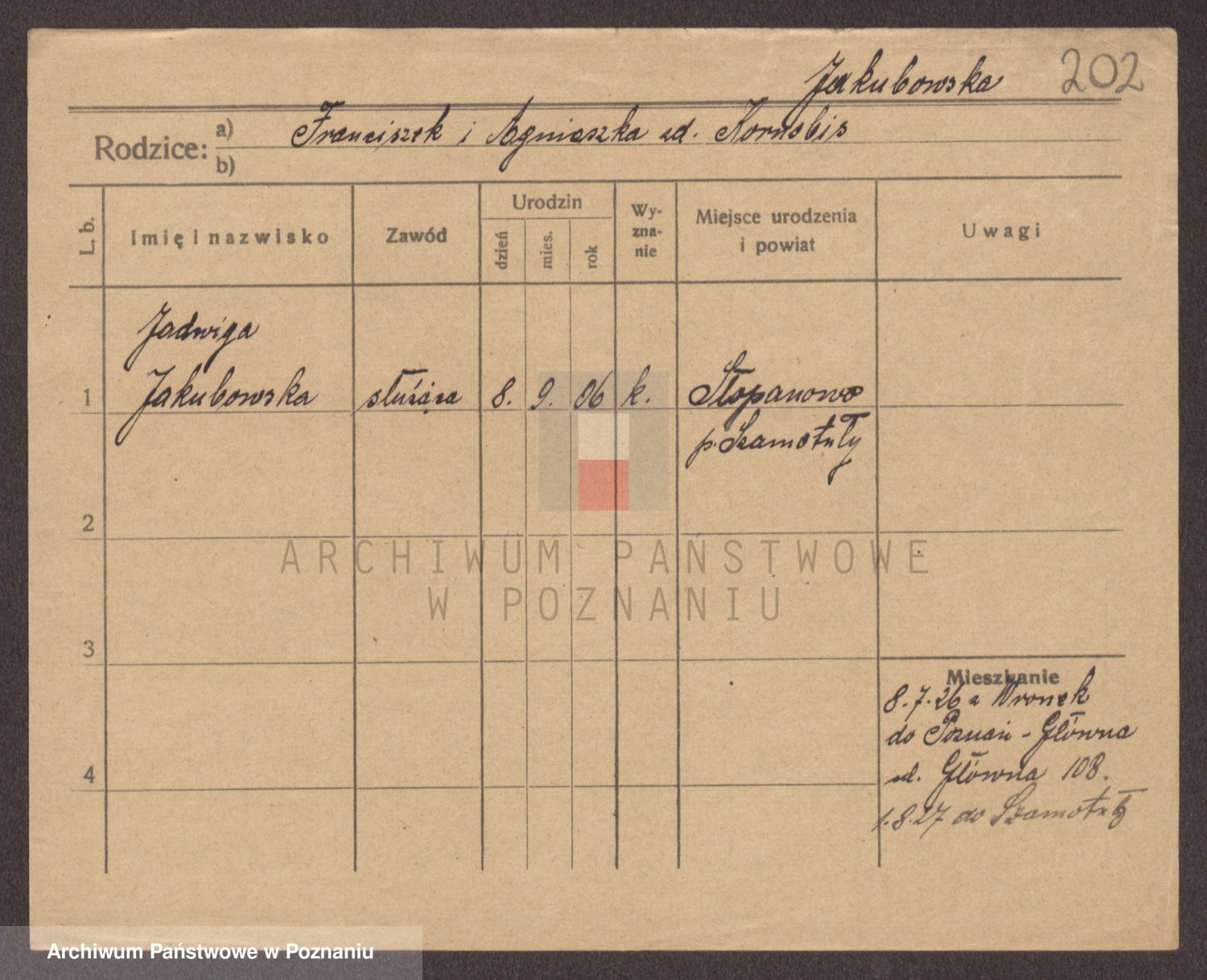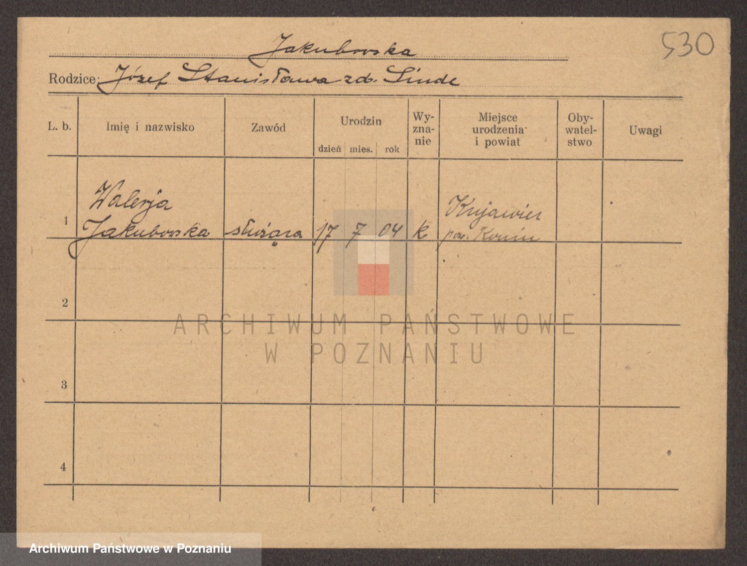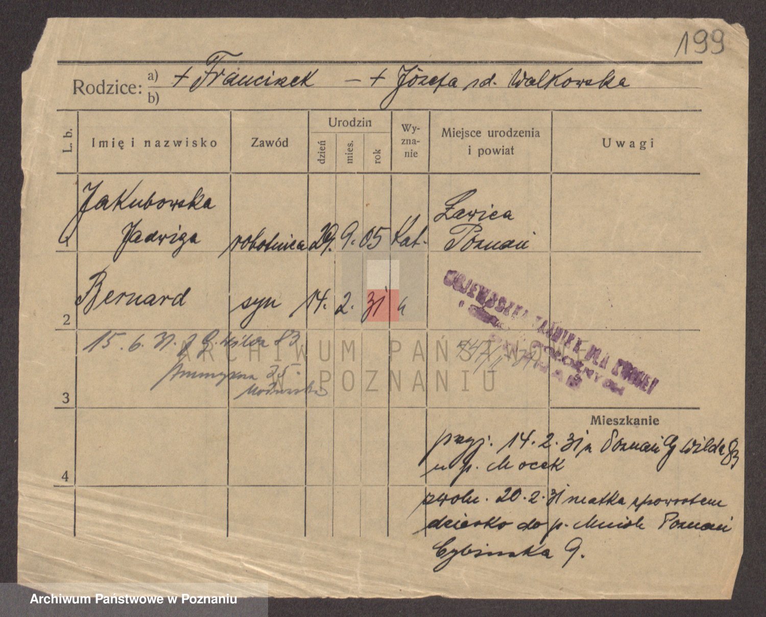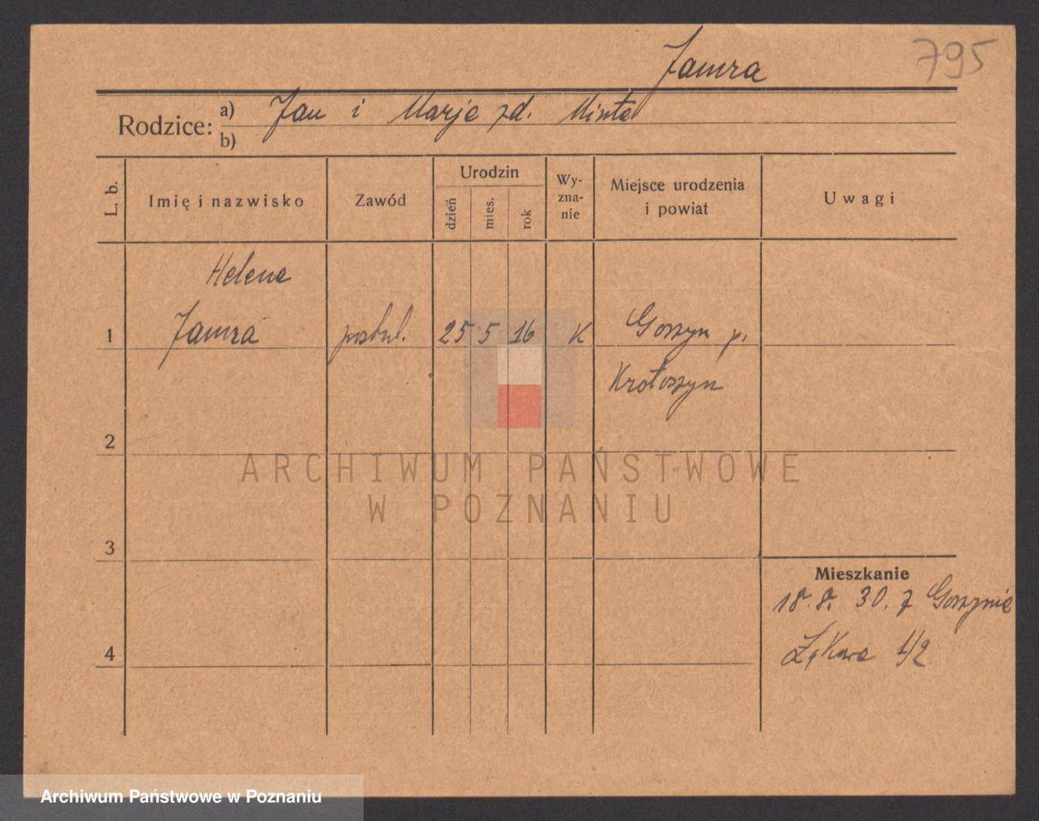 Podgląd karty osobowej dostępny jest po kliknięciu na nazwisko lub ikonkę karty. Można dokonywać powiększenia (ikony na górze) lub przechodzić między kolejnymi skanami (strzałki po bokach).