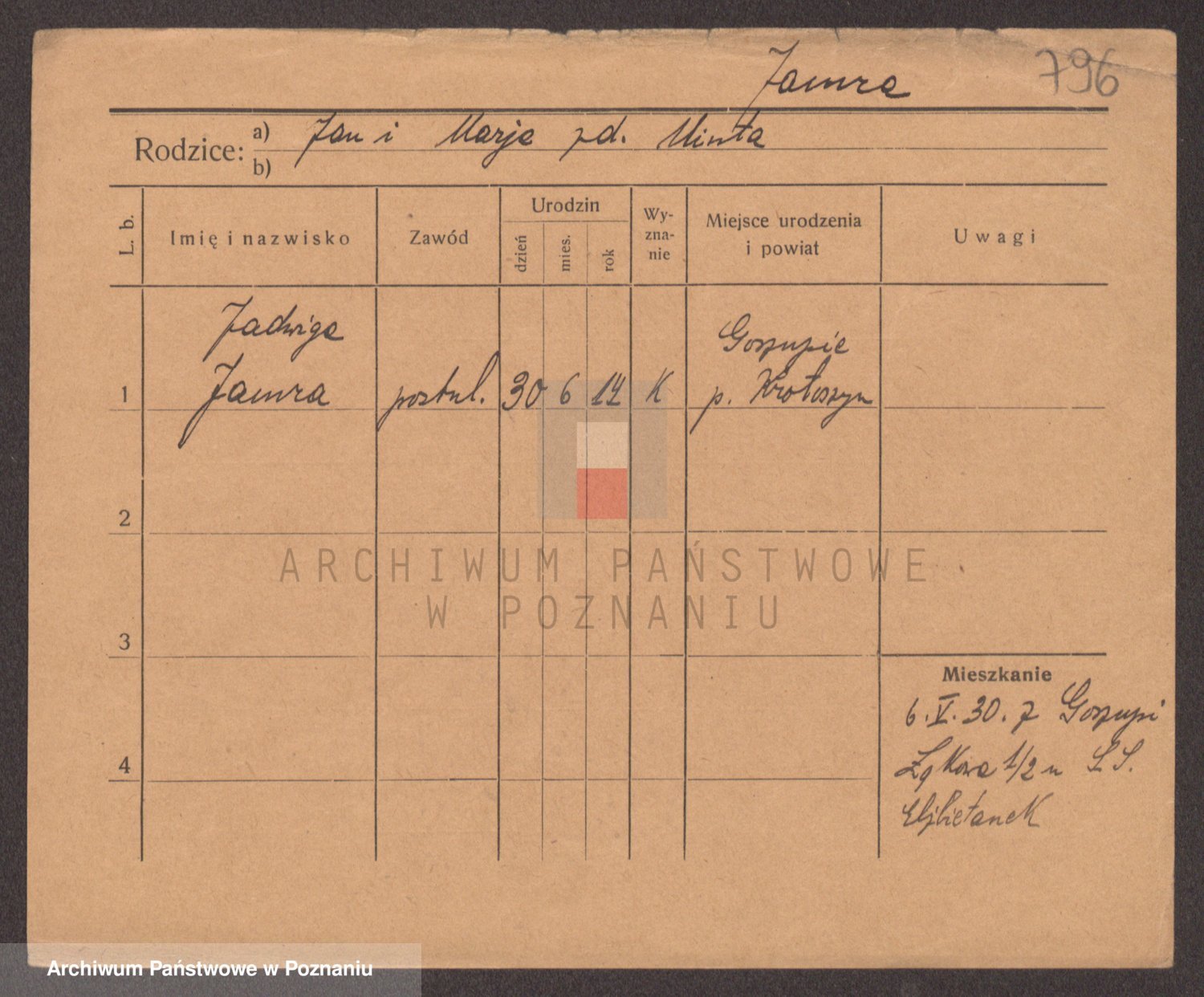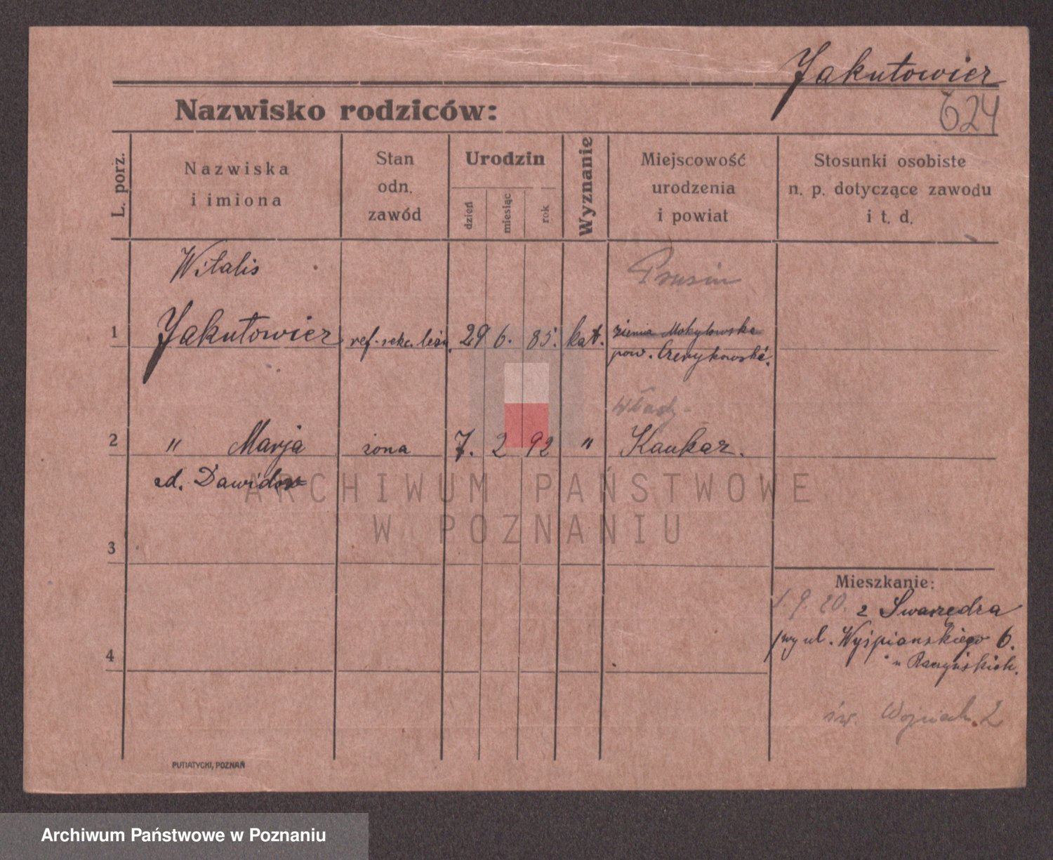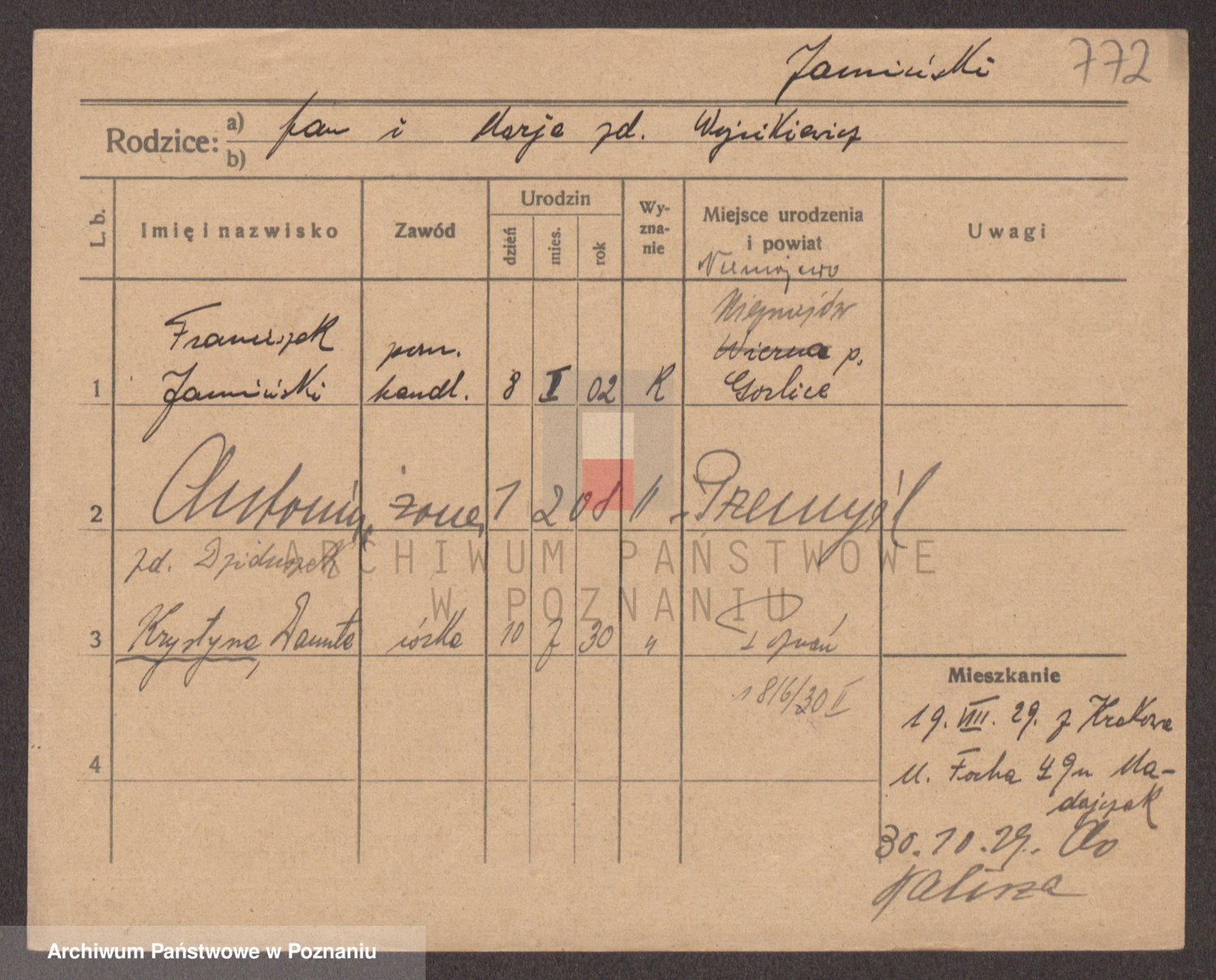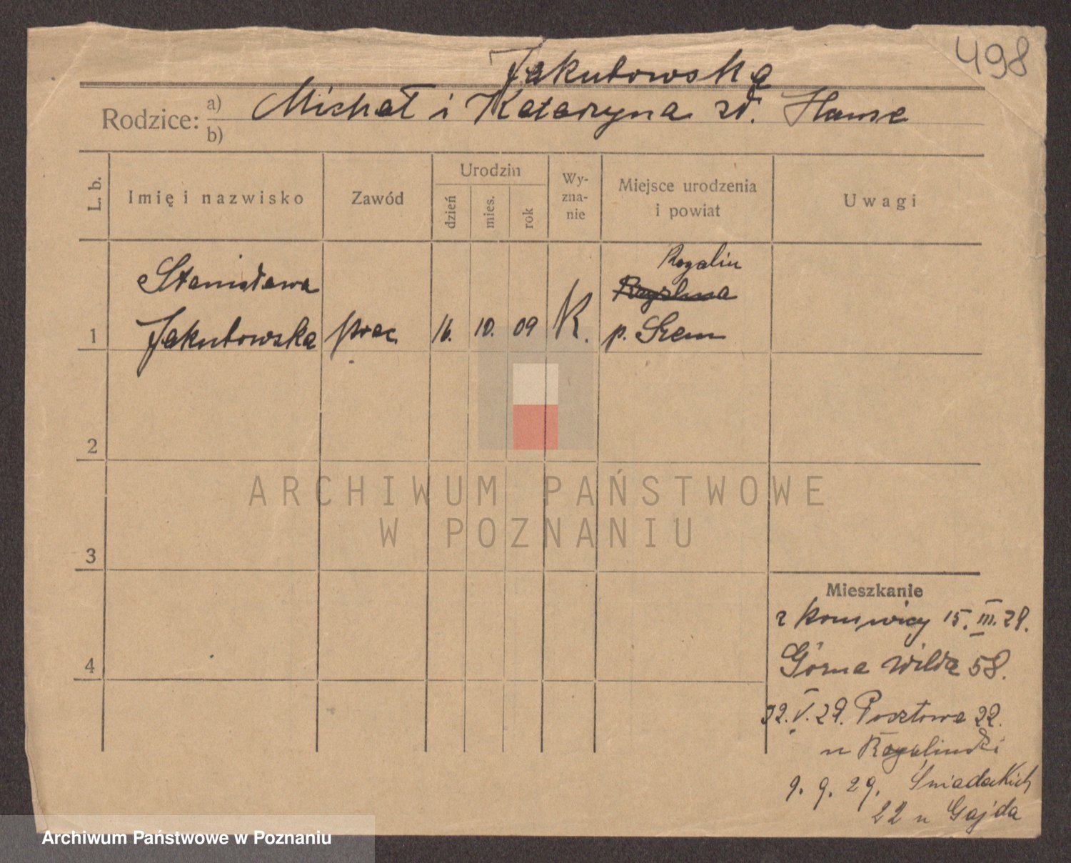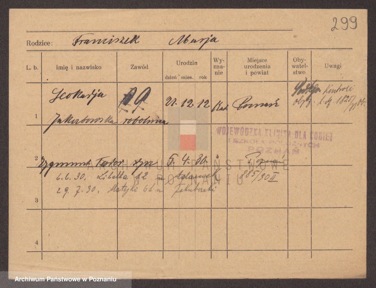 Podgląd karty osobowej dostępny jest po kliknięciu na nazwisko lub ikonkę karty. Można dokonywać powiększenia (ikony na górze) lub przechodzić między kolejnymi skanami (strzałki po bokach).