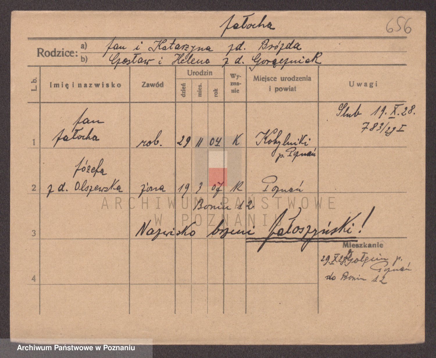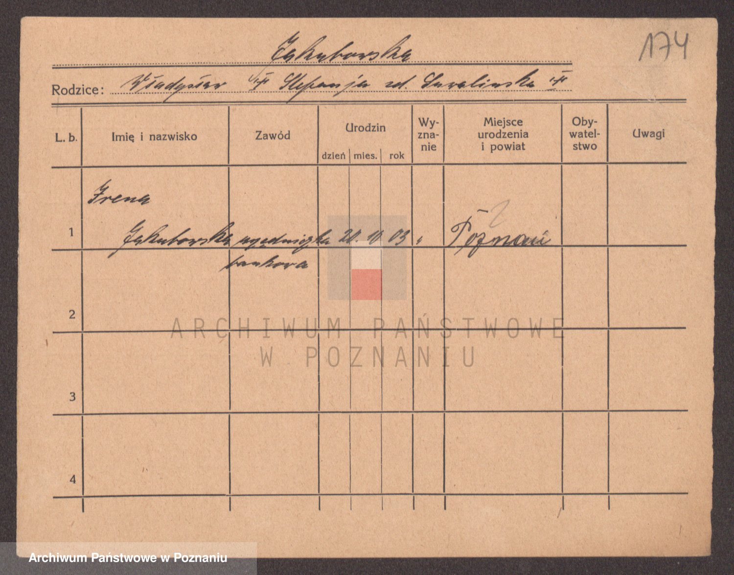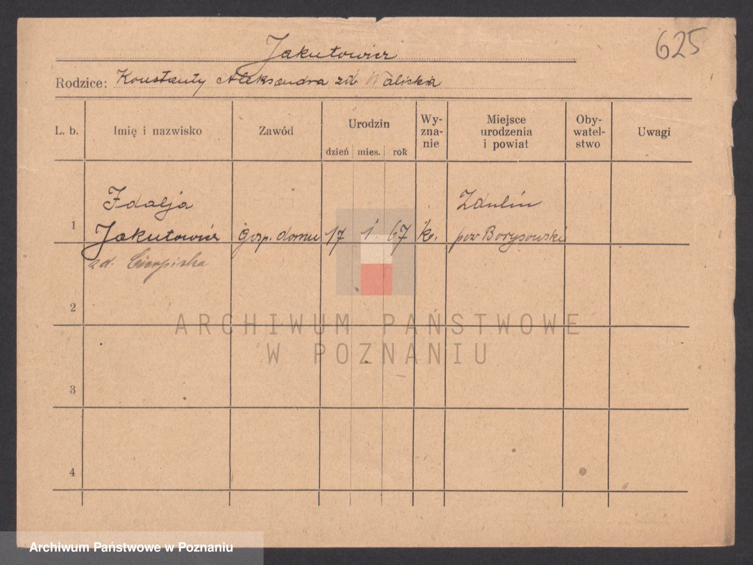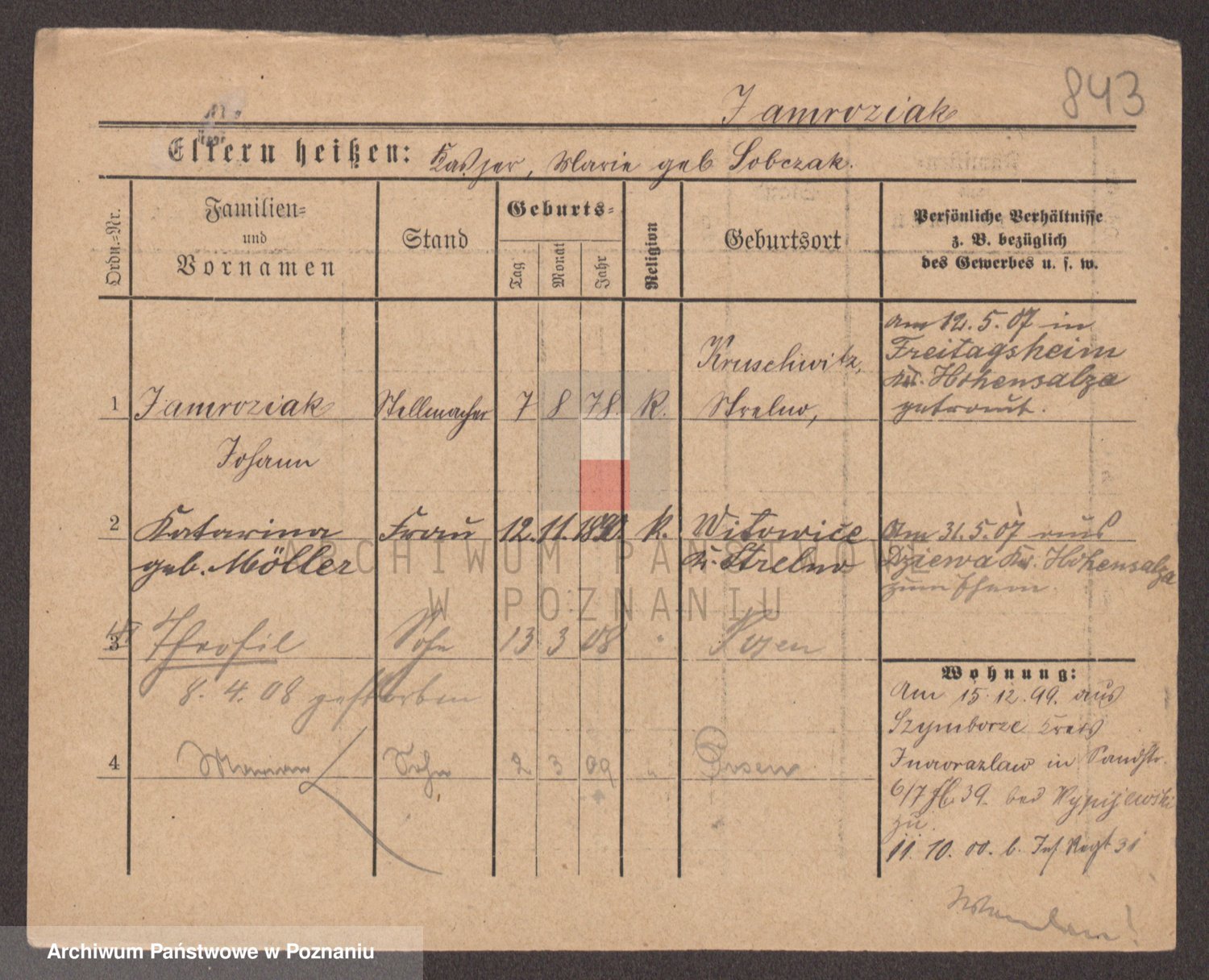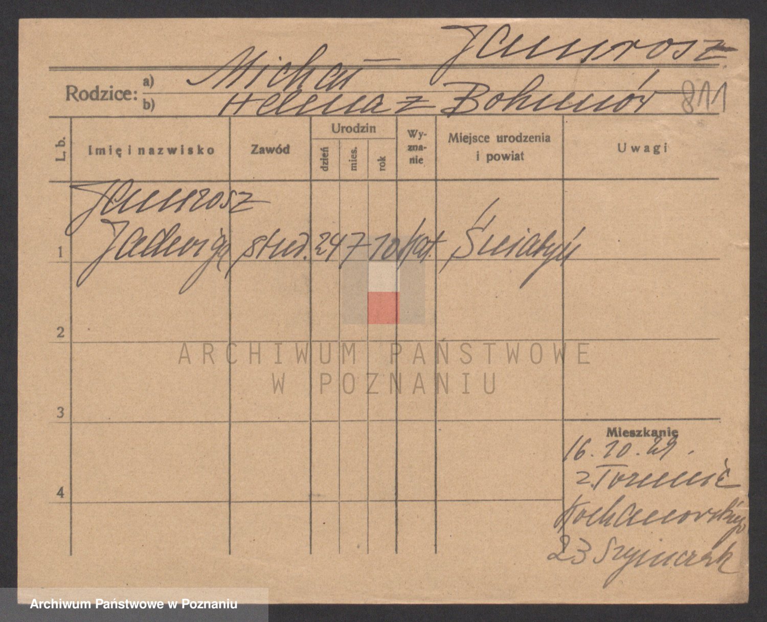 Podgląd karty osobowej dostępny jest po kliknięciu na nazwisko lub ikonkę karty. Można dokonywać powiększenia (ikony na górze) lub przechodzić między kolejnymi skanami (strzałki po bokach).