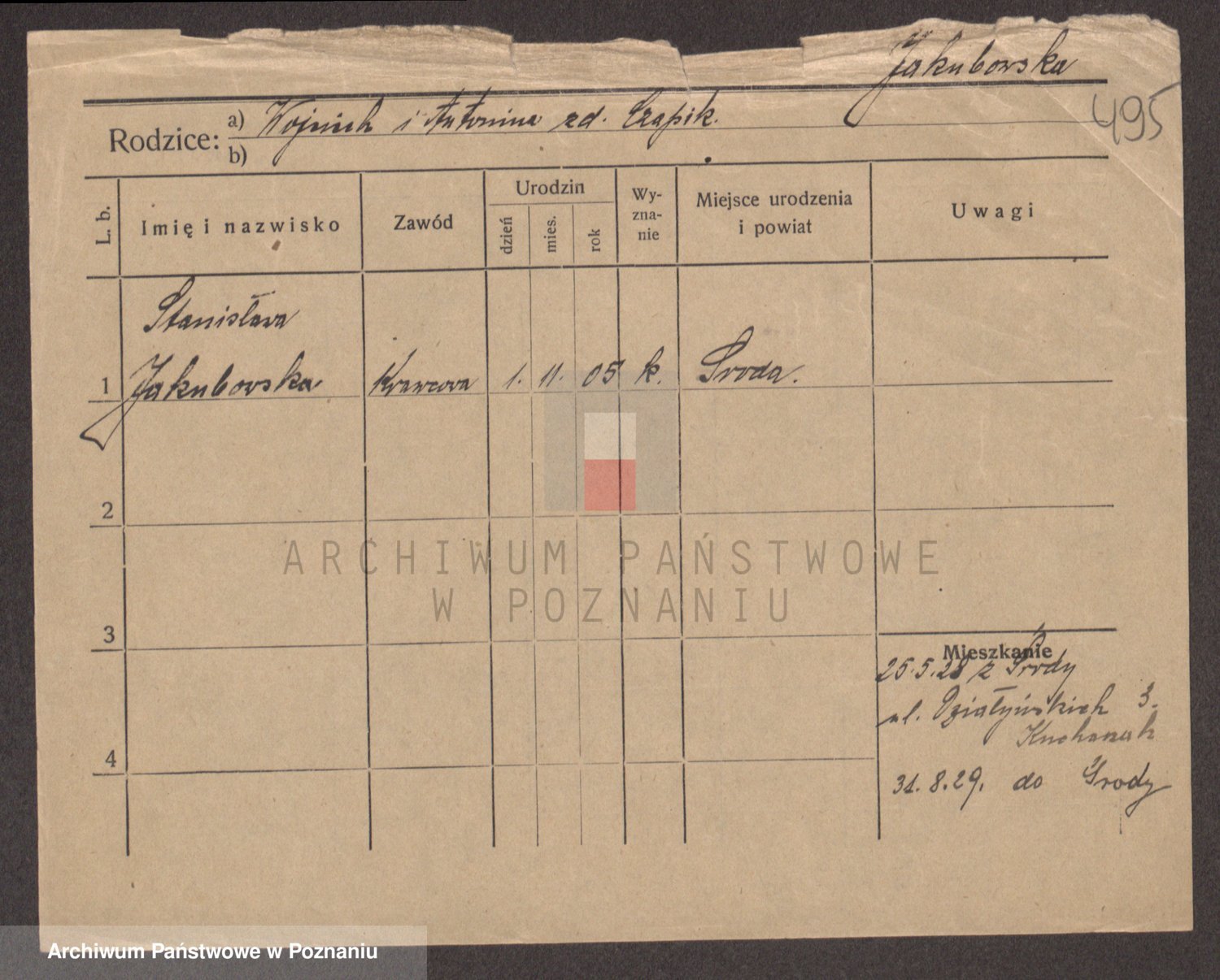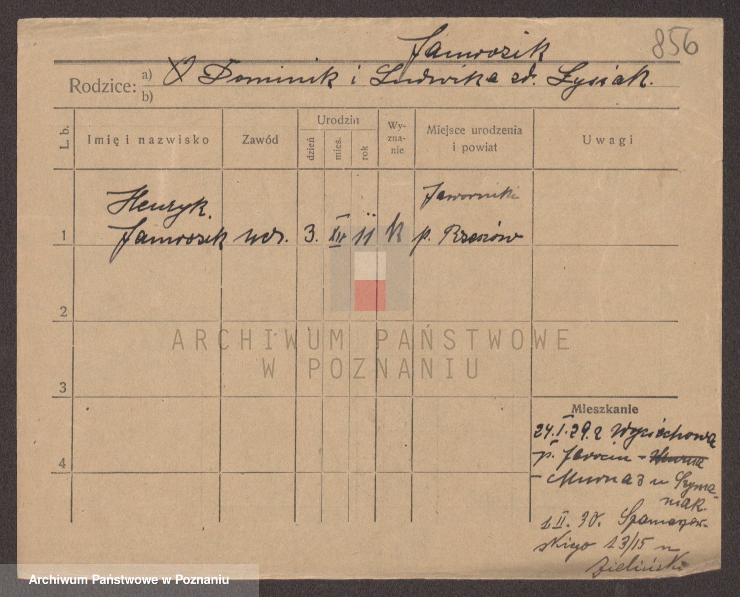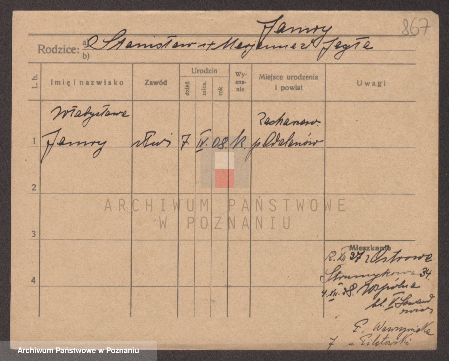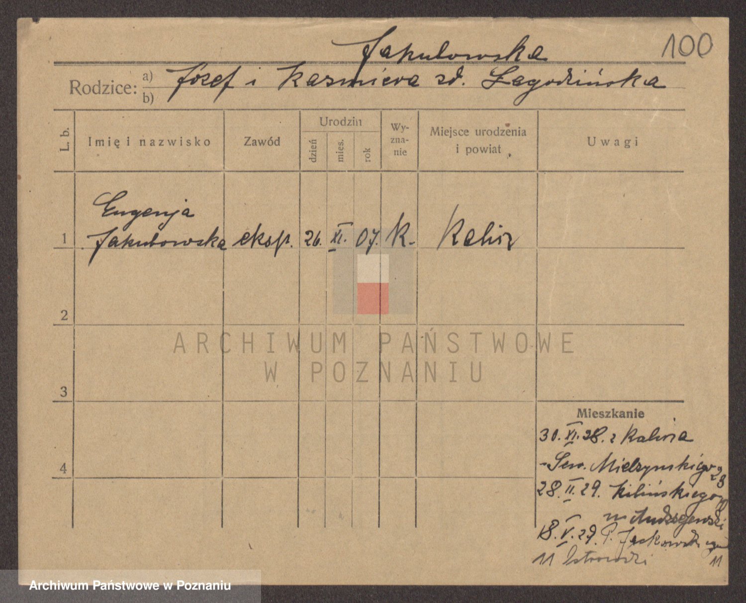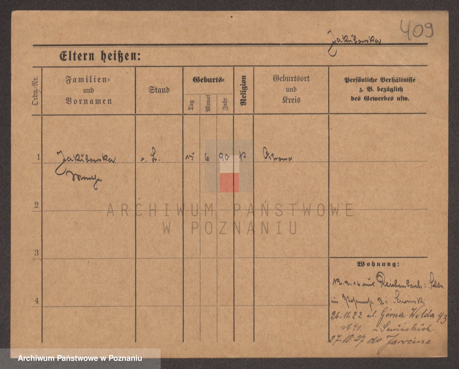 Podgląd karty osobowej dostępny jest po kliknięciu na nazwisko lub ikonkę karty. Można dokonywać powiększenia (ikony na górze) lub przechodzić między kolejnymi skanami (strzałki po bokach).