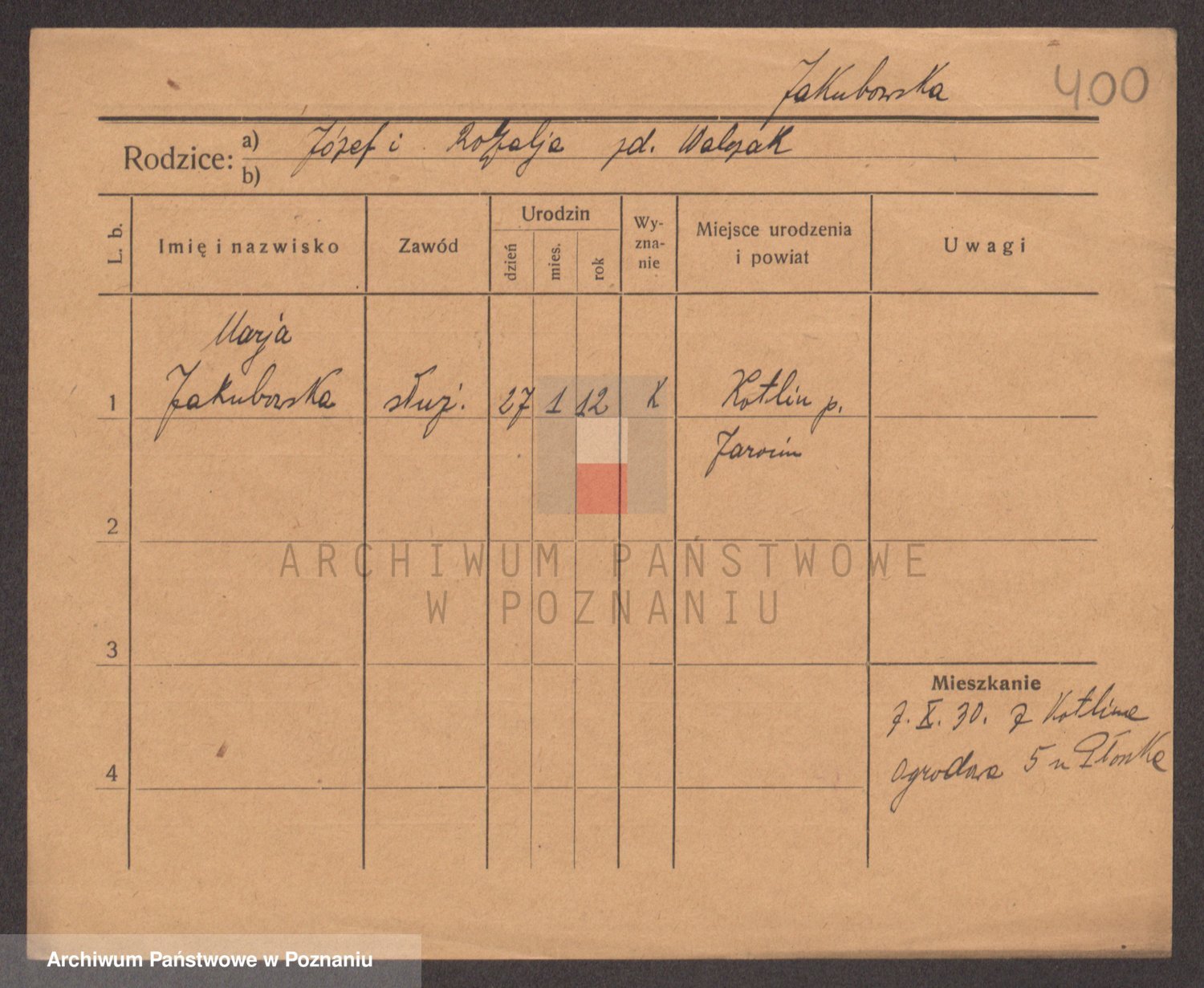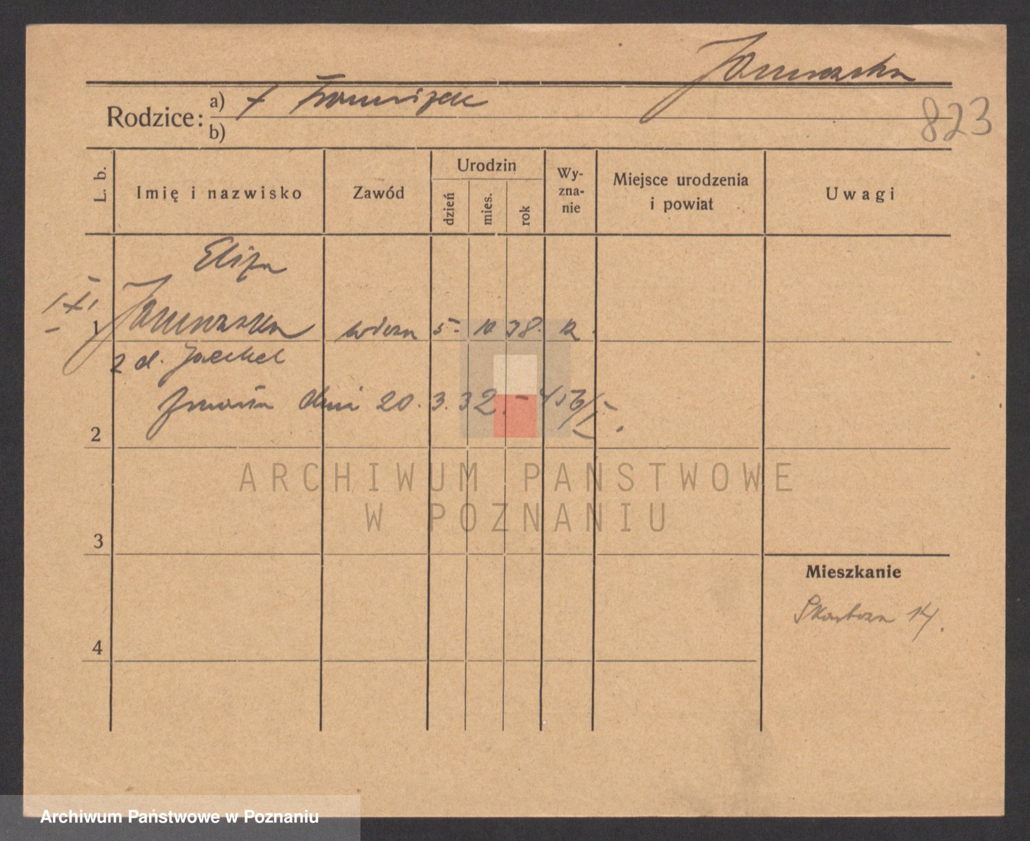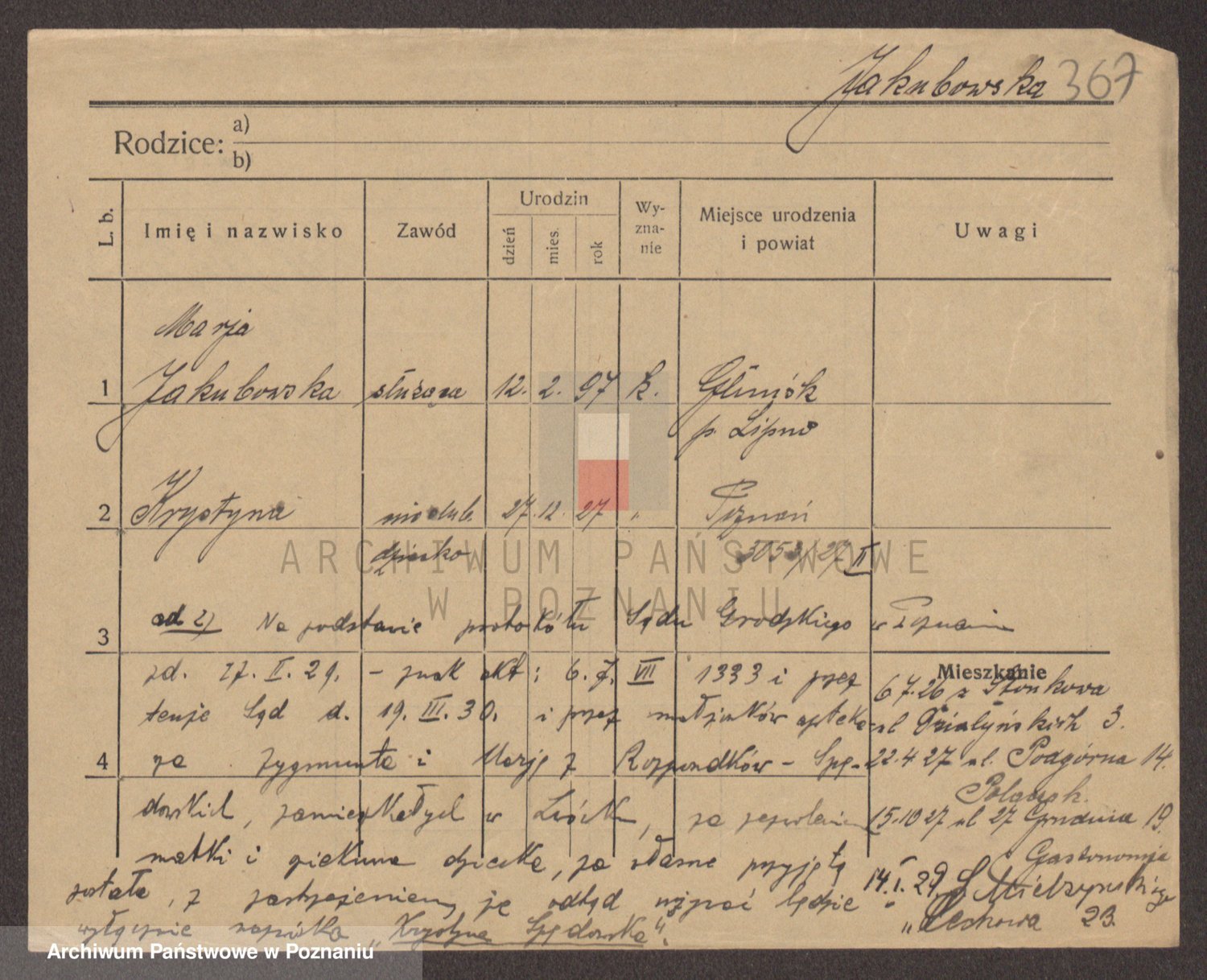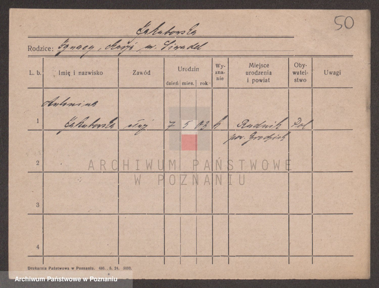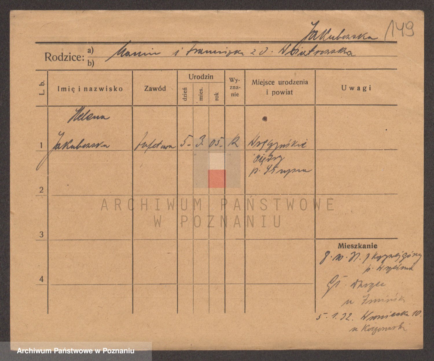 Podgląd karty osobowej dostępny jest po kliknięciu na nazwisko lub ikonkę karty. Można dokonywać powiększenia (ikony na górze) lub przechodzić między kolejnymi skanami (strzałki po bokach).
