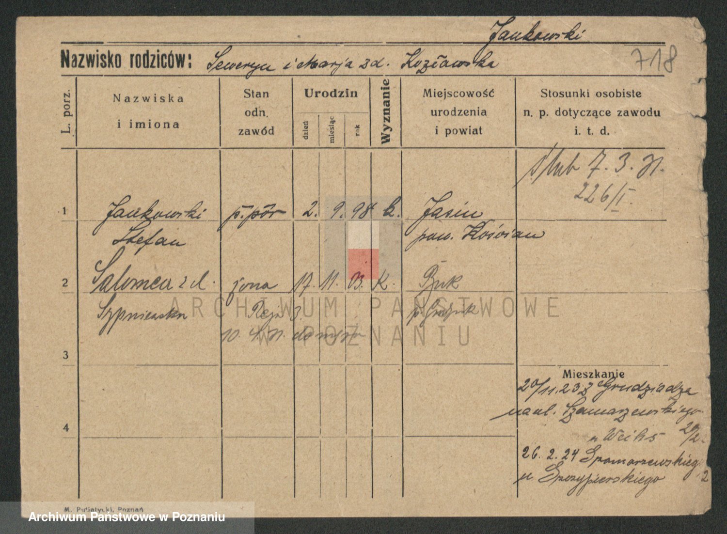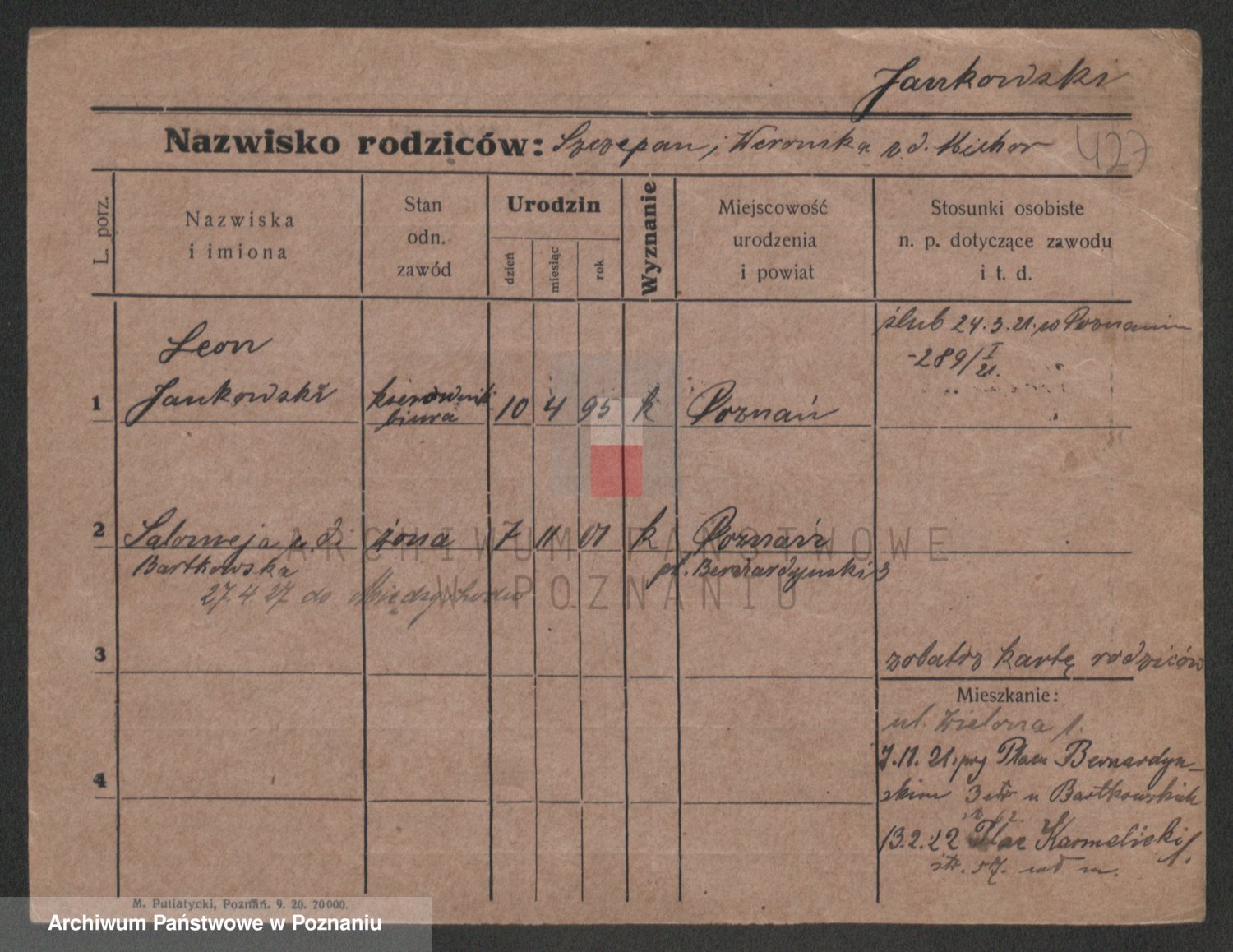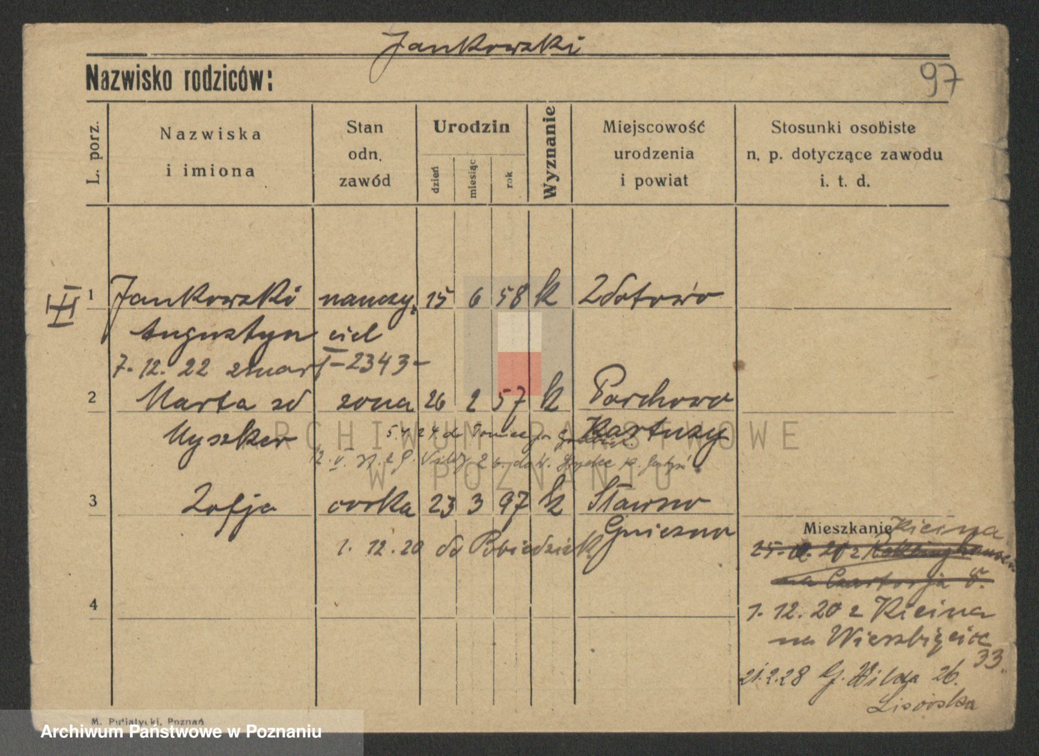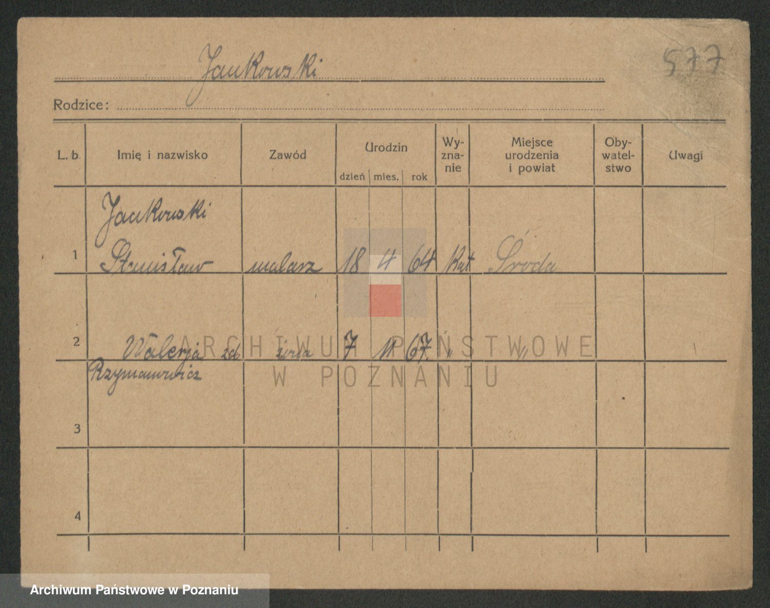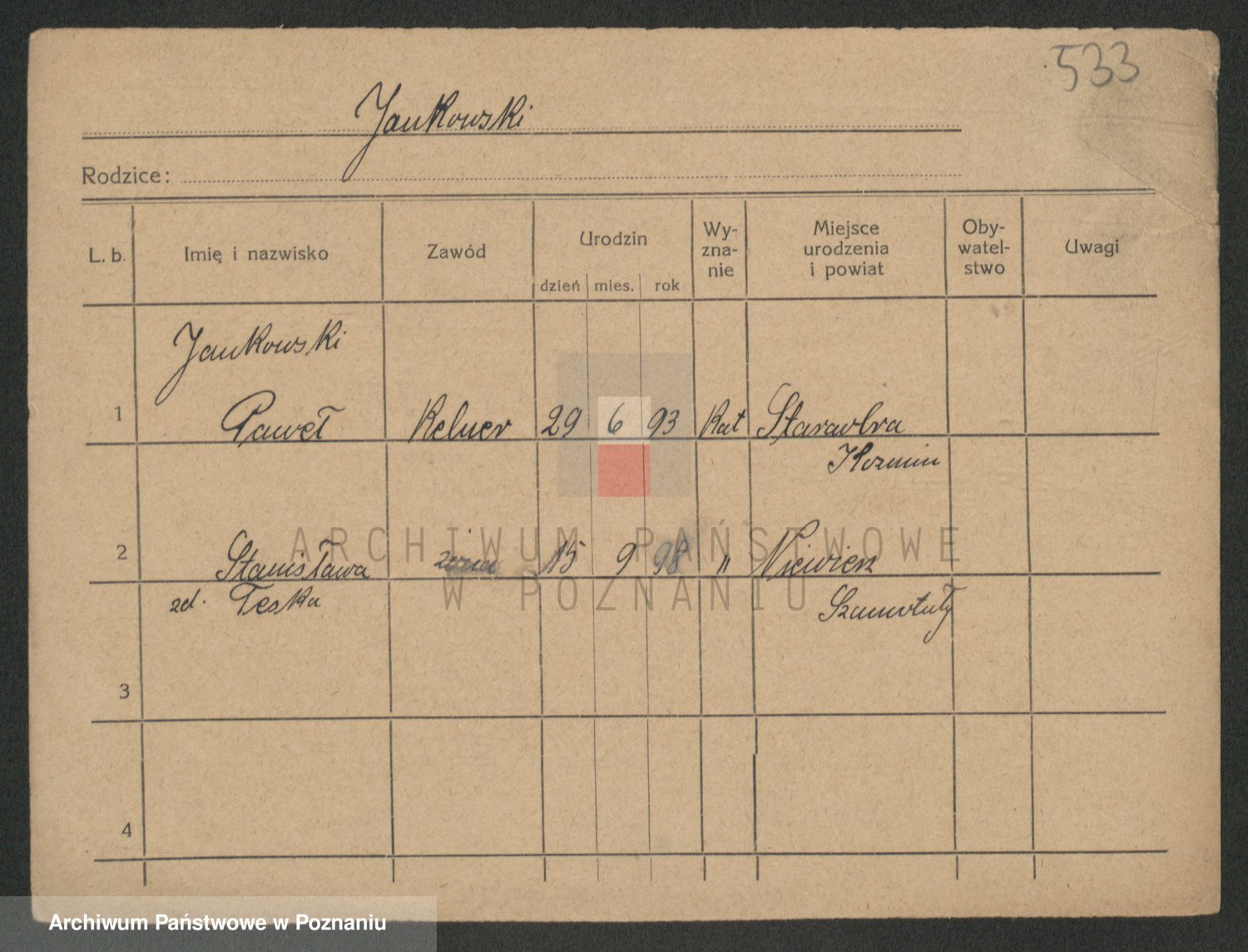 Podgląd karty osobowej dostępny jest po kliknięciu na nazwisko lub ikonkę karty. Można dokonywać powiększenia (ikony na górze) lub przechodzić między kolejnymi skanami (strzałki po bokach).