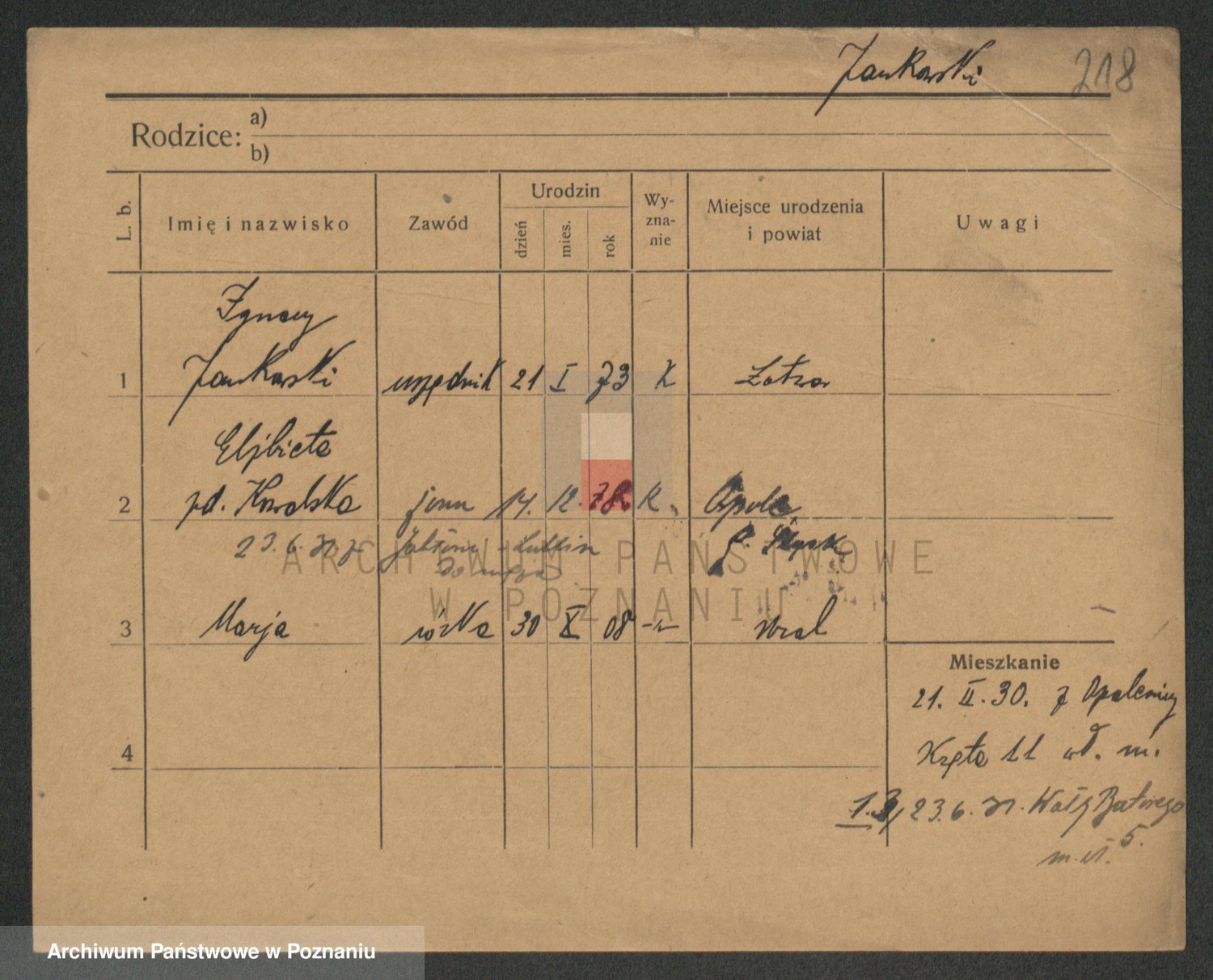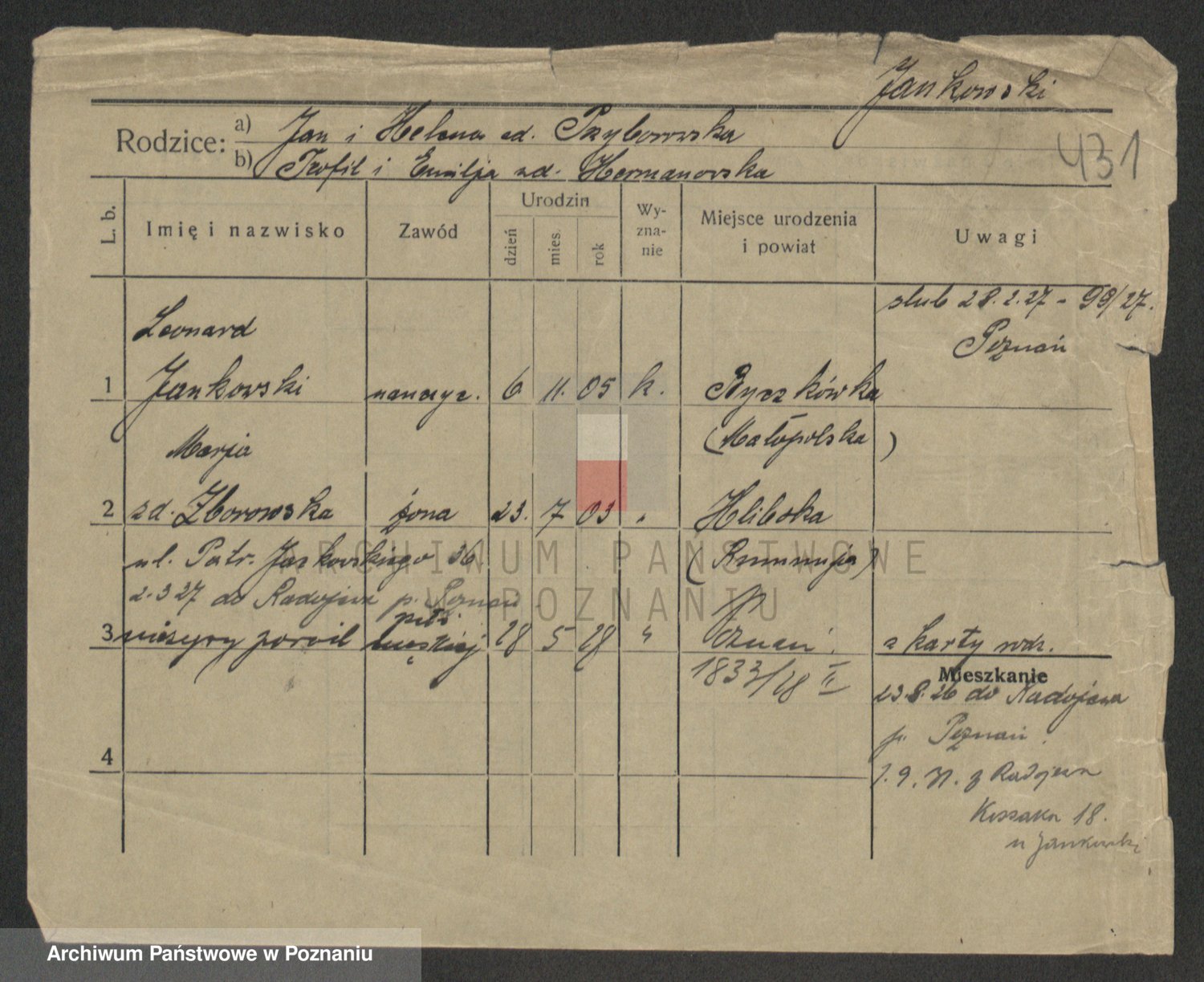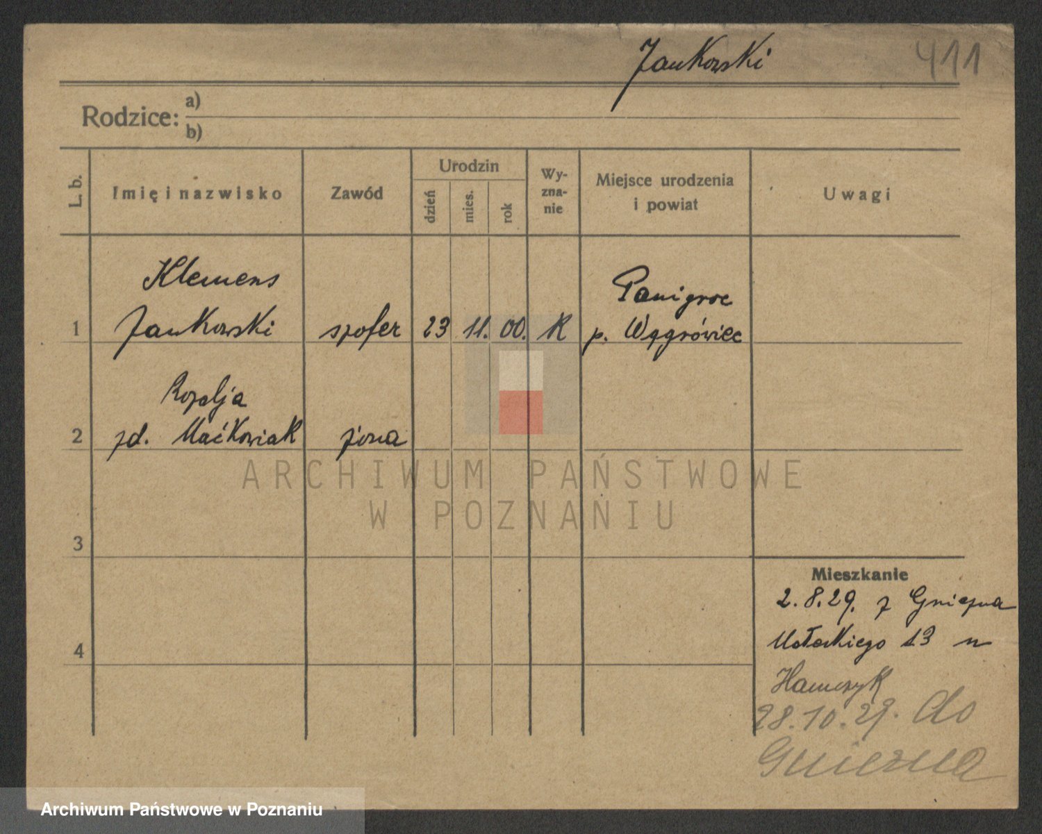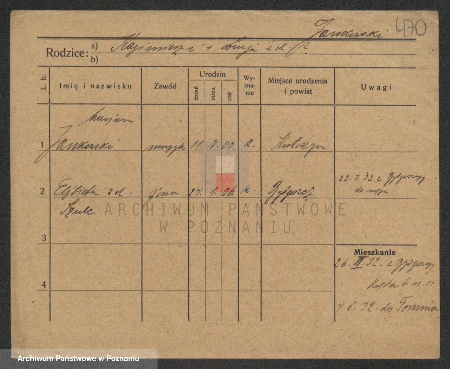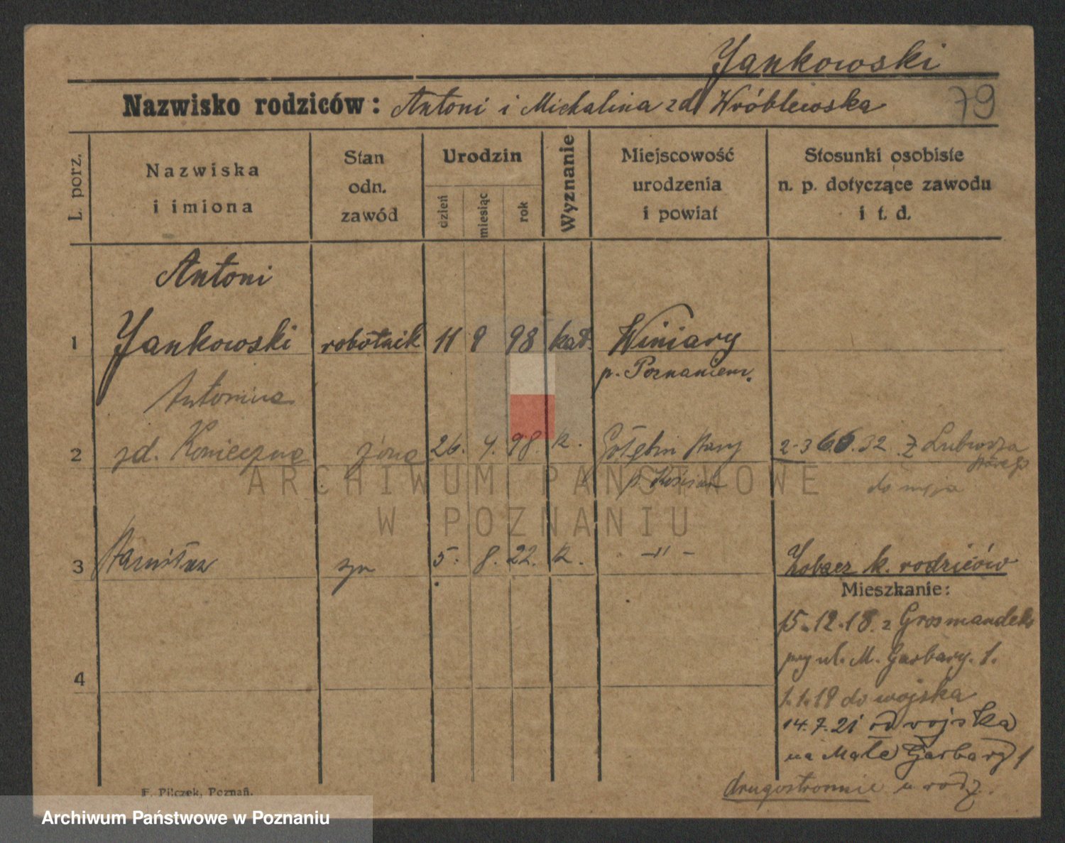 Podgląd karty osobowej dostępny jest po kliknięciu na nazwisko lub ikonkę karty. Można dokonywać powiększenia (ikony na górze) lub przechodzić między kolejnymi skanami (strzałki po bokach).