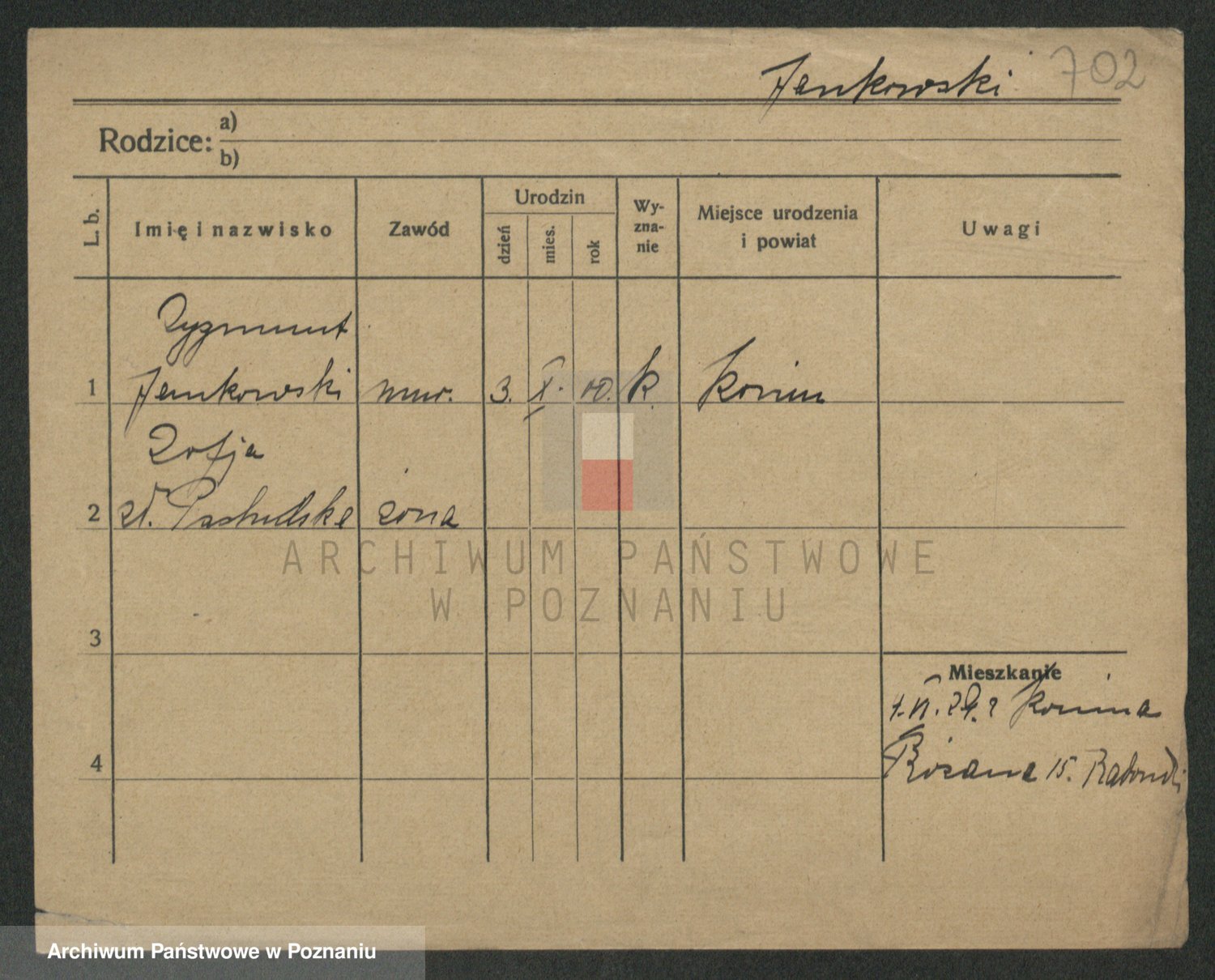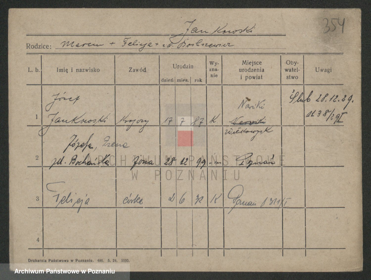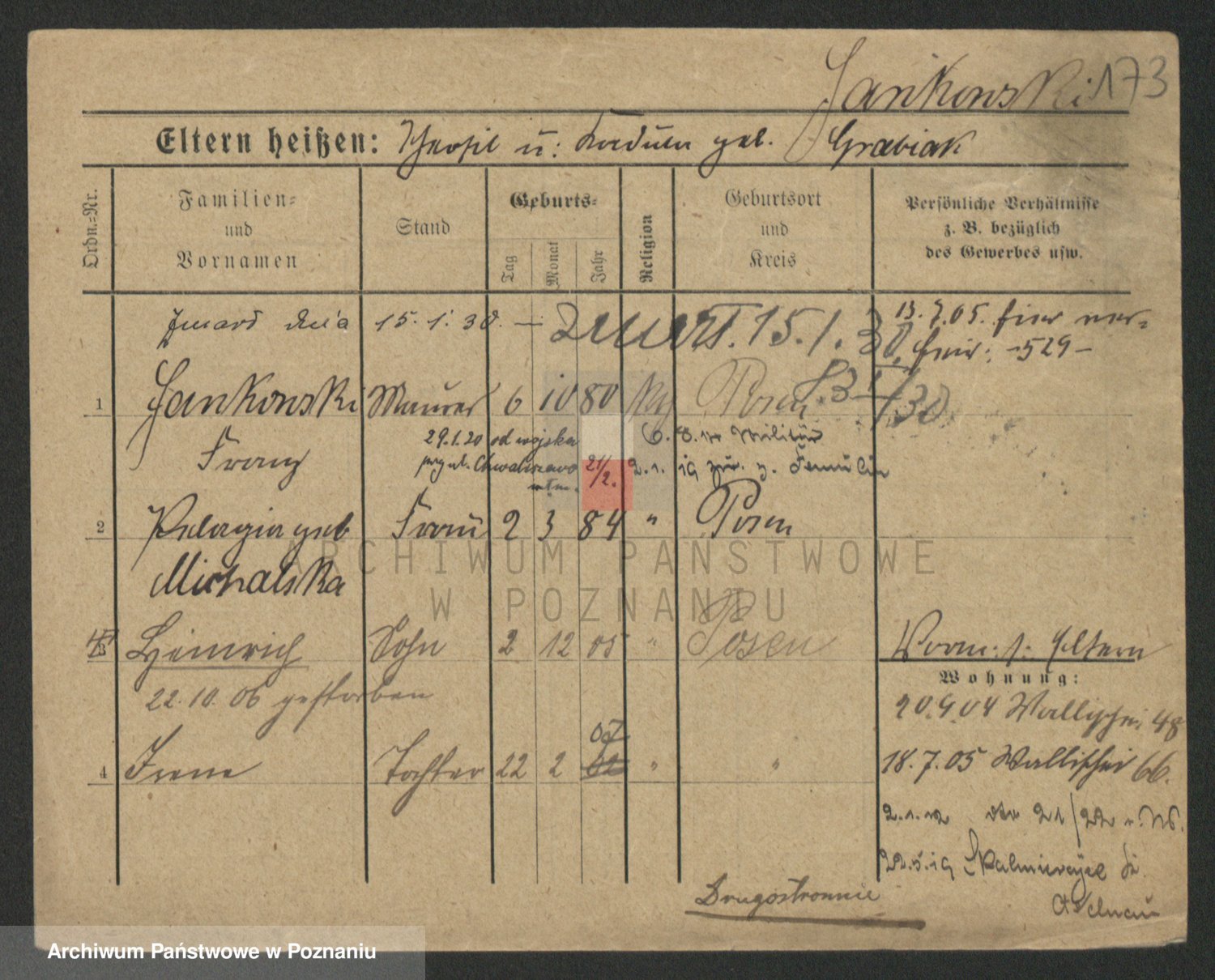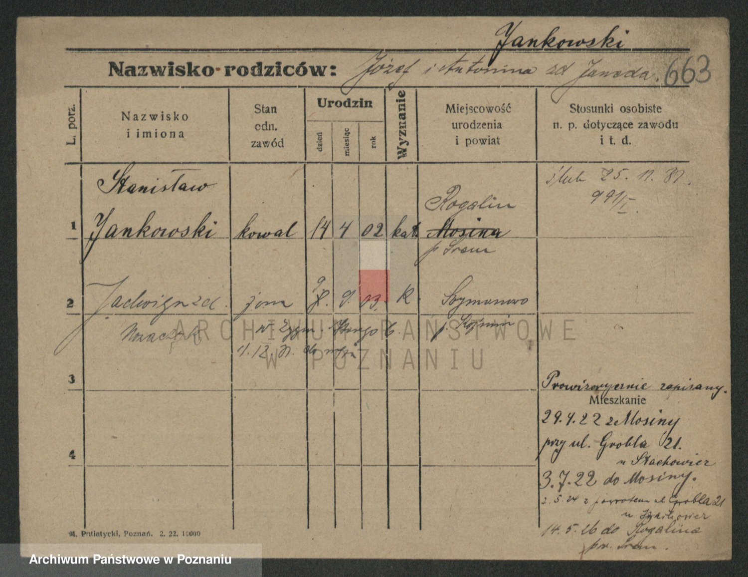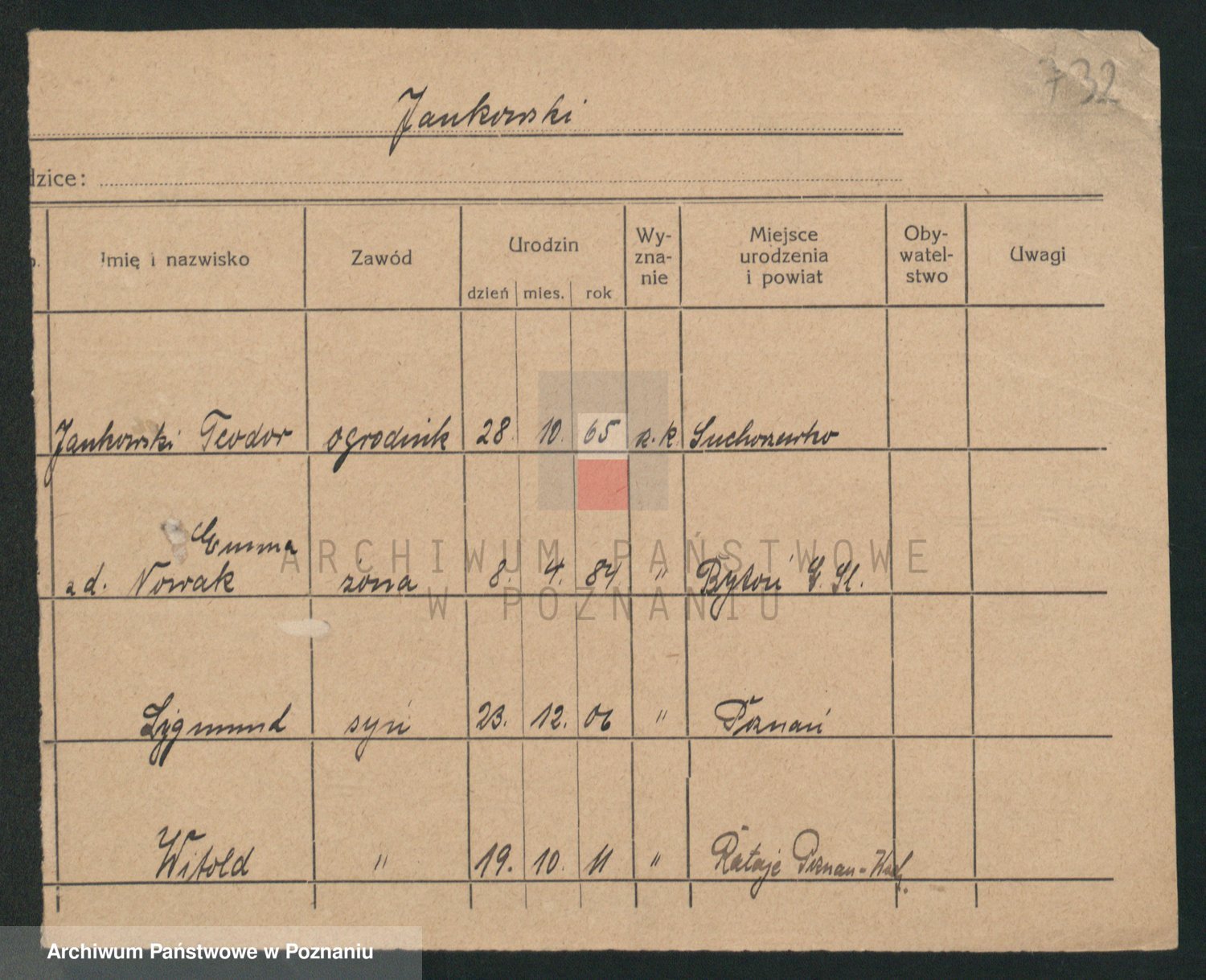 Podgląd karty osobowej dostępny jest po kliknięciu na nazwisko lub ikonkę karty. Można dokonywać powiększenia (ikony na górze) lub przechodzić między kolejnymi skanami (strzałki po bokach).