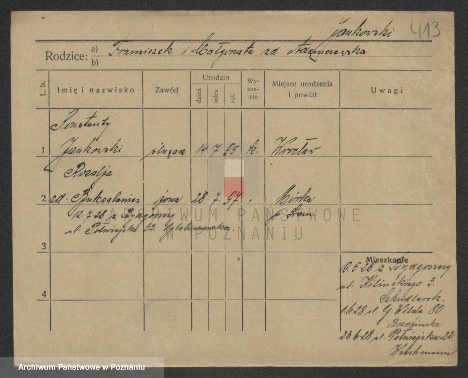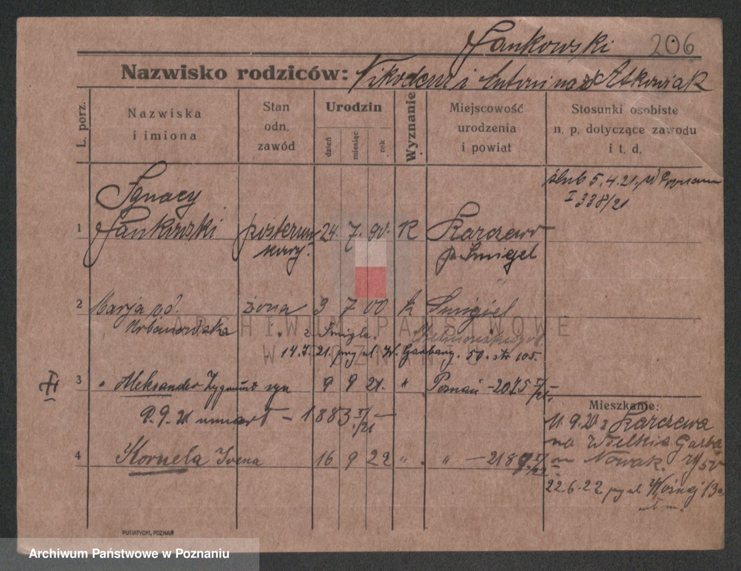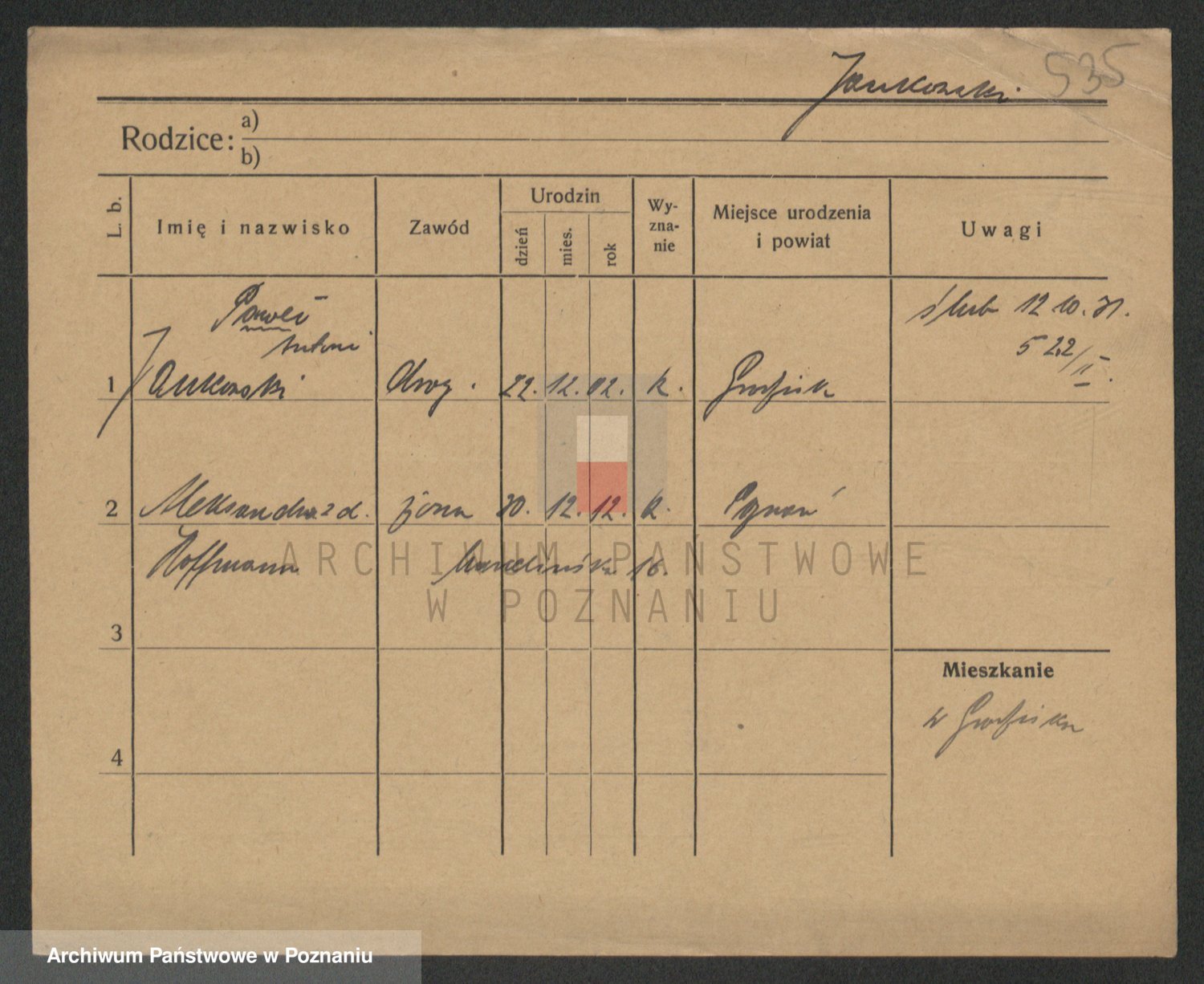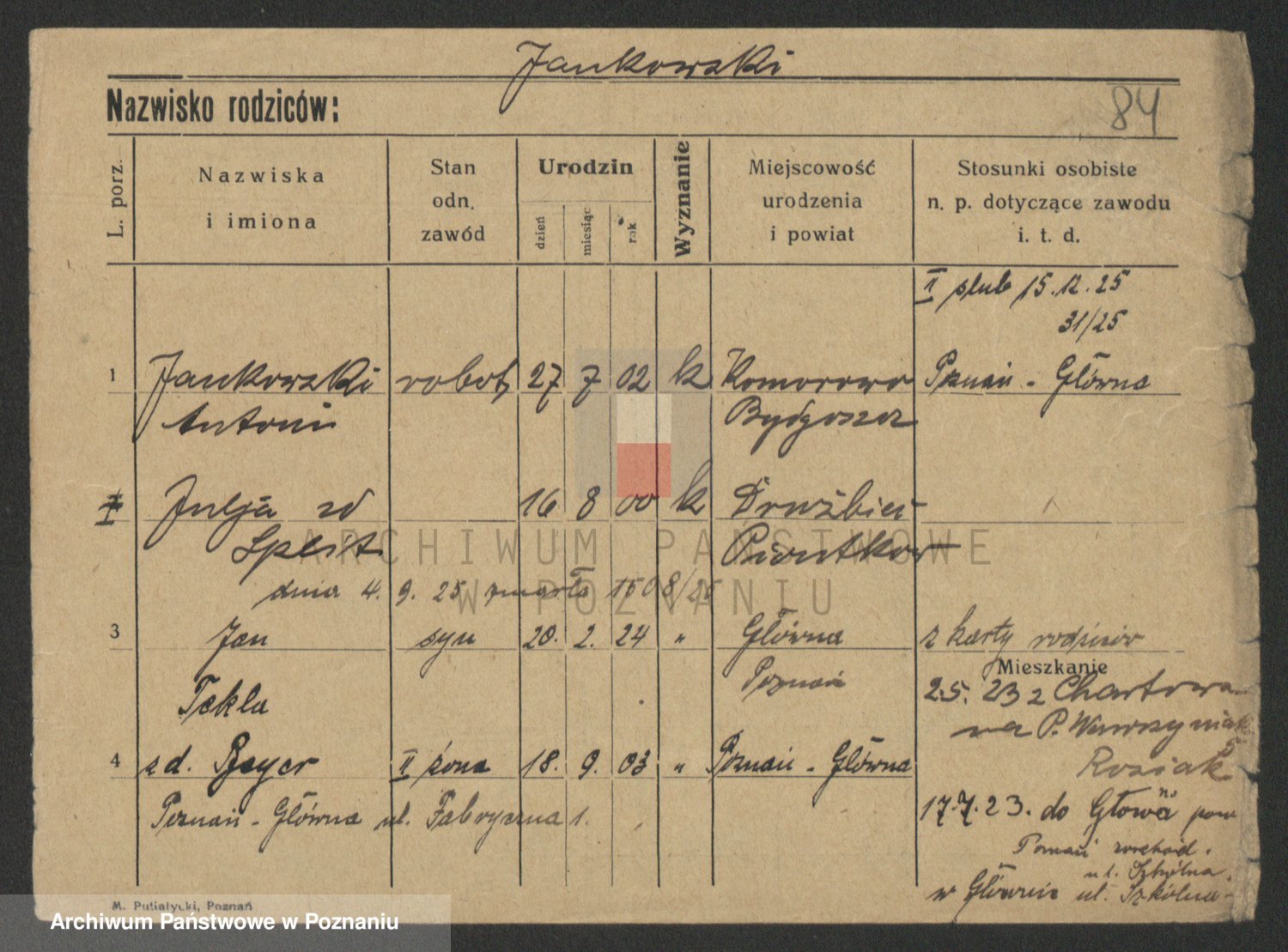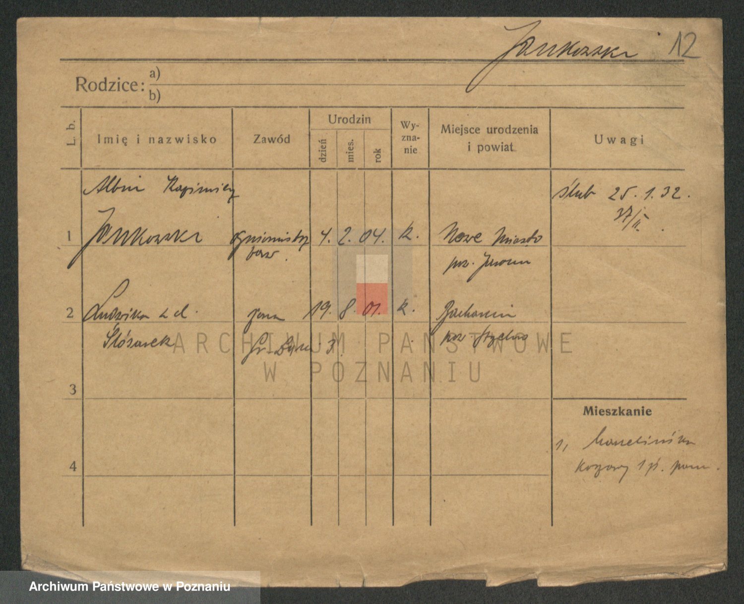 Podgląd karty osobowej dostępny jest po kliknięciu na nazwisko lub ikonkę karty. Można dokonywać powiększenia (ikony na górze) lub przechodzić między kolejnymi skanami (strzałki po bokach).