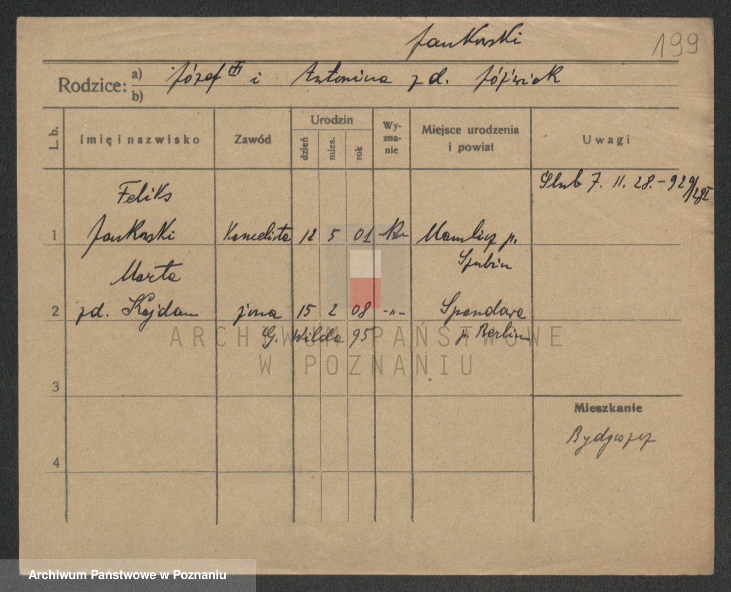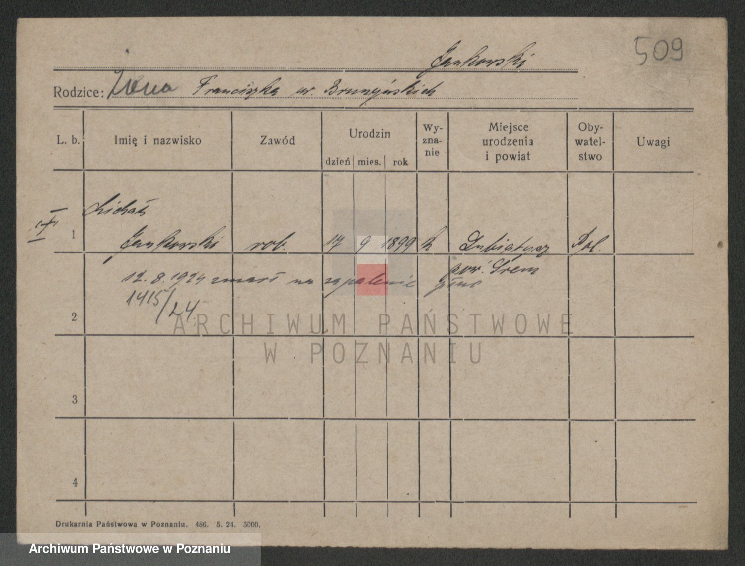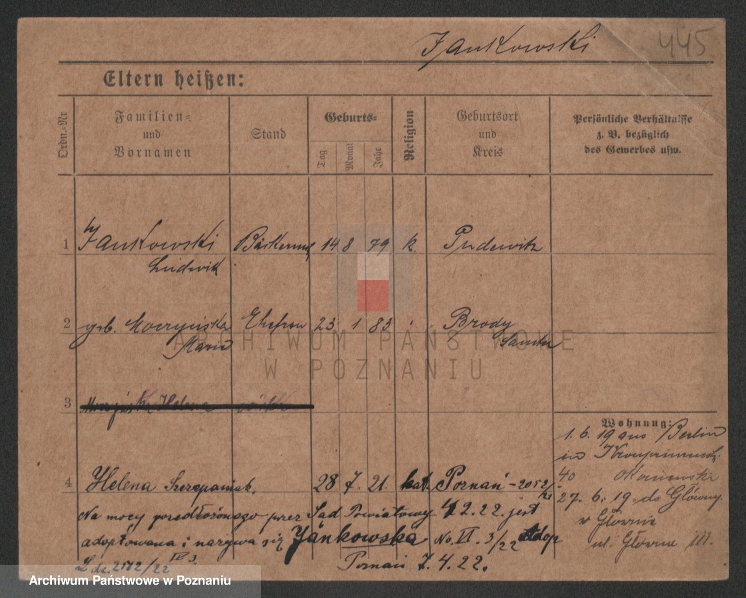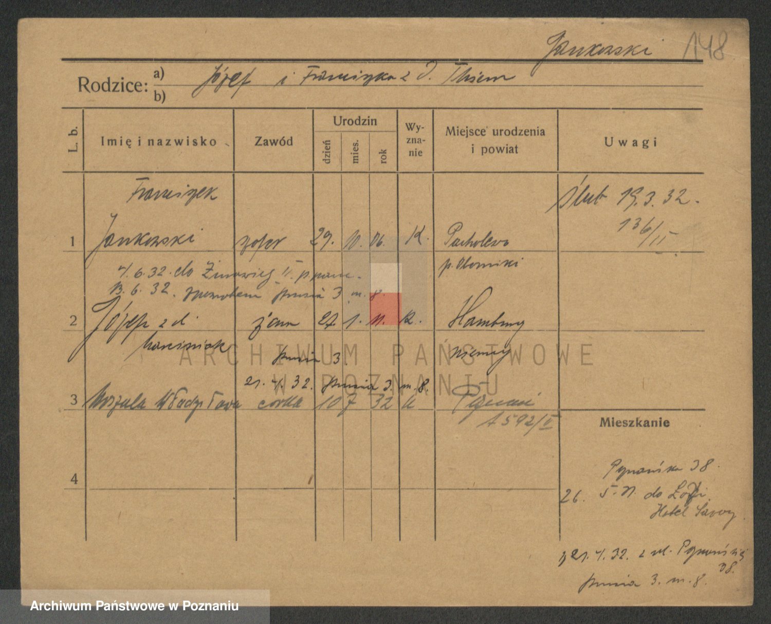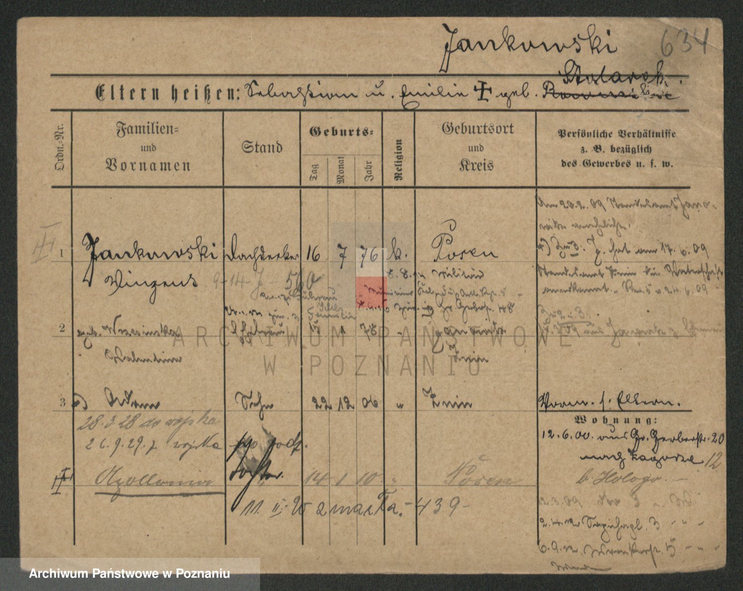 Podgląd karty osobowej dostępny jest po kliknięciu na nazwisko lub ikonkę karty. Można dokonywać powiększenia (ikony na górze) lub przechodzić między kolejnymi skanami (strzałki po bokach).