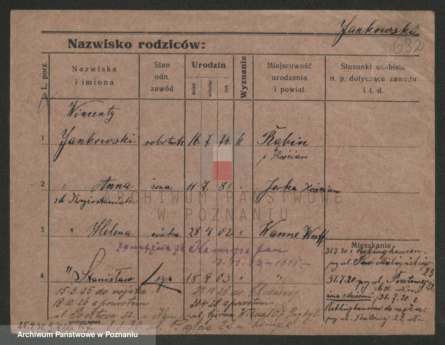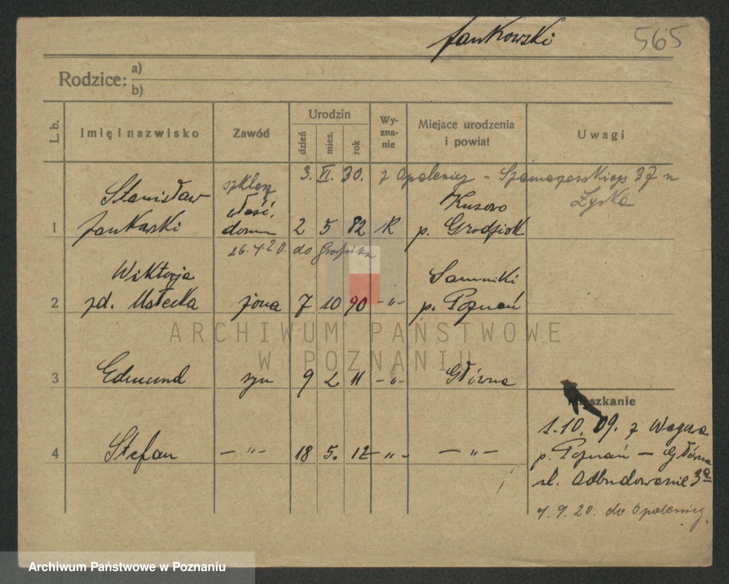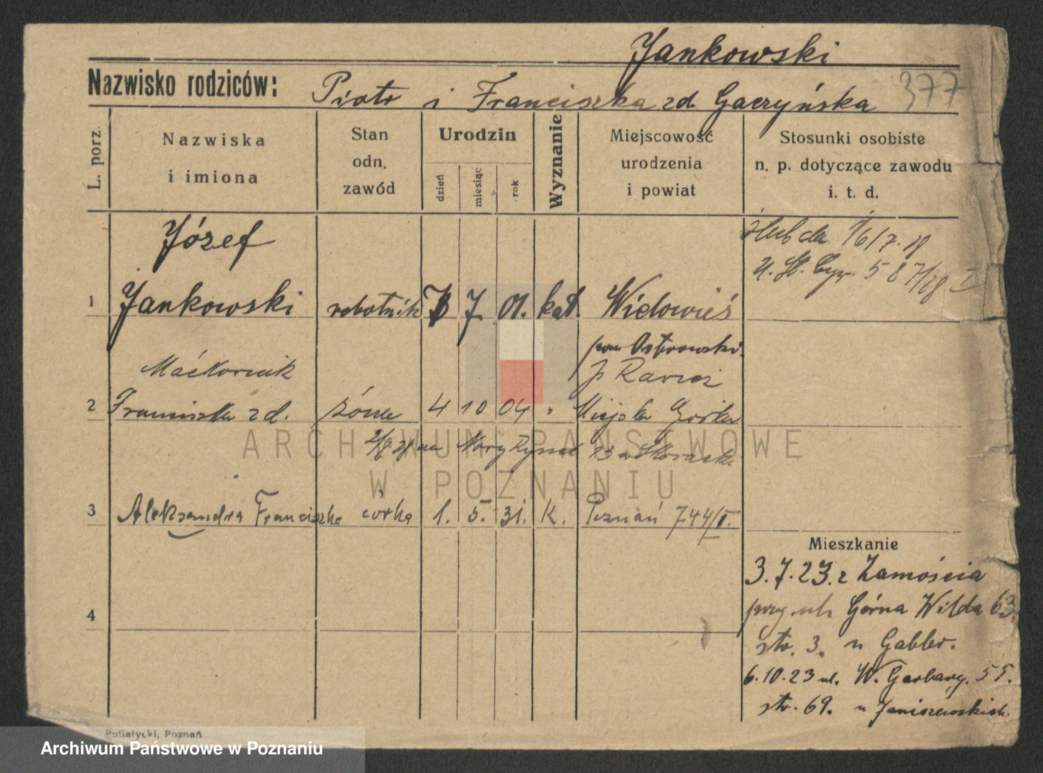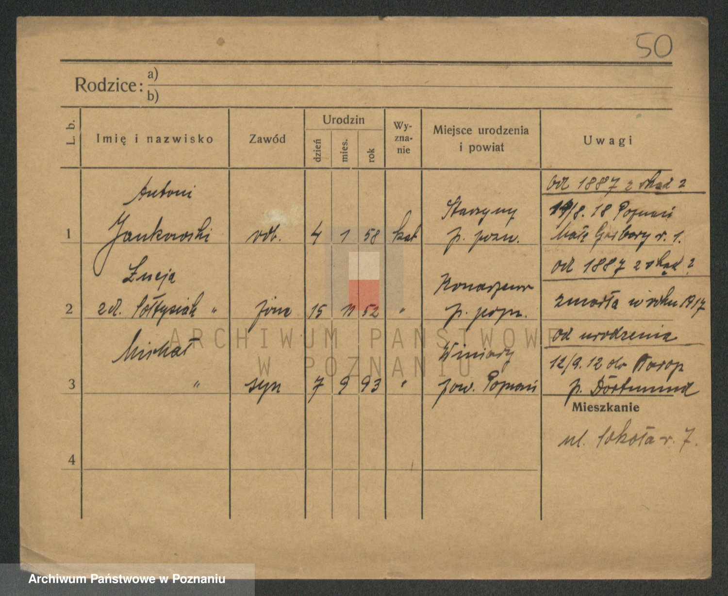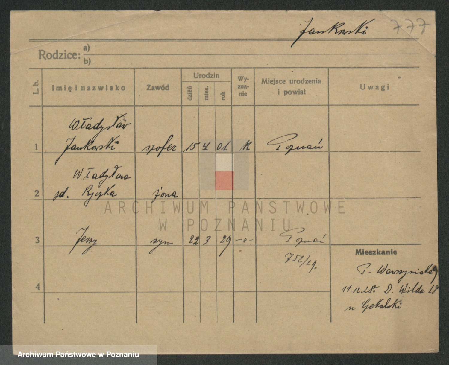 Podgląd karty osobowej dostępny jest po kliknięciu na nazwisko lub ikonkę karty. Można dokonywać powiększenia (ikony na górze) lub przechodzić między kolejnymi skanami (strzałki po bokach).