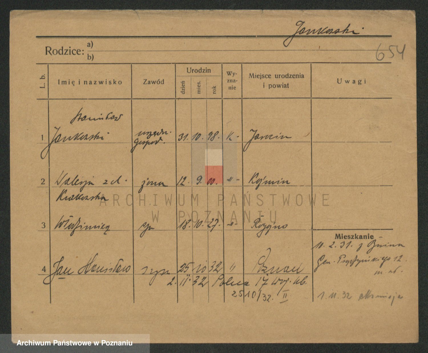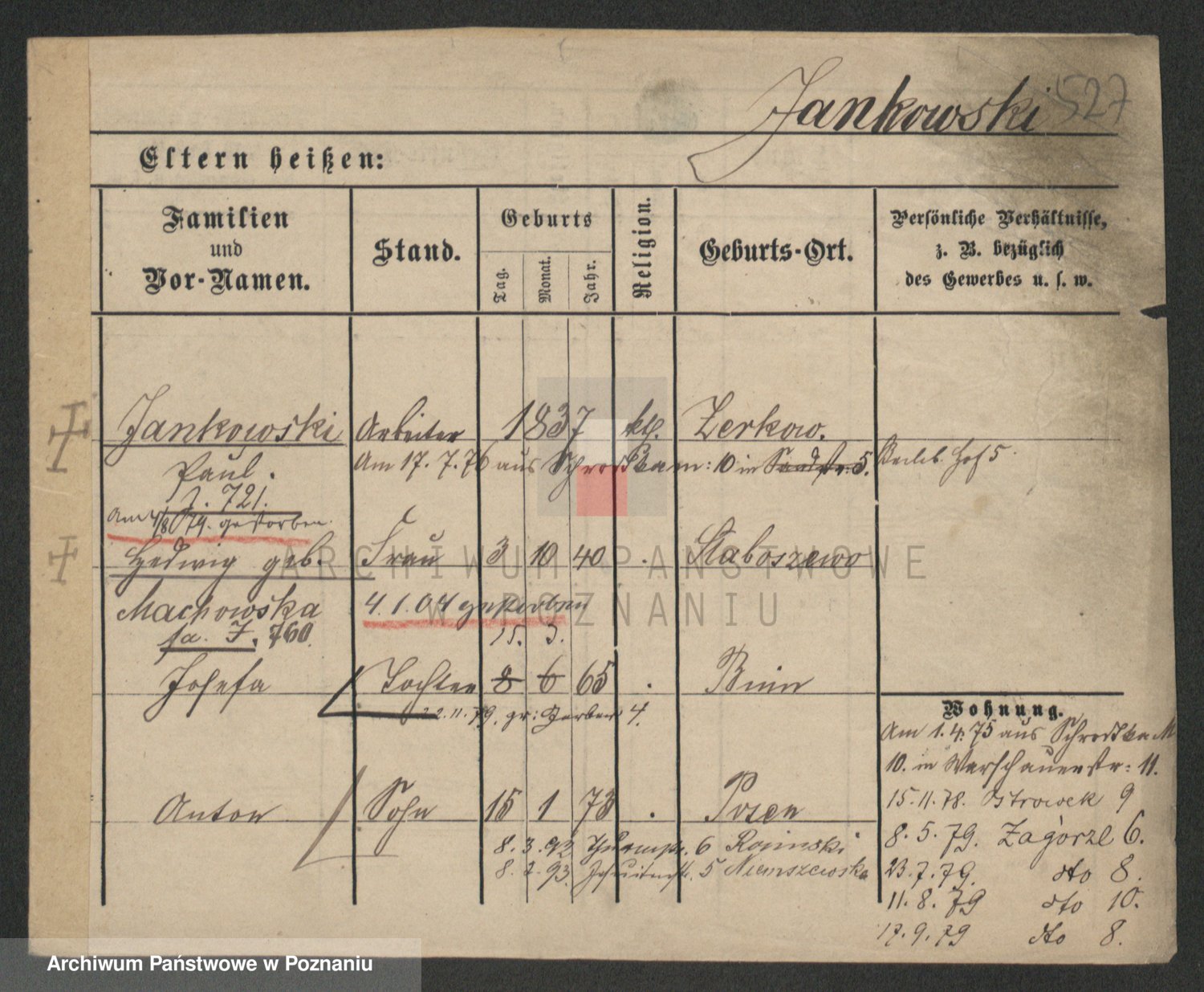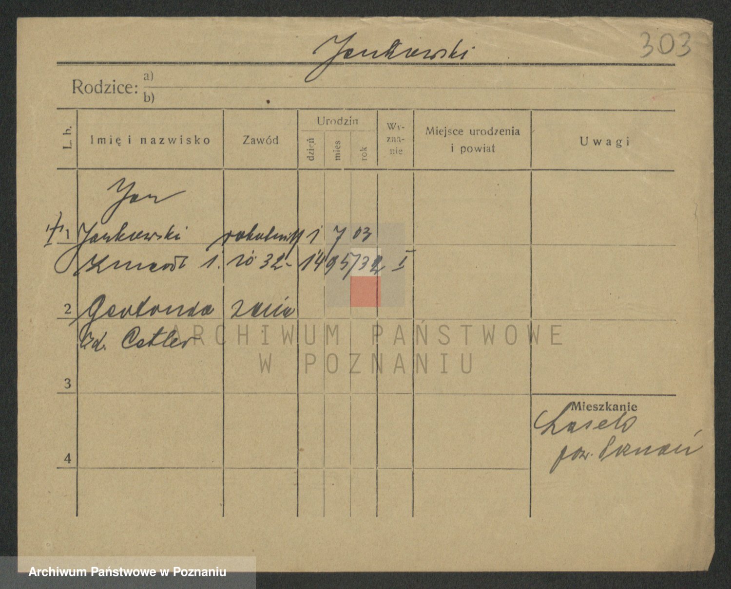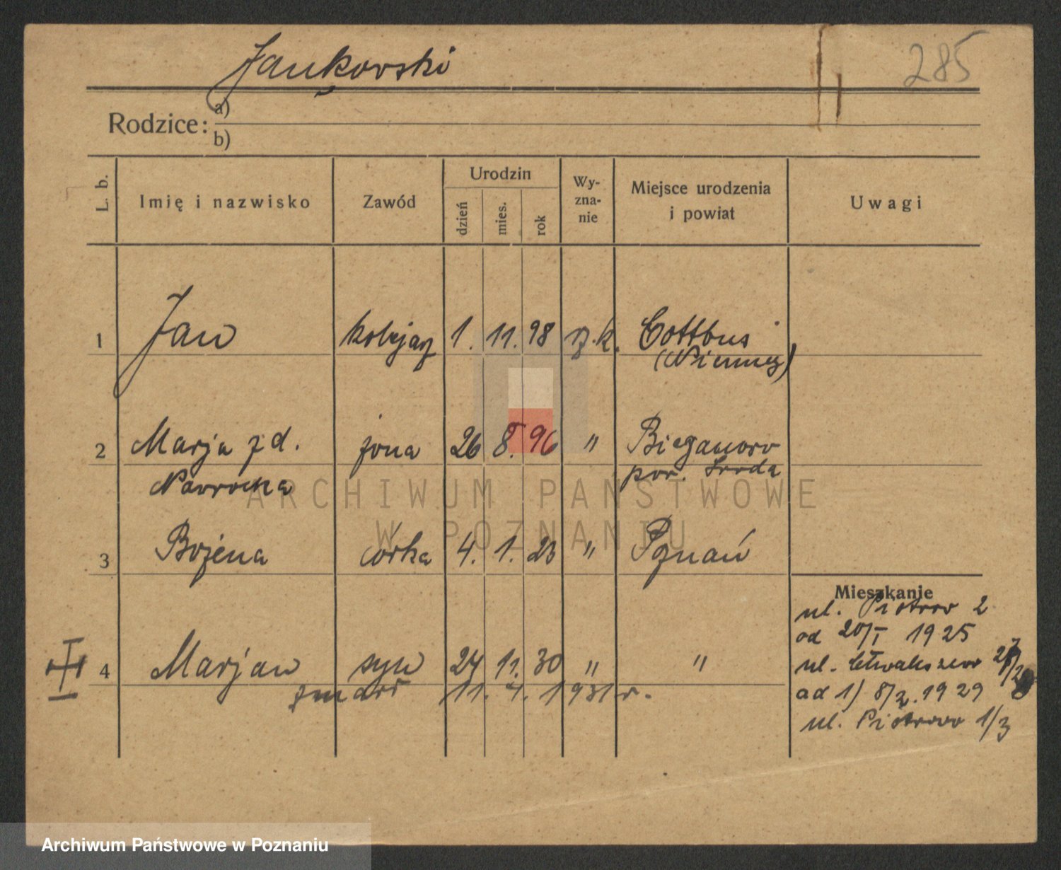 Podgląd karty osobowej dostępny jest po kliknięciu na nazwisko lub ikonkę karty. Można dokonywać powiększenia (ikony na górze) lub przechodzić między kolejnymi skanami (strzałki po bokach).