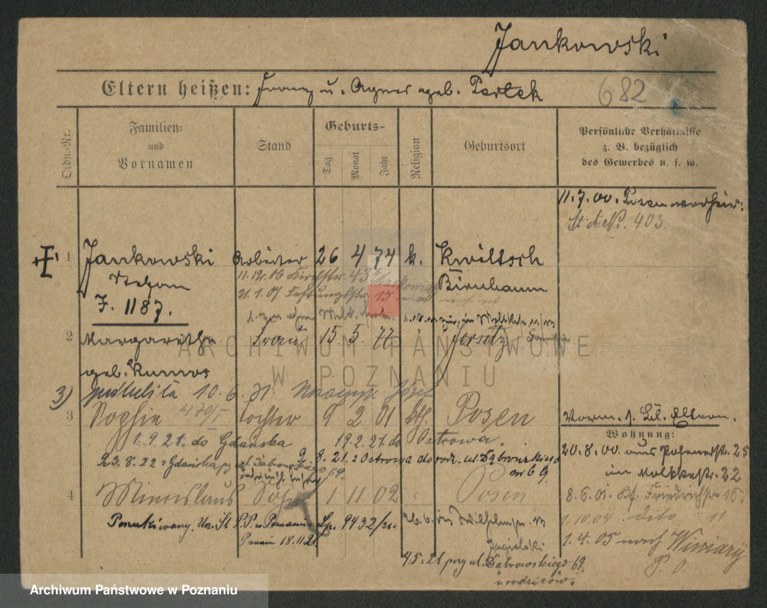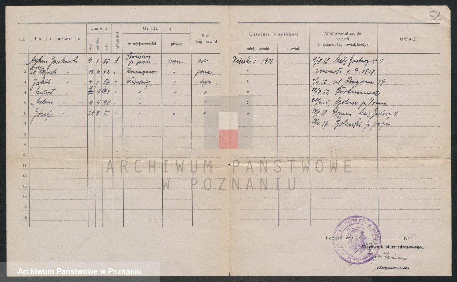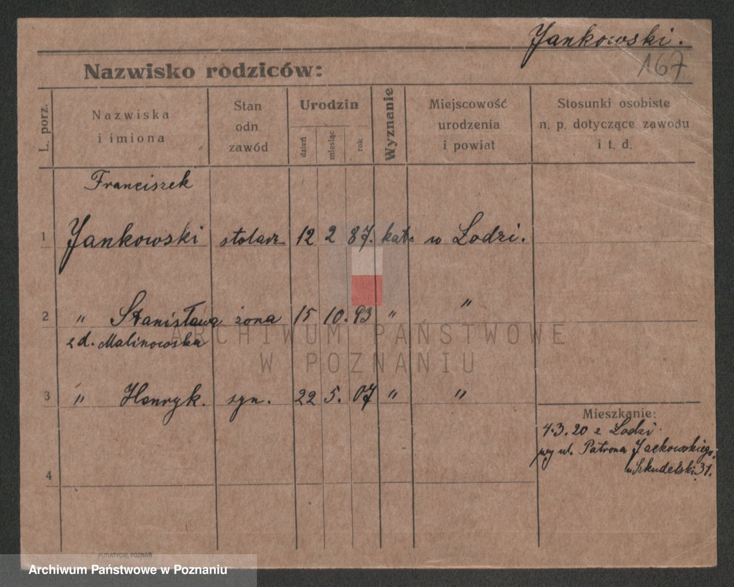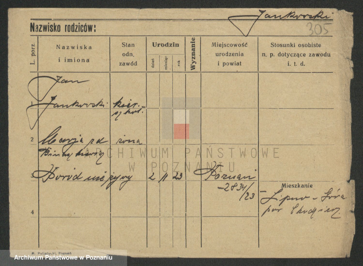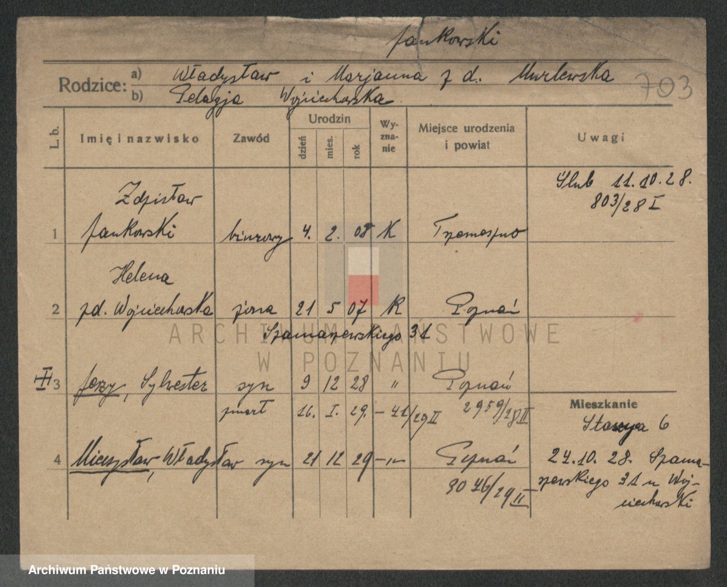 Podgląd karty osobowej dostępny jest po kliknięciu na nazwisko lub ikonkę karty. Można dokonywać powiększenia (ikony na górze) lub przechodzić między kolejnymi skanami (strzałki po bokach).