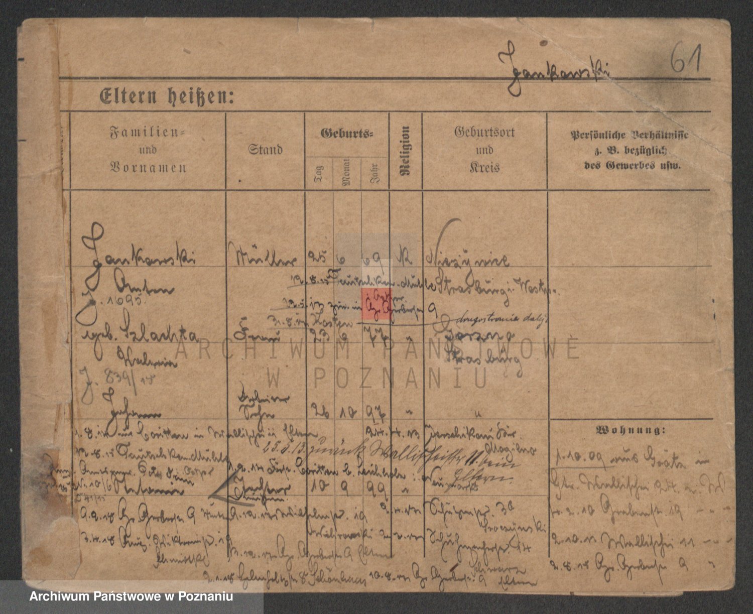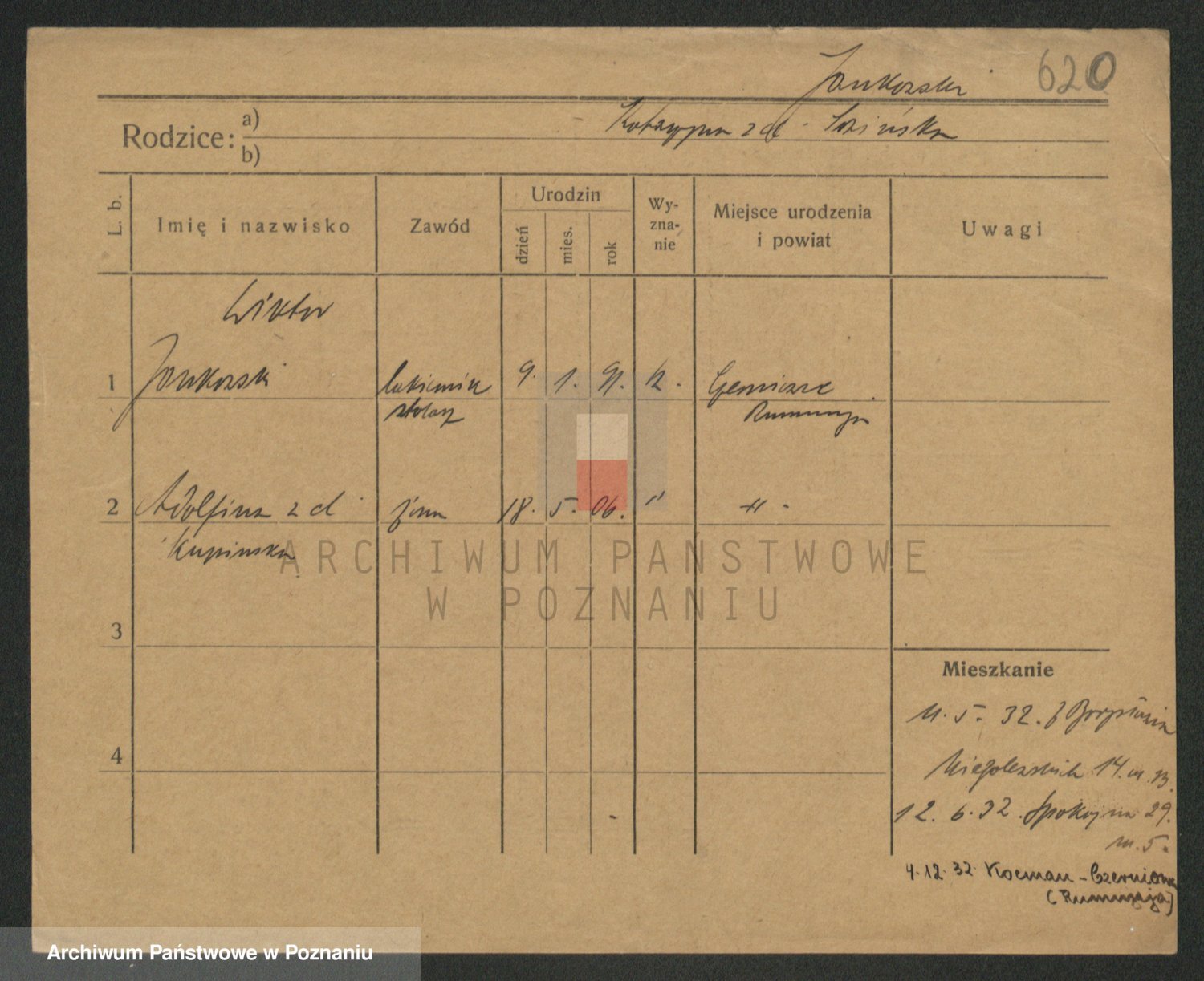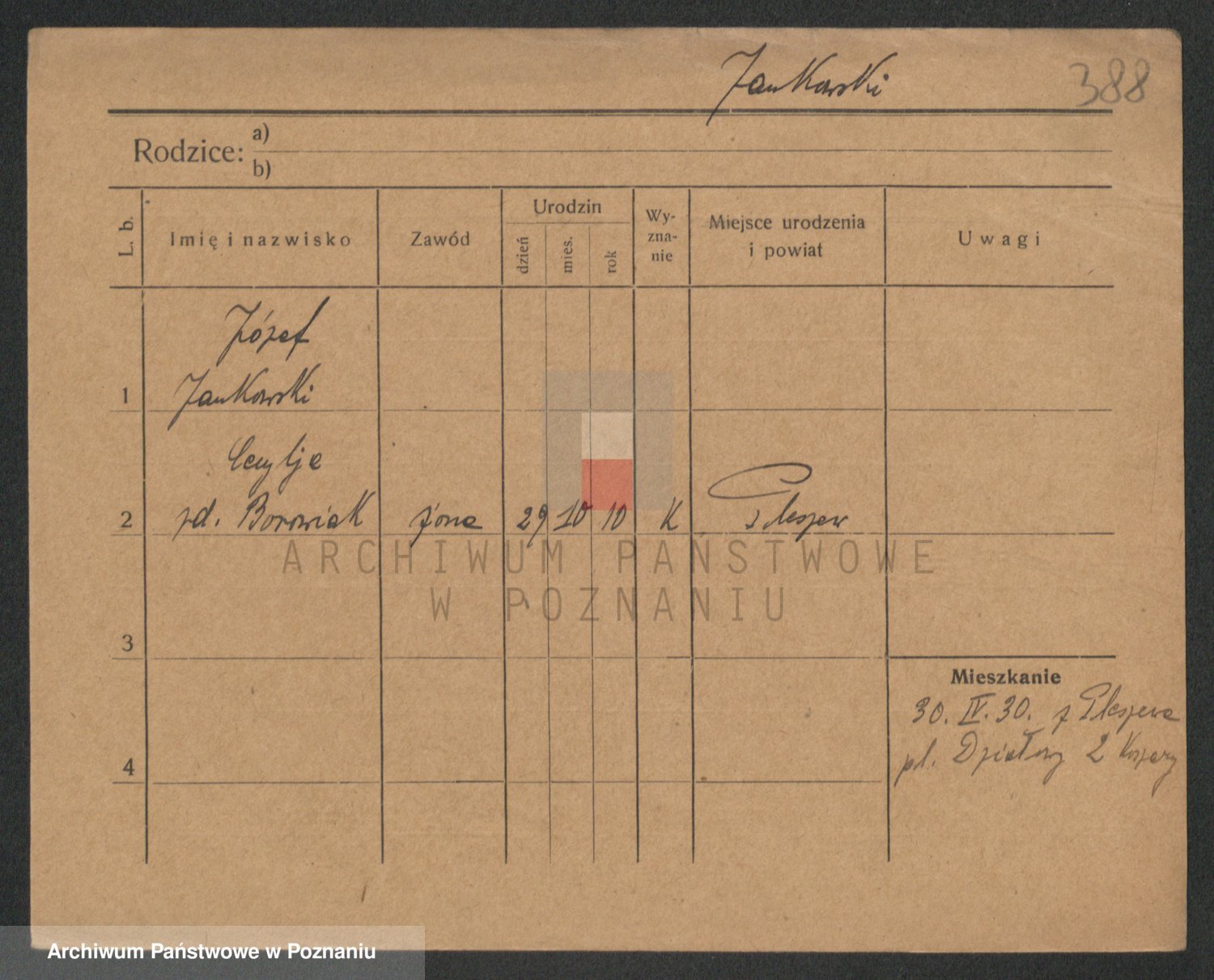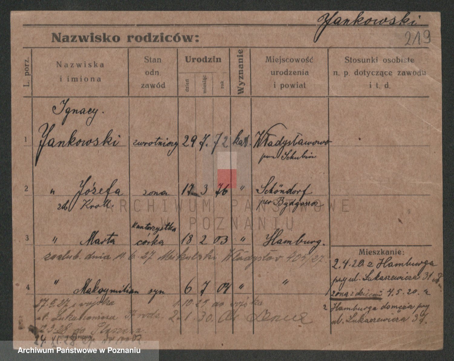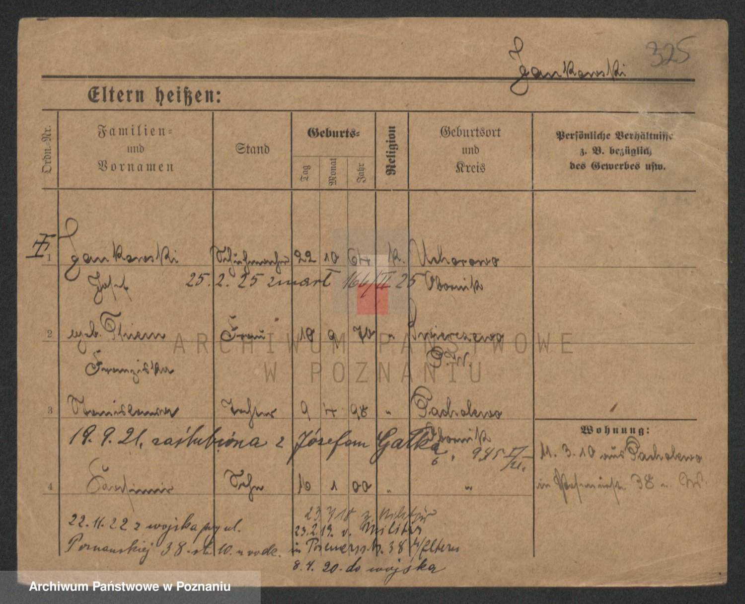 Podgląd karty osobowej dostępny jest po kliknięciu na nazwisko lub ikonkę karty. Można dokonywać powiększenia (ikony na górze) lub przechodzić między kolejnymi skanami (strzałki po bokach).