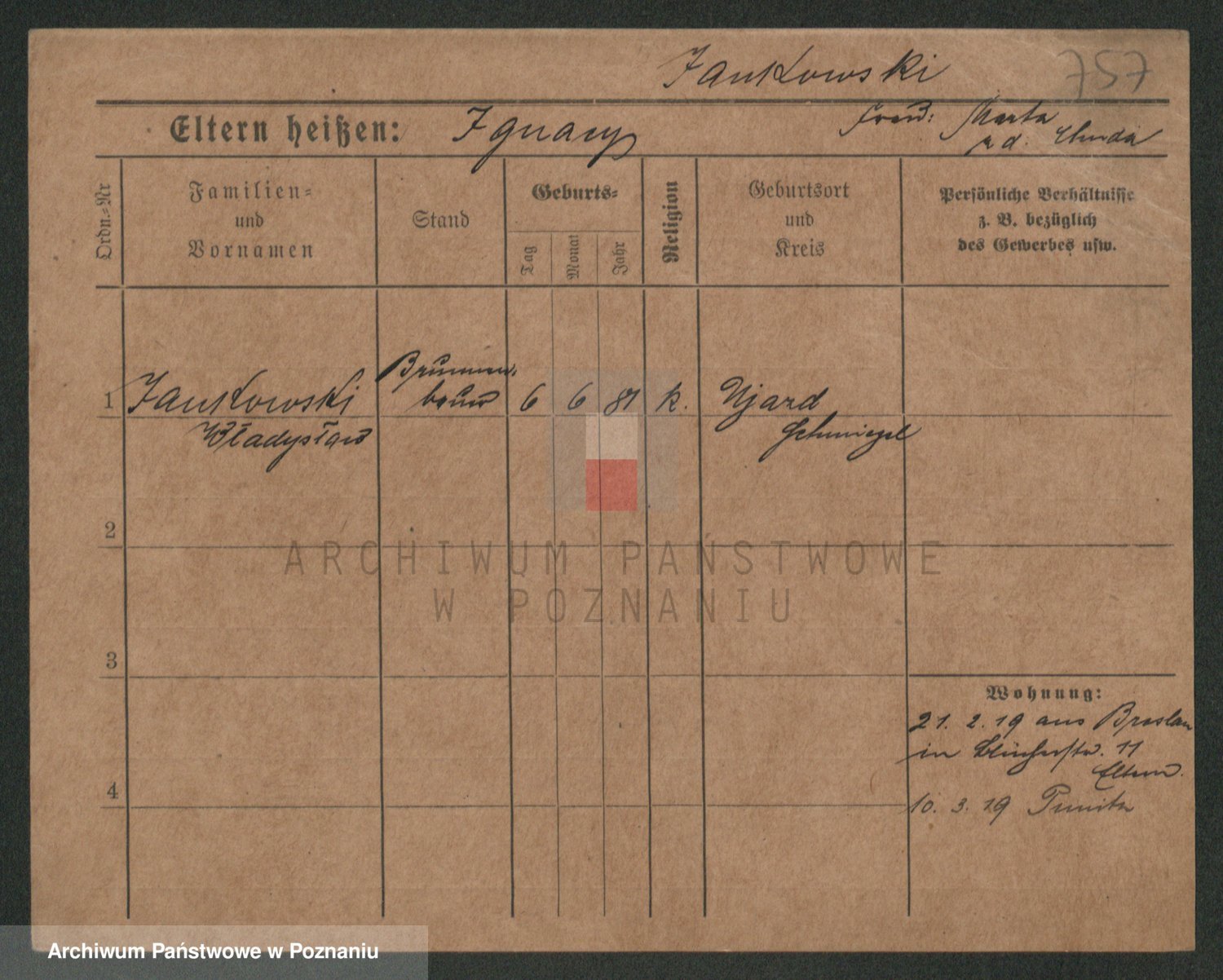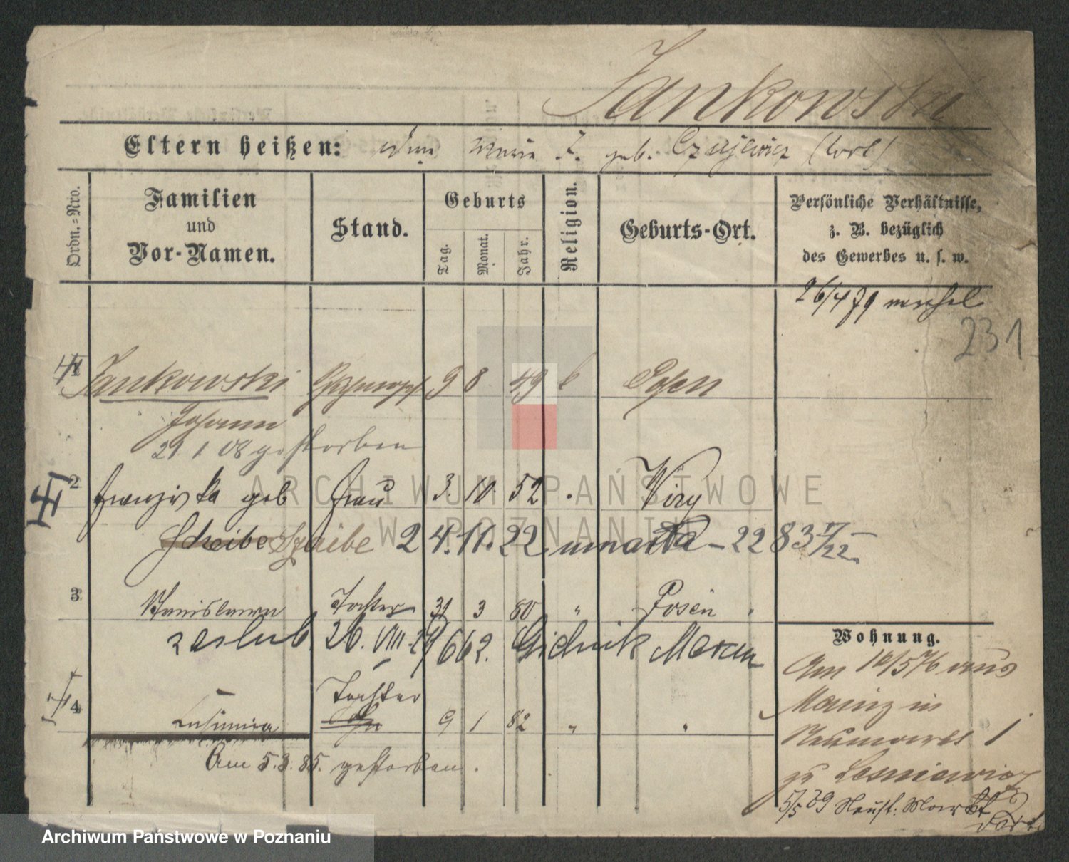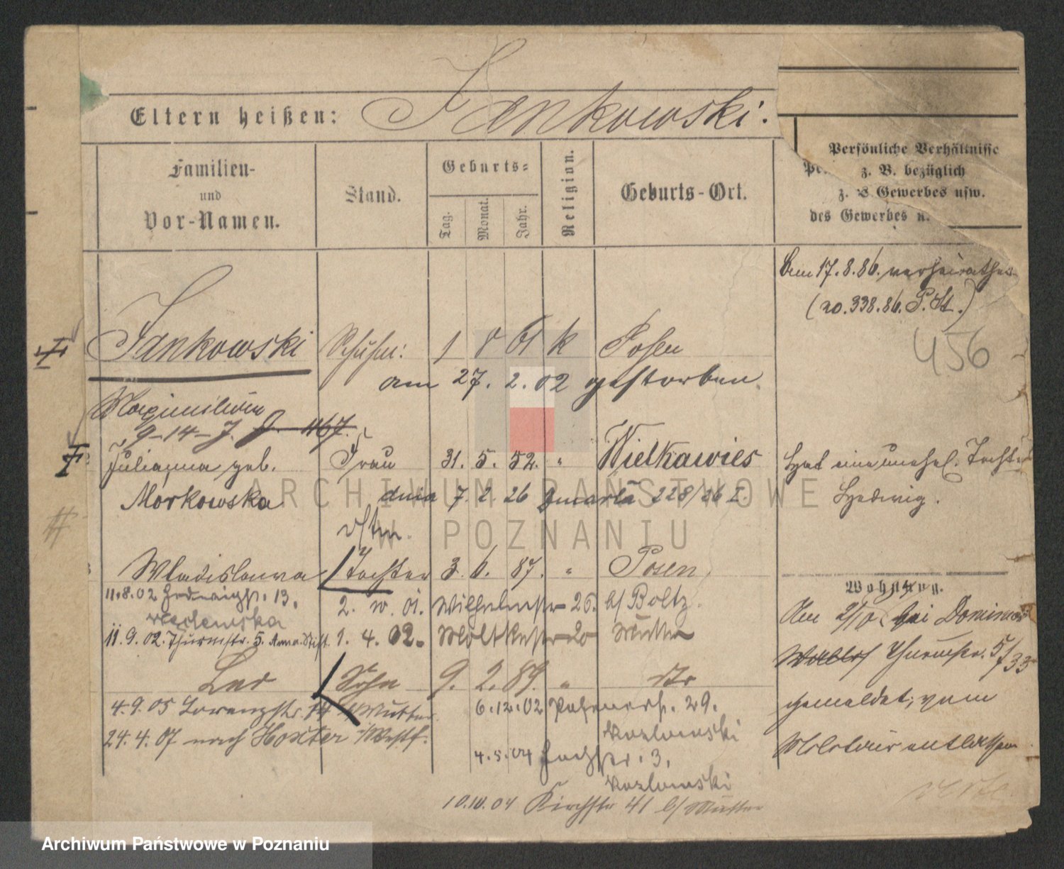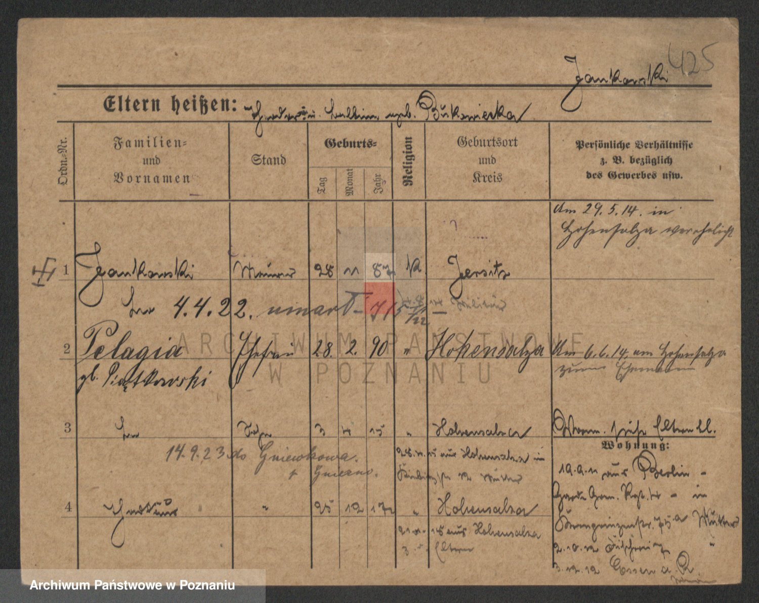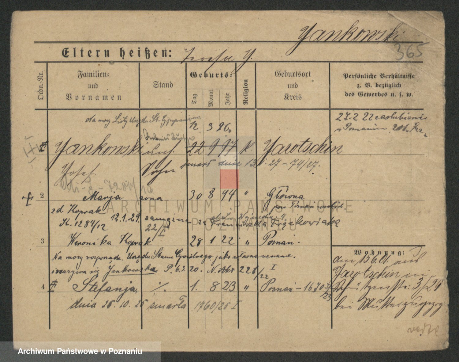 Podgląd karty osobowej dostępny jest po kliknięciu na nazwisko lub ikonkę karty. Można dokonywać powiększenia (ikony na górze) lub przechodzić między kolejnymi skanami (strzałki po bokach).