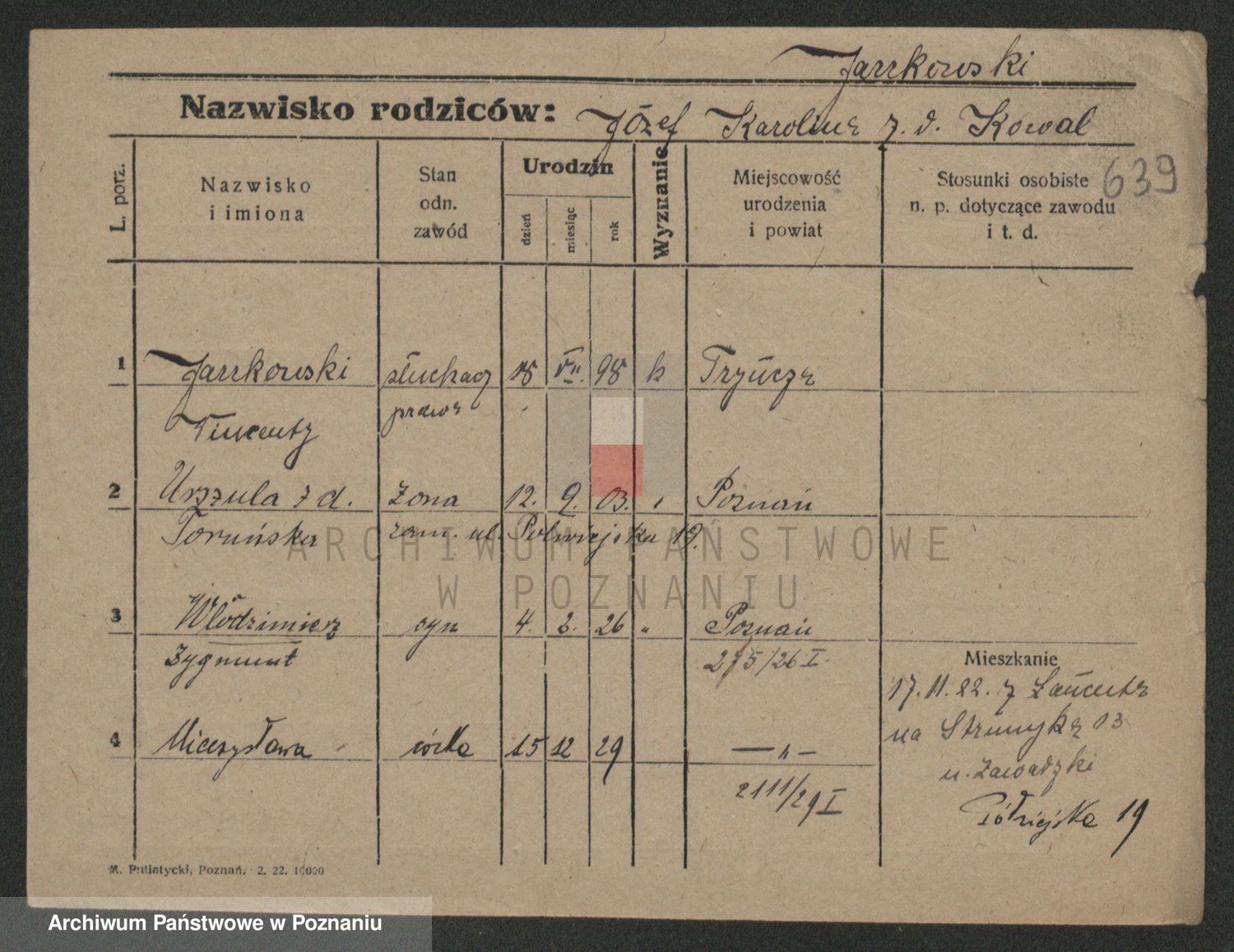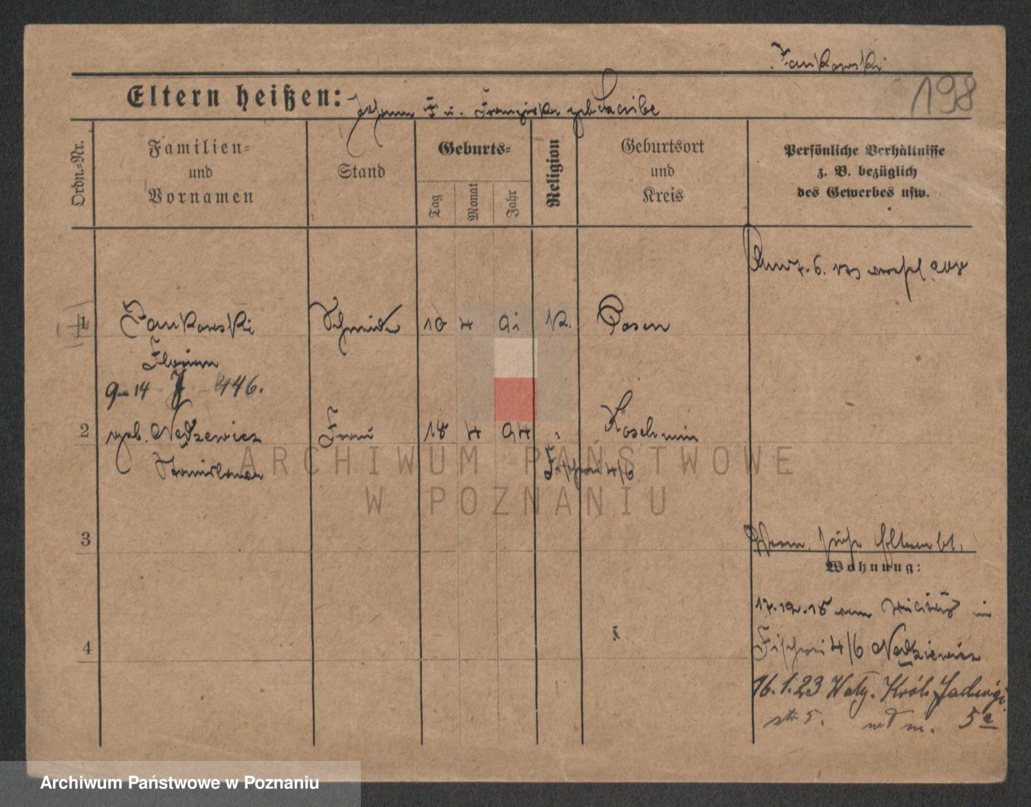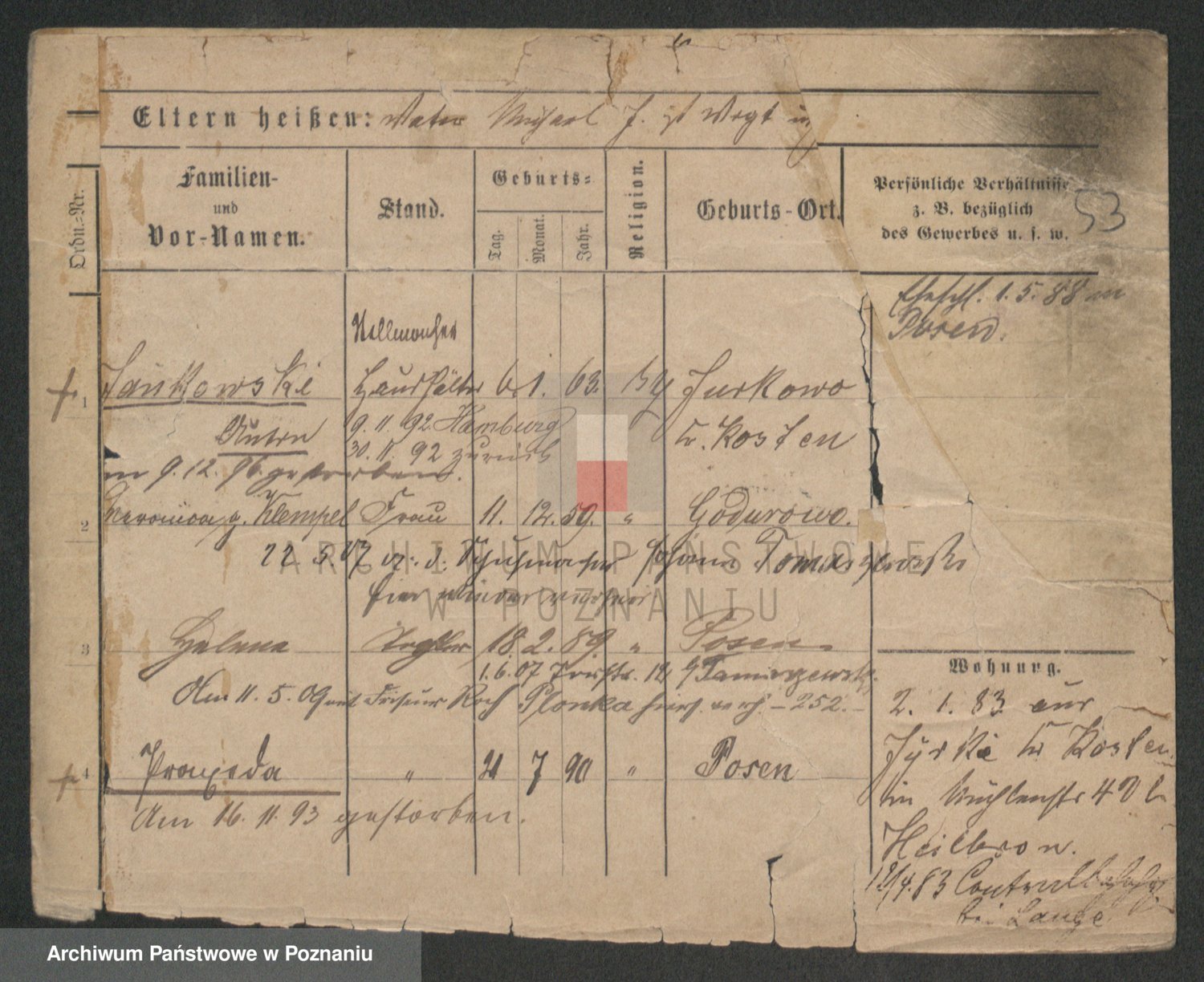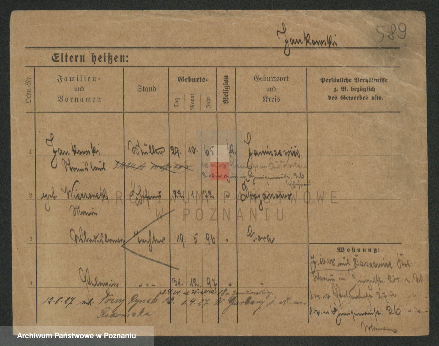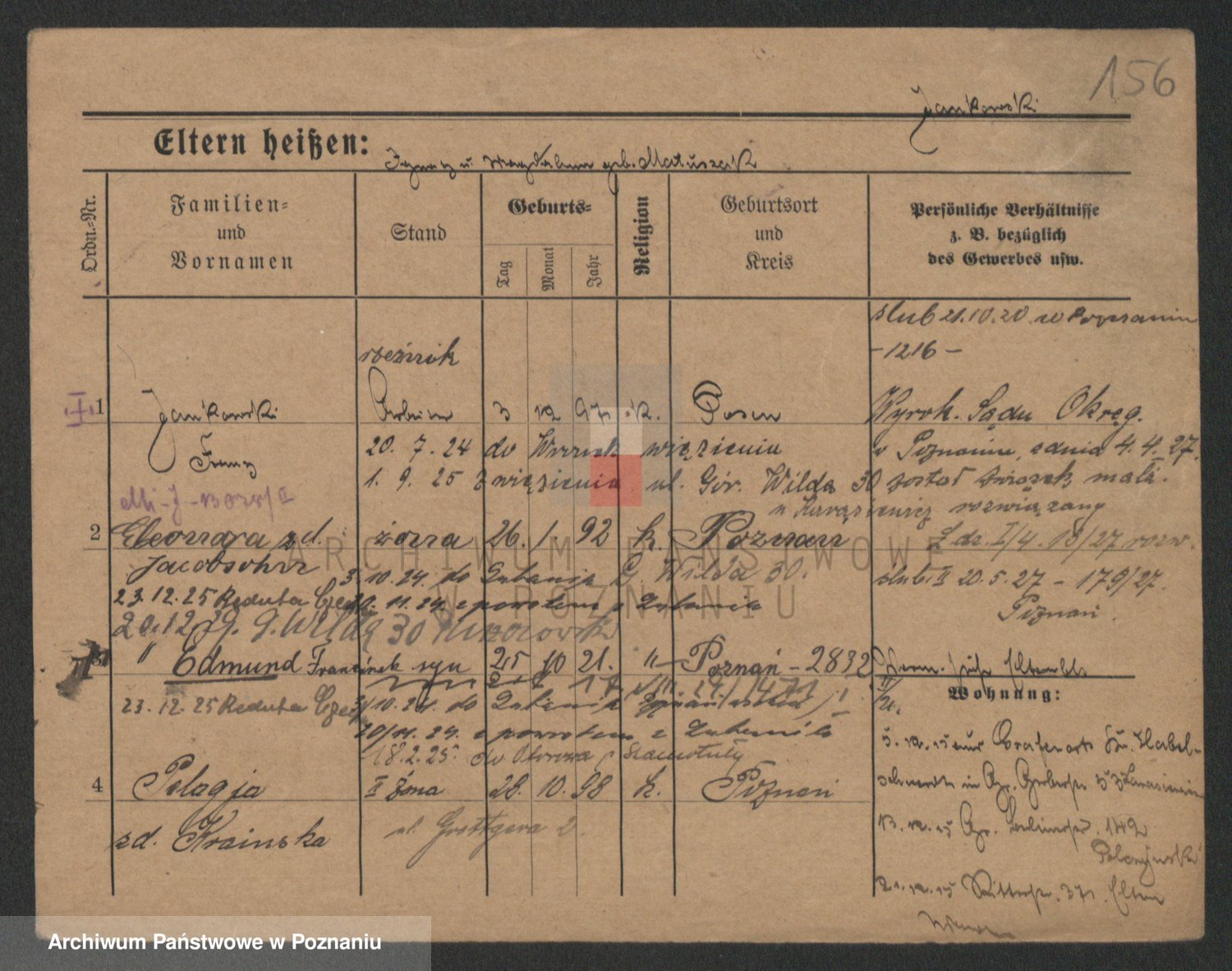 Podgląd karty osobowej dostępny jest po kliknięciu na nazwisko lub ikonkę karty. Można dokonywać powiększenia (ikony na górze) lub przechodzić między kolejnymi skanami (strzałki po bokach).