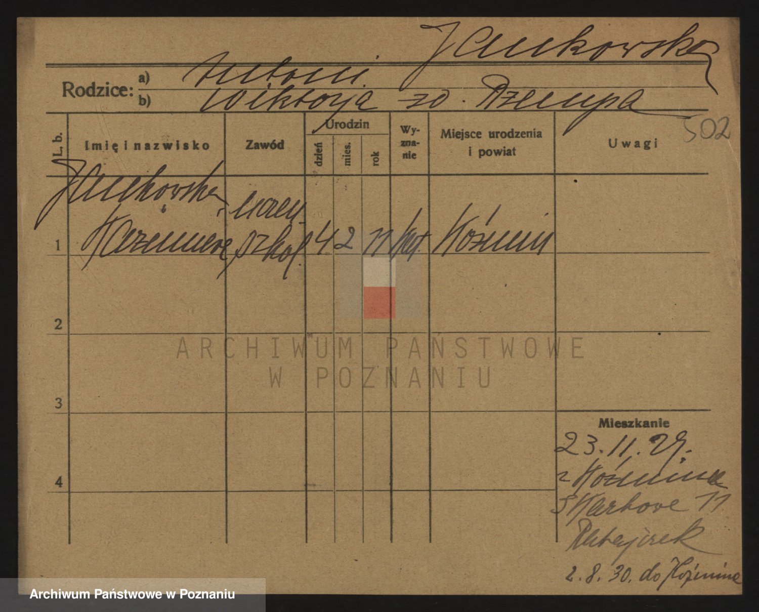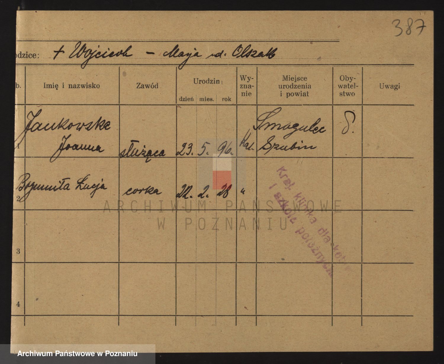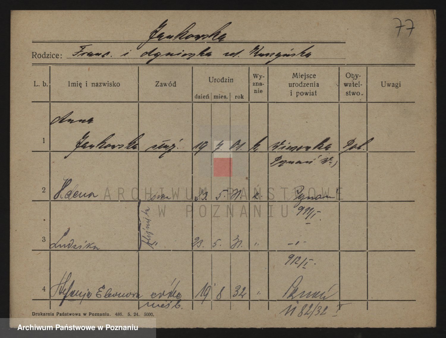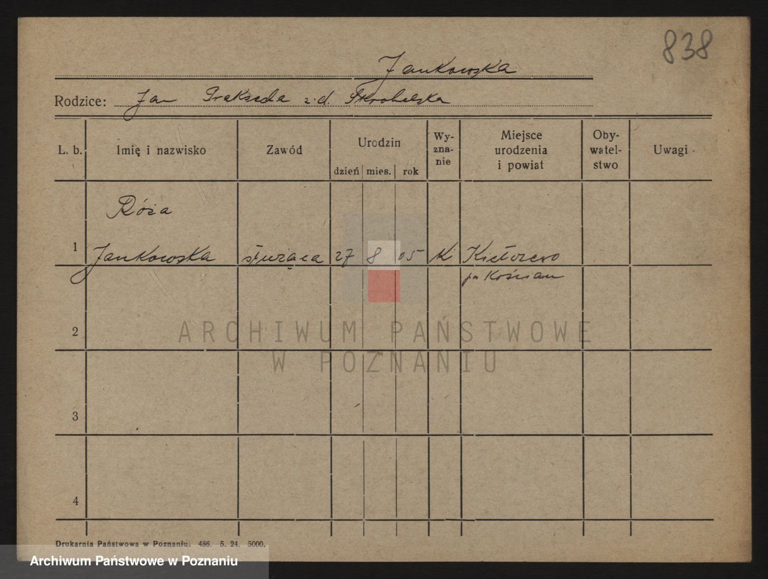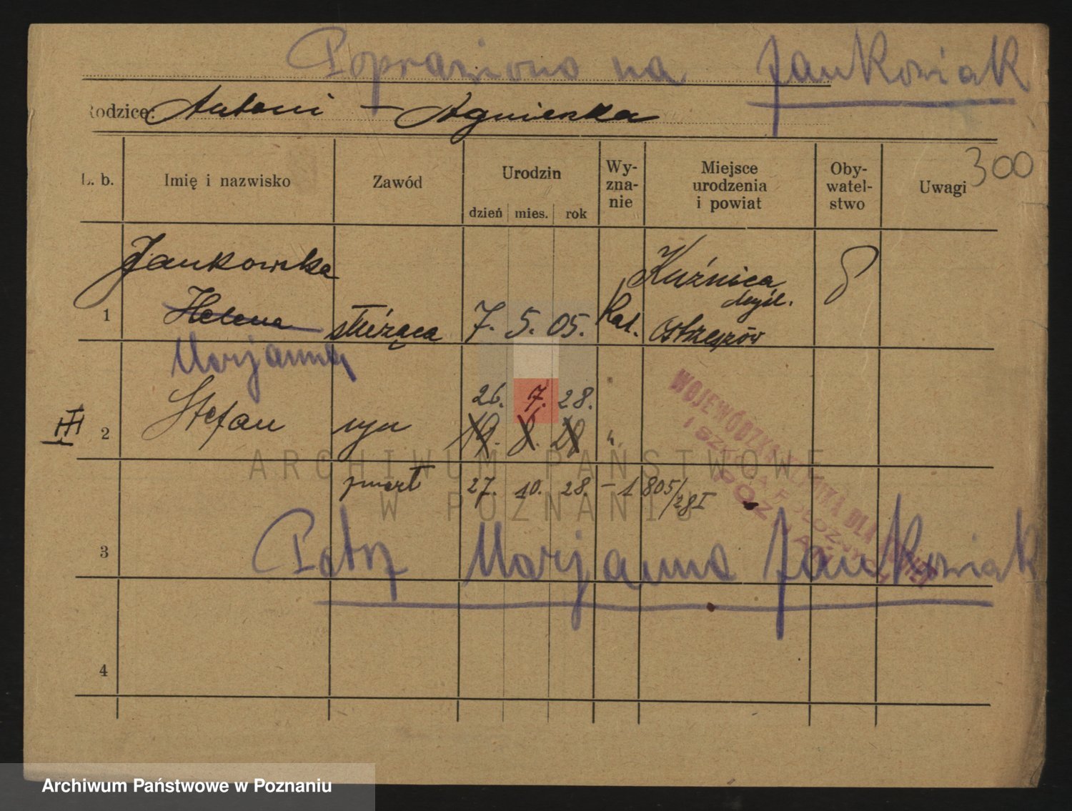 Podgląd karty osobowej dostępny jest po kliknięciu na nazwisko lub ikonkę karty. Można dokonywać powiększenia (ikony na górze) lub przechodzić między kolejnymi skanami (strzałki po bokach).