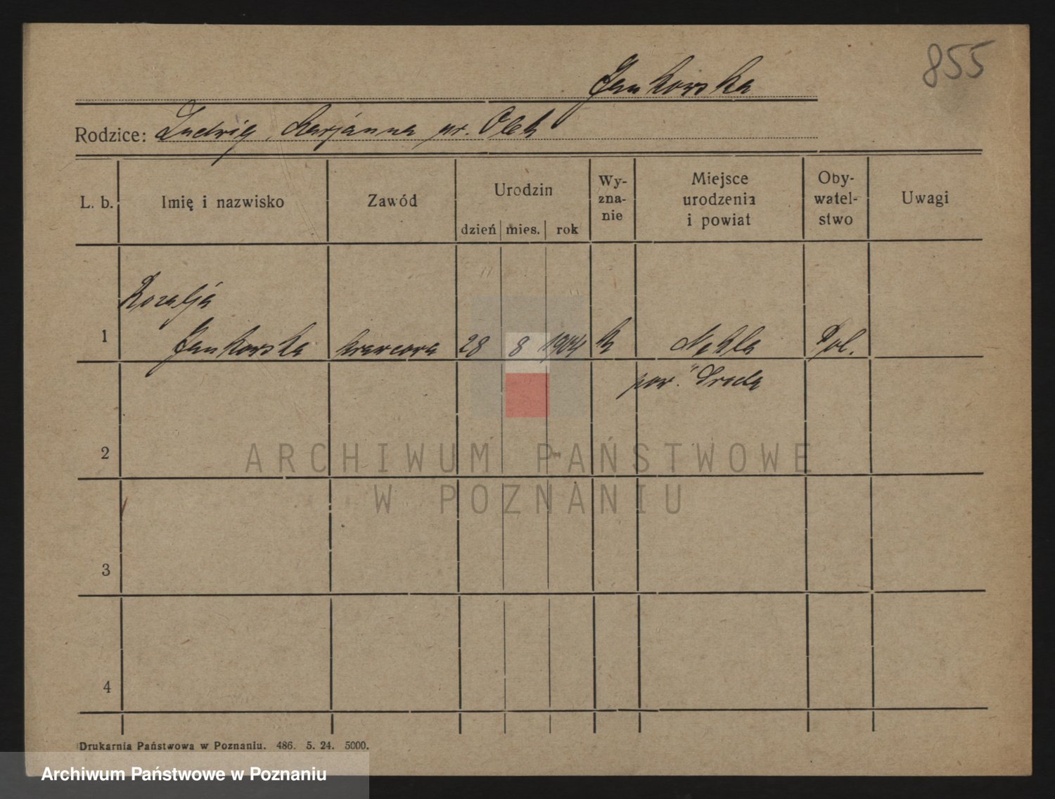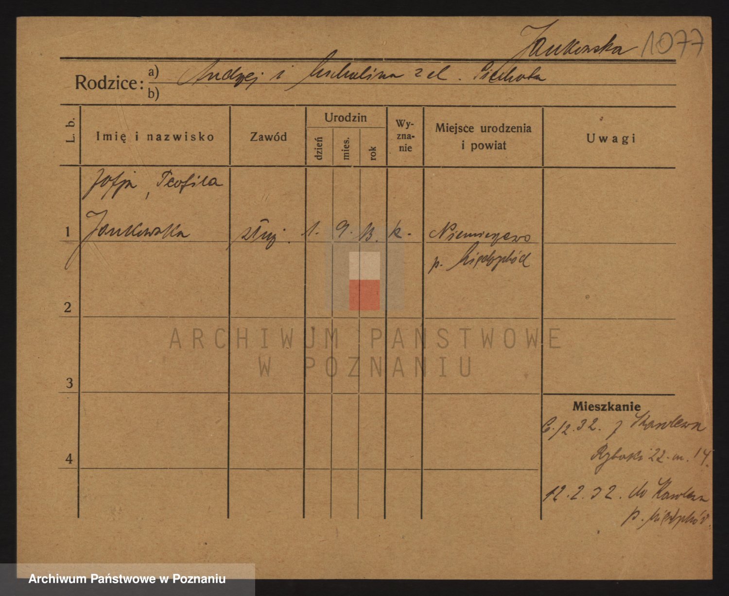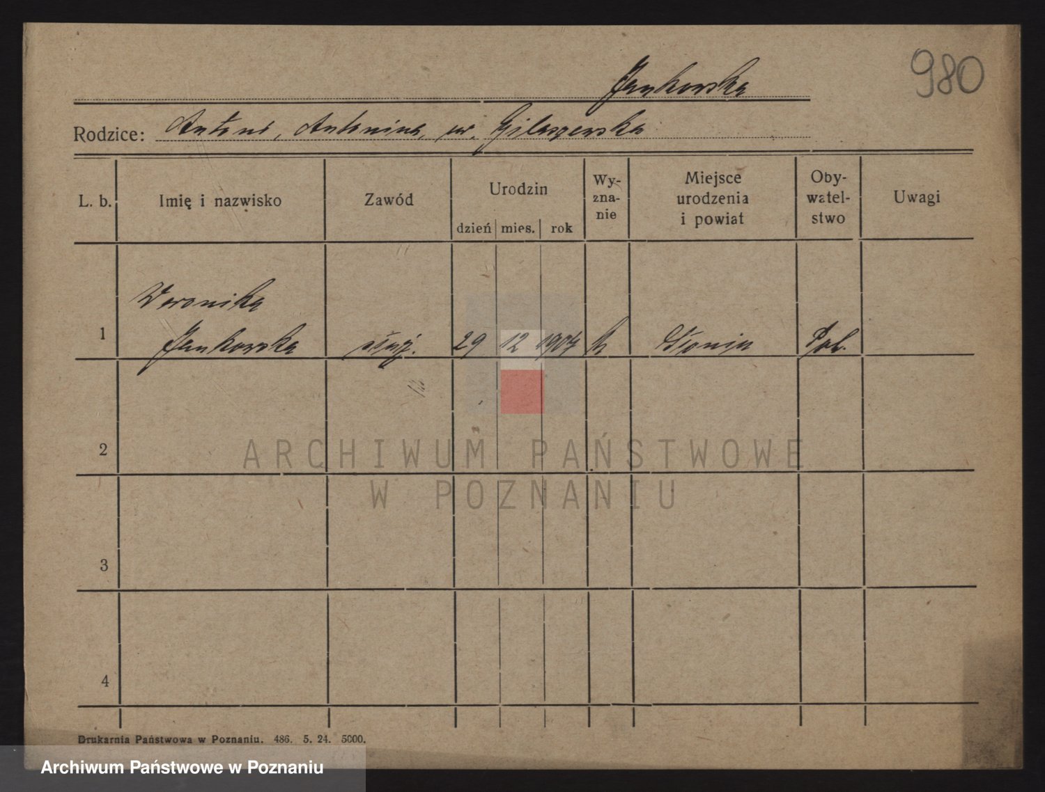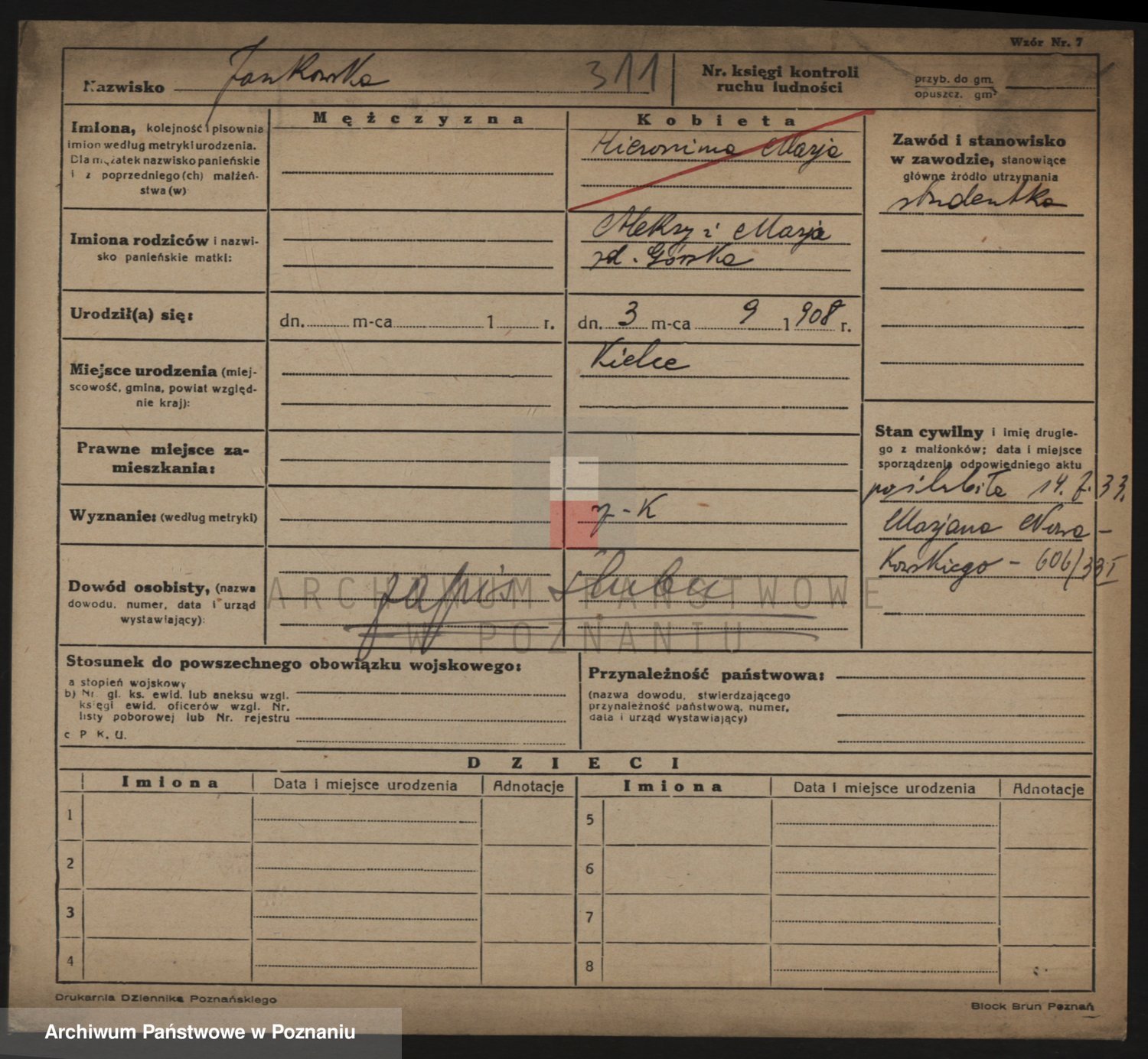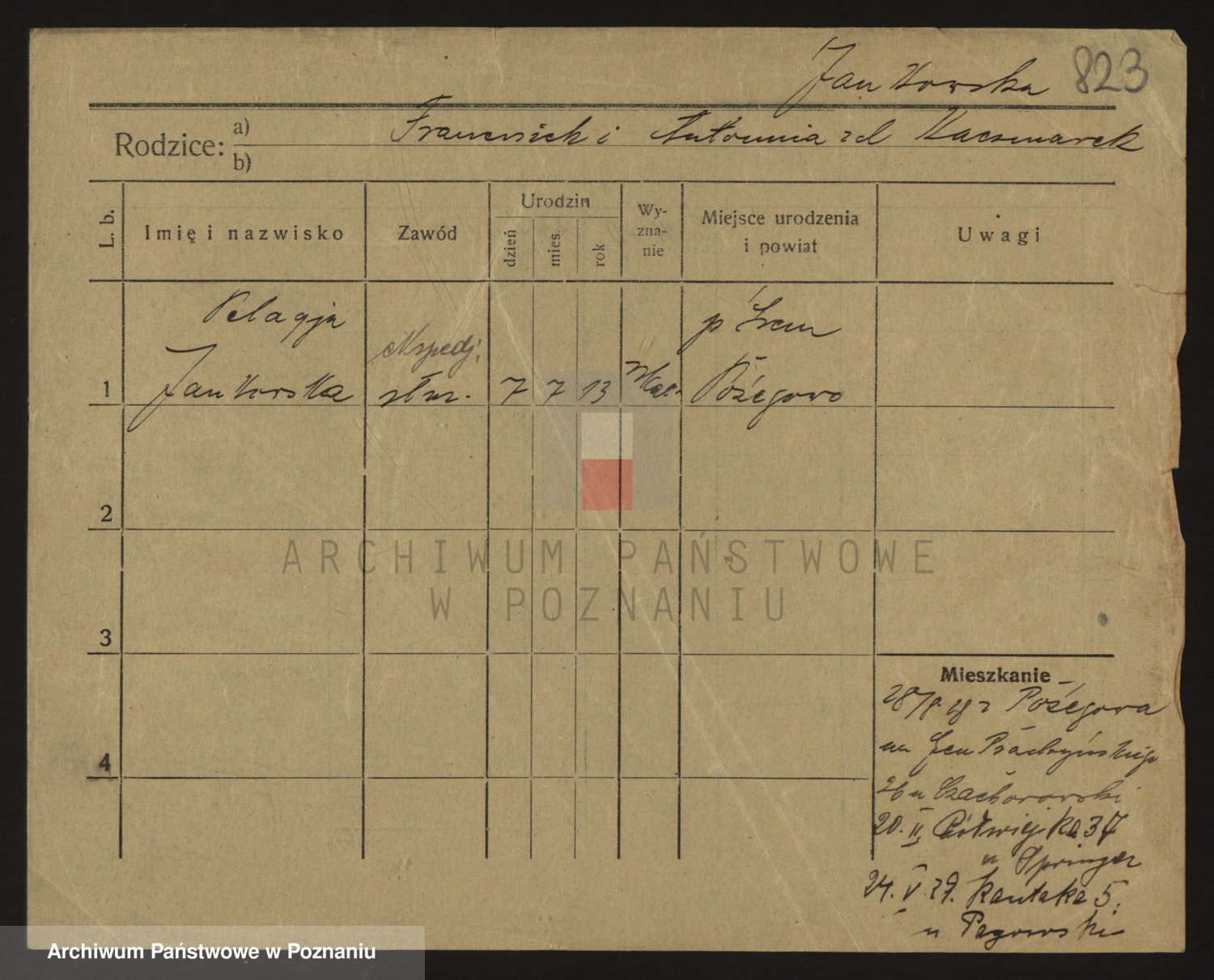 Podgląd karty osobowej dostępny jest po kliknięciu na nazwisko lub ikonkę karty. Można dokonywać powiększenia (ikony na górze) lub przechodzić między kolejnymi skanami (strzałki po bokach).