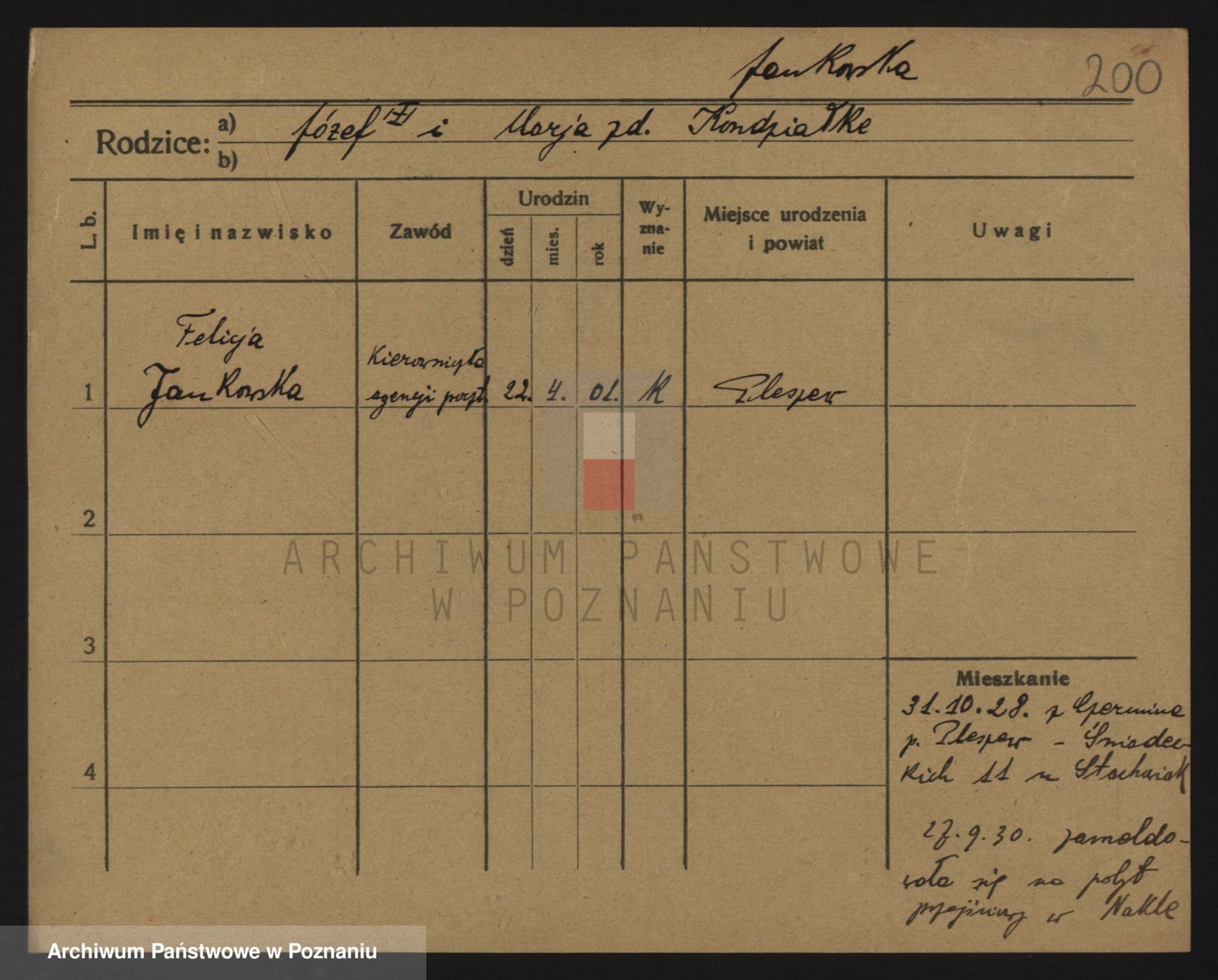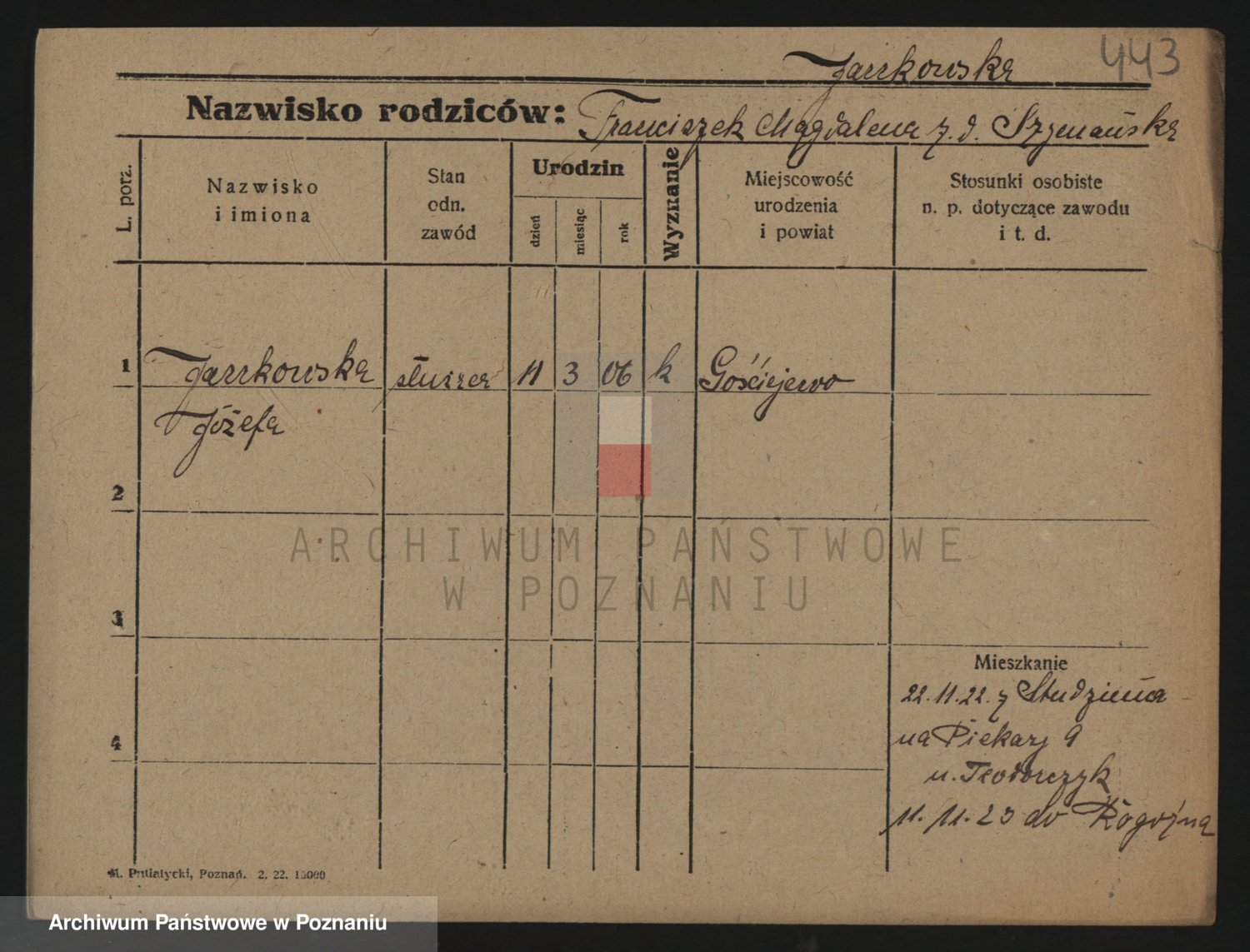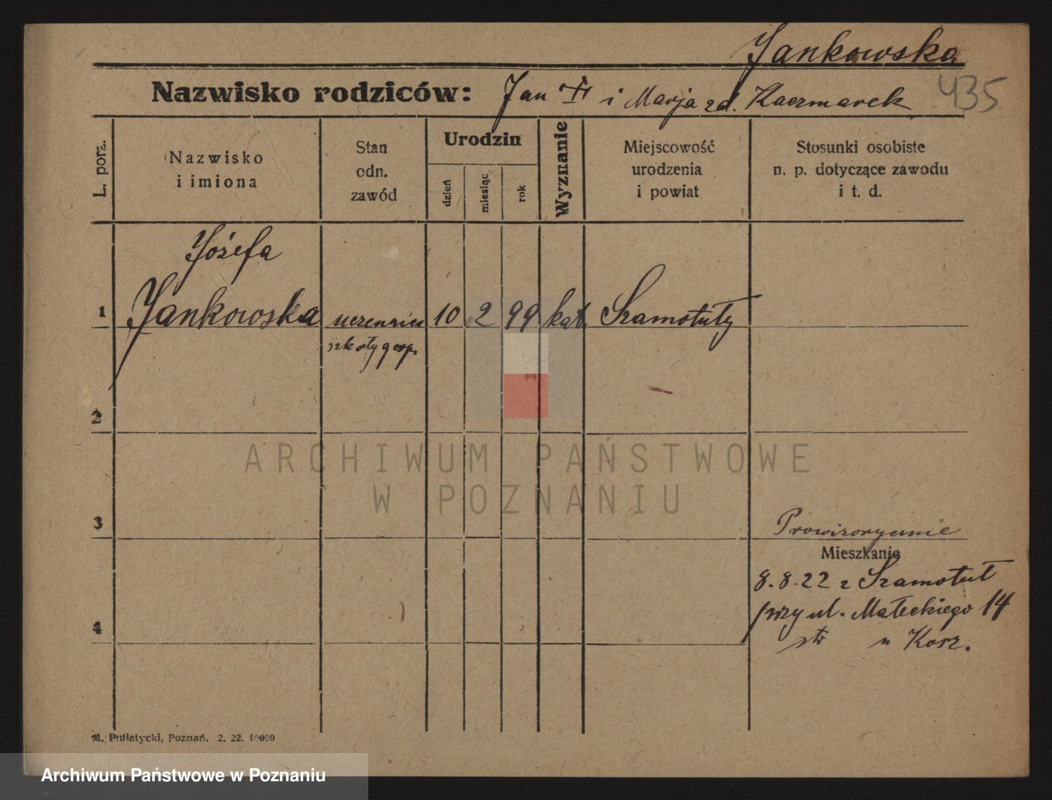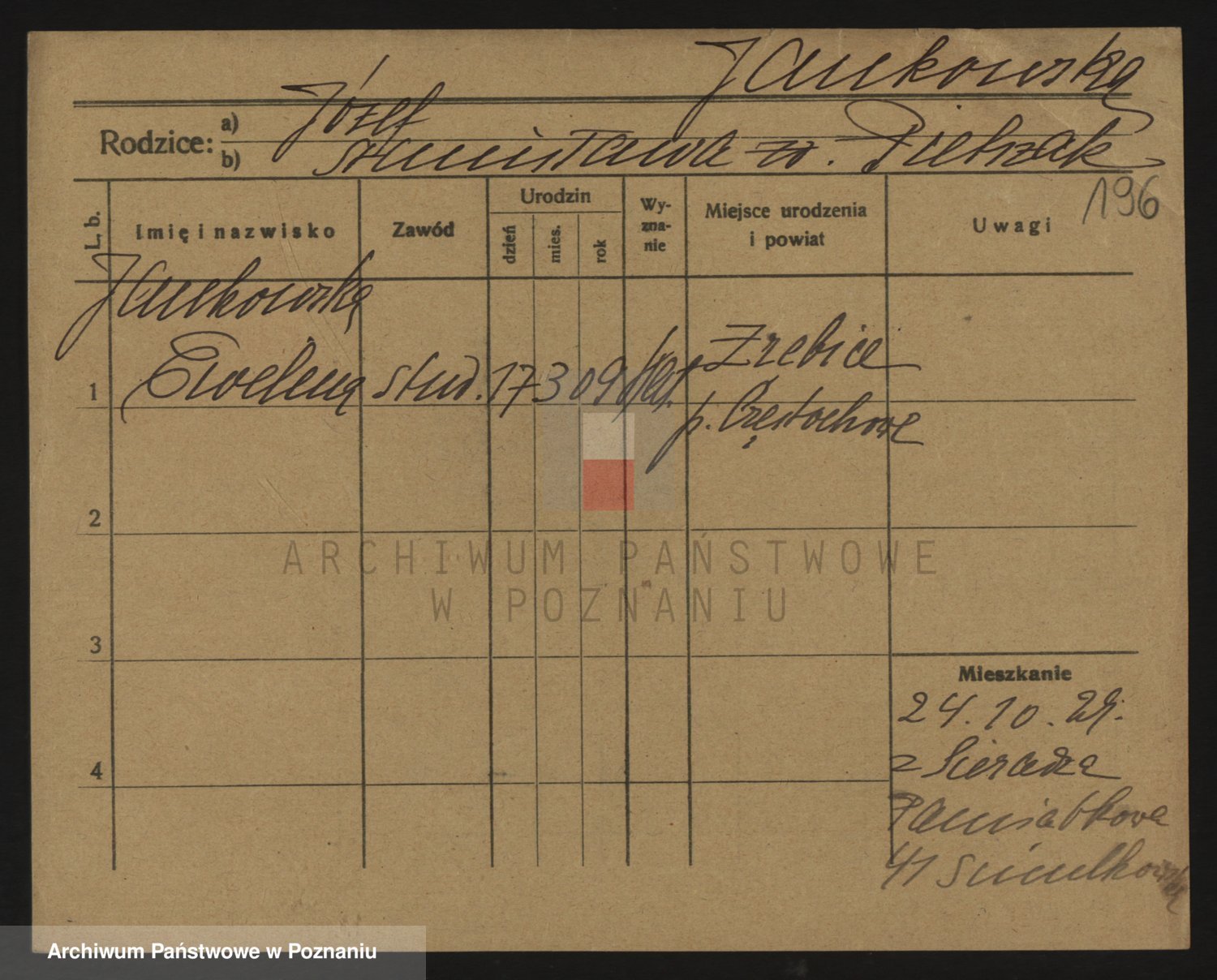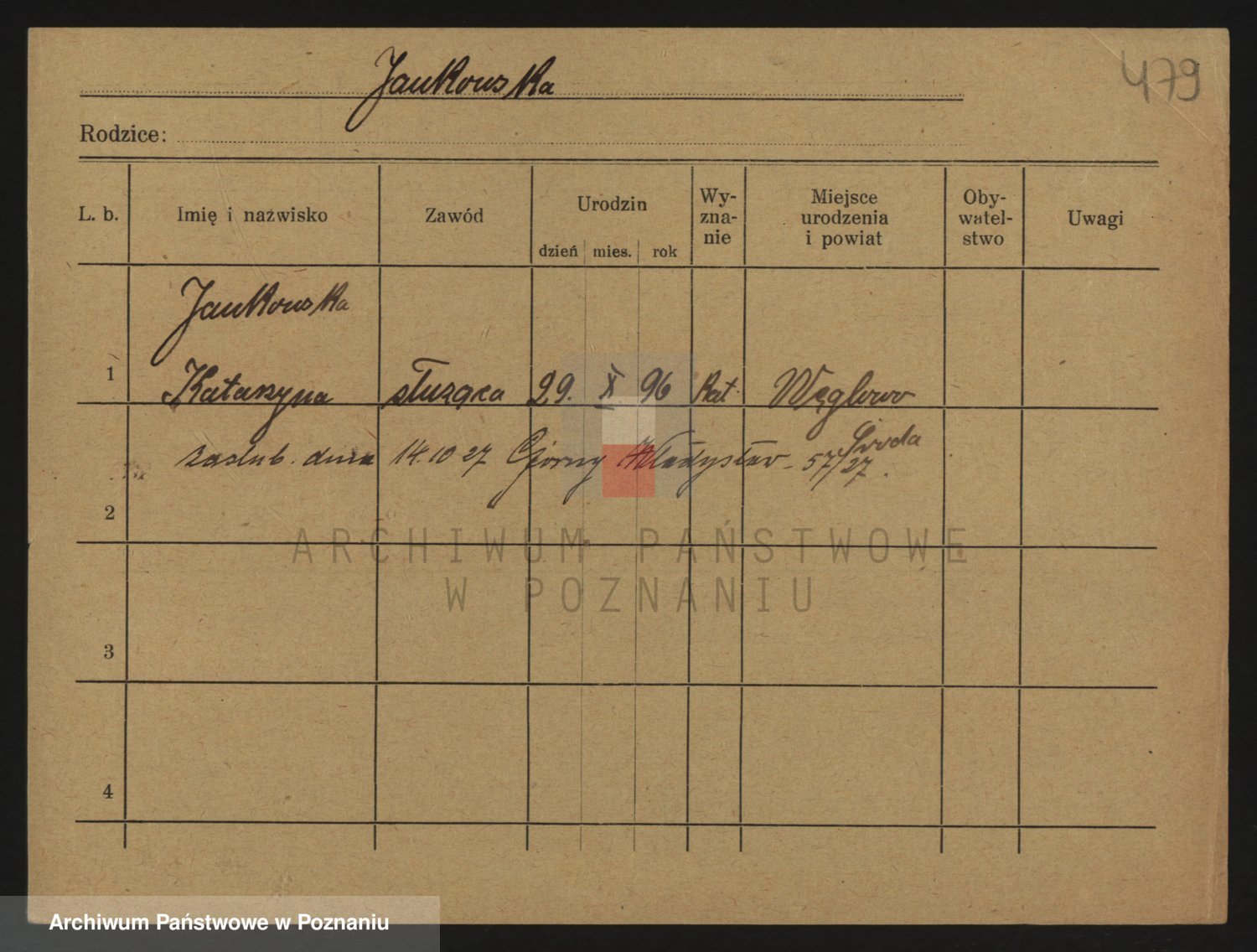 Podgląd karty osobowej dostępny jest po kliknięciu na nazwisko lub ikonkę karty. Można dokonywać powiększenia (ikony na górze) lub przechodzić między kolejnymi skanami (strzałki po bokach).