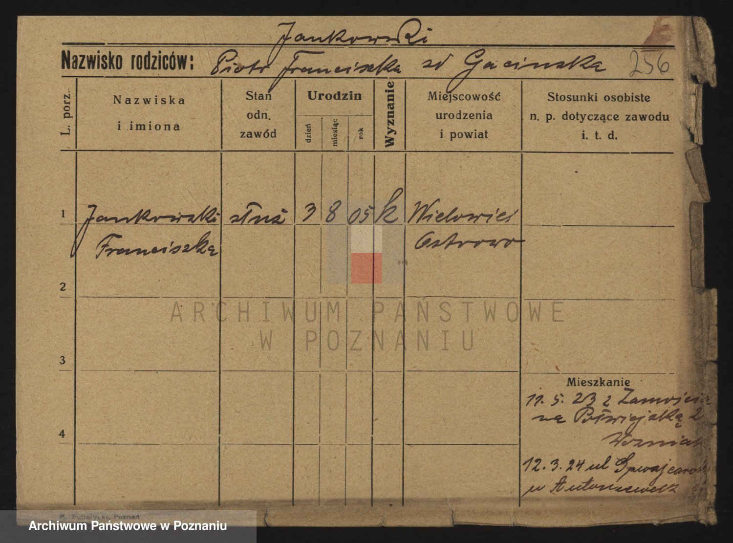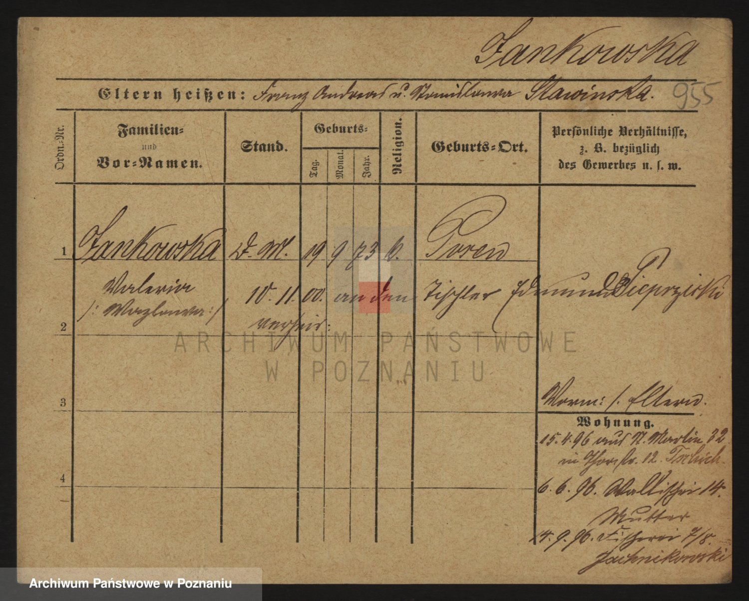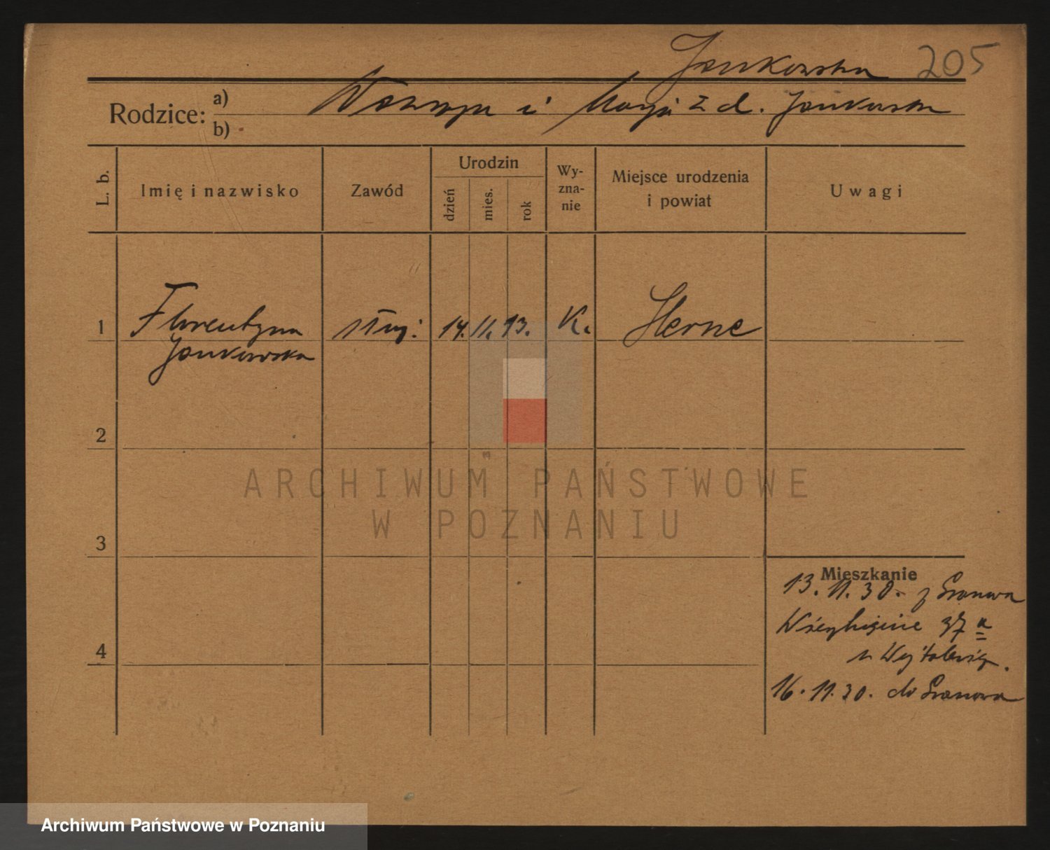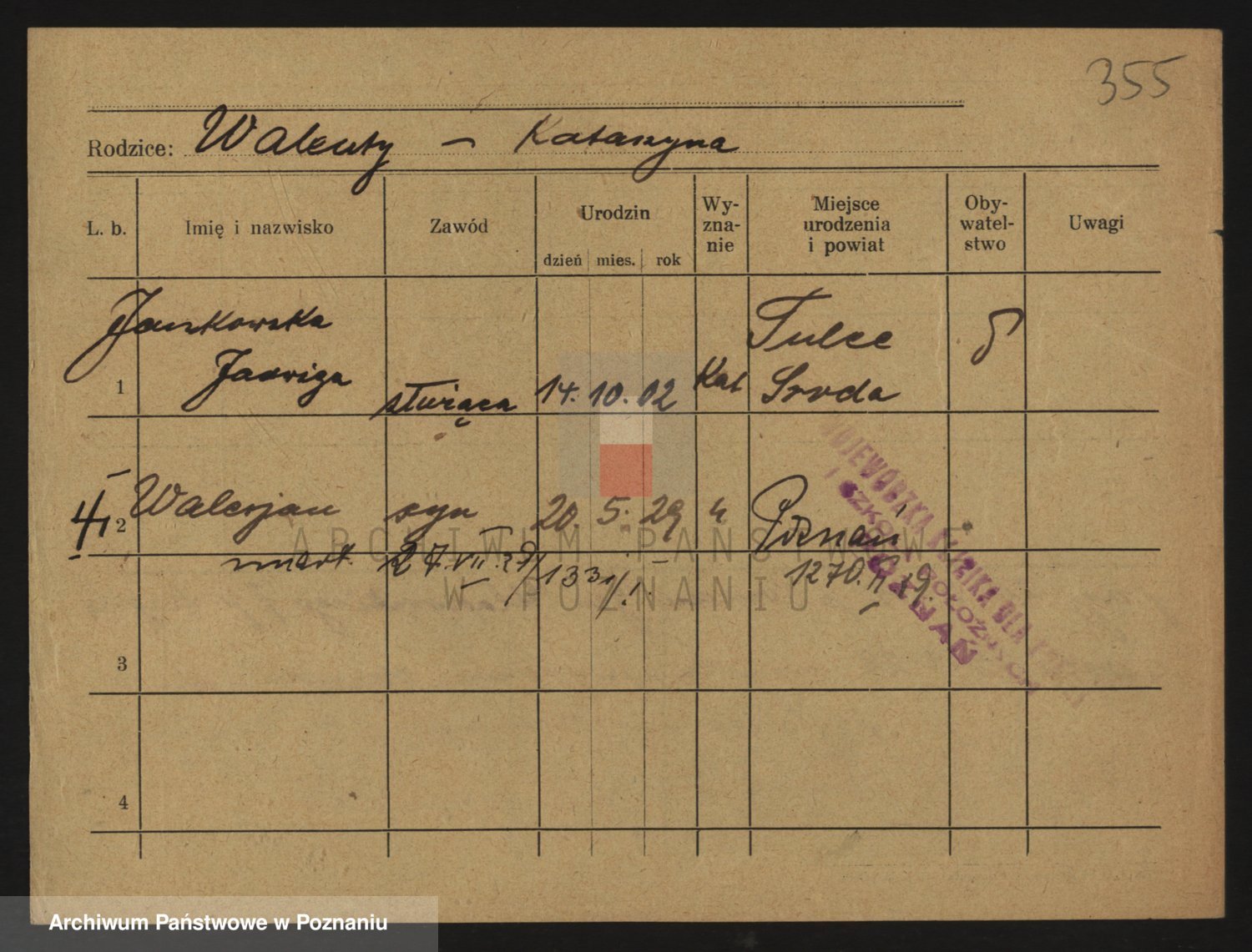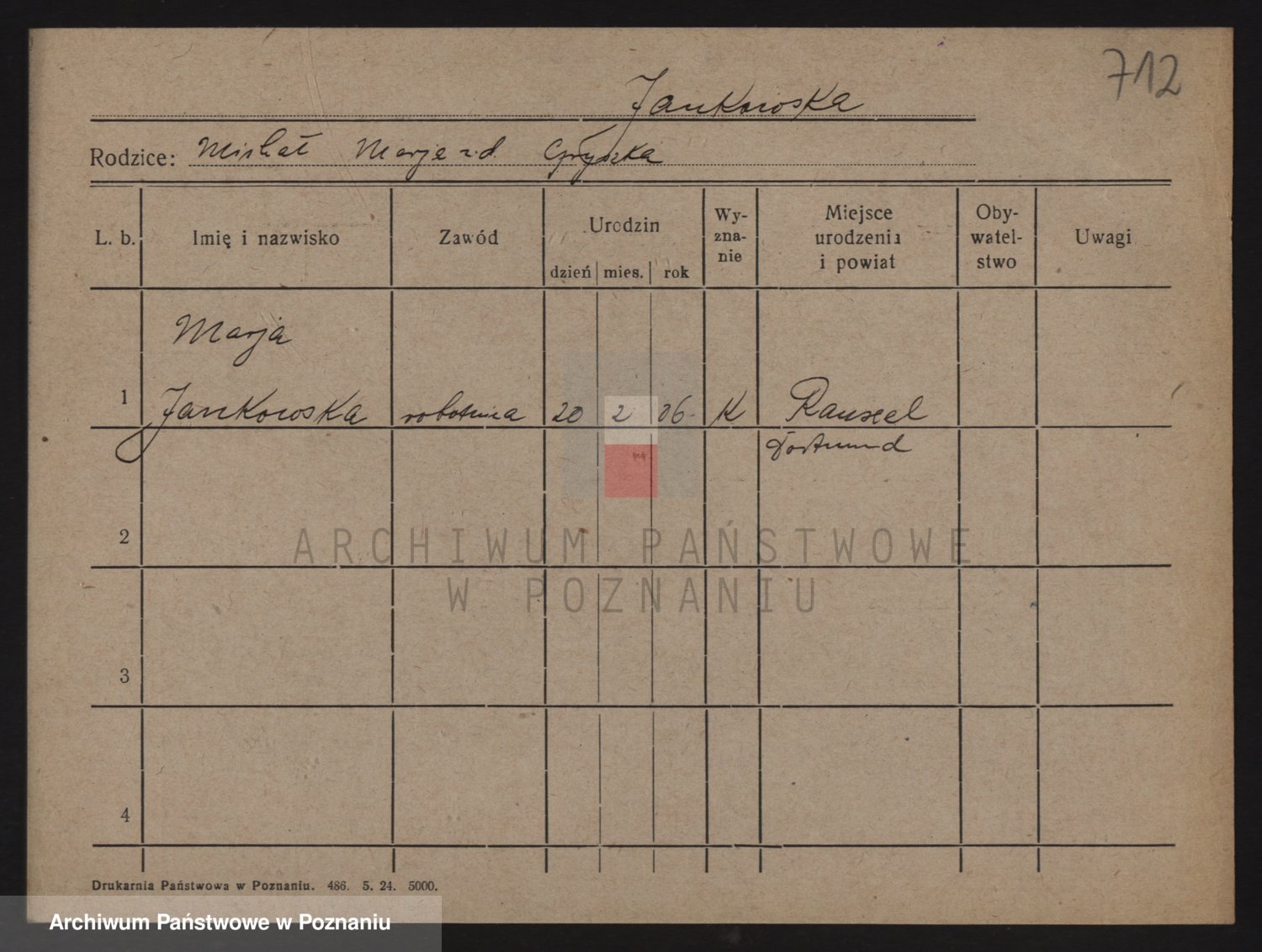 Podgląd karty osobowej dostępny jest po kliknięciu na nazwisko lub ikonkę karty. Można dokonywać powiększenia (ikony na górze) lub przechodzić między kolejnymi skanami (strzałki po bokach).