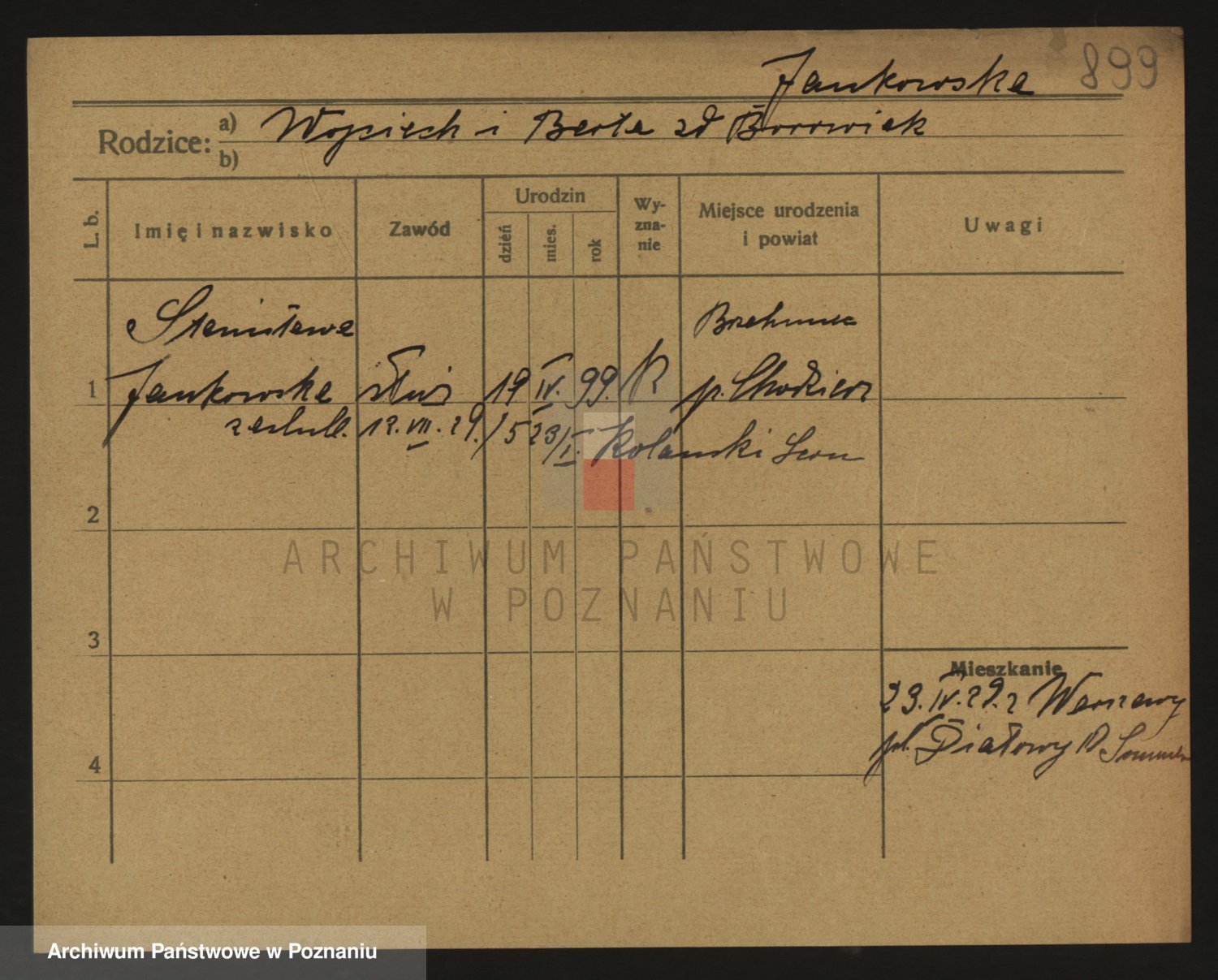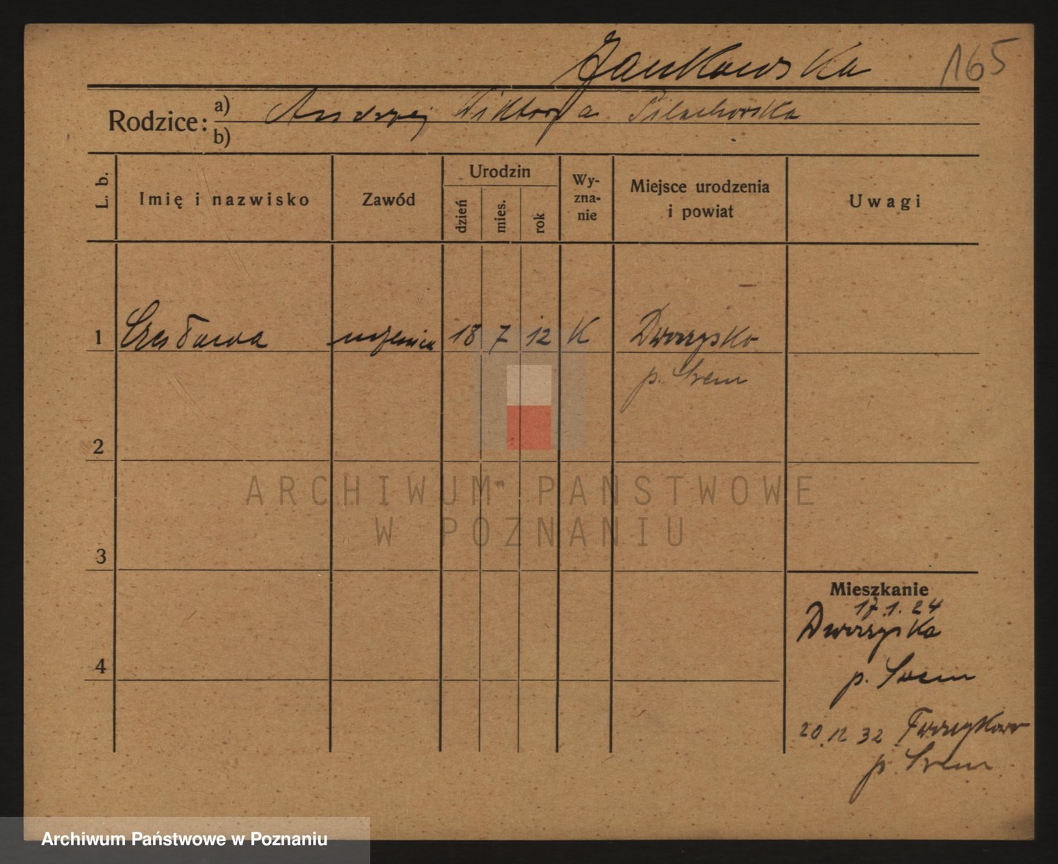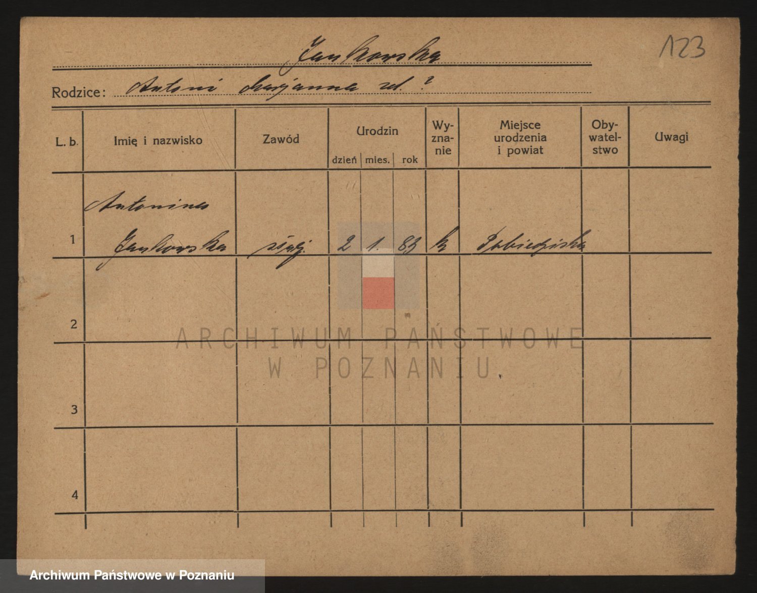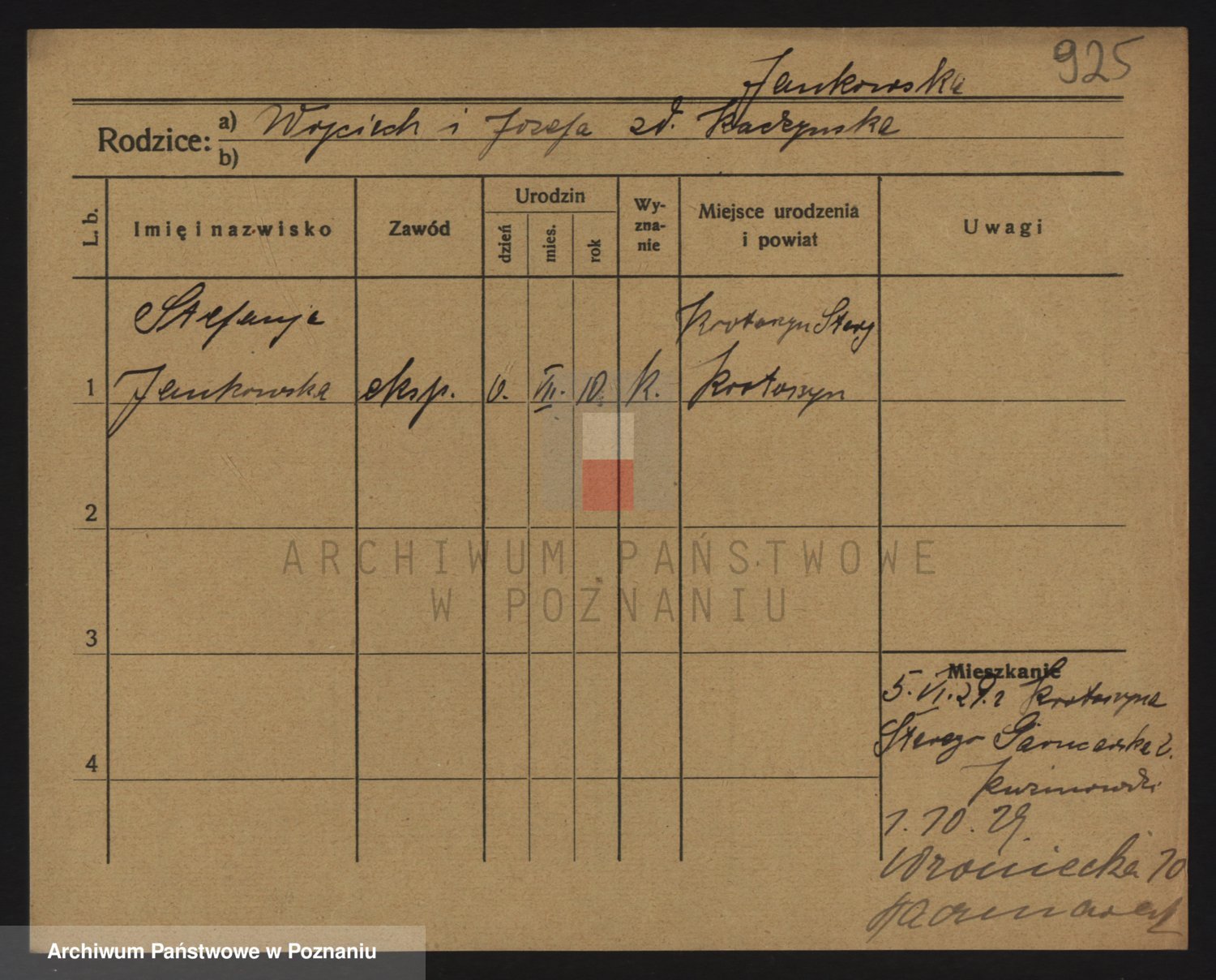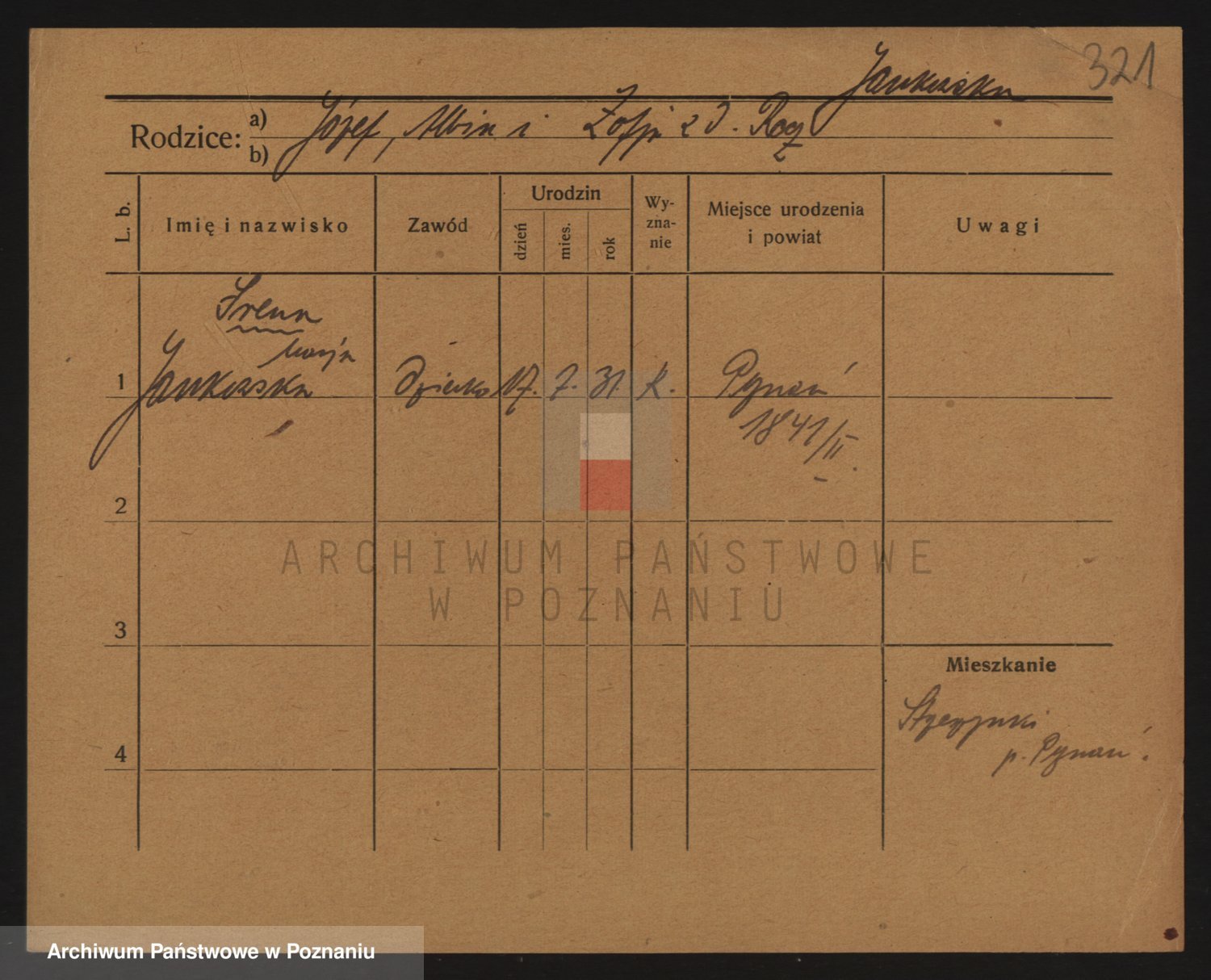 Podgląd karty osobowej dostępny jest po kliknięciu na nazwisko lub ikonkę karty. Można dokonywać powiększenia (ikony na górze) lub przechodzić między kolejnymi skanami (strzałki po bokach).