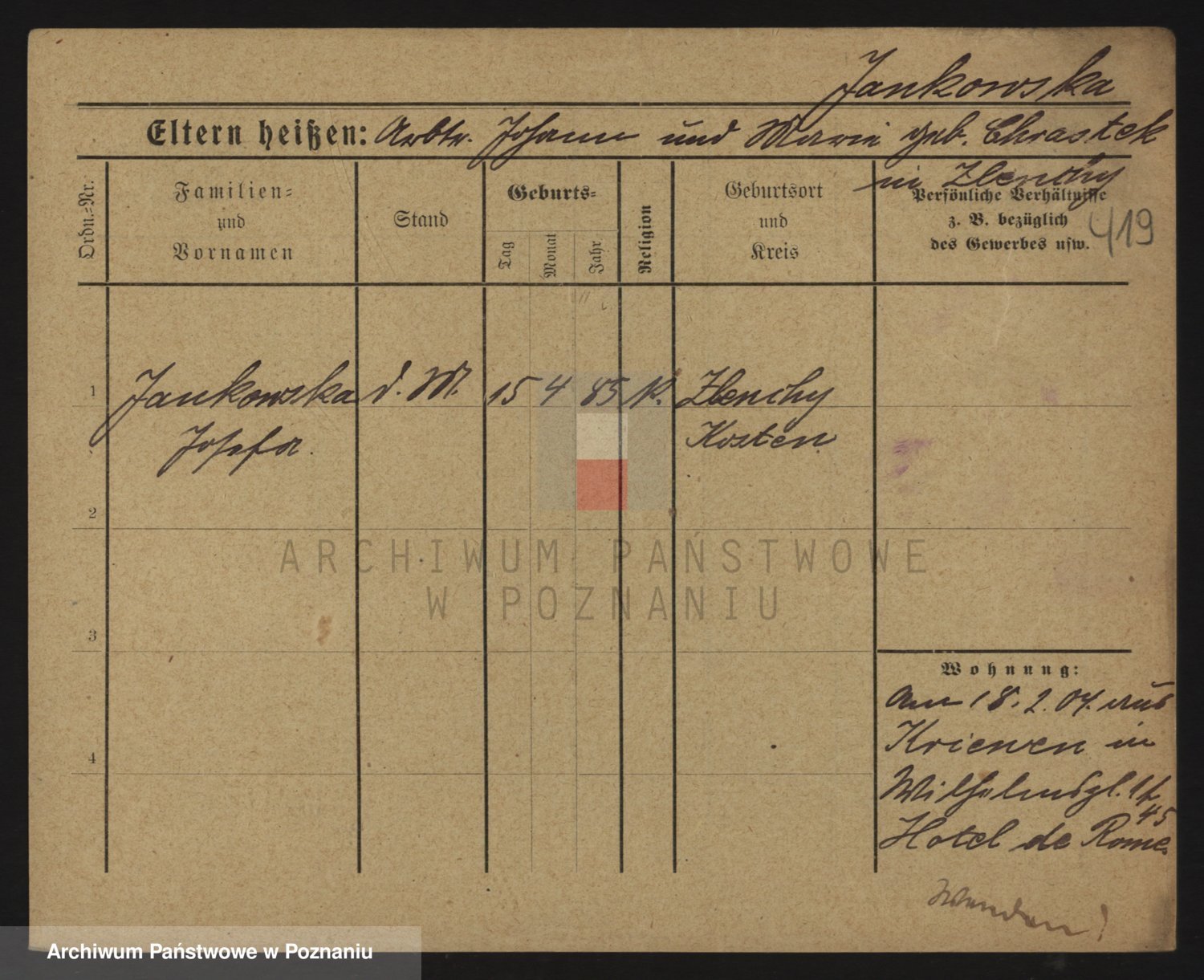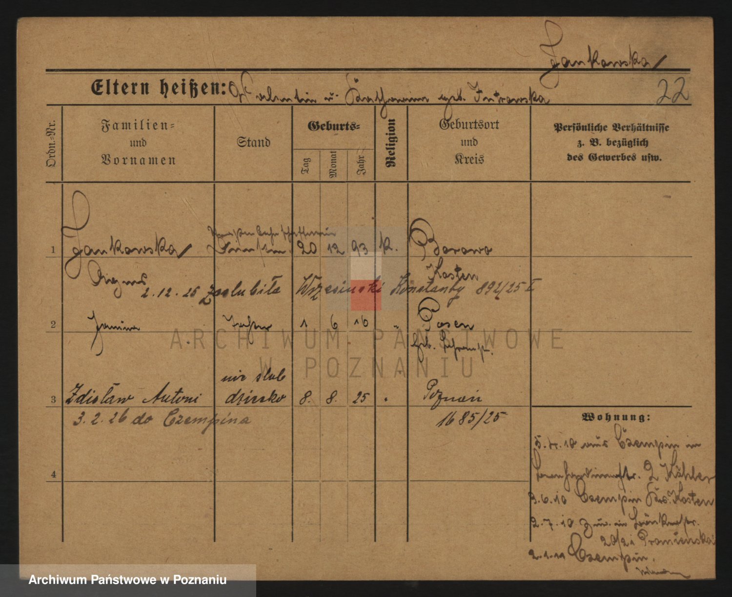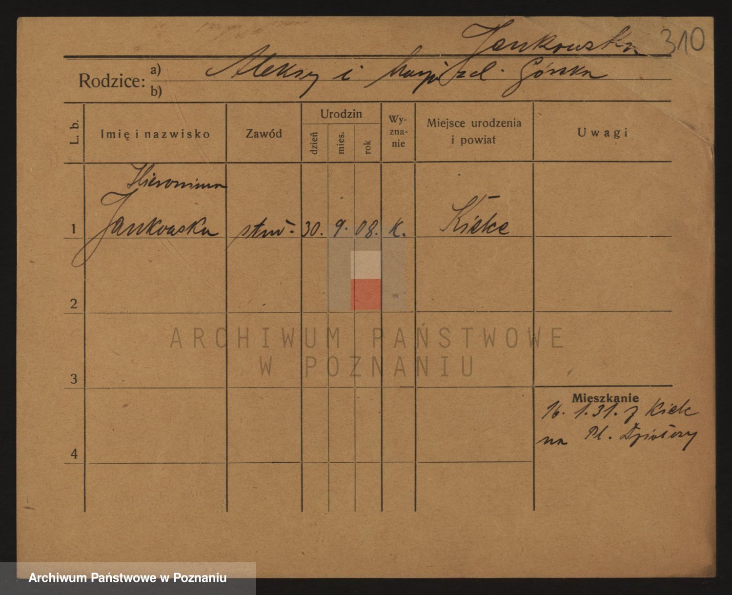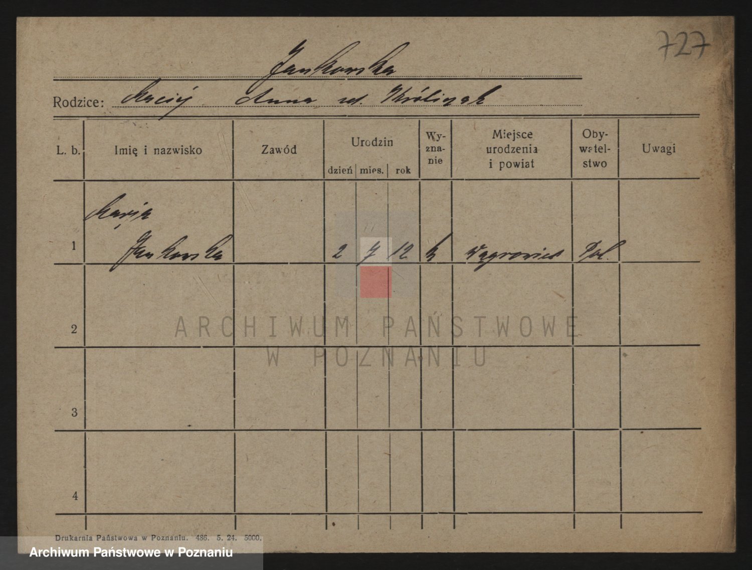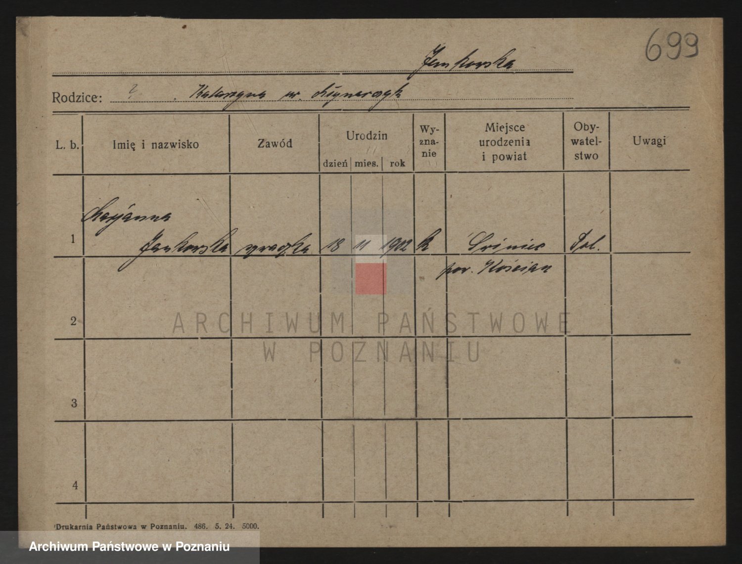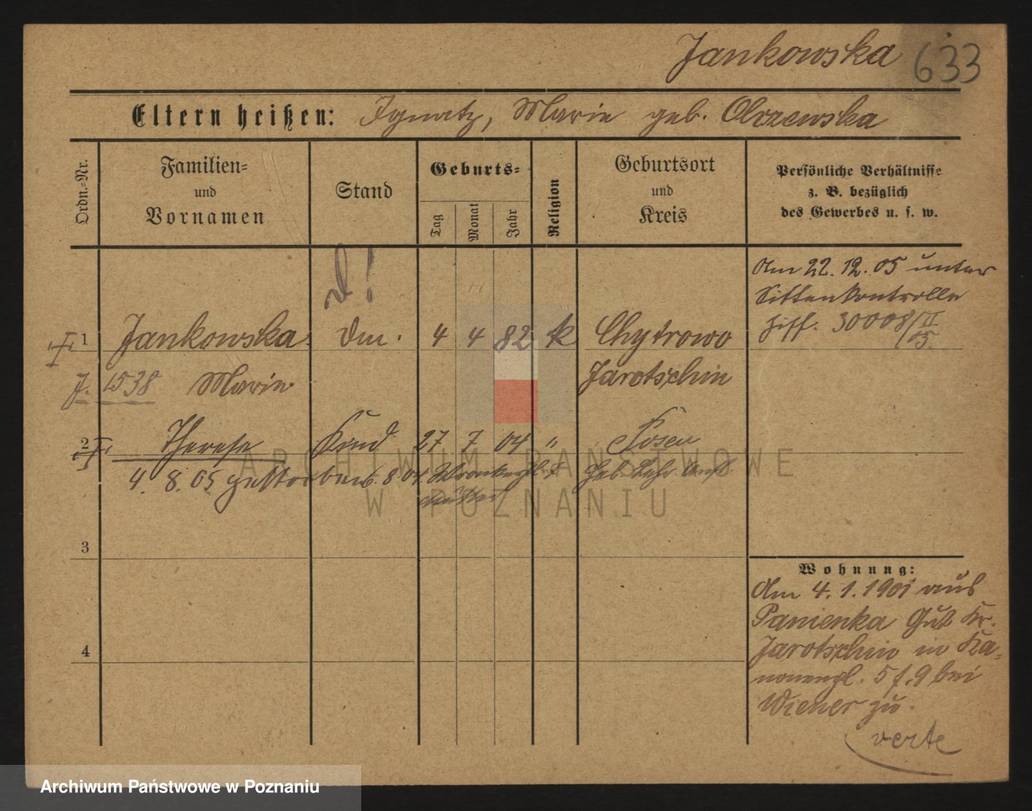 Podgląd karty osobowej dostępny jest po kliknięciu na nazwisko lub ikonkę karty. Można dokonywać powiększenia (ikony na górze) lub przechodzić między kolejnymi skanami (strzałki po bokach).