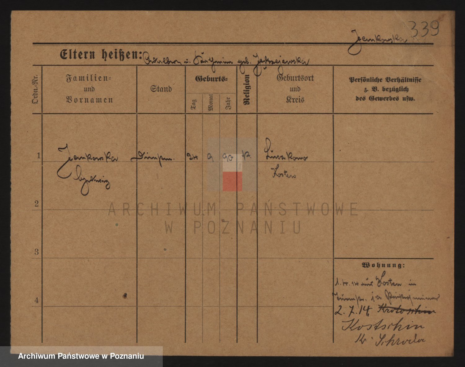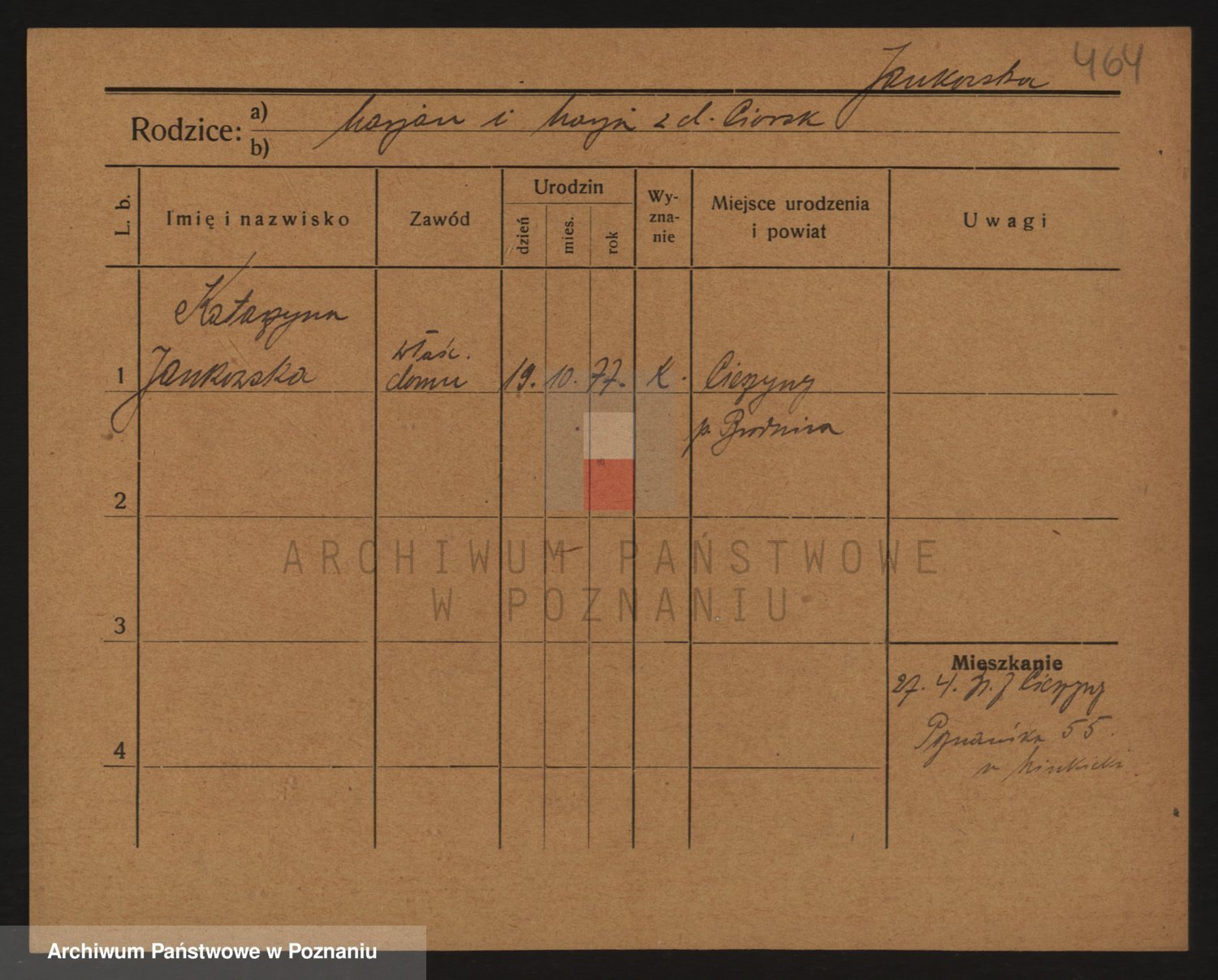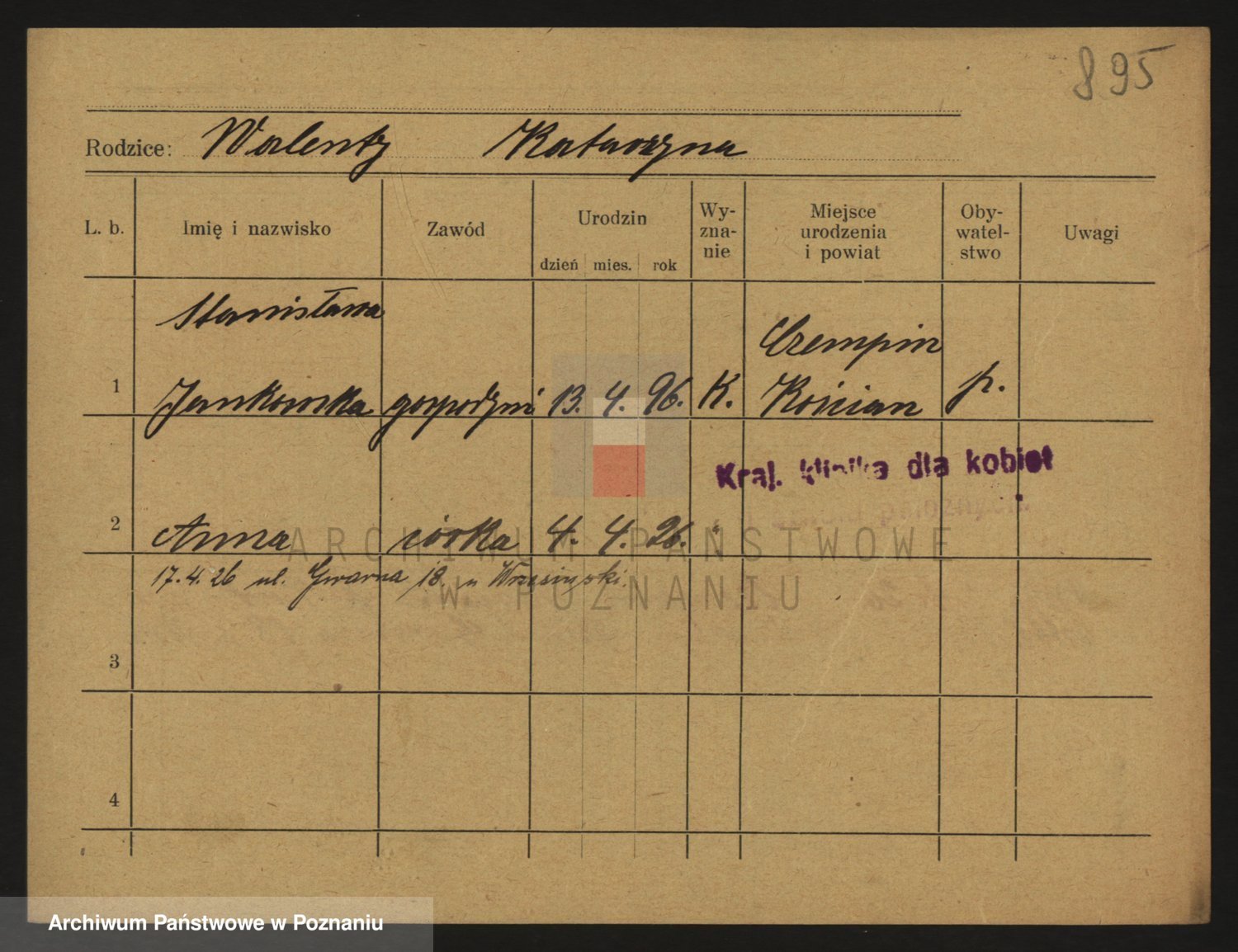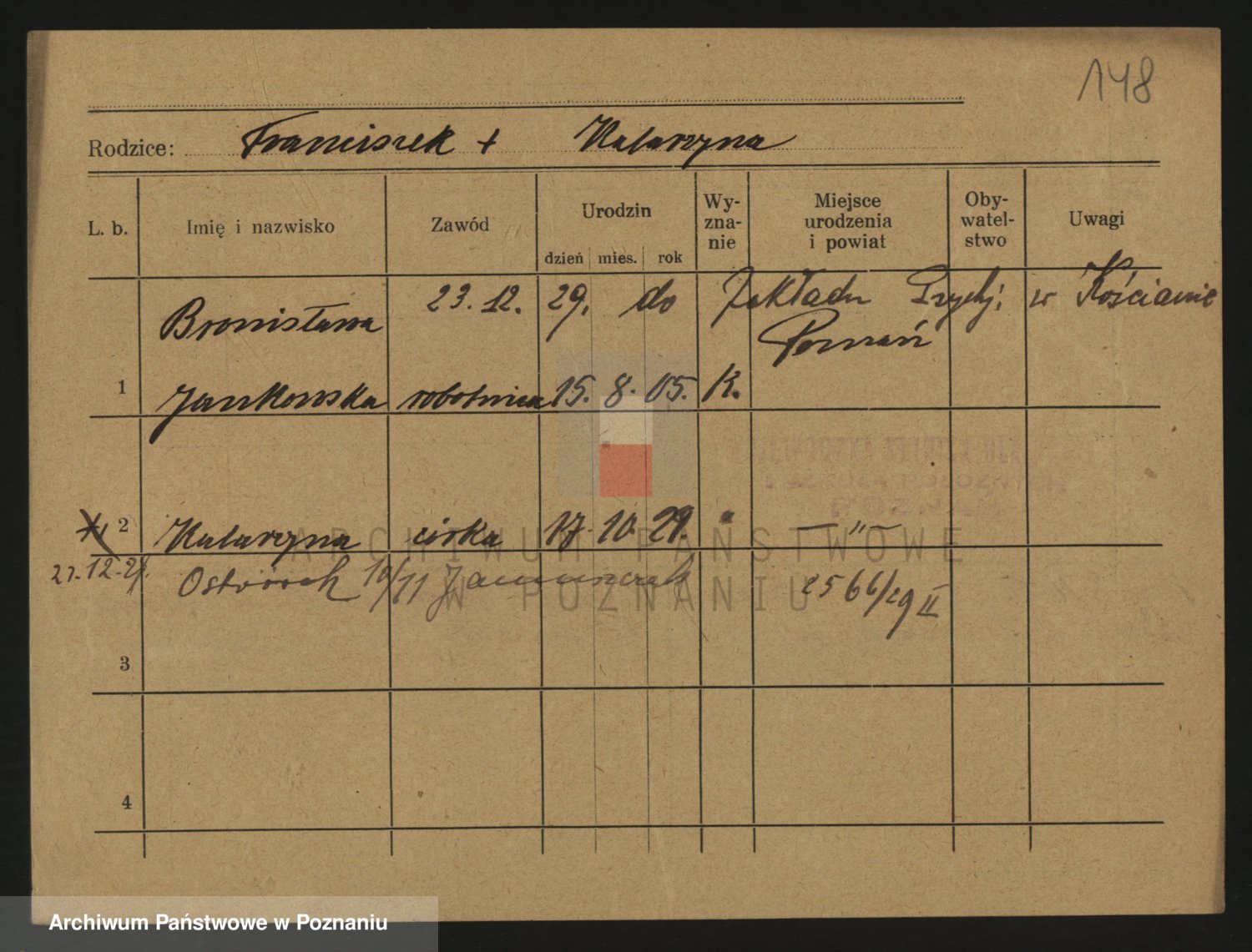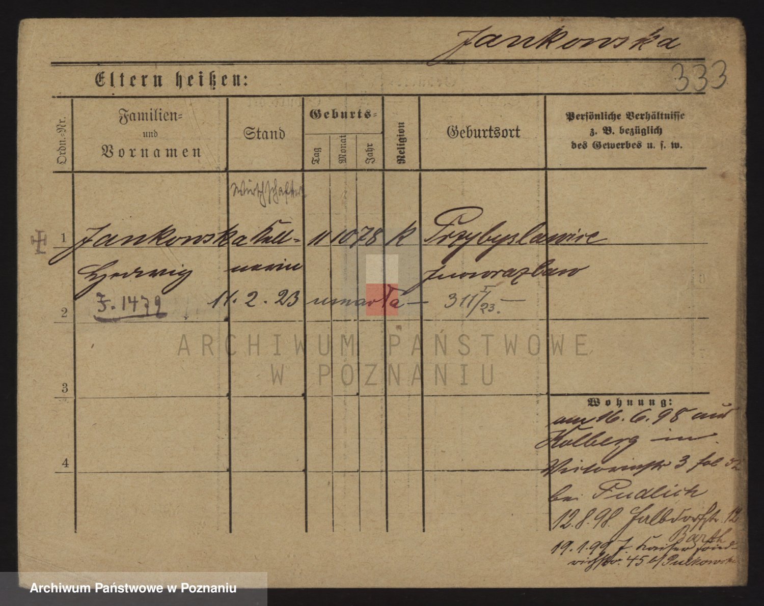 Podgląd karty osobowej dostępny jest po kliknięciu na nazwisko lub ikonkę karty. Można dokonywać powiększenia (ikony na górze) lub przechodzić między kolejnymi skanami (strzałki po bokach).