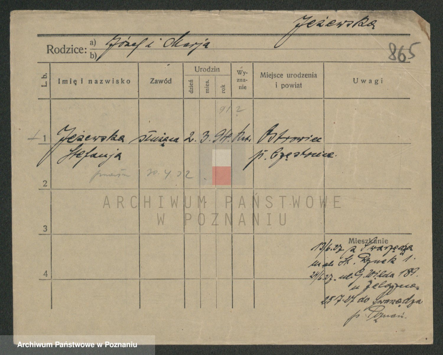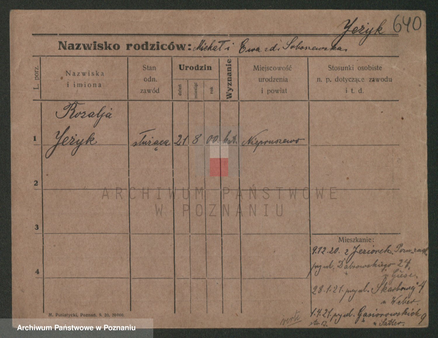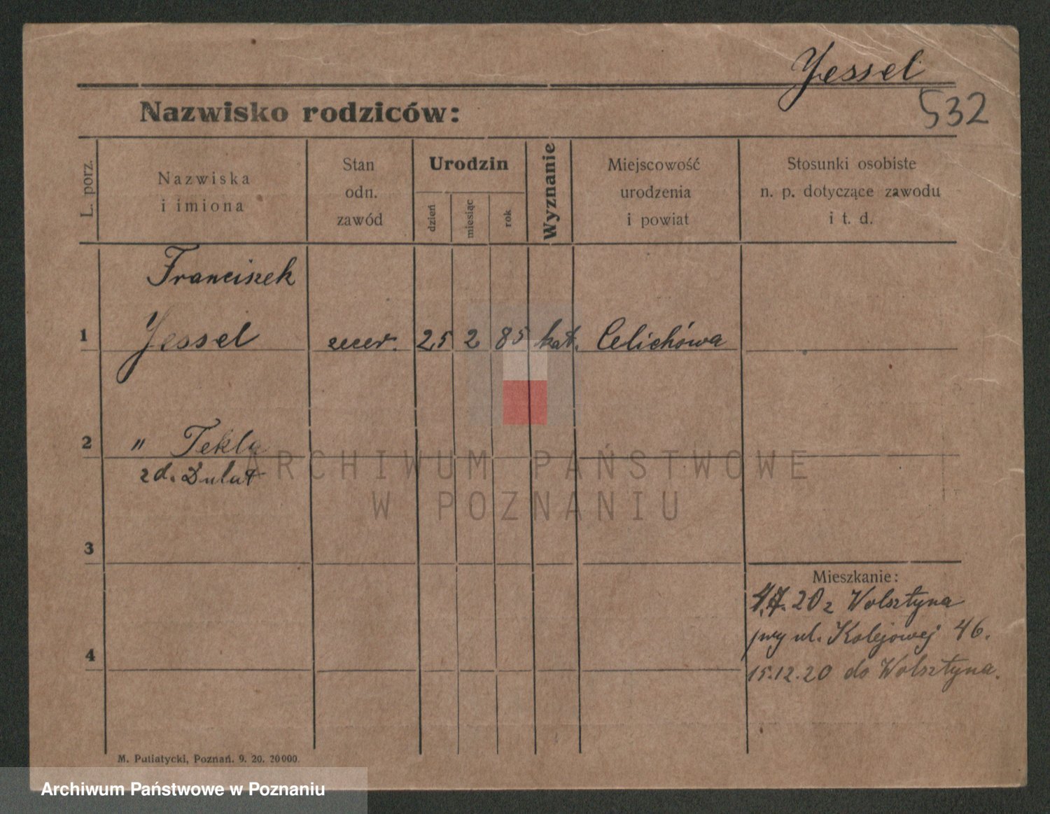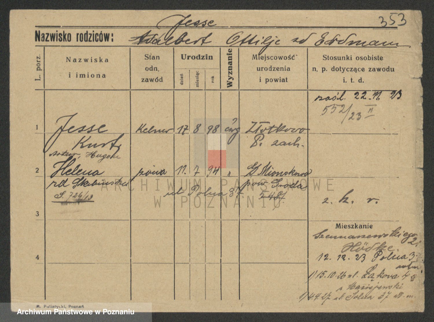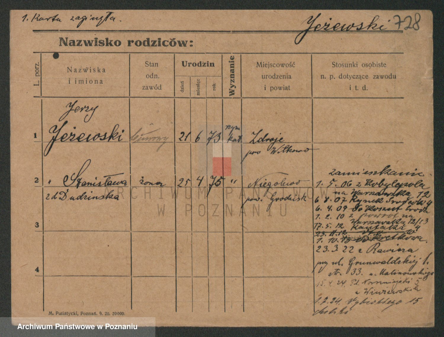 Podgląd karty osobowej dostępny jest po kliknięciu na nazwisko lub ikonkę karty. Można dokonywać powiększenia (ikony na górze) lub przechodzić między kolejnymi skanami (strzałki po bokach).