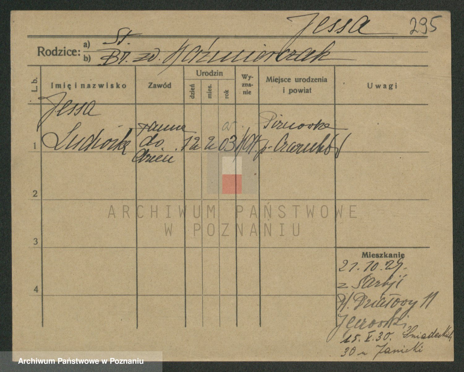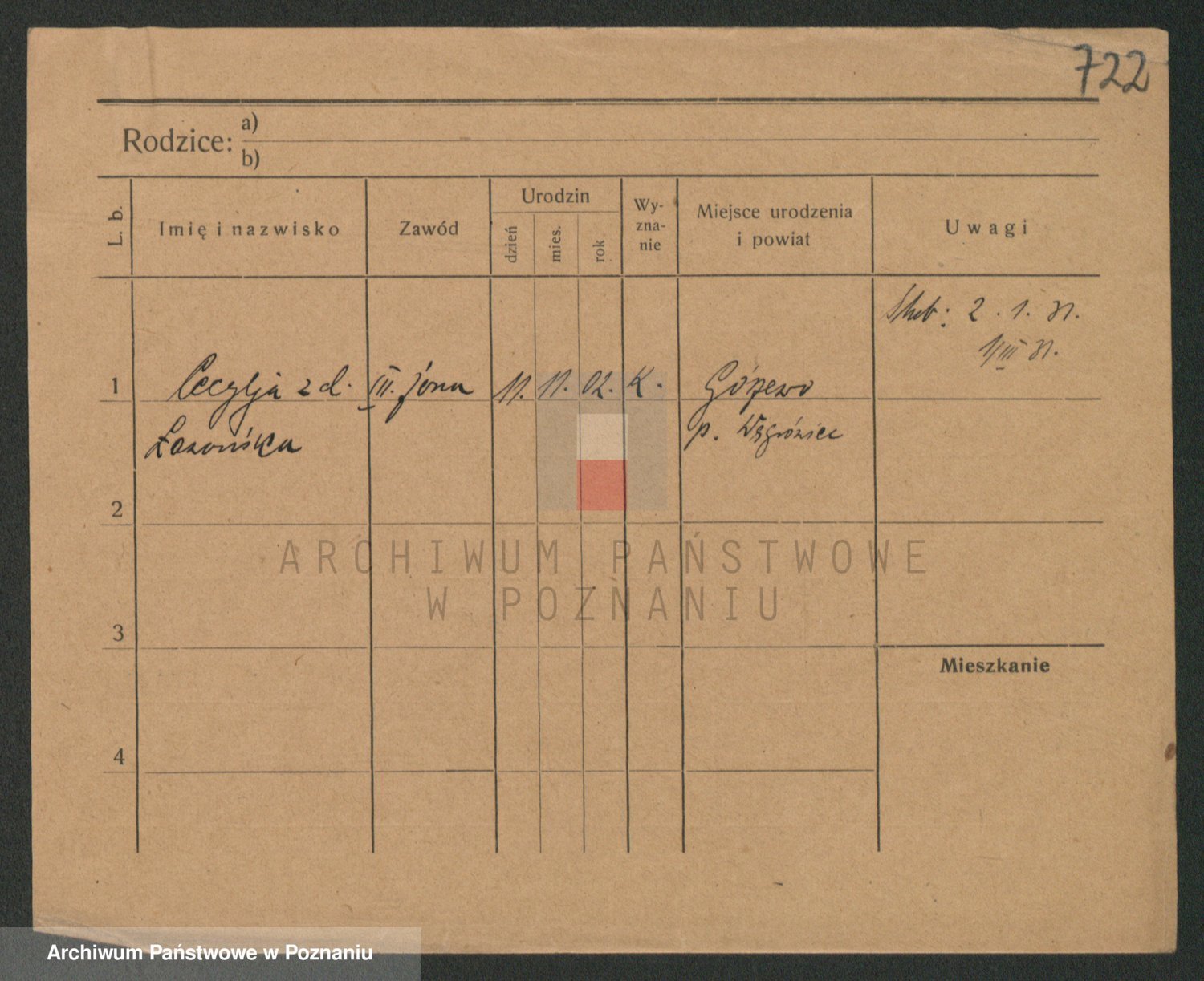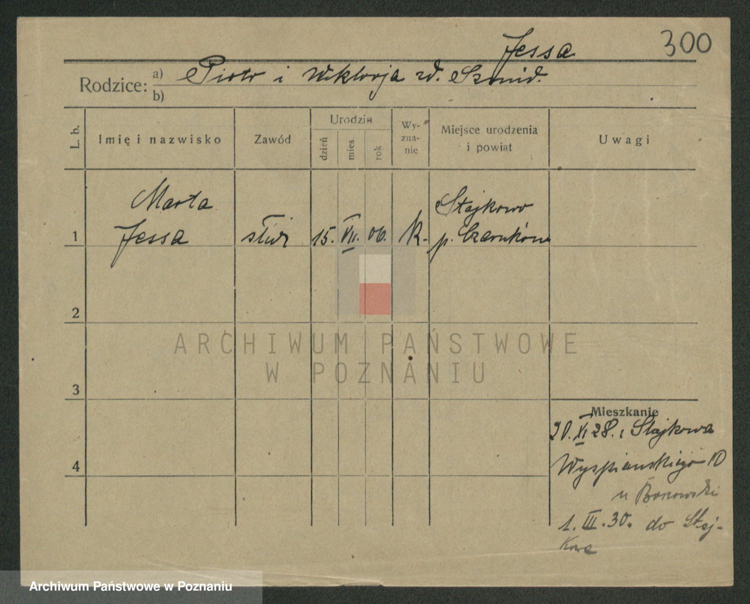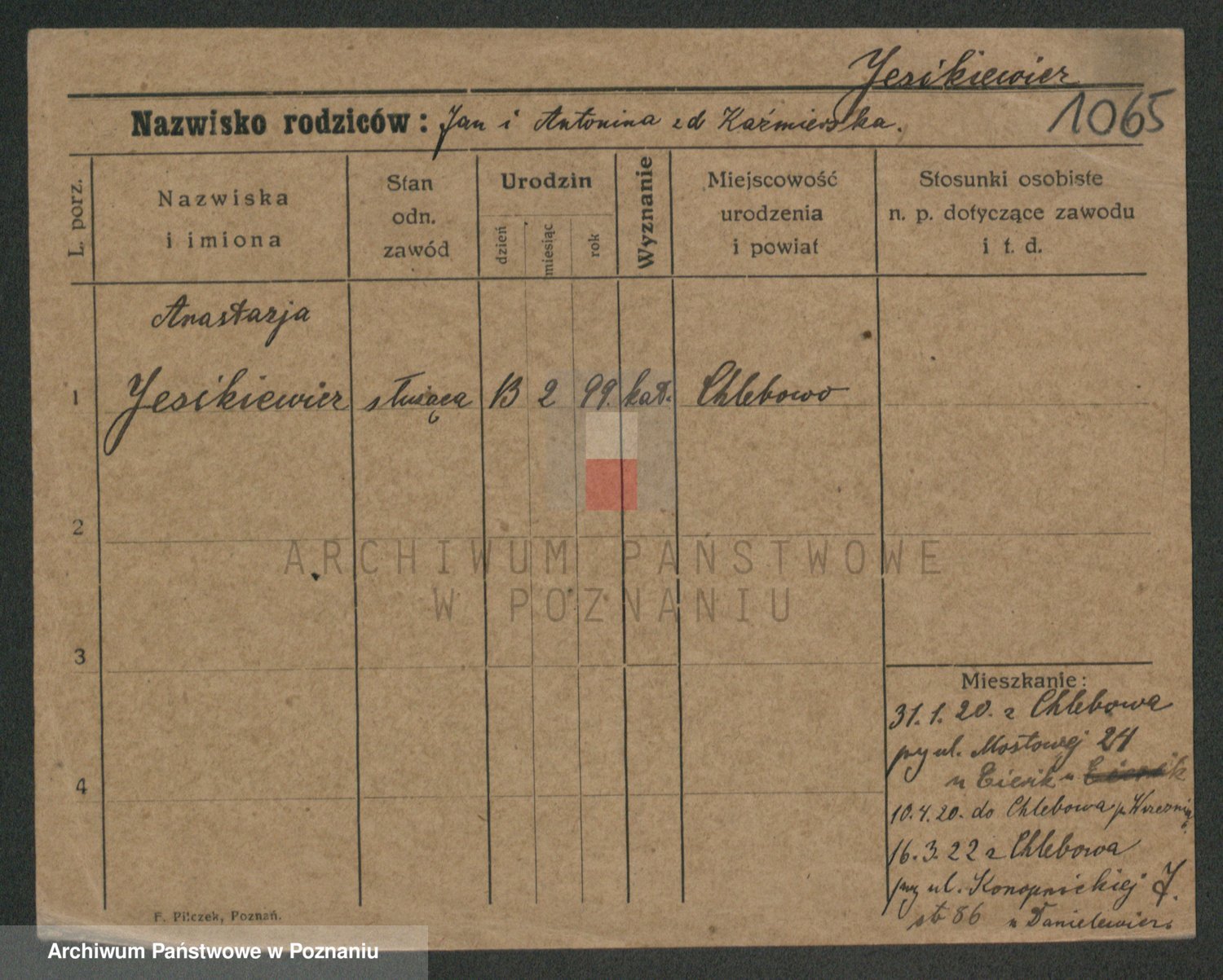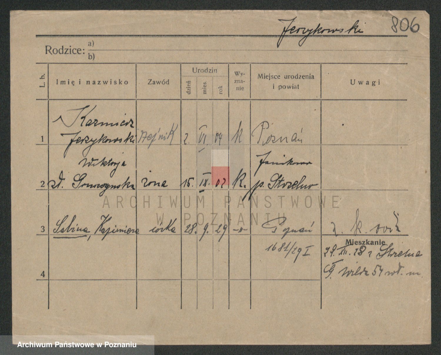 Podgląd karty osobowej dostępny jest po kliknięciu na nazwisko lub ikonkę karty. Można dokonywać powiększenia (ikony na górze) lub przechodzić między kolejnymi skanami (strzałki po bokach).