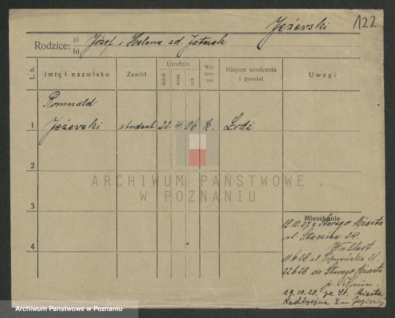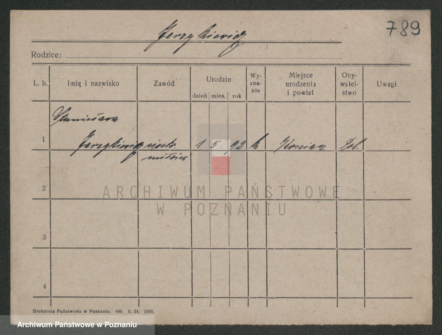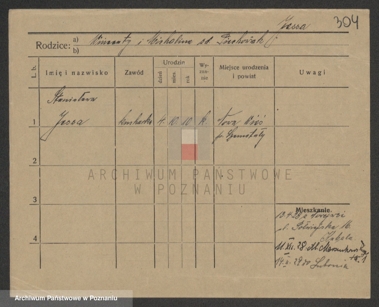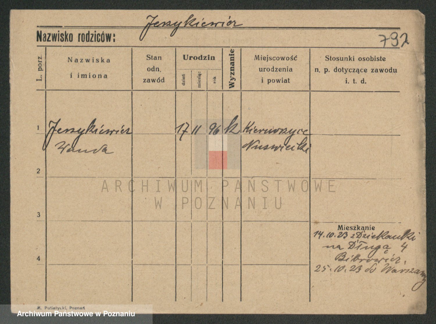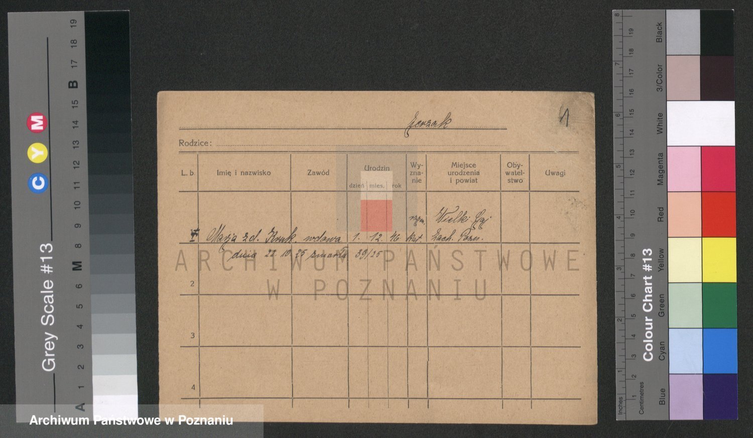 Podgląd karty osobowej dostępny jest po kliknięciu na nazwisko lub ikonkę karty. Można dokonywać powiększenia (ikony na górze) lub przechodzić między kolejnymi skanami (strzałki po bokach).