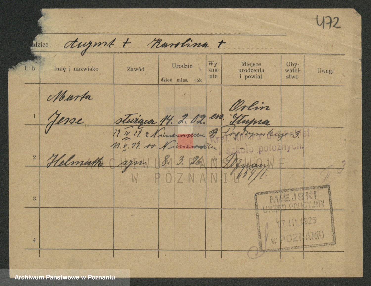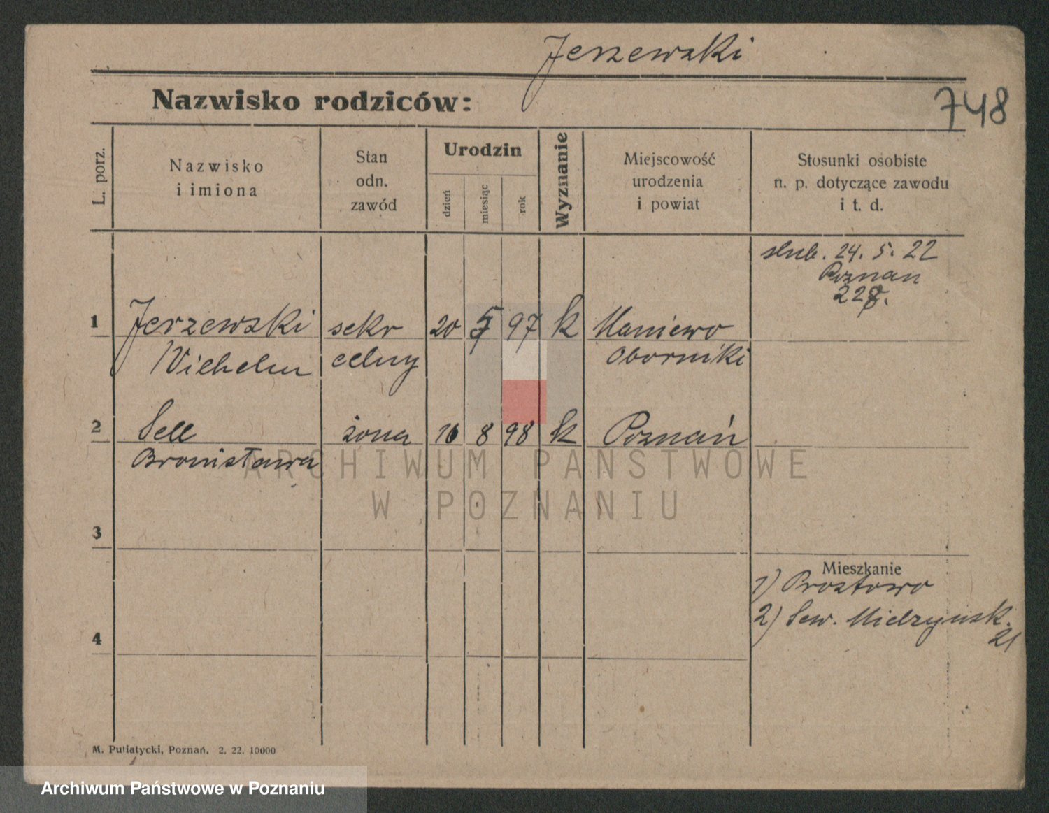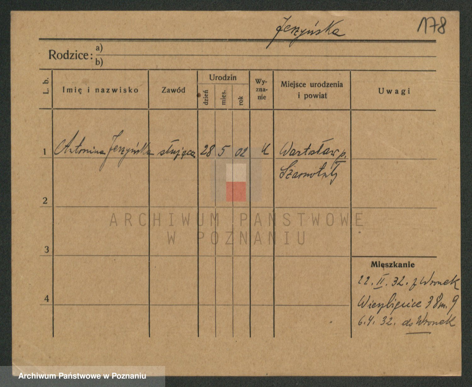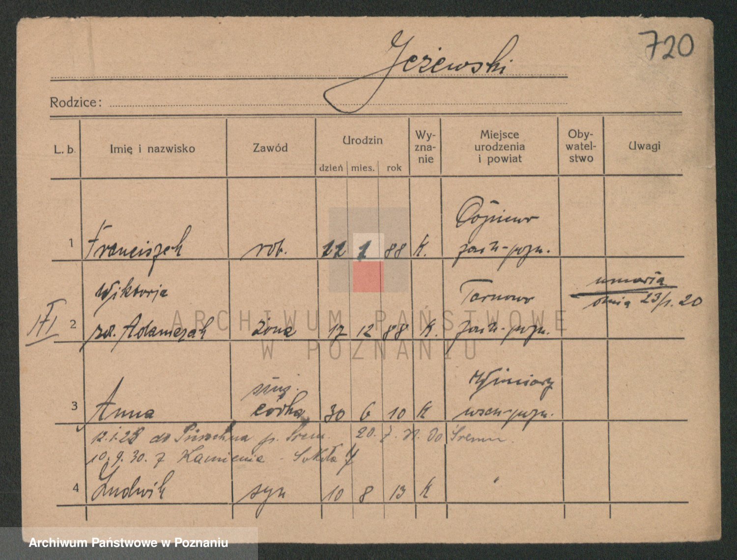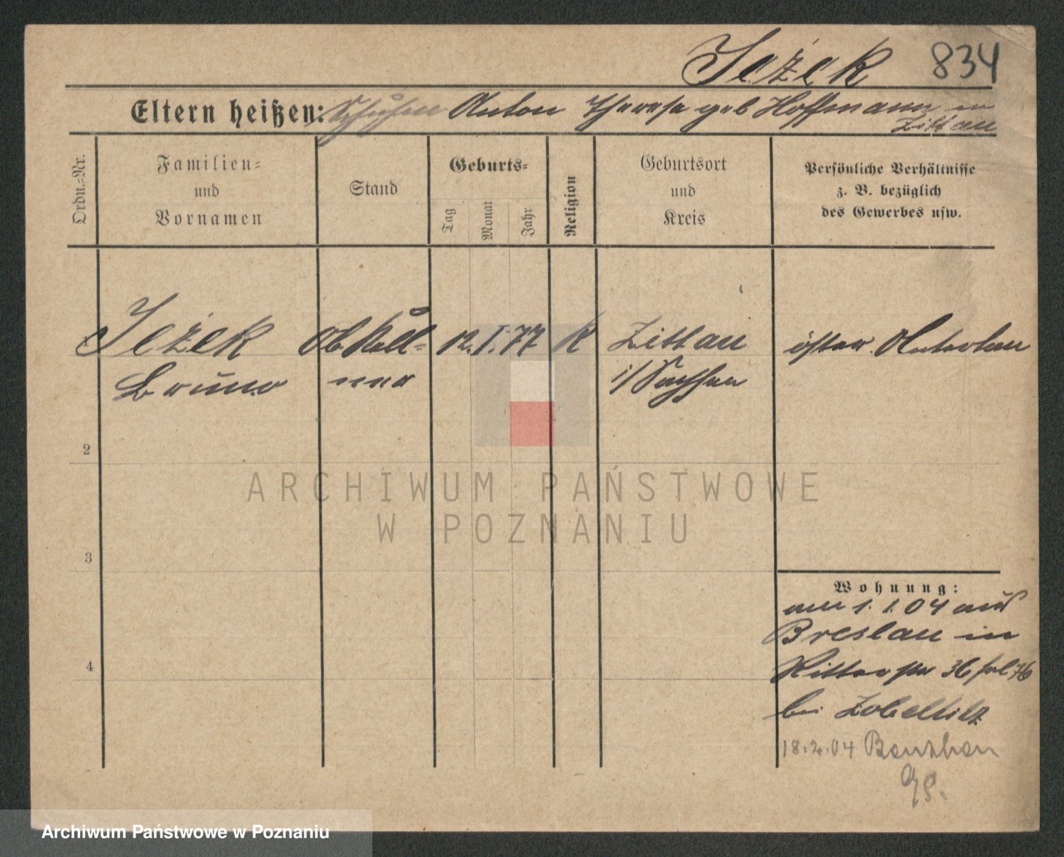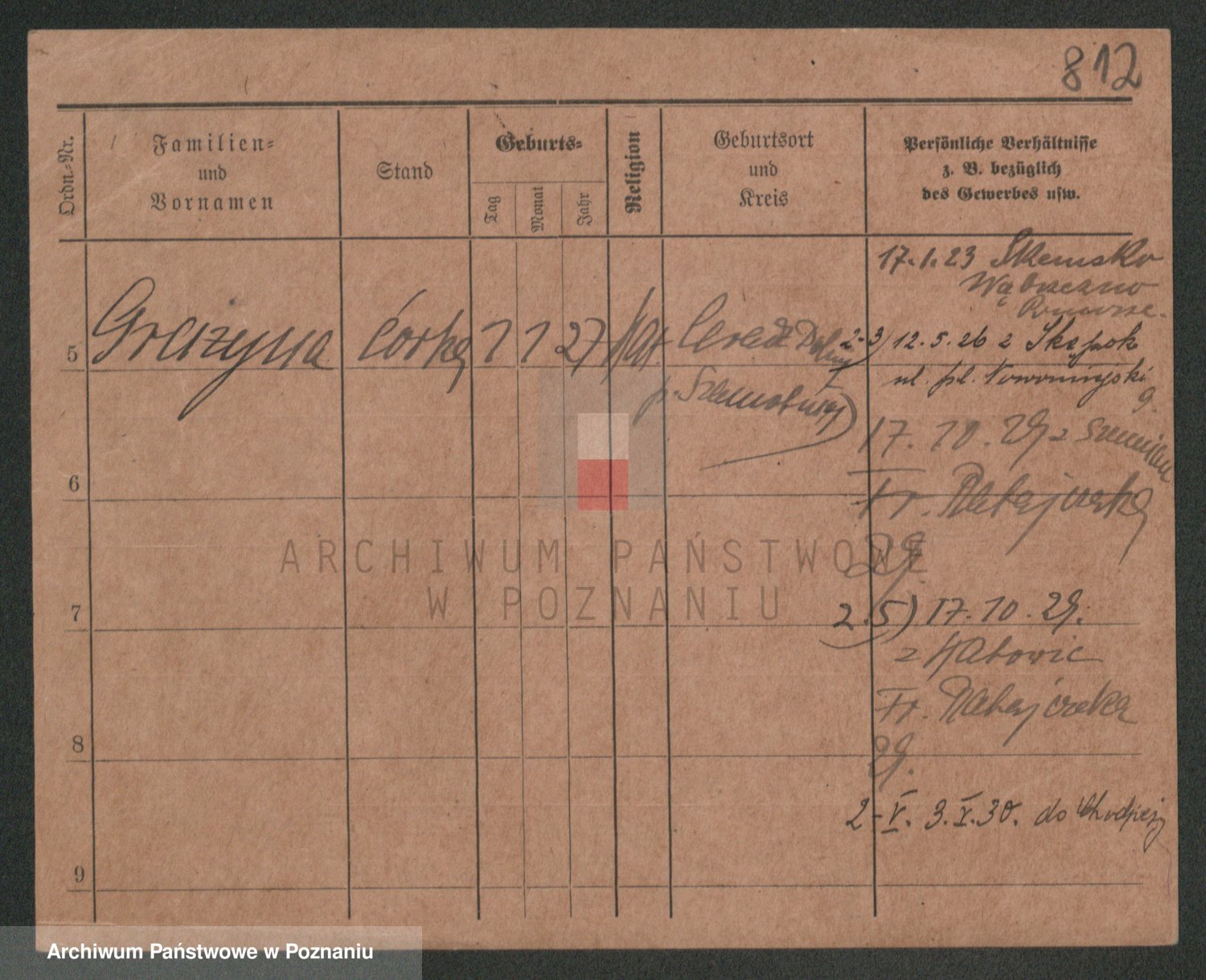 Podgląd karty osobowej dostępny jest po kliknięciu na nazwisko lub ikonkę karty. Można dokonywać powiększenia (ikony na górze) lub przechodzić między kolejnymi skanami (strzałki po bokach).