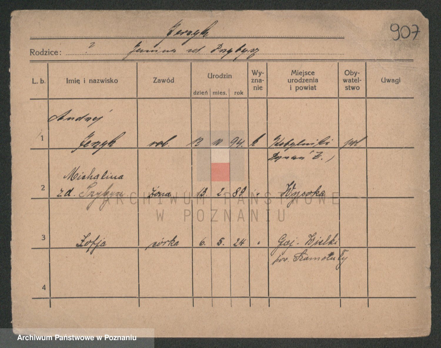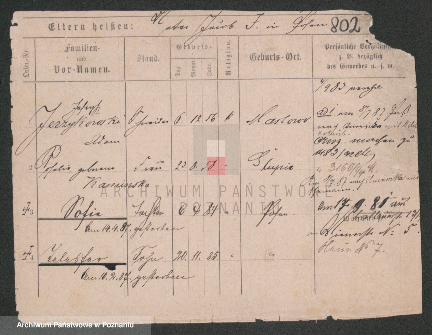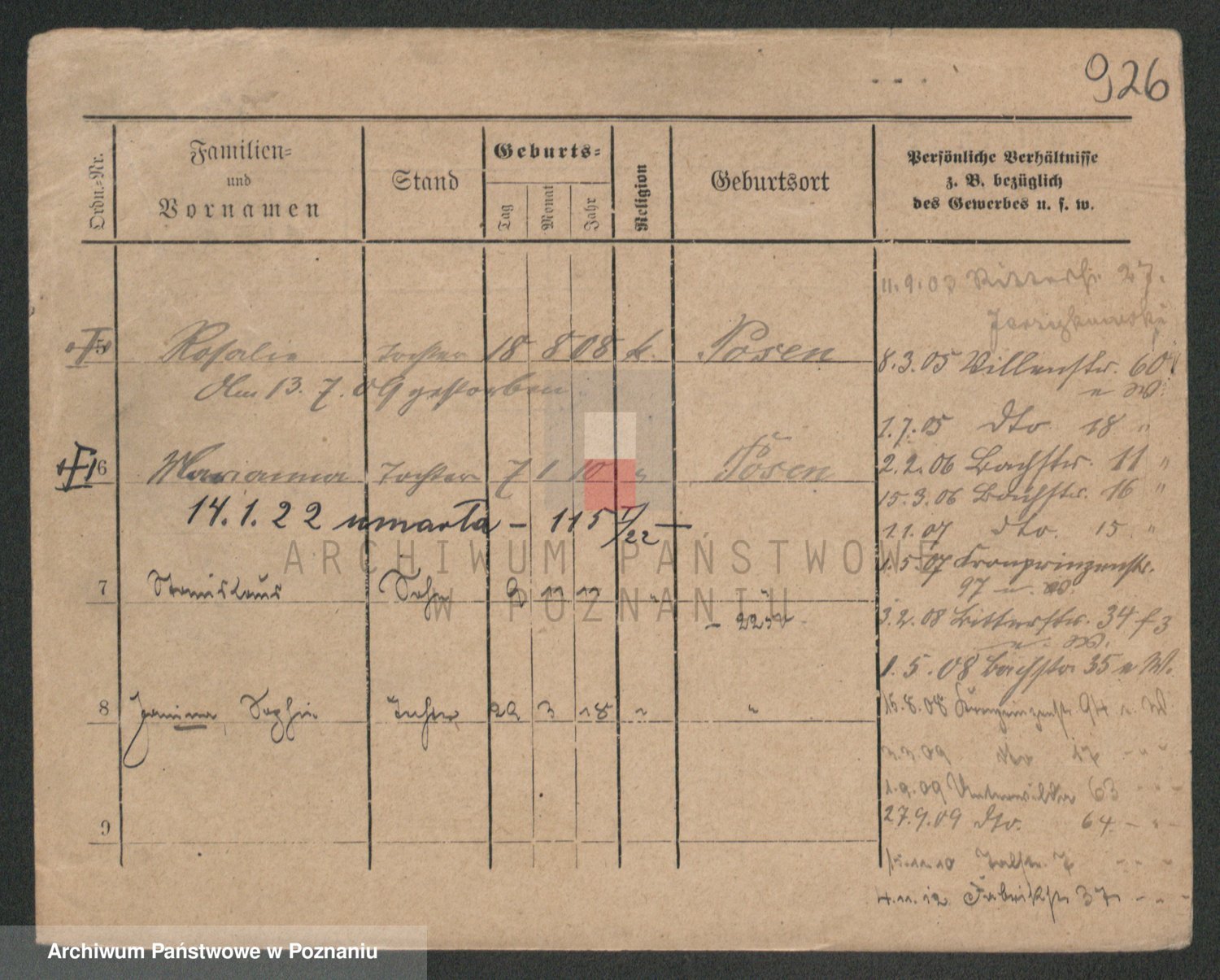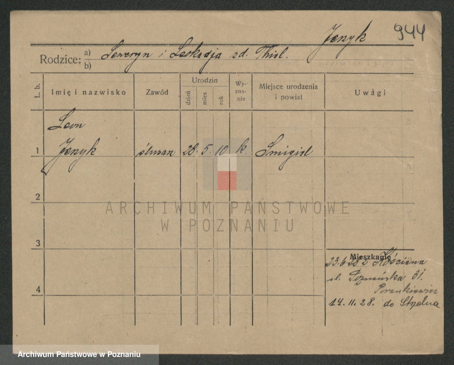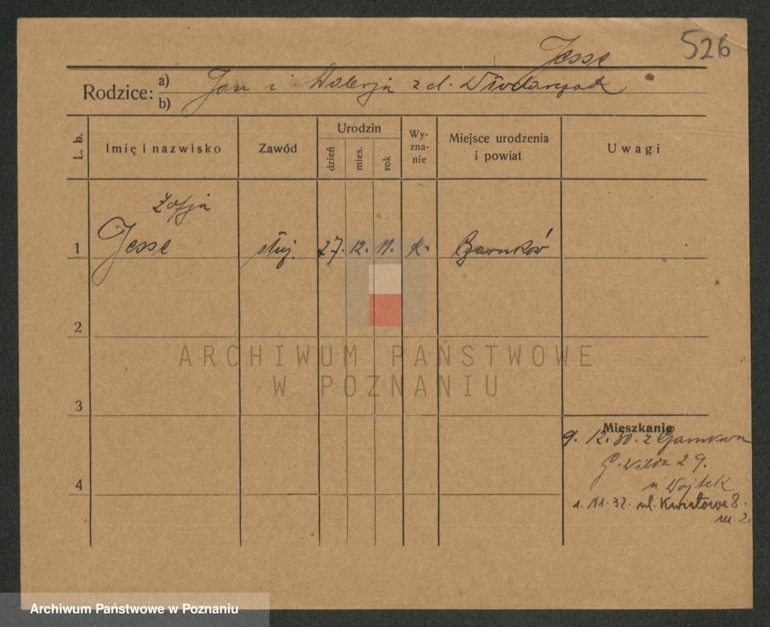 Podgląd karty osobowej dostępny jest po kliknięciu na nazwisko lub ikonkę karty. Można dokonywać powiększenia (ikony na górze) lub przechodzić między kolejnymi skanami (strzałki po bokach).